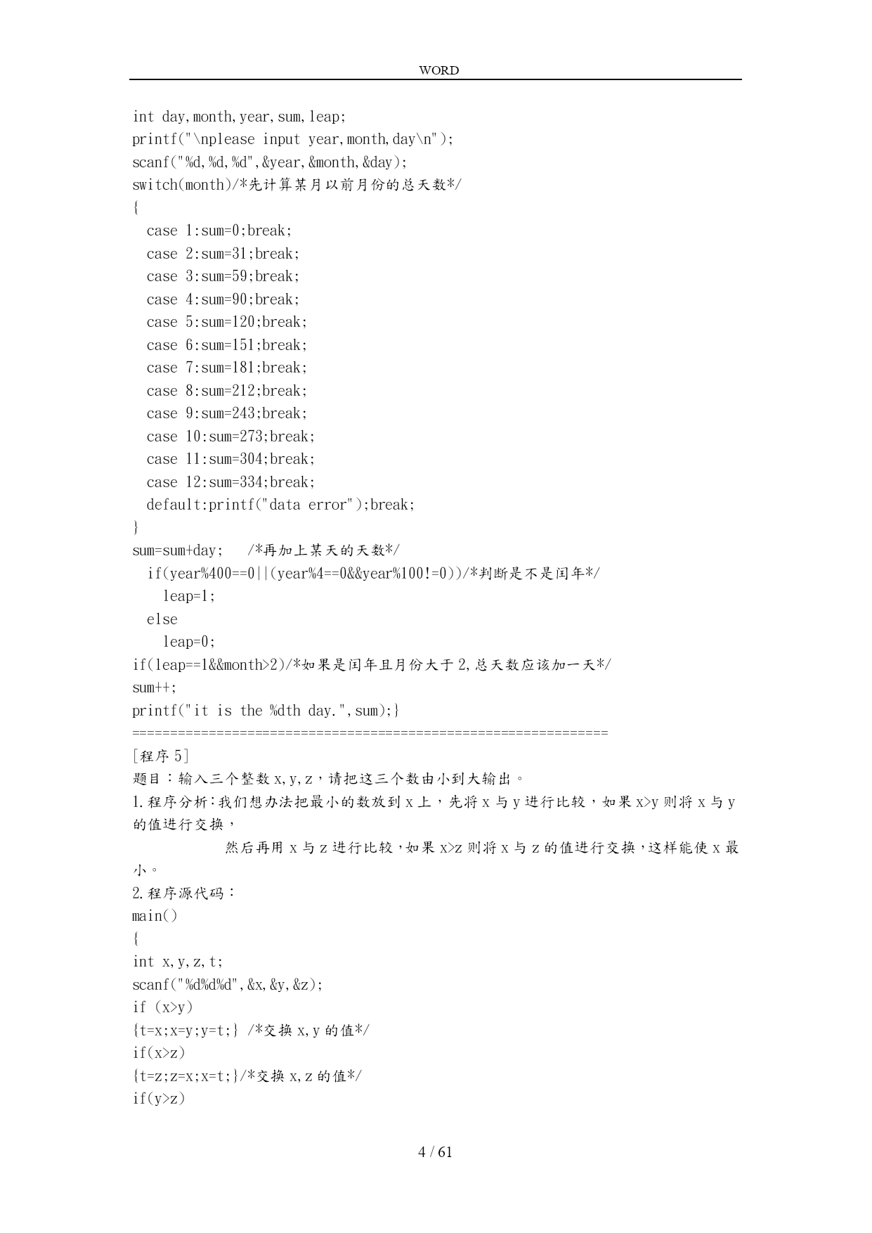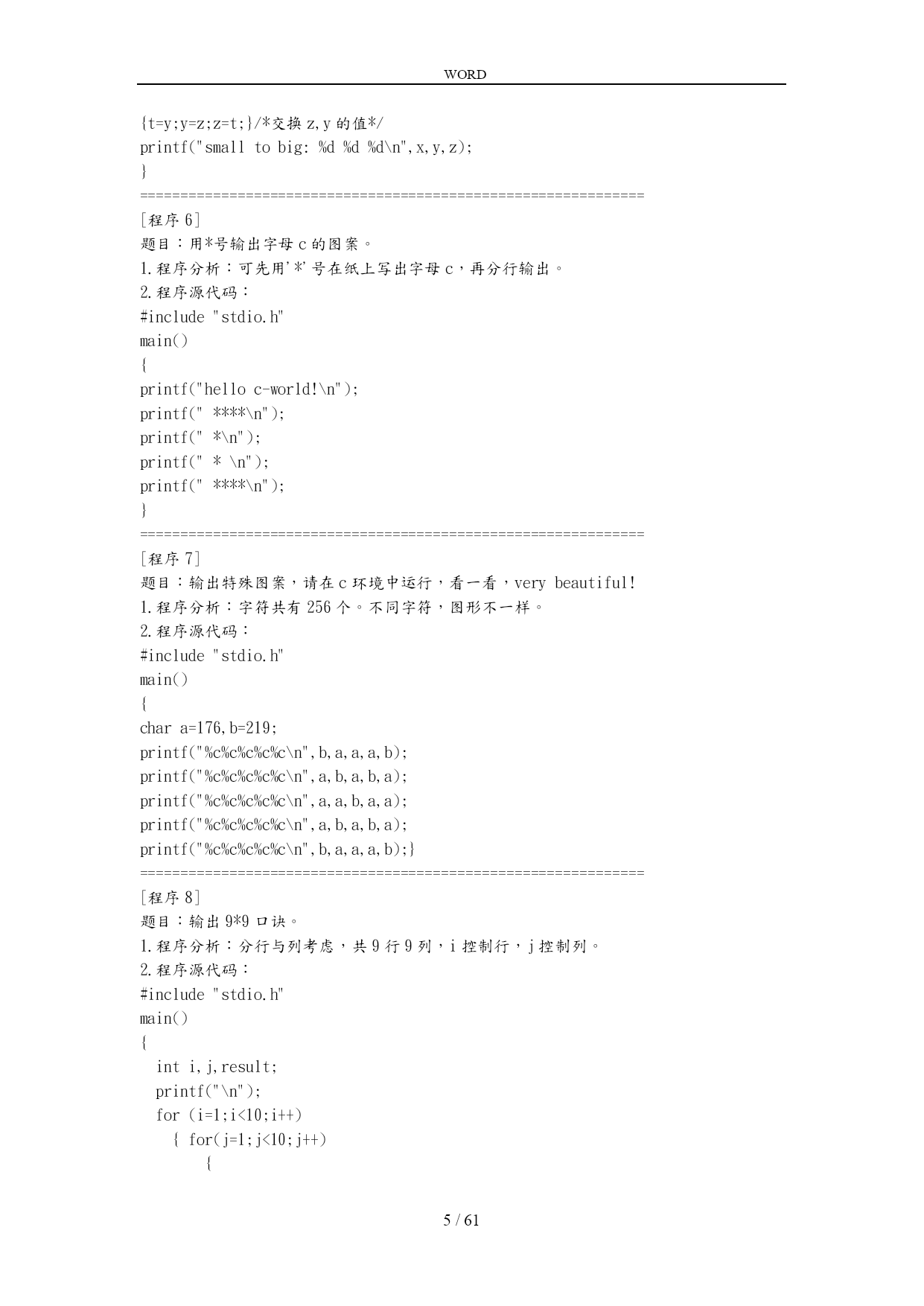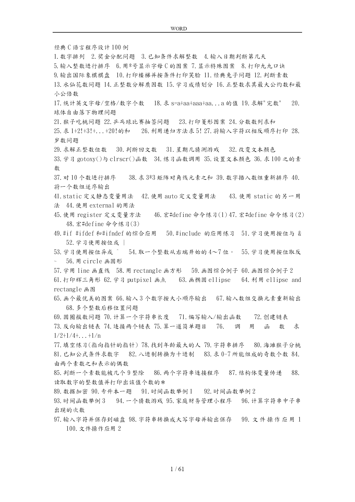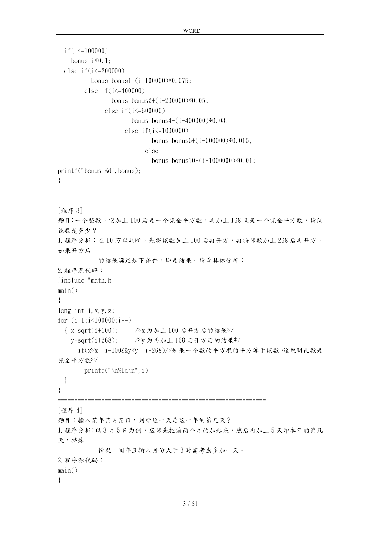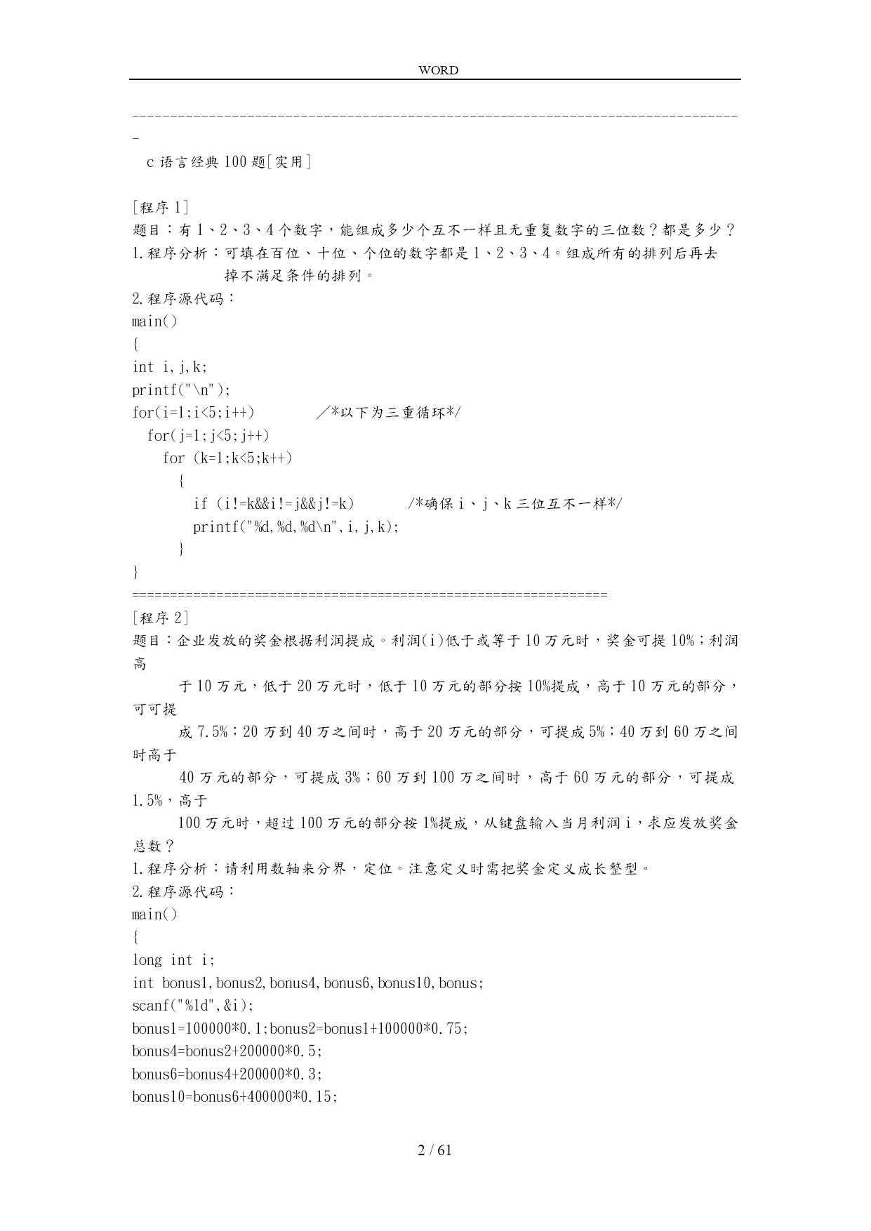 WORD /NUMPAGES61 经典C语言程序设计100例 1.数字排列 2.奖金分配问题 3.已知条件求解整数 4.输入日期判断第几天 5.输入整数进行排序 6.用*号显示字母C的图案 7.显示特殊图案 8.打印九九口诀 9.输出国际象棋棋盘 10.打印楼梯并按条件打印笑脸 11.经典兔子问题 12.判断素数 13.水仙花数问题 14.正整数分解质因数 15.学习成绩划分 16.正整数求其最大公约数和最小公倍数 17.统计英文字母/空格/数字个数 18.求s=a+aa+aaa+aa...a的值 19.求解"完数" 20.球体自由落下物理问题 21.猴子吃桃问题 22.乒乓球比赛抽签问题 23.打印菱形图案 24.分数数列求和 25.求1+2!+3!+...+20!的和 26.利用递归方法求5! 27.将输入字符以相反顺序打印 28.岁数问题 29.求解正整数位数 30.判断回文数 31.星期几猜测游戏 32.改变文本颜色 33.学习gotoxy()与clrscr()函数 34.练习函数调用 35.设置文本颜色 36.求100之的素数 37.对10个数进行排序 38.求3*3矩阵对角线元素之和 39.数字插入数组重新排序 40.将一个数组逆序输出 41.static定义静态变量用法 42.使用auto定义变量用法 43.使用static的另一用法 44.使用external的用法 45.使用register定义变量方法 46.宏#define命令练习(1) 47.宏#define命令练习(2) 48.宏#define命令练习(3) 49.#if#ifdef和#ifndef的综合应用 50.#include的应用练习 51.学习使用按位与& 52.学习使用按位或| 53.学习使用按位异或^ 54.取一个整数从右端开始的4~7位。 55.学习使用按位取反~ 56.用circle画圆形 57.学用line画直线 58.用rectangle画方形 59.画图综合例子 60.画图综合例子2 61.打印辉三角形 62.学习putpixel画点 63.画椭圆ellipse 64.利用ellipseandrectangle画图 65.画个最优美的图案 66.输入3个数字按大小顺序输出 67.输入数组交换元素重新输出 68.多个整数后移位置问题 69.圆圈报数问题 70.计算一个字符串长度 71.编写输入/输出函数 72.创建链表 73.反向输出链表 74.连接两个链表 75.算一道简单题目 76.调用函数求1/2+1/4+...+1/n 77.填空练习(指向指针的指针) 78.找到年龄最大的人 79.字符串排序 80.海滩猴子分桃 81.已知公式条件求数字 82.八进制转换为十进制 83.求0-7所能组成的奇数个数 84.由两个素数之和表示的偶数 85.判断一个素数能被几个9整除 86.两个字符串连接程序 87.结构体变量传递 88.读取数字的整数值并打印出该值个数的* 89.数据加密 90.专升本一题 91.时间函数举例1 92.时间函数举例2 93.时间函数举例3 94.一个猜数游戏 95.家庭财务管理小程序 96.计算字符串中子串出现的次数 97.输入字符并保存到磁盘 98.字符串转换成大写字母并输出保存 99.文件操作应用1 100.文件操作应用2 -------------------------------------------------------------------------------- c语言经典100题[实用] [程序1] 题目:有1、2、3、4个数字,能组成多少个互不一样且无重复数字的三位数?都是多少? 1.程序分析:可填在百位、十位、个位的数字都是1、2、3、4。组成所有的排列后再去 掉不满足条件的排列。 2.程序源代码: main() { inti,j,k; printf("\n"); for(i=1;i<5;i++)/*以下为三重循环*/ for(j=1;j<5;j++) for(k=1;k<5;k++) { if(i!=k&&i!=j&&j!=k)/*确保i、j、k三位互不一样*/ printf("%d,%d,%d\n",i,j,k); } } ============================================================== [程序2] 题目:企业发放的奖金根据利润提成。利润(i)低于或等于10万元时,奖金可提10%;利润高 于10万元,低于20万元时,低于10万元的部分按10%提成,高于10万元的部分,可可提 成7.5%;20万到40万之间时,高于20万元的部分,可提成5%;40万到60万之间时高于 40万元的部分,可提成3%;60万到1