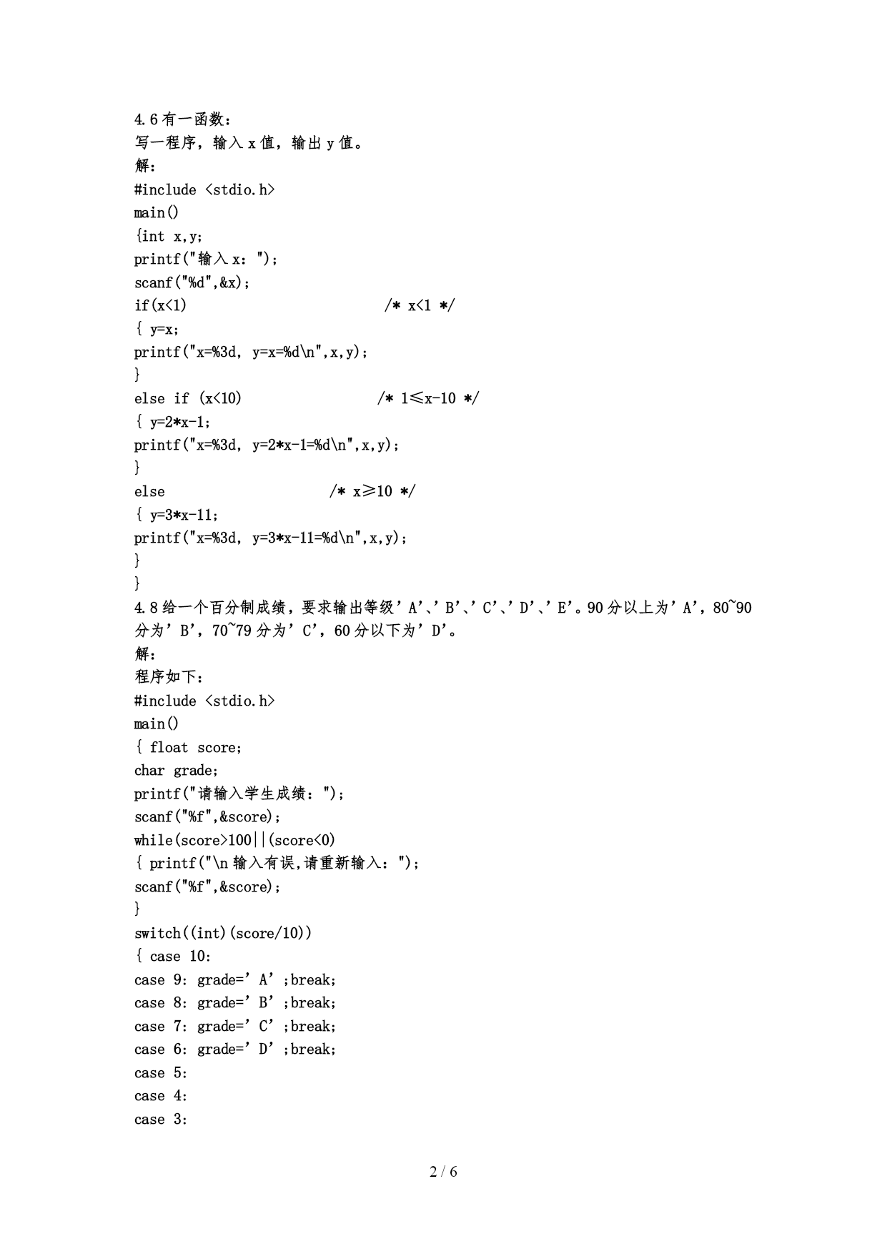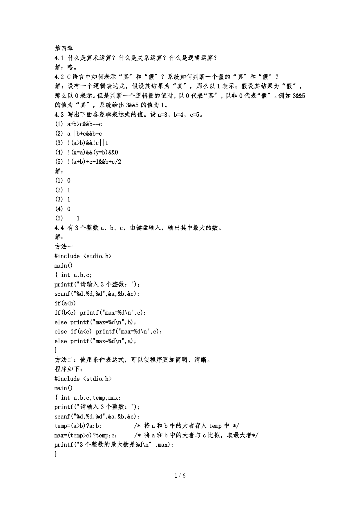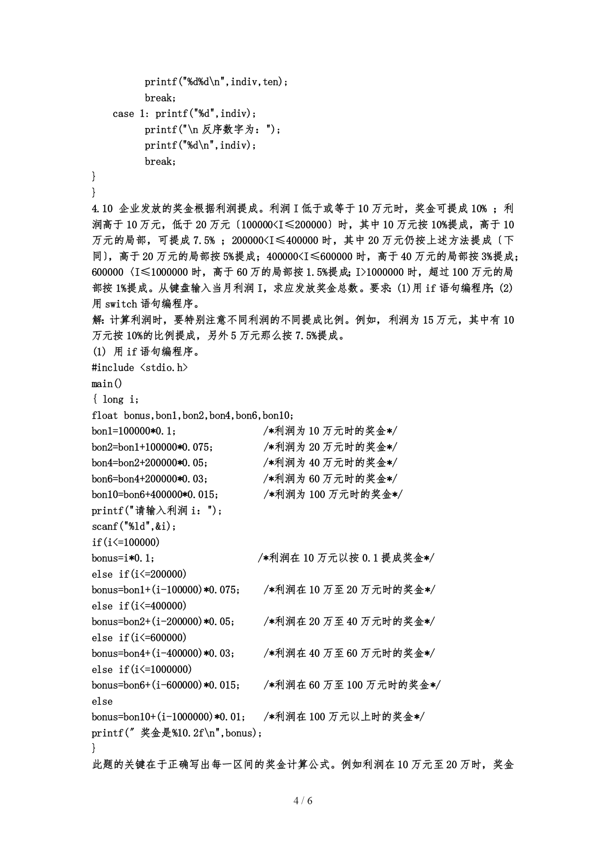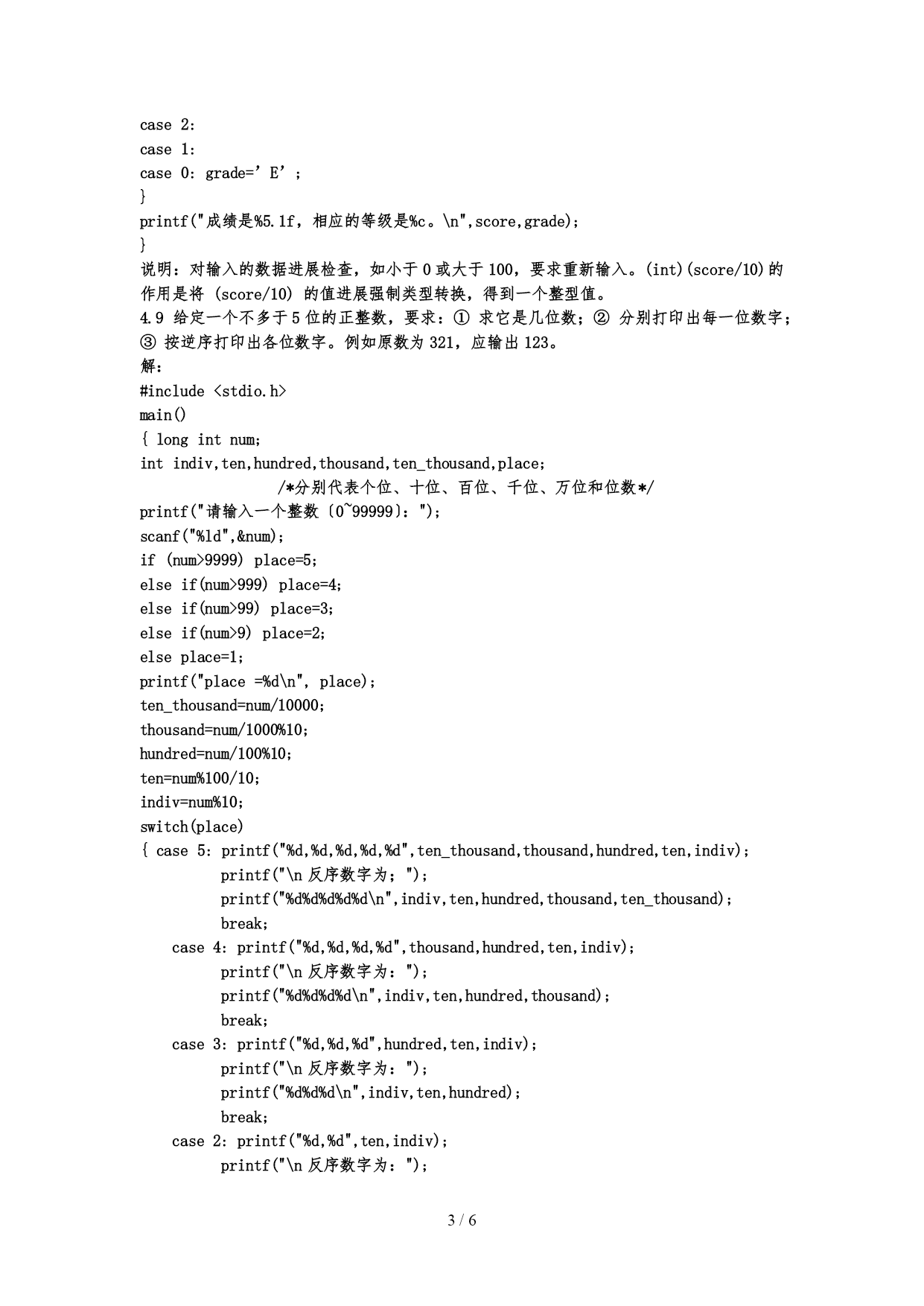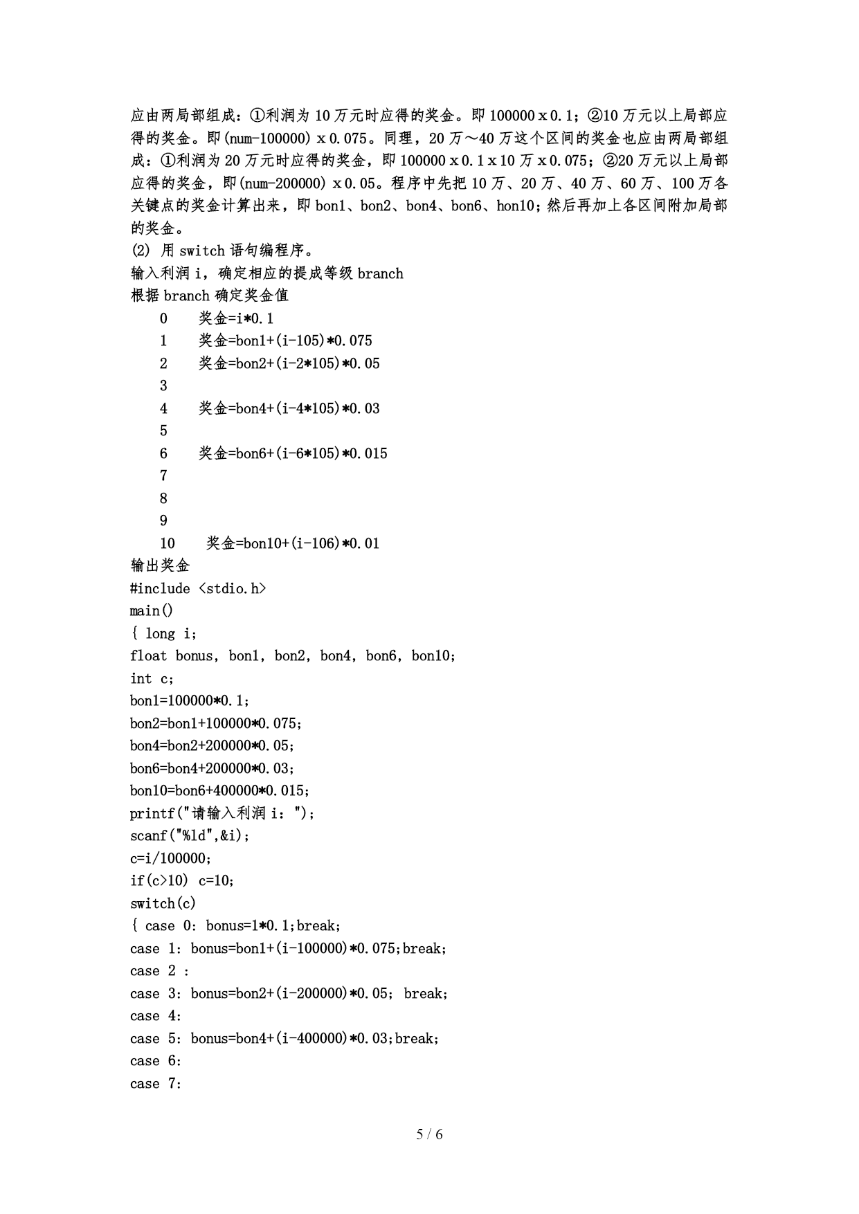 /NUMPAGES6 第四章 4.1什么是算术运算?什么是关系运算?什么是逻辑运算? 解:略。 4.2C语言中如何表示“真〞和“假〞?系统如何判断一个量的“真〞和“假〞? 解:设有一个逻辑表达式,假设其结果为“真〞,那么以1表示;假设其结果为“假〞,那么以0表示。但是判断一个逻辑量的值时,以0代表“真〞,以非0代表“假〞。例如3&&5的值为“真〞,系统给出3&&5的值为1。 4.3写出下面各逻辑表达式的值。设a=3,b=4,c=5。 (1)a+b>c&&b==c (2)a||b+c&&b-c (3)!(a>b)&&!c||1 (4)!(x=a)&&(y=b)&&0 (5)!(a+b)+c-1&&b+c/2 解: (1)0 (2)1 (3)1 (4)0 (5)1 4.4有3个整数a、b、c,由键盘输入,输出其中最大的数。 解: 方法一 #include<stdio.h> main() {inta,b,c; printf("请输入3个整数:"); scanf("%d,%d,%d",&a,&b,&c); if(a<b) if(b<c)printf("max=%d\n",c); elseprintf("max=%d\n",b); elseif(a<c)printf("max=%d\n",c); elseprintf("max=%d\n",a); } 方法二:使用条件表达式,可以使程序更加简明、清晰。 程序如下: #include<stdio.h> main() {inta,b,c,temp,max; printf("请输入3个整数:"); scanf("%d,%d,%d",&a,&b,&c); temp=(a>b)?a:b;/*将a和b中的大者存人temp中*/ max=(temp>c)?temp:c;/*将a和b中的大者与c比拟,取最大者*/ printf("3个整数的最大数是%d\n〞,max); } 4.6有一函数: 写一程序,输入x值,输出y值。 解: #include<stdio.h> main() {intx,y; printf("输入x:"); scanf("%d",&x); if(x<1)/*x<1*/ {y=x; printf("x=%3d,y=x=%d\n",x,y); } elseif(x<10)/*1≤x-10*/ {y=2*x-1; printf("x=%3d,y=2*x-1=%d\n",x,y); } else/*x≥10*/ {y=3*x-11; printf("x=%3d,y=3*x-11=%d\n",x,y); } } 4.8给一个百分制成绩,要求输出等级’A’、’B’、’C’、’D’、’E’。90分以上为’A’,80~90分为’B’,70~79分为’C’,60分以下为’D’。 解: 程序如下: #include<stdio.h> main() {floatscore; chargrade; printf("请输入学生成绩:"); scanf("%f",&score); while(score>100||(score<0) {printf("\n输入有误,请重新输入:"); scanf("%f",&score); } switch((int)(score/10)) {case10: case9:grade=’A’;break; case8:grade=’B’;break; case7:grade=’C’;break; case6:grade=’D’;break; case5: case4: case3: case2: case1: case0:grade=’E’; } printf("成绩是%5.1f,相应的等级是%c。\n",score,grade); } 说明:对输入的数据进展检查,如小于0或大于100,要求重新输入。(int)(score/10)的作用是将(score/10)的值进展强制类型转换,得到一个整型值。 4.9给定一个不多于5位的正整数,要求:①求它是几位数;②分别打印出每一位数字;③按逆序打印出各位数字。例如原数为321,应输出123。 解: #include<stdio.h> main() {longintnum; intindiv,ten,hundred,thousand,ten_thousand,place; /*分别代表个位、十位、百位、千位、万位和位数*/ printf("请输入一个整数〔0~99999〕:"); scanf("%ld",&num); if(num>9999)place=5; elseif(num>999)place=4; elseif(num>99)place=3; elseif(num>9)place=2; elseplace=1; printf(