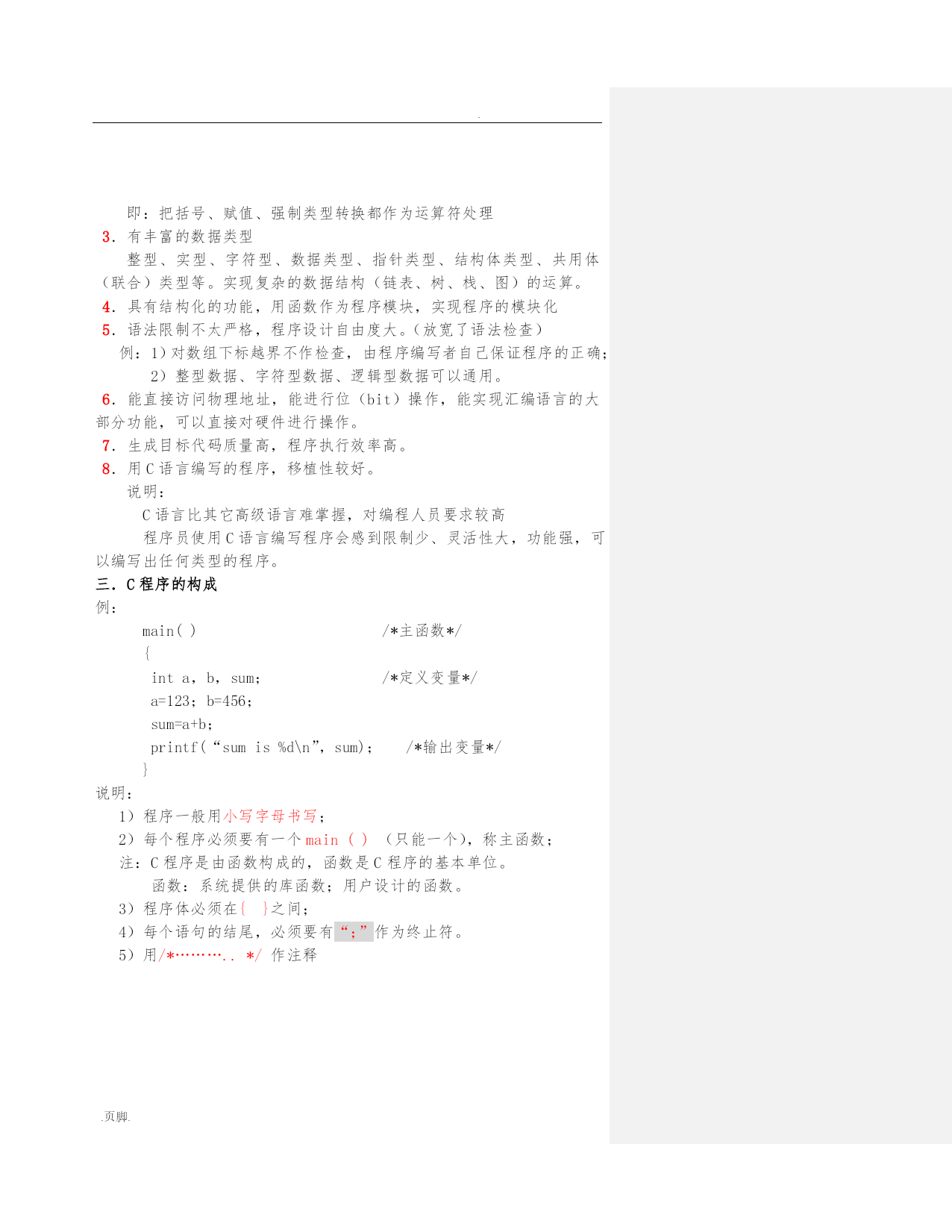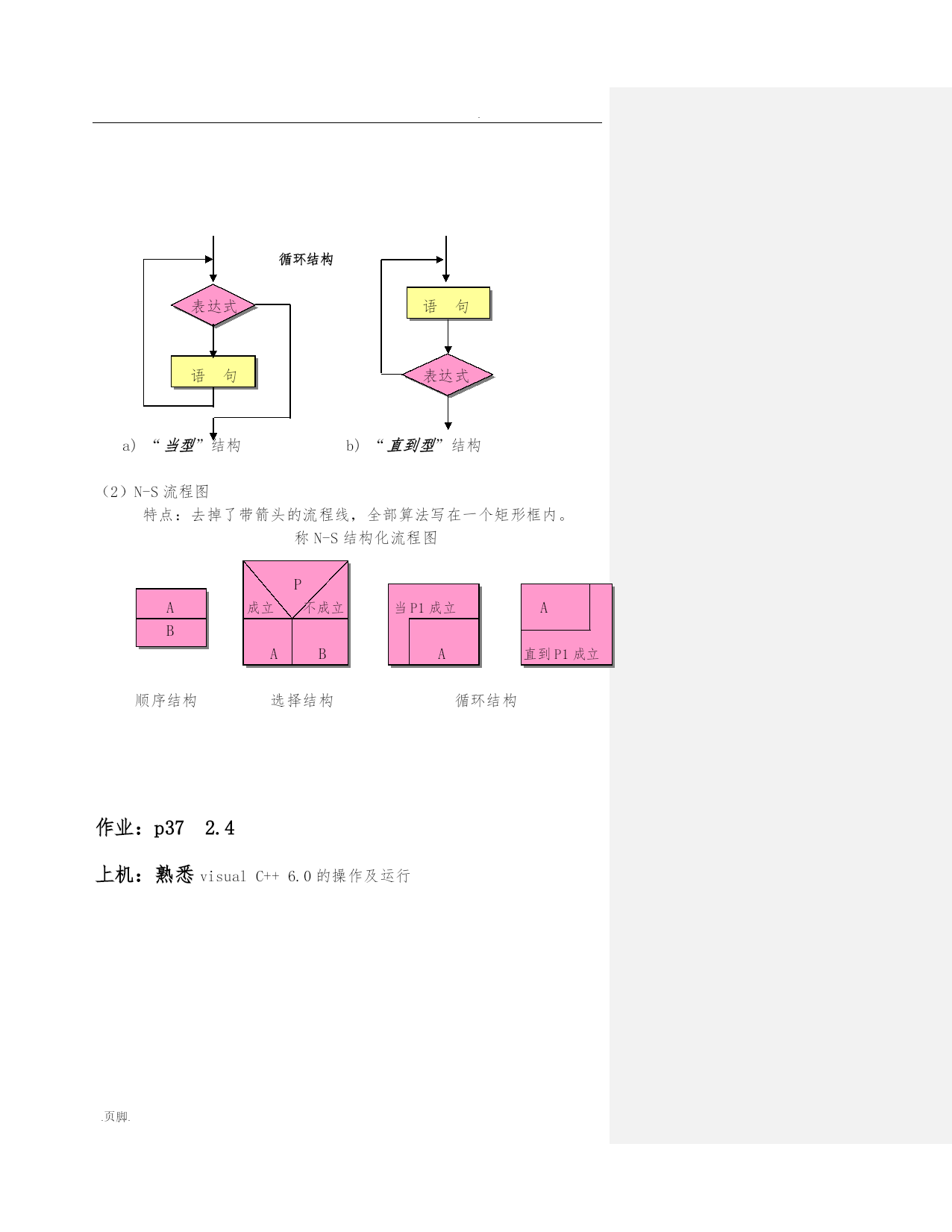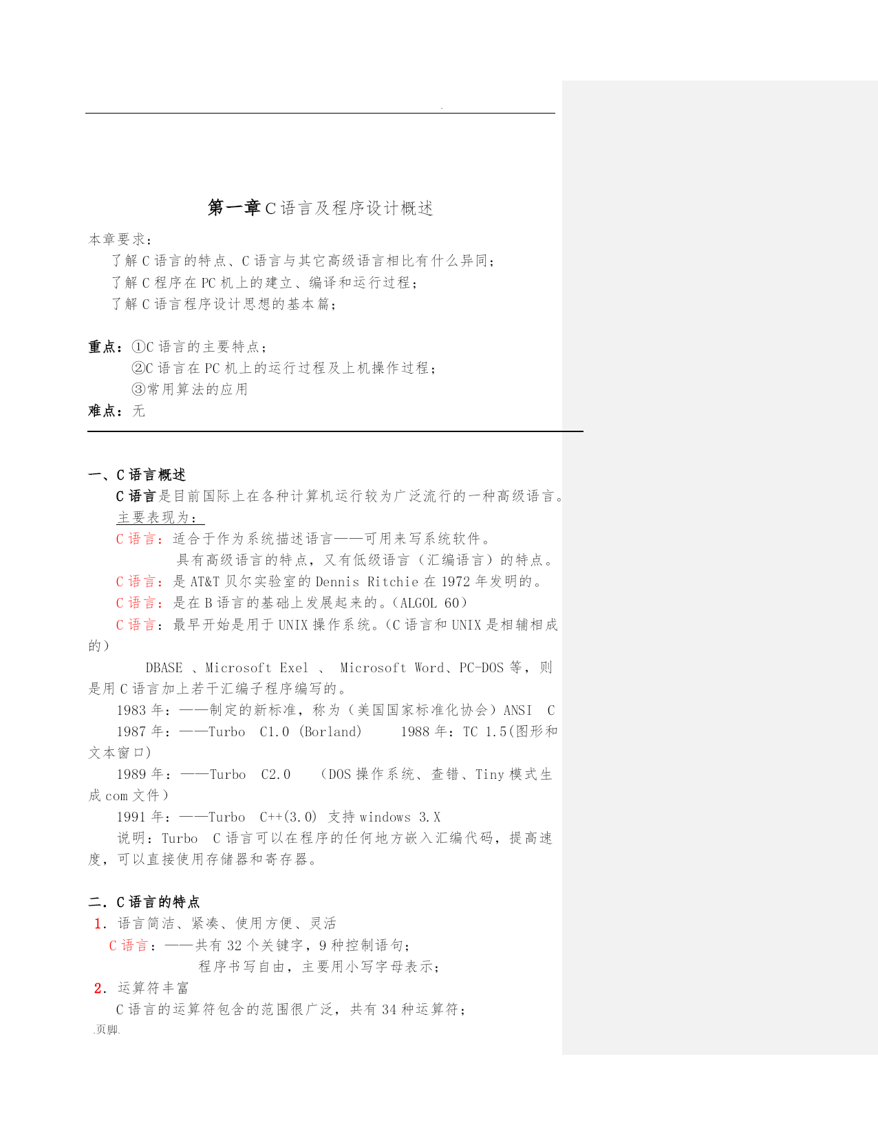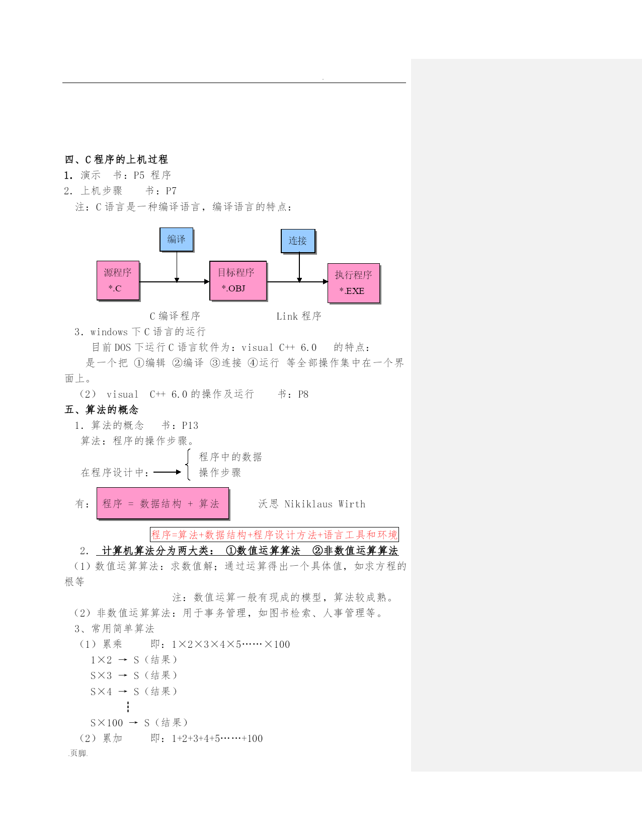 . .页脚. 第一章C语言及程序设计概述 本章要求: 了解C语言的特点、C语言与其它高级语言相比有什么异同; 了解C程序在PC机上的建立、编译和运行过程; 了解C语言程序设计思想的基本篇; 重点:=1\*GB3①C语言的主要特点; =2\*GB3②C语言在PC机上的运行过程及上机操作过程; =3\*GB3③常用算法的应用 难点:无 一、C语言概述 C语言是目前国际上在各种计算机运行较为广泛流行的一种高级语言。 主要表现为: C语言:适合于作为系统描述语言——可用来写系统软件。 具有高级语言的特点,又有低级语言(汇编语言)的特点。 C语言:是AT&T贝尔实验室的DennisRitchie在1972年发明的。 C语言:是在B语言的基础上发展起来的。(ALGOL60) C语言:最早开始是用于UNIX操作系统。(C语言和UNIX是相辅相成的) DBASE、MicrosoftExel、MicrosoftWord、PC-DOS等,则是用C语言加上若干汇编子程序编写的。 1983年:——制定的新标准,称为(美国国家标准化协会)ANSIC 1987年:——TurboC1.0(Borland)1988年:TC1.5(图形和文本窗口) 1989年:——TurboC2.0(DOS操作系统、查错、Tiny模式生成com文件) 1991年:——TurboC++(3.0)支持windows3.X 说明:TurboC语言可以在程序的任何地方嵌入汇编代码,提高速度,可以直接使用存储器和寄存器。 二.C语言的特点 1.语言简洁、紧凑、使用方便、灵活 C语言:——共有32个关键字,9种控制语句; 程序书写自由,主要用小写字母表示; 2.运算符丰富 C语言的运算符包含的范围很广泛,共有34种运算符; 即:把括号、赋值、强制类型转换都作为运算符处理 3.有丰富的数据类型 整型、实型、字符型、数据类型、指针类型、结构体类型、共用体(联合)类型等。实现复杂的数据结构(链表、树、栈、图)的运算。 4.具有结构化的功能,用函数作为程序模块,实现程序的模块化 5.语法限制不太严格,程序设计自由度大。(放宽了语法检查) 例:1)对数组下标越界不作检查,由程序编写者自己保证程序的正确; 2)整型数据、字符型数据、逻辑型数据可以通用。 6.能直接访问物理地址,能进行位(bit)操作,能实现汇编语言的大部分功能,可以直接对硬件进行操作。 7.生成目标代码质量高,程序执行效率高。 8.用C语言编写的程序,移植性较好。 说明: C语言比其它高级语言难掌握,对编程人员要求较高 程序员使用C语言编写程序会感到限制少、灵活性大,功能强,可以编写出任何类型的程序。 三.C程序的构成 例: main()/*主函数*/ { inta,b,sum;/*定义变量*/ a=123;b=456; sum=a+b; printf(“sumis%d\n”,sum);/*输出变量*/ } 说明: 1)程序一般用小写字母书写; 2)每个程序必须要有一个main()(只能一个),称主函数; 注:C程序是由函数构成的,函数是C程序的基本单位。 函数:系统提供的库函数;用户设计的函数。 3)程序体必须在{}之间; 4)每个语句的结尾,必须要有“;”作为终止符。 5)用/*………..*/作注释 四、C程序的上机过程 1.演示书:P5程序 2.上机步骤书:P7 注:C语言是一种编译语言,编译语言的特点: 连接 编译 目标程序 *.OBJ 执行程序 *.EXE 源程序 *.C C编译程序Link程序 3.windows下C语言的运行 目前DOS下运行C语言软件为:visualC++6.0的特点: 是一个把①编辑②编译③连接④运行等全部操作集中在一个界面上。 (2)visualC++6.0的操作及运行书:P8 五、算法的概念 1.算法的概念书:P13 算法:程序的操作步骤。 程序中的数据 在程序设计中:操作步骤 有:程序=数据结构+算法沃思NikiklausWirth 程序=算法+数据结构+程序设计方法+语言工具和环境 2.计算机算法分为两大类:①数值运算算法②非数值运算算法 (1)数值运算算法:求数值解;通过运算得出一个具体值,如求方程的根等 注:数值运算一般有现成的模型,算法较成熟。 (2)非数值运算算法:用于事务管理,如图书检索、人事管理等。 3、常用简单算法 (1)累乘即:1×2×3×4×5……×100 1×2→S(结果) S×3→S(结果) S×4→S(结果) ┇ S×100→S(结果) (2)累加即:1+2+3+4+5……+100 1+2→S(结果) S+3→S(结果) S+4→S(结果) ┇ S+100→S(结果) (3)找最大值5,2,4,12,9 5→max(max