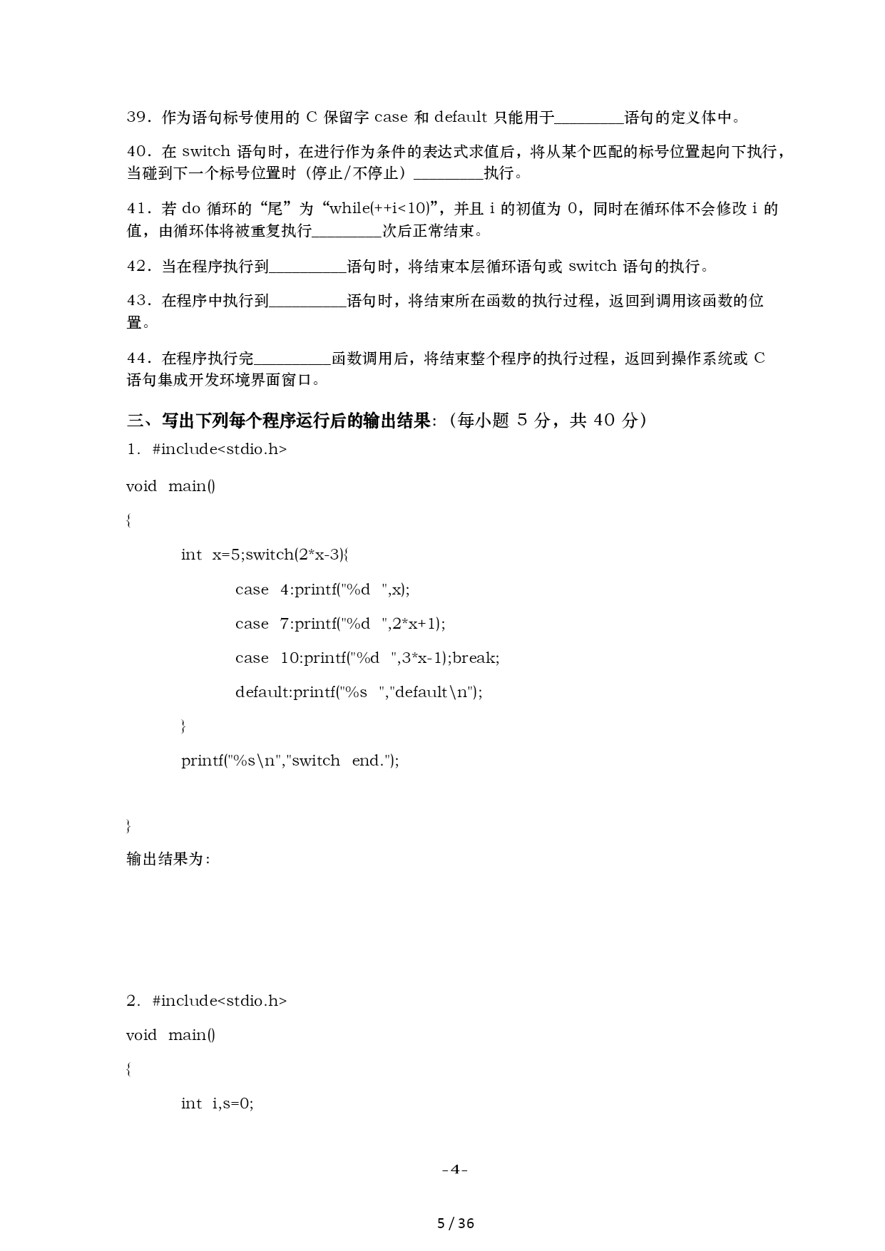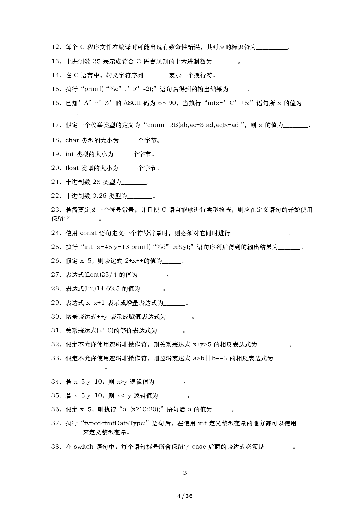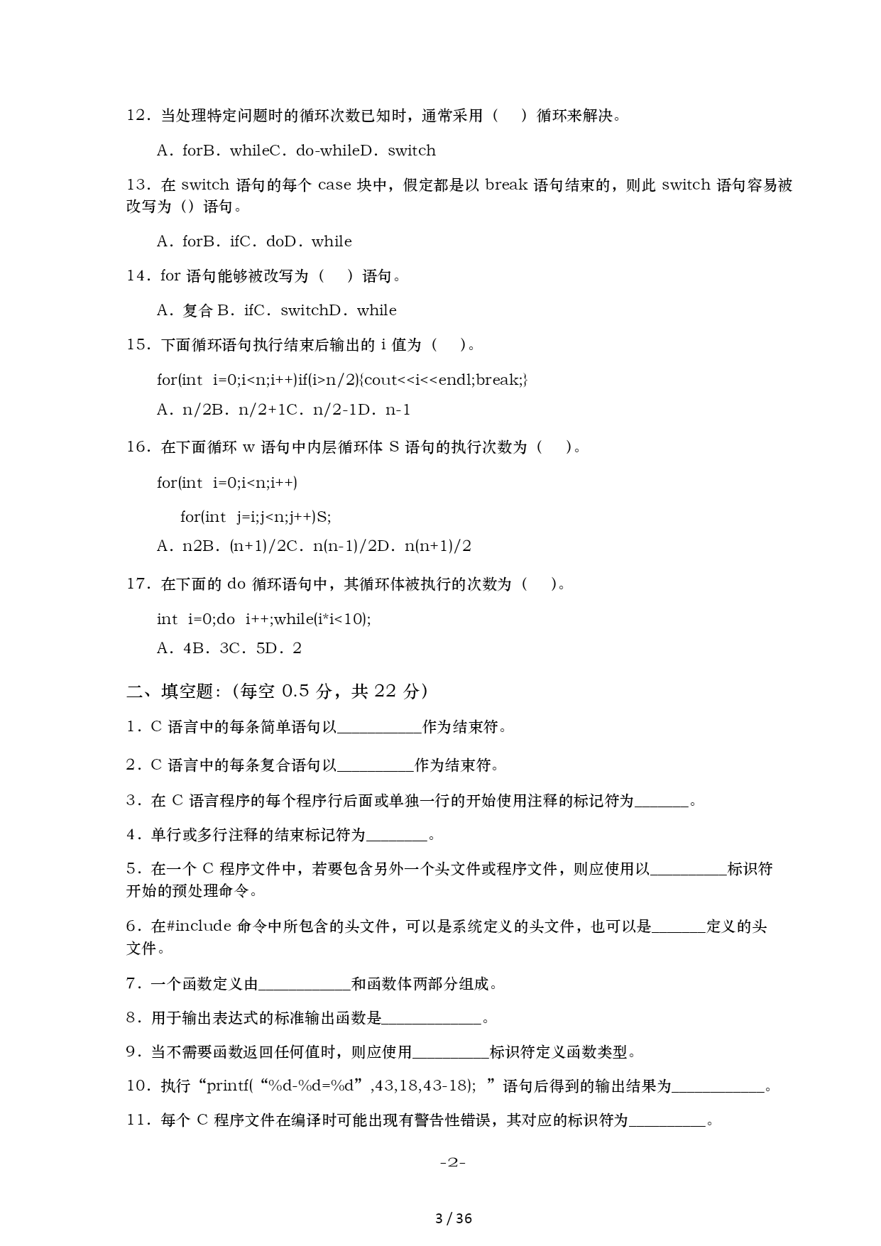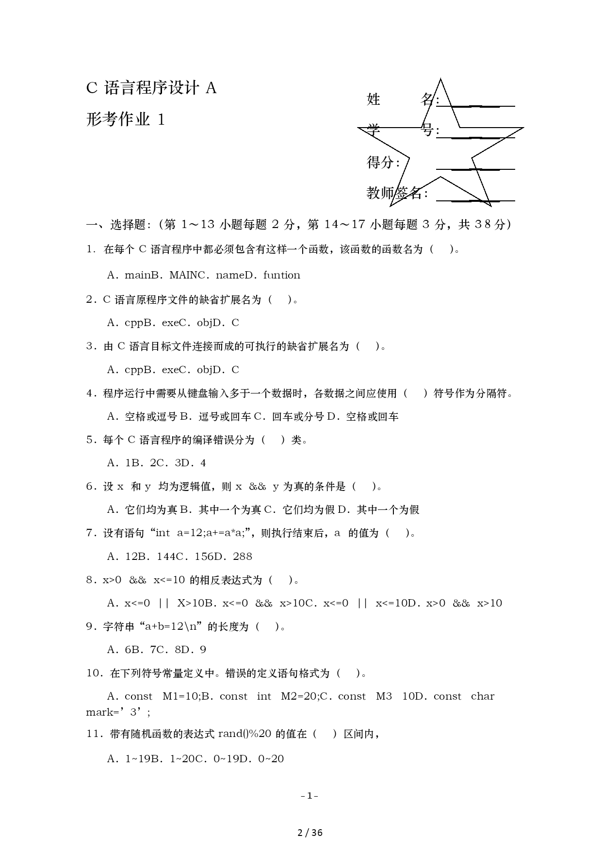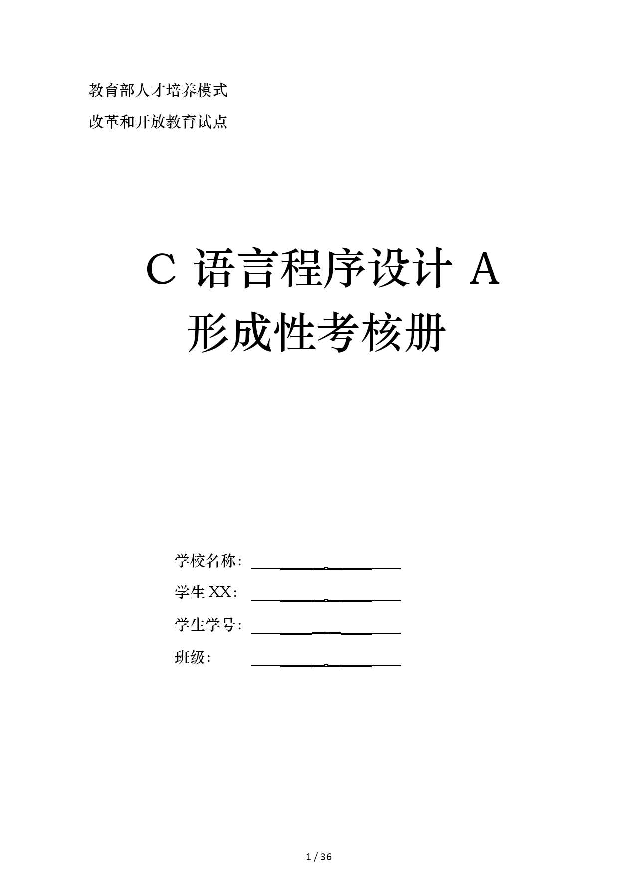 /NUMPAGES36 教育部人才培养模式 改革和开放教育试点 C语言程序设计A 形成性考核册 学校名称: 学生XX: 学生学号: 班级: C语言程序设计A 形考作业1 姓名: 学号: 得分: 教师签名: 一、选择题:(第1~13小题每题2分,第14~17小题每题3分,共38分) 1.在每个C语言程序中都必须包含有这样一个函数,该函数的函数名为()。 A.mainB.MAINC.nameD.funtion 2.C语言原程序文件的缺省扩展名为()。 A.cppB.exeC.objD.C 3.由C语言目标文件连接而成的可执行的缺省扩展名为()。 A.cppB.exeC.objD.C 4.程序运行中需要从键盘输入多于一个数据时,各数据之间应使用()符号作为分隔符。 A.空格或逗号B.逗号或回车C.回车或分号D.空格或回车 5.每个C语言程序的编译错误分为()类。 A.1B.2C.3D.4 6.设x和y均为逻辑值,则x&&y为真的条件是()。 A.它们均为真B.其中一个为真C.它们均为假D.其中一个为假 7.设有语句“inta=12;a+=a*a;”,则执行结束后,a的值为()。 A.12B.144C.156D.288 8.x>0&&x<=10的相反表达式为()。 A.x<=0||X>10B.x<=0&&x>10C.x<=0||x<=10D.x>0&&x>10 9.字符串“a+b=12\n”的长度为()。 A.6B.7C.8D.9 10.在下列符号常量定义中。错误的定义语句格式为()。 A.constM1=10;B.constintM2=20;C.constM310D.constchar mark=’3’; 11.带有随机函数的表达式rand()%20的值在()区间内, A.1~19B.1~20C.0~19D.0~20 -1- 12.当处理特定问题时的循环次数已知时,通常采用()循环来解决。 A.forB.whileC.do-whileD.switch 13.在switch语句的每个case块中,假定都是以break语句结束的,则此switch语句容易被 改写为()语句。 A.forB.ifC.doD.while 14.for语句能够被改写为()语句。 A.复合B.ifC.switchD.while 15.下面循环语句执行结束后输出的i值为()。 for(inti=0;i<n;i++)if(i>n/2){cout<<i<<endl;break;} A.n/2B.n/2+1C.n/2-1D.n-1 16.在下面循环w语句中内层循环体S语句的执行次数为()。 for(inti=0;i<n;i++) for(intj=i;j<n;j++)S; A.n2B.(n+1)/2C.n(n-1)/2D.n(n+1)/2 17.在下面的do循环语句中,其循环体被执行的次数为()。 inti=0;doi++;while(i*i<10); A.4B.3C.5D.2 二、填空题:(每空0.5分,共22分) 1.C语言中的每条简单语句以___________作为结束符。 2.C语言中的每条复合语句以__________作为结束符。 3.在C语言程序的每个程序行后面或单独一行的开始使用注释的标记符为_______。 4.单行或多行注释的结束标记符为________。 5.在一个C程序文件中,若要包含另外一个头文件或程序文件,则应使用以__________标识符 开始的预处理命令。 6.在#include命令中所包含的头文件,可以是系统定义的头文件,也可以是_______定义的头 文件。 7.一个函数定义由____________和函数体两部分组成。 8.用于输出表达式的标准输出函数是_____________。 9.当不需要函数返回任何值时,则应使用__________标识符定义函数类型。 10.执行“printf(“%d-%d=%d”,43,18,43-18);”语句后得到的输出结果为____________。 11.每个C程序文件在编译时可能出现有警告性错误,其对应的标识符为__________。 -2- 12.每个C程序文件在编译时可能出现有致命性错误,其对应的标识符为__________。 13.十进制数25表示成符合C语言规则的十六进制数为________。 14.在C语言中,转义字符序列________表示一个换行符。 15.执行“printf(“%c”,’F’-2);”语句后得到的输出结果为______。 16.已知’A’~’Z’的ASCII码为65-90,当