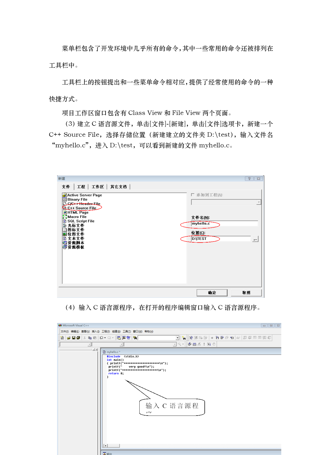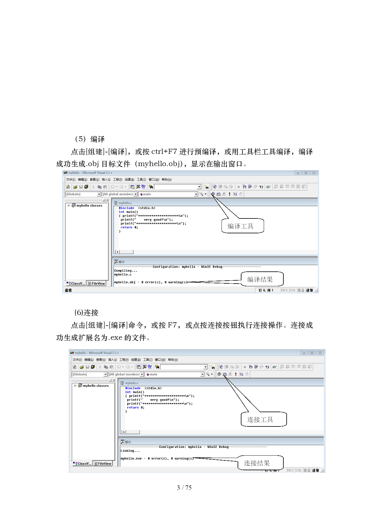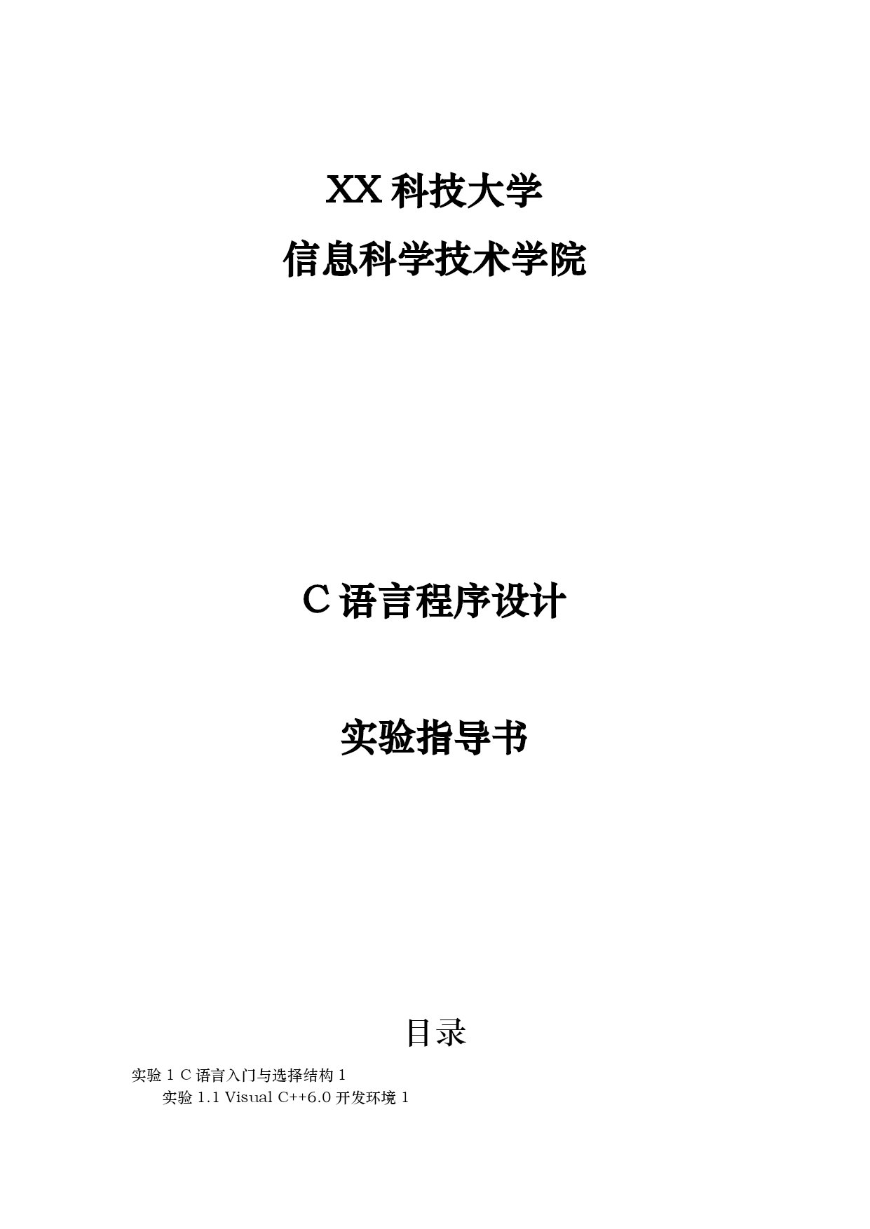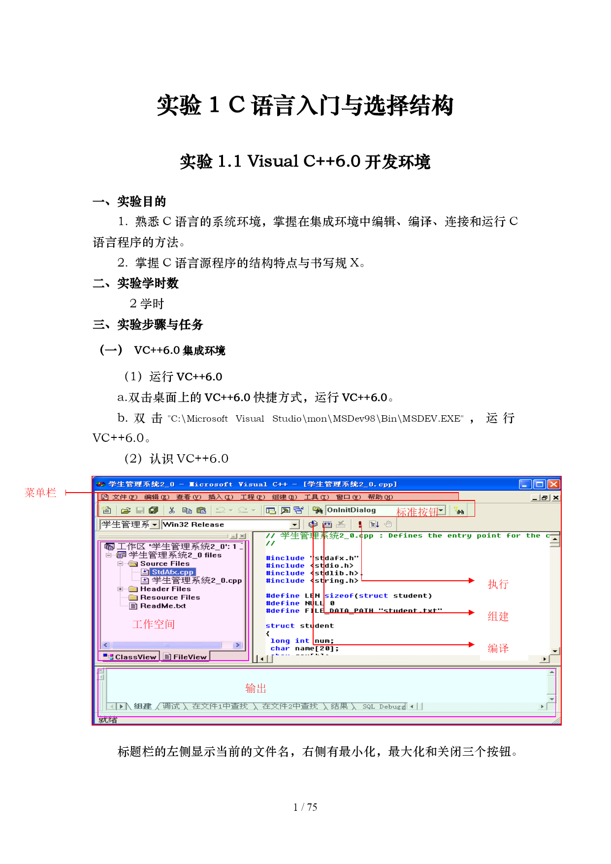 /NUMPAGES75 ADDINKISM.UserStyle XX科技大学 信息科学技术学院 C语言程序设计 实验指导书 目录 TOC\o"1-3"\h\z\uHYPERLINK\l"_Toc430035092"实验1C语言入门与选择结构PAGEREF_Toc430035092\h1 HYPERLINK\l"_Toc430035093"实验1.1VisualC++6.0开发环境PAGEREF_Toc430035093\h1 HYPERLINK\l"_Toc430035094"实验1.2C程序快速入门PAGEREF_Toc430035094\h8 HYPERLINK\l"_Toc430035095"实验1.3算术运算与赋值运算PAGEREF_Toc430035095\h12 HYPERLINK\l"_Toc430035096"实验1.4逻辑运算与if语句PAGEREF_Toc430035096\h18 HYPERLINK\l"_Toc430035097"实验1.5switch选择结构PAGEREF_Toc430035097\h24 HYPERLINK\l"_Toc430035098"实验2循环结构与数组(共8学时)PAGEREF_Toc430035098\h28 HYPERLINK\l"_Toc430035099"实验2.1循环结构(2学时)PAGEREF_Toc430035099\h28 HYPERLINK\l"_Toc430035100"循环结构程序设计补充PAGEREF_Toc430035100\h33 HYPERLINK\l"_Toc430035101"实验2.2数组一:一维数组PAGEREF_Toc430035101\h37 HYPERLINK\l"_Toc430035102"实验2.3数组二:二维数组PAGEREF_Toc430035102\h44 HYPERLINK\l"_Toc430035103"实验2.4数组三:字符数组PAGEREF_Toc430035103\h46 HYPERLINK\l"_Toc430035104"实验3:函数与自定义数据类型PAGEREF_Toc430035104\h50 HYPERLINK\l"_Toc430035105"实验3.1函数一:函数的定义、调用和声明PAGEREF_Toc430035105\h50 HYPERLINK\l"_Toc430035106"实验3.2函数二:函数的参数传递2PAGEREF_Toc430035106\h56 HYPERLINK\l"_Toc430035107"实验3.3函数三:函数的嵌套和递归2PAGEREF_Toc430035107\h58 HYPERLINK\l"_Toc430035108"实验3.4自定义数据类型(2学时)PAGEREF_Toc430035108\h60 HYPERLINK\l"_Toc430035109"实验4:指针(共6学时)PAGEREF_Toc430035109\h62 HYPERLINK\l"_Toc430035110"实验4.1指针一:指针的定义与运算PAGEREF_Toc430035110\h62 HYPERLINK\l"_Toc430035111"实验4.2指针二:指向数组的指针PAGEREF_Toc430035111\h68 HYPERLINK\l"_Toc430035112"实验4.3指针三:用指针操作字符串2PAGEREF_Toc430035112\h72 实验1C语言入门与选择结构 实验1.1VisualC++6.0开发环境 一、实验目的 1.熟悉C语言的系统环境,掌握在集成环境中编辑、编译、连接和运行C语言程序的方法。 2.掌握C语言源程序的结构特点与书写规X。 二、实验学时数 2学时 三、实验步骤与任务 (一)VC++6.0集成环境 (1)运行VC++6.0 a.双击桌面上的VC++6.0快捷方式,运行VC++6.0。 b.双击"C:\MicrosoftVisualStudio\mon\MSDev98\Bin\MSDEV.EXE",运行VC++6.0。 (2)认识VC++6.0 菜单栏 标准按钮 执行 执行 组建 工作空间 编译 输出 标题栏的左侧显示当前的文件名,右侧有最小化,最大化和关闭三个按钮。 菜单栏包含了开发环境中几乎所有的命令,其中一些常用的命令还被排列在工具栏中。 工具栏