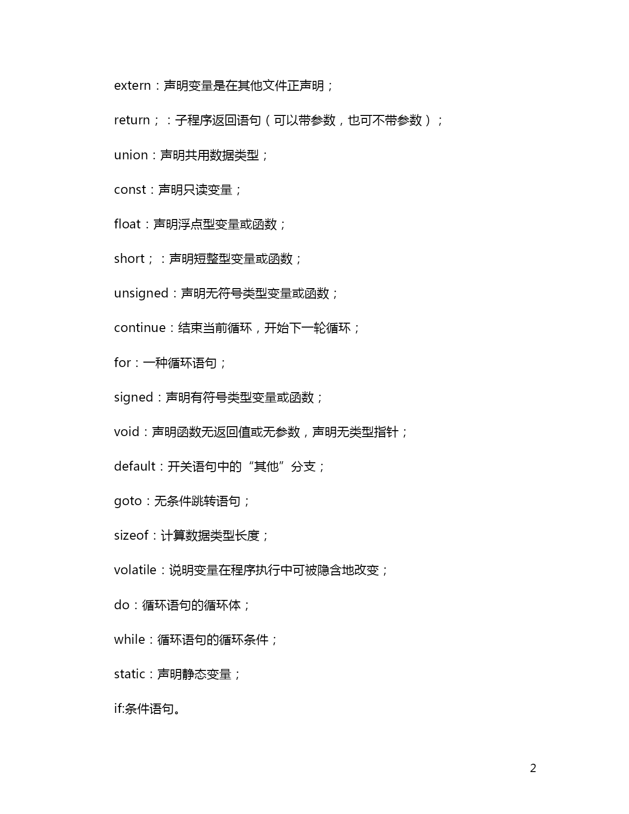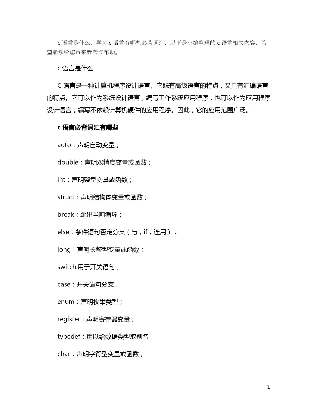 c语言是什么,学习c语言有哪些必背词汇,以下是小编整理的c语言相关内容,希望能够给您带来参考与帮助。 c语言是什么 C语言是一种计算机程序设计语言。它既有高级语言的特点,又具有汇编语言的特点。它可以作为系统设计语言,编写工作系统应用程序,也可以作为应用程序设计语言,编写不依赖计算机硬件的应用程序。因此,它的应用范围广泛。 c语言必背词汇有哪些 auto:声明自动变量; double:声明双精度变量或函数; int:声明整型变量或函数; struct:声明结构体变量或函数; break:跳出当前循环; else:条件语句否定分支(与;if;连用); long:声明长整型变量或函数; switch:用于开关语句; case:开关语句分支; enum:声明枚举类型; register:声明寄存器变量; typedef:用以给数据类型取别名 char:声明字符型变量或函数; extern:声明变量是在其他文件正声明; return;:子程序返回语句(可以带参数,也可不带参数); union:声明共用数据类型; const:声明只读变量; float:声明浮点型变量或函数; short;:声明短整型变量或函数; unsigned:声明无符号类型变量或函数; continue:结束当前循环,开始下一轮循环; for:一种循环语句; signed:声明有符号类型变量或函数; void:声明函数无返回值或无参数,声明无类型指针; default:开关语句中的“其他”分支; goto:无条件跳转语句; sizeof:计算数据类型长度; volatile:说明变量在程序执行中可被隐含地改变; do:循环语句的循环体; while:循环语句的循环条件; static:声明静态变量; if:条件语句。 C语言有什么用 C语言对操作系统和系统使用程序以及需要对硬件进行操作的场合,用C语言明显优于其它解释型高级语言,有一些大型应用软件也是用C语言编写的。 C语言具有绘图能力强,可移植性,并具备很强的数据处理能力,因此适于编写系统软件,三维,二维图形和动画。它是数值计算的高级语言。