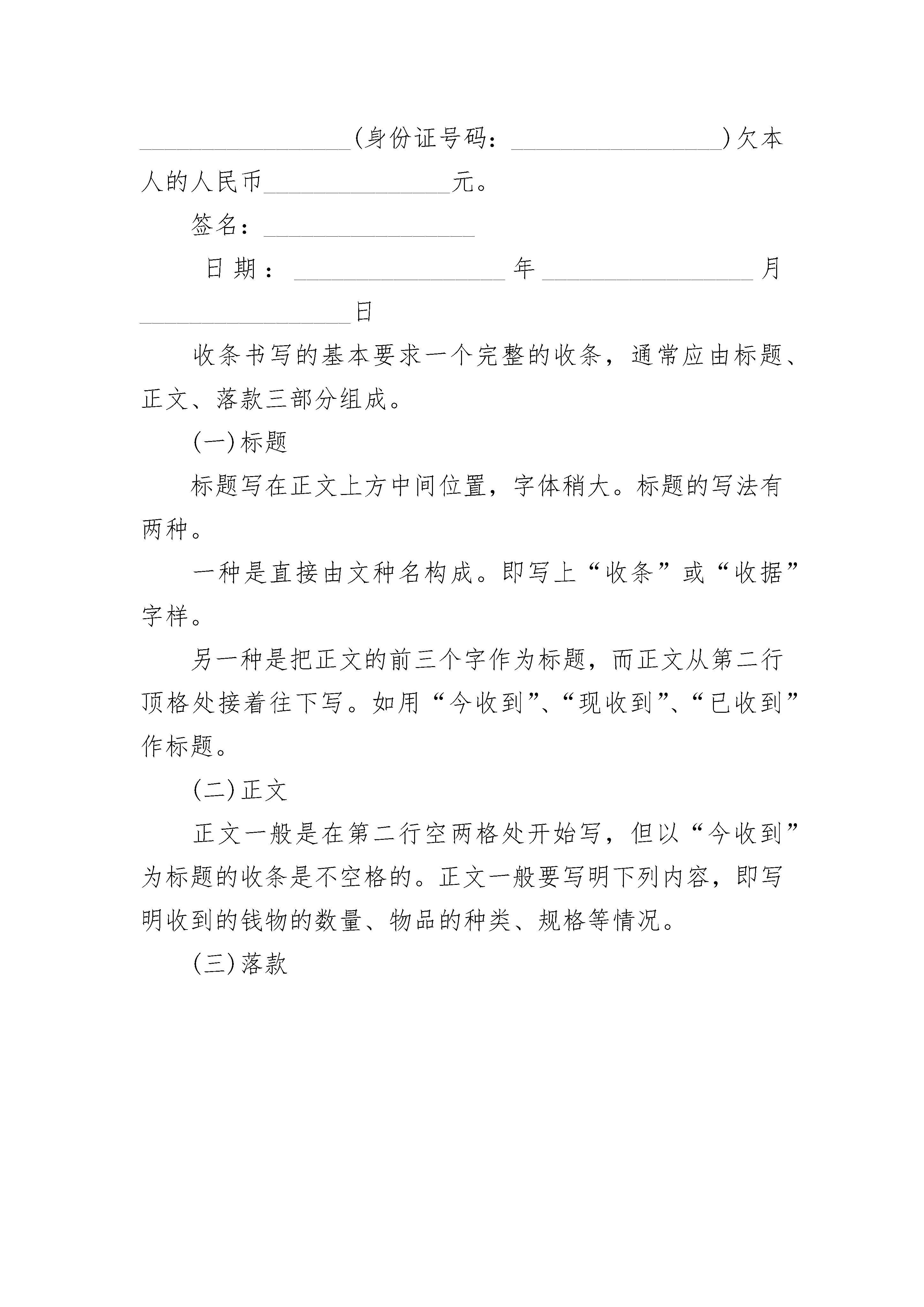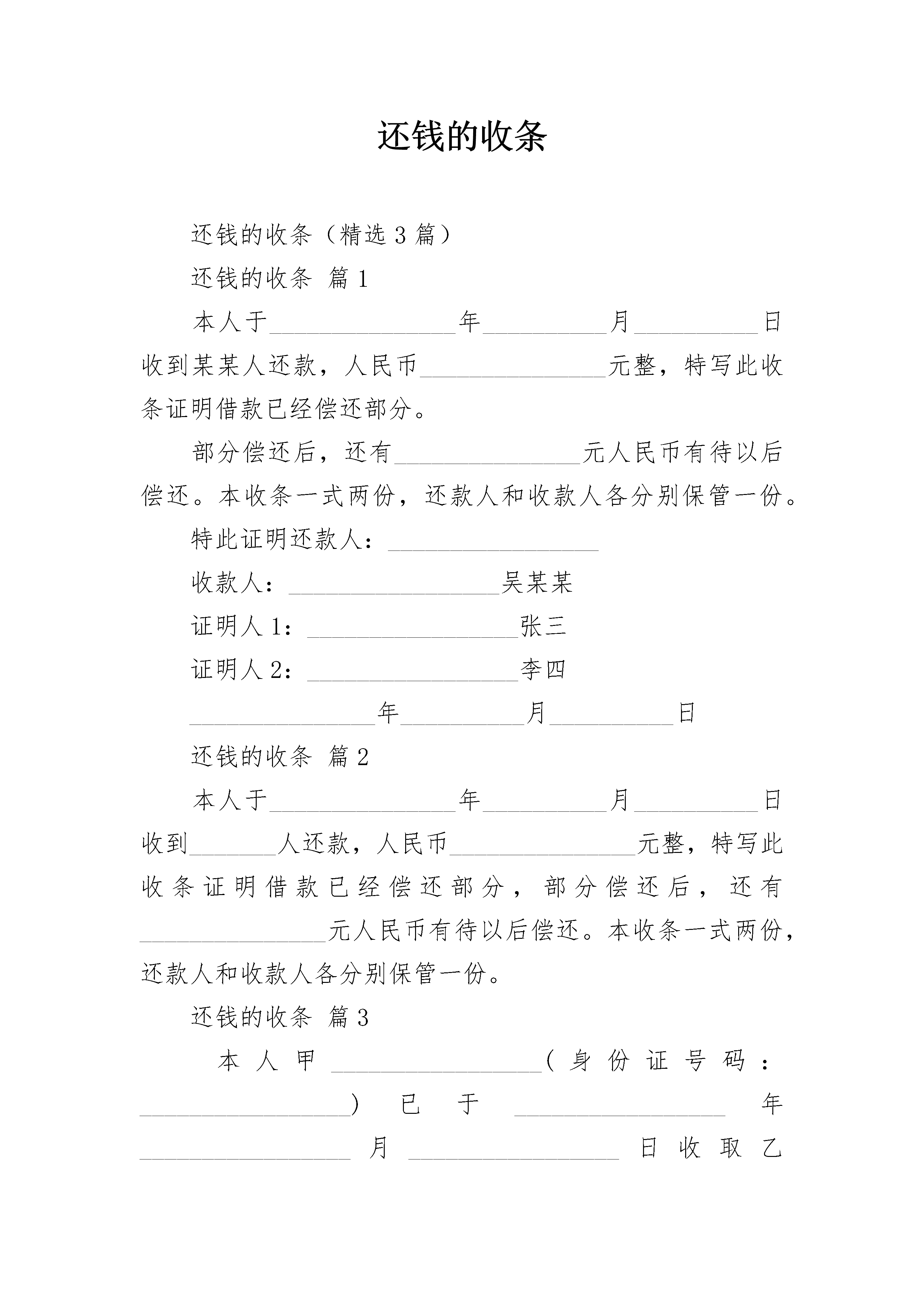 还钱的收条还钱的收条(精选3篇)还钱的收条篇1本人于_______________年__________月__________日收到某某人还款,人民币_______________元整,特写此收条证明借款已经偿还部分。部分偿还后,还有_______________元人民币有待以后偿还。本收条一式两份,还款人和收款人各分别保管一份。特此证明还款人:_________________收款人:_________________吴某某证明人1:_________________张三证明人2:_________________李四_______________年__________月__________日还钱的收条篇2本人于_______________年__________月__________日收到_______人还款,人民币_______________元整,特写此收条证明借款已经偿还部分,部分偿还后,还有_______________元人民币有待以后偿还。本收条一式两份,还款人和收款人各分别保管一份。还钱的收条篇3本人甲_________________(身份证号码:_________________)已于_________________年_________________月_________________日收取乙_________________(身份证号码:_________________)欠本人的人民币_______________元。签名:_________________日期:_________________年_________________月_________________日收条书写的基本要求一个完整的收条,通常应由标题、正文、落款三部分组成。(一)标题标题写在正文上方中间位置,字体稍大。标题的写法有两种。一种是直接由文种名构成。即写上“收条”或“收据”字样。另一种是把正文的前三个字作为标题,而正文从第二行顶格处接着往下写。如用“今收到”、“现收到”、“已收到”作标题。(二)正文正文一般是在第二行空两格处开始写,但以“今收到”为标题的收条是不空格的。正文一般要写明下列内容,即写明收到的钱物的数量、物品的种类、规格等情况。(三)落款