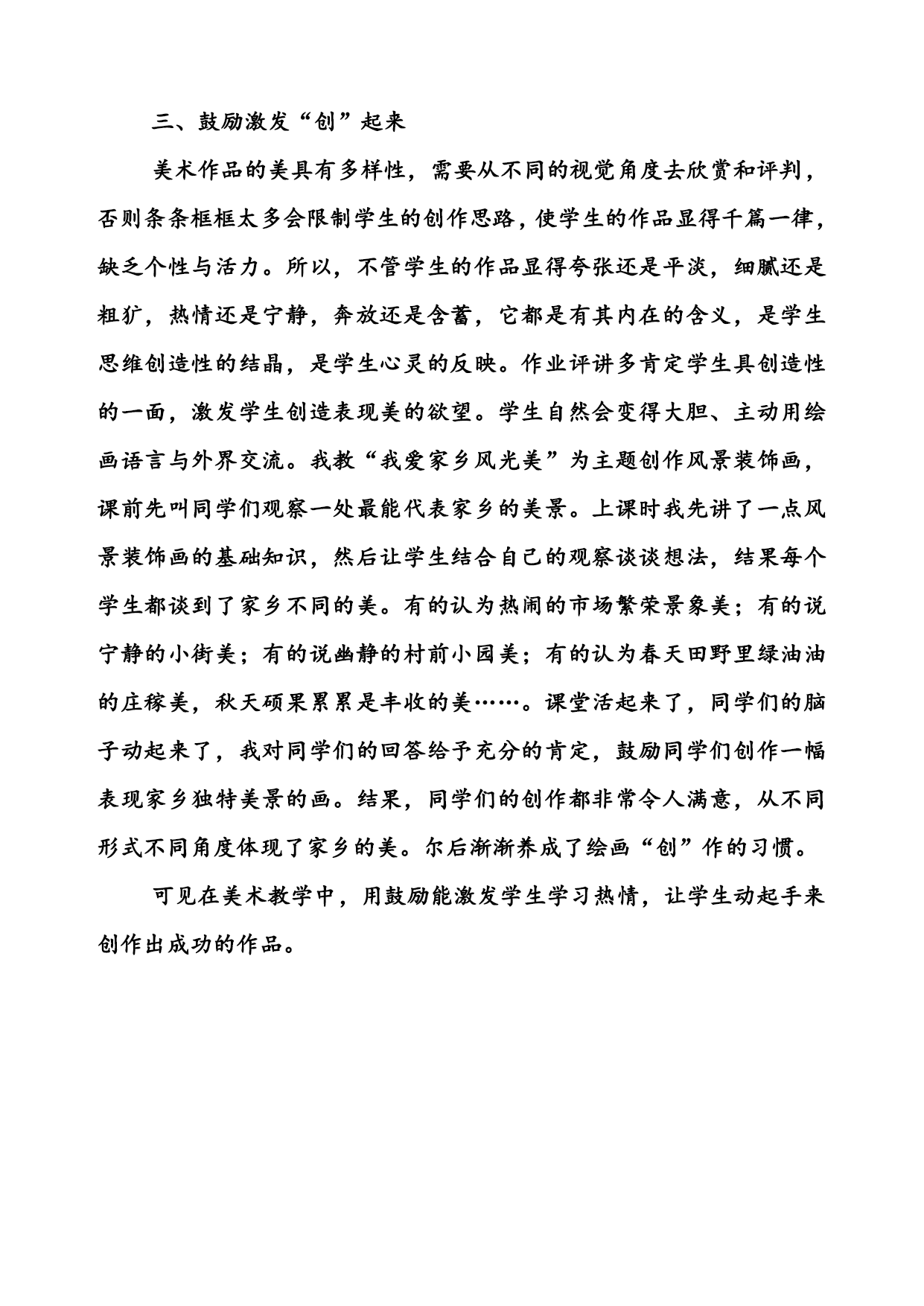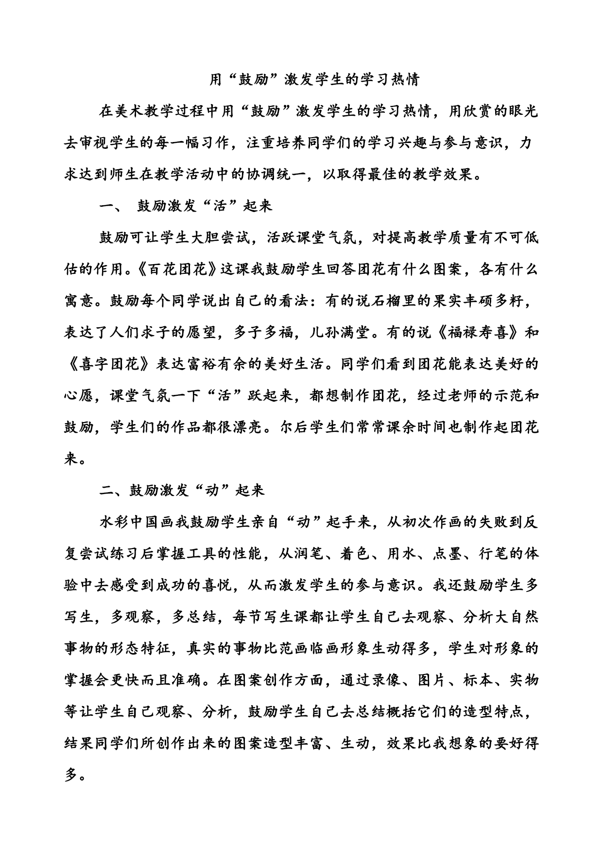 用“鼓励”激发学生的学习热情 在美术教学过程中用“鼓励”激发学生的学习热情,用欣赏的眼光去审视学生的每一幅习作,注重培养同学们的学习兴趣与参与意识,力求达到师生在教学活动中的协调统一,以取得最佳的教学效果。 一、鼓励激发“活”起来 鼓励可让学生大胆尝试,活跃课堂气氛,对提高教学质量有不可低估的作用。《百花团花》这课我鼓励学生回答团花有什么图案,各有什么寓意。鼓励每个同学说出自己的看法:有的说石榴里的果实丰硕多籽,表达了人们求子的愿望,多子多福,儿孙满堂。有的说《福禄寿喜》和《喜字团花》表达富裕有余的美好生活。同学们看到团花能表达美好的心愿,课堂气氛一下“活”跃起来,都想制作团花,经过老师的示范和鼓励,学生们的作品都很漂亮。尔后学生们常常课余时间也制作起团花来。 二、鼓励激发“动”起来 水彩中国画我鼓励学生亲自“动”起手来,从初次作画的失败到反复尝试练习后掌握工具的性能,从润笔、着色、用水、点墨、行笔的体验中去感受到成功的喜悦,从而激发学生的参与意识。我还鼓励学生多写生,多观察,多总结,每节写生课都让学生自己去观察、分析大自然事物的形态特征,真实的事物比范画临画形象生动得多,学生对形象的掌握会更快而且准确。在图案创作方面,通过录像、图片、标本、实物等让学生自己观察、分析,鼓励学生自己去总结概括它们的造型特点,结果同学们所创作出来的图案造型丰富、生动,效果比我想象的要好得多。 三、鼓励激发“创”起来 美术作品的美具有多样性,需要从不同的视觉角度去欣赏和评判,否则条条框框太多会限制学生的创作思路,使学生的作品显得千篇一律,缺乏个性与活力。所以,不管学生的作品显得夸张还是平淡,细腻还是粗犷,热情还是宁静,奔放还是含蓄,它都是有其内在的含义,是学生思维创造性的结晶,是学生心灵的反映。作业评讲多肯定学生具创造性的一面,激发学生创造表现美的欲望。学生自然会变得大胆、主动用绘画语言与外界交流。我教“我爱家乡风光美”为主题创作风景装饰画,课前先叫同学们观察一处最能代表家乡的美景。上课时我先讲了一点风景装饰画的基础知识,然后让学生结合自己的观察谈谈想法,结果每个学生都谈到了家乡不同的美。有的认为热闹的市场繁荣景象美;有的说宁静的小街美;有的说幽静的村前小园美;有的认为春天田野里绿油油的庄稼美,秋天硕果累累是丰收的美……。课堂活起来了,同学们的脑子动起来了,我对同学们的回答给予充分的肯定,鼓励同学们创作一幅表现家乡独特美景的画。结果,同学们的创作都非常令人满意,从不同形式不同角度体现了家乡的美。尔后渐渐养成了绘画“创”作的习惯。 可见在美术教学中,用鼓励能激发学生学习热情,让学生动起手来创作出成功的作品。
