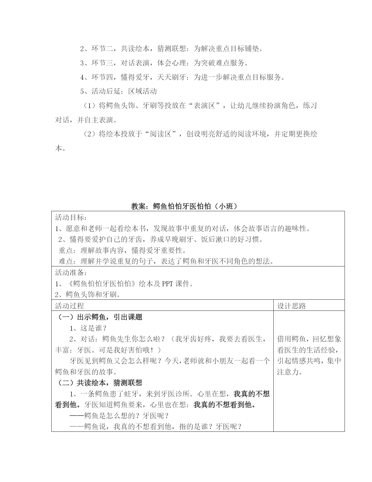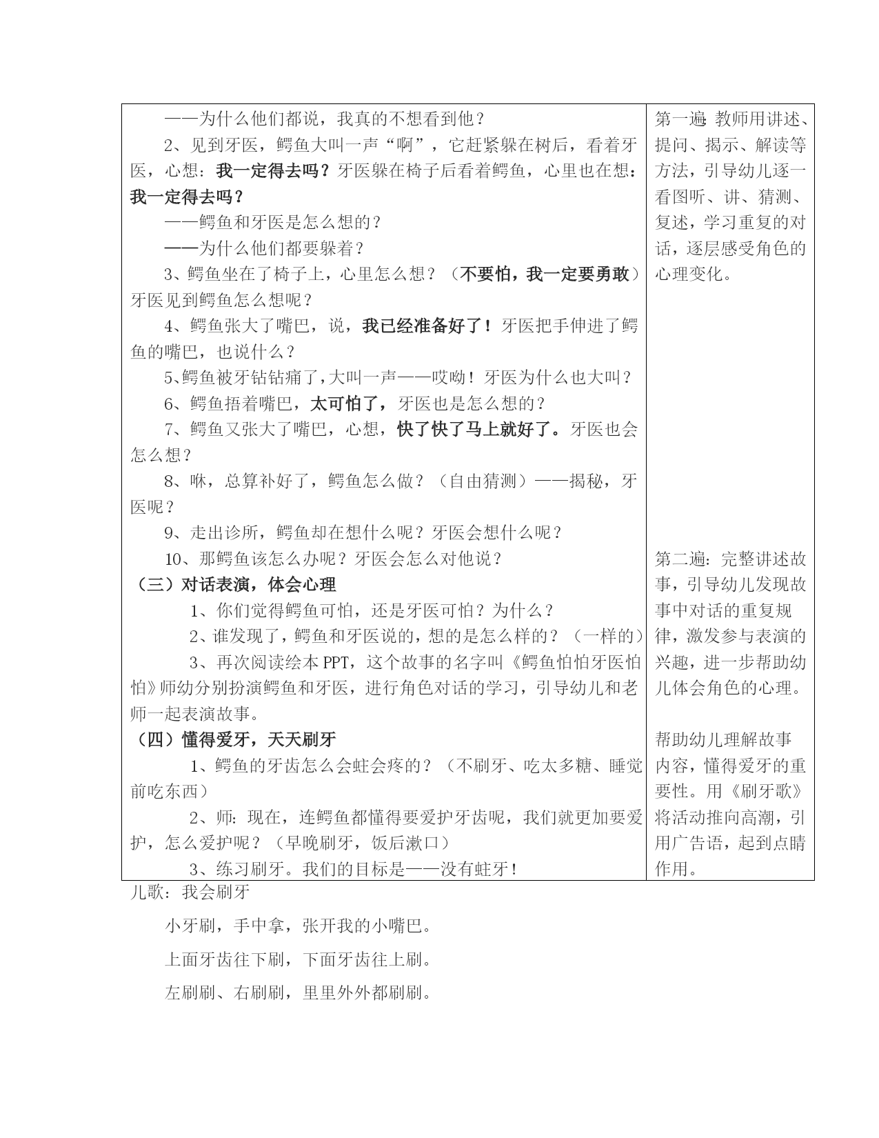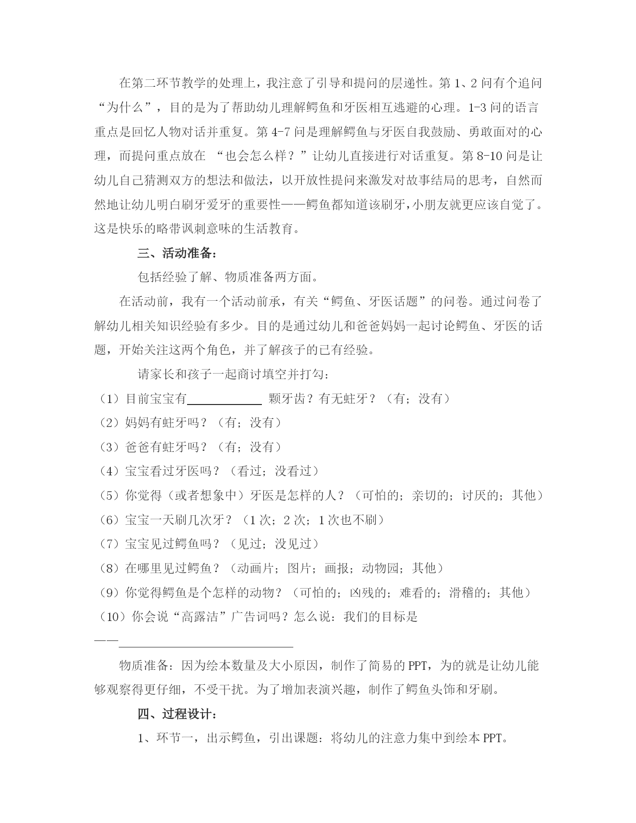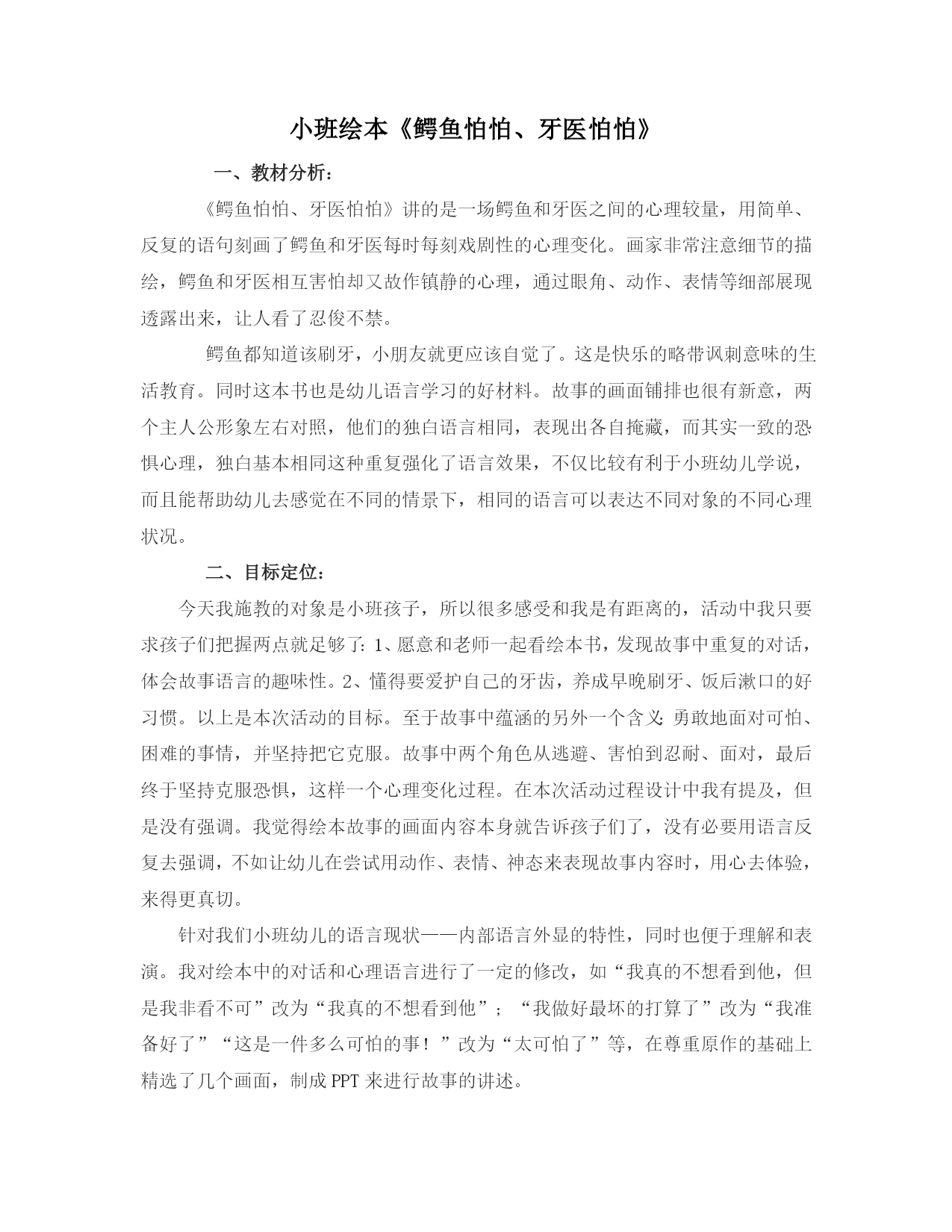 小班绘本《鳄鱼怕怕、牙医怕怕》 一、教材分析: 《鳄鱼怕怕、牙医怕怕》讲的是一场鳄鱼和牙医之间的心理较量,用简单、反复的语句刻画了鳄鱼和牙医每时每刻戏剧性的心理变化。画家非常注意细节的描绘,鳄鱼和牙医相互害怕却又故作镇静的心理,通过眼角、动作、表情等细部展现透露出来,让人看了忍俊不禁。 鳄鱼都知道该刷牙,小朋友就更应该自觉了。这是快乐的略带讽刺意味的生活教育。同时这本书也是幼儿语言学习的好材料。故事的画面铺排也很有新意,两个主人公形象左右对照,他们的独白语言相同,表现出各自掩藏,而其实一致的恐惧心理,独白基本相同这种重复强化了语言效果,不仅比较有利于小班幼儿学说,而且能帮助幼儿去感觉在不同的情景下,相同的语言可以表达不同对象的不同心理状况。 二、目标定位: 今天我施教的对象是小班孩子,所以很多感受和我是有距离的,活动中我只要求孩子们把握两点就足够了:1、愿意和老师一起看绘本书,发现故事中重复的对话,体会故事语言的趣味性。2、懂得要爱护自己的牙齿,养成早晚刷牙、饭后漱口的好习惯。以上是本次活动的目标。至于故事中蕴涵的另外一个含义:勇敢地面对可怕、困难的事情,并坚持把它克服。故事中两个角色从逃避、害怕到忍耐、面对,最后终于坚持克服恐惧,这样一个心理变化过程。在本次活动过程设计中我有提及,但是没有强调。我觉得绘本故事的画面内容本身就告诉孩子们了,没有必要用语言反复去强调,不如让幼儿在尝试用动作、表情、神态来表现故事内容时,用心去体验,来得更真切。 针对我们小班幼儿的语言现状——内部语言外显的特性,同时也便于理解和表演。我对绘本中的对话和心理语言进行了一定的修改,如“我真的不想看到他,但是我非看不可”改为“我真的不想看到他”;“我做好最坏的打算了”改为“我准备好了”“这是一件多么可怕的事!”改为“太可怕了”等,在尊重原作的基础上精选了几个画面,制成PPT来进行故事的讲述。 在第二环节教学的处理上,我注意了引导和提问的层递性。第1、2问有个追问“为什么”,目的是为了帮助幼儿理解鳄鱼和牙医相互逃避的心理。1-3问的语言重点是回忆人物对话并重复。第4-7问是理解鳄鱼与牙医自我鼓励、勇敢面对的心理,而提问重点放在“也会怎么样?”让幼儿直接进行对话重复。第8-10问是让幼儿自己猜测双方的想法和做法,以开放性提问来激发对故事结局的思考,自然而然地让幼儿明白刷牙爱牙的重要性——鳄鱼都知道该刷牙,小朋友就更应该自觉了。这是快乐的略带讽刺意味的生活教育。 三、活动准备: 包括经验了解、物质准备两方面。 在活动前,我有一个活动前承,有关“鳄鱼、牙医话题”的问卷。通过问卷了解幼儿相关知识经验有多少。目的是通过幼儿和爸爸妈妈一起讨论鳄鱼、牙医的话题,开始关注这两个角色,并了解孩子的已有经验。 请家长和孩子一起商讨填空并打勾: (1)目前宝宝有颗牙齿?有无蛀牙?(有;没有) (2)妈妈有蛀牙吗?(有;没有) (3)爸爸有蛀牙吗?(有;没有) (4)宝宝看过牙医吗?(看过;没看过) (5)你觉得(或者想象中)牙医是怎样的人?(可怕的;亲切的;讨厌的;其他) (6)宝宝一天刷几次牙?(1次;2次;1次也不刷) (7)宝宝见过鳄鱼吗?(见过;没见过) (8)在哪里见过鳄鱼?(动画片;图片;画报;动物园;其他) (9)你觉得鳄鱼是个怎样的动物?(可怕的;凶残的;难看的;滑稽的;其他) (10)你会说“高露洁”广告词吗?怎么说:我们的目标是—— 物质准备:因为绘本数量及大小原因,制作了简易的PPT,为的就是让幼儿能够观察得更仔细,不受干扰。为了增加表演兴趣,制作了鳄鱼头饰和牙刷。 四、过程设计: 1、环节一,出示鳄鱼,引出课题:将幼儿的注意力集中到绘本PPT。 2、环节二,共读绘本,猜测联想:为解决重点目标铺垫。 3、环节三,对话表演,体会心理:为突破难点服务。 4、环节四,懂得爱牙,天天刷牙:为进一步解决重点目标服务。 5、活动后延:区域活动 (1)将鳄鱼头饰、牙刷等投放在“表演区”,让幼儿继续扮演角色,练习对话,并自主表演。 (2)将绘本投放于“阅读区”,创设明亮舒适的阅读环境,并定期更换绘本。 教案:鳄鱼怕怕牙医怕怕(小班) 活动目标: 1、愿意和老师一起看绘本书,发现故事中重复的对话,体会故事语言的趣味性。 2、懂得要爱护自己的牙齿,养成早晚刷牙、饭后漱口的好习惯。 重点:理解故事内容,懂得爱牙重要性。 难点:理解并学说重复的句子,表达了鳄鱼和牙医不同角色的想法。活动准备: 1、《鳄鱼怕怕牙医怕怕》绘本及PPT课件。 2、鳄鱼头饰和牙刷。活动过程设计思路(一)出示鳄鱼,引出课题 1、这是谁? 2、对话:鳄鱼先生你怎么啦?(我牙齿好疼,我要去看医生,丰富:牙医。可是我好害怕哦!) 牙医见到鳄鱼又会怎么样呢?今天,老师就和小朋友一起看一个鳄鱼和牙医的故事。 (