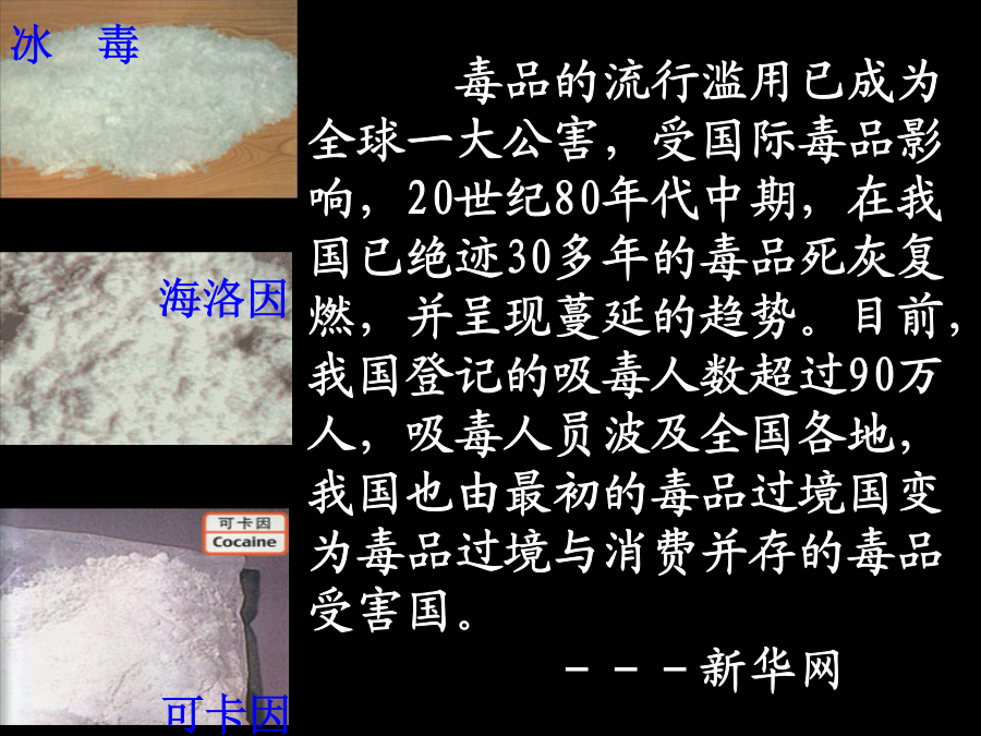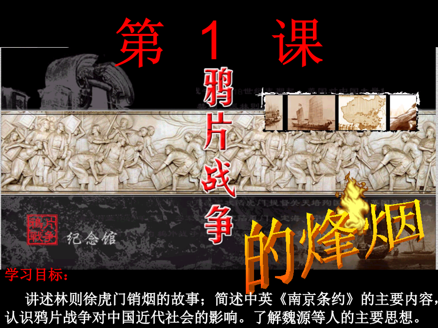 的烽烟冰毒鸦片吸食鸦片普通的鸦片烟馆装饰考究的鸦片烟馆街头乞丐在吸食鸦片请列举一下,吸食鸦片,对个人社会国家有哪些危害?读一读读一读想一想1799第1课鸦片战争的烽烟想一想西方的工业生产中英贸易第1课鸦片战争的烽烟不是吗,“奴隶贸易”比起“鸦片贸易”来,都要算是 仁慈的。我们没有毁灭非洲人的肉体,因为我们的直接 利益要求保持他们的生命;我们没有败坏他们的品格、 腐蚀他们的思想,也没有毁灭他们的灵魂。可是,鸦片 贩子在腐蚀、败坏和毁灭了不幸的罪人的精神存在以后, 还杀害他们的肉体。 ――(英)蒙哥马利•马丁第1课鸦片战争的烽烟英国外相巴麦尊在议会上发表的讲话: “(虎门销烟)把能给我们大英帝国带来无限利益的大批的商品,全部给予销毁!这是我大英帝国的奇耻大辱!我要求议会批准政府派遣远征军去惩罚那个极其野蛮的国家!要狠狠地教训它!要迫使它开放更多的港口,要保护我们天经地义的合法贸易!”第1课鸦片战争的烽烟鸦片战争时期装备齐全的清军鸦片战争时期清军使用的竹制火铳上海第1课鸦片战争的烽烟第1课鸦片战争的烽烟议一议:第1课鸦片战争的烽烟同学们一定英国为开新市场,走私鸦片危害广. 民族英雄林则徐,虎门硝烟为国强. 一八四零鸦战起,《南京条约》丧权益. 赔款通商又割地,苦难中国自此始.1.中英《南京条约》中开放的五处通商口岸从北到南的排序是() A.广州、厦门、福州、宁波、上海 B上海、福州、宁波、厦门、广州 C上海、宁波、福州、厦门、广州 D上海、宁波、厦门、福州、广州 练一练练一练问答题: 西方学者说鸦片战争是“维护商业”的 战争,对不对?为什么?活动与探究挑战你的智商——鸦片战争前虎门销烟虎门销烟图虎门销毁鸦片烟池碑文纽约·林则徐广场耆英、伊里布、牛鉴与璞鼎查,在南京下关江面的英国军舰“皋华丽”签订中英《南京条约》。被占领的香港北京
