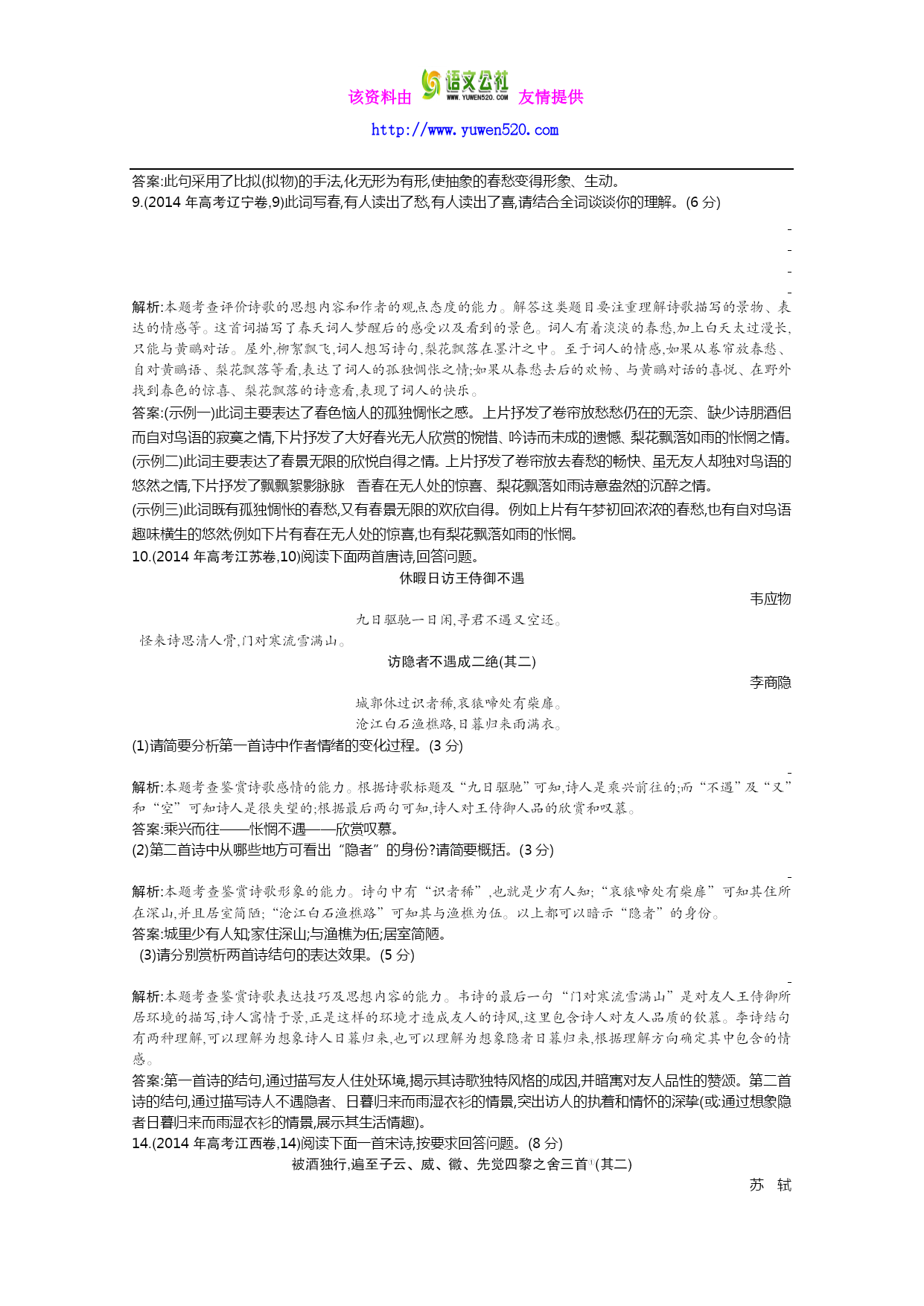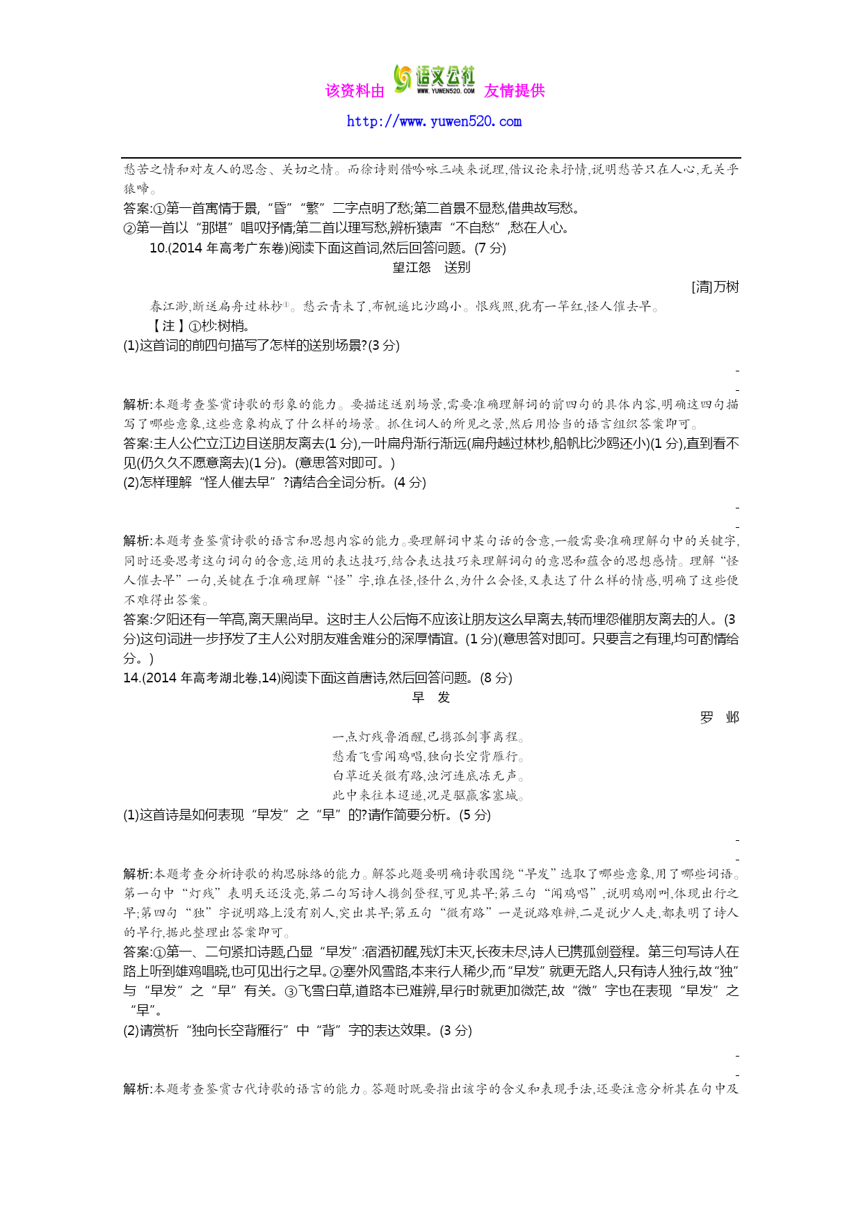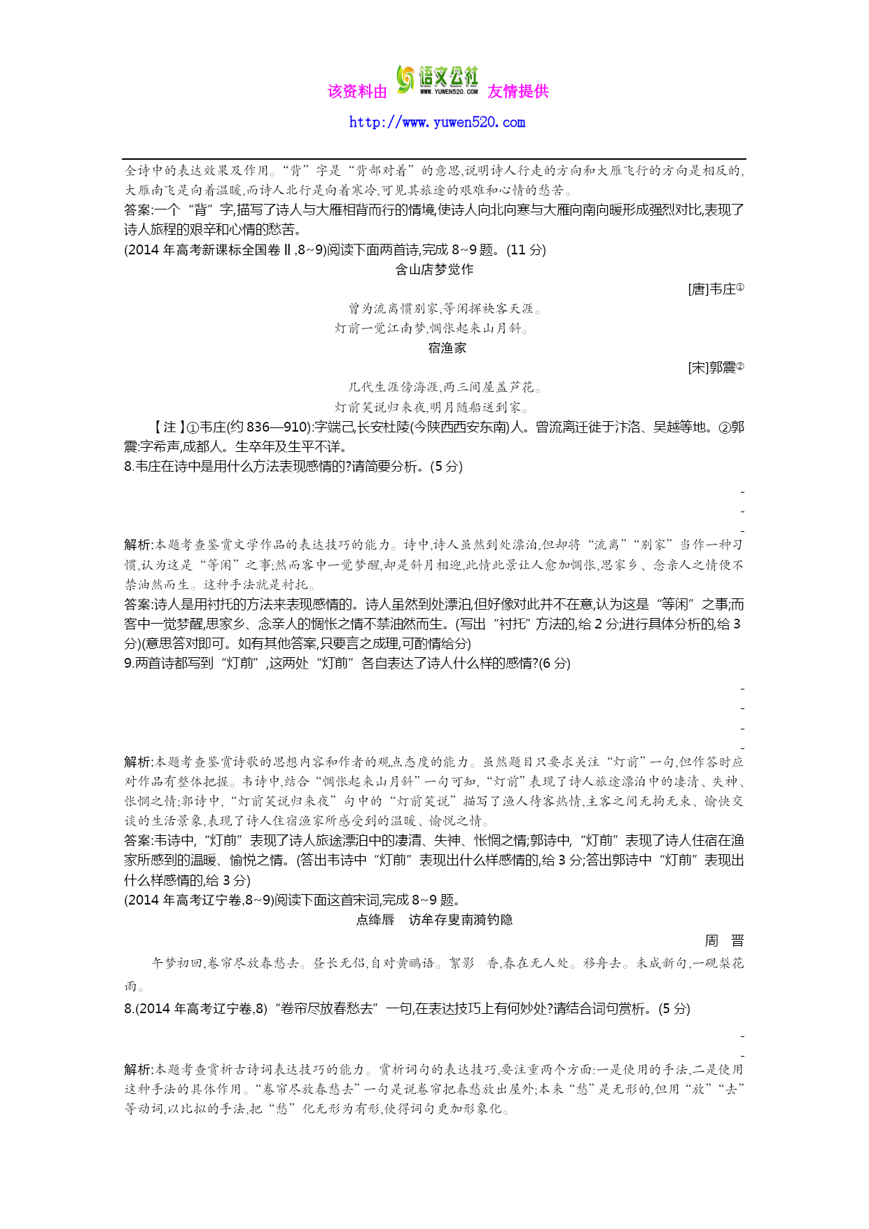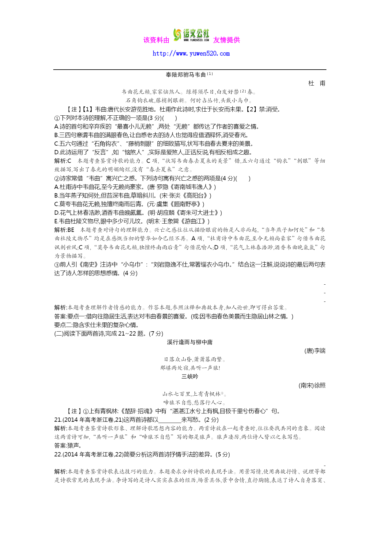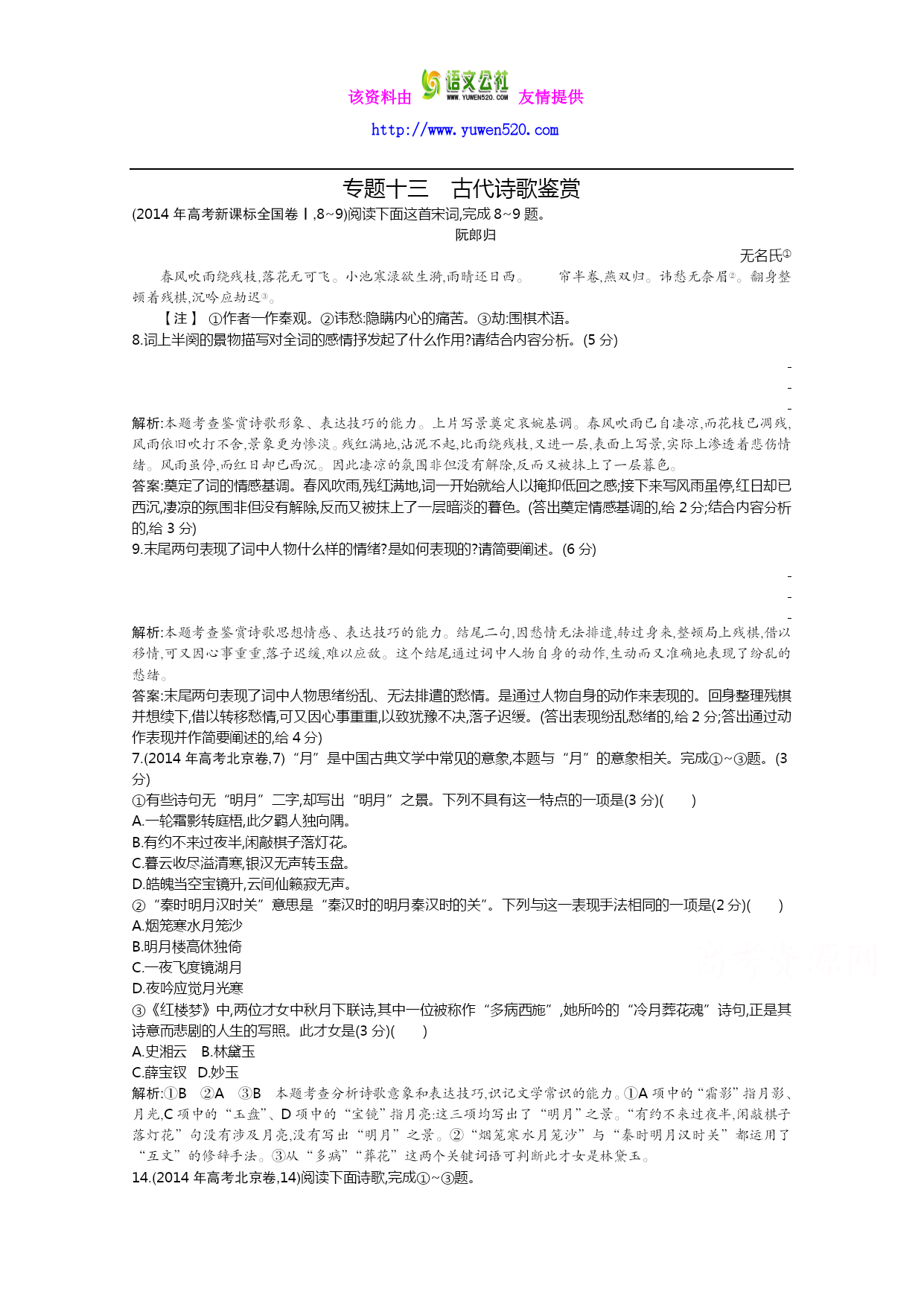 该资料由友情提供 http://www.yuwen520.com 专题十三古代诗歌鉴赏 (2014年高考新课标全国卷Ⅰ,8~9)阅读下面这首宋词,完成8~9题。 阮郎归 无名氏① 春风吹雨绕残枝,落花无可飞。小池寒渌欲生漪,雨晴还日西。帘半卷,燕双归。讳愁无奈眉②。翻身整顿着残棋,沉吟应劫迟③。 【注】①作者一作秦观。②讳愁:隐瞒内心的痛苦。③劫:围棋术语。 8.词上半阕的景物描写对全词的感情抒发起了什么作用?请结合内容分析。(5分) 解析:本题考查鉴赏诗歌形象、表达技巧的能力。上片写景奠定哀婉基调。春风吹雨已自凄凉,而花枝已凋残,风雨依旧吹打不舍,景象更为惨淡。残红满地,沾泥不起,比雨绕残枝,又进一层,表面上写景,实际上渗透着悲伤情绪。风雨虽停,而红日却已西沉。因此凄凉的氛围非但没有解除,反而又被抹上了一层暮色。 答案:奠定了词的情感基调。春风吹雨,残红满地,词一开始就给人以掩抑低回之感;接下来写风雨虽停,红日却已西沉,凄凉的氛围非但没有解除,反而又被抹上了一层暗淡的暮色。(答出奠定情感基调的,给2分;结合内容分析的,给3分) 9.末尾两句表现了词中人物什么样的情绪?是如何表现的?请简要阐述。(6分) 解析:本题考查鉴赏诗歌思想情感、表达技巧的能力。结尾二句,因愁情无法排遣,转过身来,整顿局上残棋,借以移情,可又因心事重重,落子迟缓,难以应敌。这个结尾通过词中人物自身的动作,生动而又准确地表现了纷乱的愁绪。 答案:末尾两句表现了词中人物思绪纷乱、无法排遣的愁情。是通过人物自身的动作来表现的。回身整理残棋并想续下,借以转移愁情,可又因心事重重,以致犹豫不决,落子迟缓。(答出表现纷乱愁绪的,给2分;答出通过动作表现并作简要阐述的,给4分) 7.(2014年高考北京卷,7)“月”是中国古典文学中常见的意象,本题与“月”的意象相关。完成①~③题。(3分) ①有些诗句无“明月”二字,却写出“明月”之景。下列不具有这一特点的一项是(3分)() A.一轮霜影转庭梧,此夕羁人独向隅。 B.有约不来过夜半,闲敲棋子落灯花。 C.暮云收尽溢清寒,银汉无声转玉盘。 D.皓魄当空宝镜升,云间仙籁寂无声。 ②“秦时明月汉时关”意思是“秦汉时的明月秦汉时的关”。下列与这一表现手法相同的一项是(2分)() A.烟笼寒水月笼沙 B.明月楼高休独倚 C.一夜飞度镜湖月 D.夜吟应觉月光寒 ③《红楼梦》中,两位才女中秋月下联诗,其中一位被称作“多病西施”,她所吟的“冷月葬花魂”诗句,正是其诗意而悲剧的人生的写照。此才女是(3分)() A.史湘云 B.林黛玉 C.薛宝钗 D.妙玉 解析:①B②A③B本题考查分析诗歌意象和表达技巧,识记文学常识的能力。①A项中的“霜影”指月影、月光,C项中的“玉盘”、D项中的“宝镜”指月亮:这三项均写出了“明月”之景。“有约不来过夜半,闲敲棋子落灯花”句没有涉及月亮,没有写出“明月”之景。②“烟笼寒水月笼沙”与“秦时明月汉时关”都运用了“互文”的修辞手法。③从“多病”“葬花”这两个关键词语可判断此才女是林黛玉。 14.(2014年高考北京卷,14)阅读下面诗歌,完成①~③题。 奉陪郑驸马韦曲【1】 杜甫 韦曲花无赖,家家恼煞人。绿樽须尽日,白发好禁【2】春。 石角钩衣破,藤梢刺眼新。何时占丛竹,头戴小乌巾。 【注】【1】韦曲:唐代长安游览胜地。杜甫作此诗时,求仕于长安而未果。【2】禁:消受。 ①下列对本诗的理解,不正确的一项是(3分)() A.诗的首句和辛弃疾的“最喜小儿无赖”,两处“无赖”都传达了作者的喜爱之情。 B.三四句意谓韦曲的满眼春色,让自感老去的诗人也觉得应借酒释怀,消受春光。 C.五六句通过“石角钩衣”、“藤梢刺眼”的细致描写,状写韦曲春去夏来的美景。 D.此诗运用了“反言”,如“恼煞人”,实际是爱煞人,正话反说,有相反相成之趣。 解析:C本题考查鉴赏诗歌的能力。C项,“状写韦曲春去夏来的美景”错,五六句通过“钩衣”“刺眼”等细致描写,写出了春光的明媚绚烂,没有“春去夏来”之意。 ②诗家常借“韦曲”寓兴亡之感。下列诗句寓有兴亡之感的两项是(4分)() A.杜甫诗中韦曲花,至今无赖尚豪家。(唐·罗隐《寄南城韦逸人》) B.当年燕子知何处,但苔深韦曲,草暗斜川。(宋·张炎《高阳台》) C.莫夸韦曲花无赖,独擅终南雨后青。(元·虞集《题南野亭》) D.花气上林春浩渺,酒香韦曲晚氤氲。(明·胡应麟《寄朱可大进士》) E.韦曲杜陵文物尽,眼中多少可儿坟。(明末·王象巽《游曲江》) 解析:BE本题考查对诗句的理解能力。兴亡之感往往从描绘眼前的物是人非而起,“当年燕子知何处”和“韦曲杜陵文物尽”均是在感慨当初的繁华如今已经不再。A项,“杜甫诗中韦曲花,至今无赖尚豪家”句借韦曲花讽刺世风;C项,“莫夸韦曲