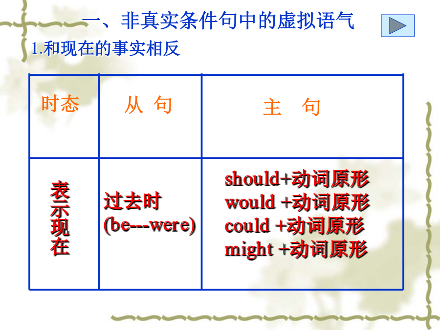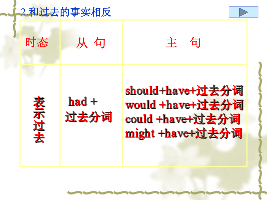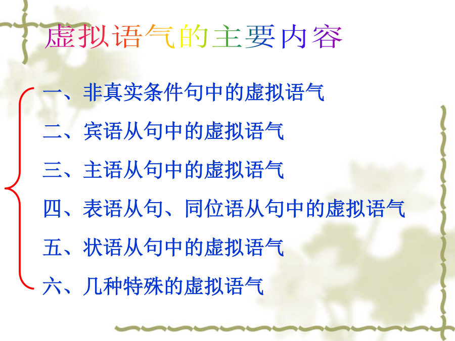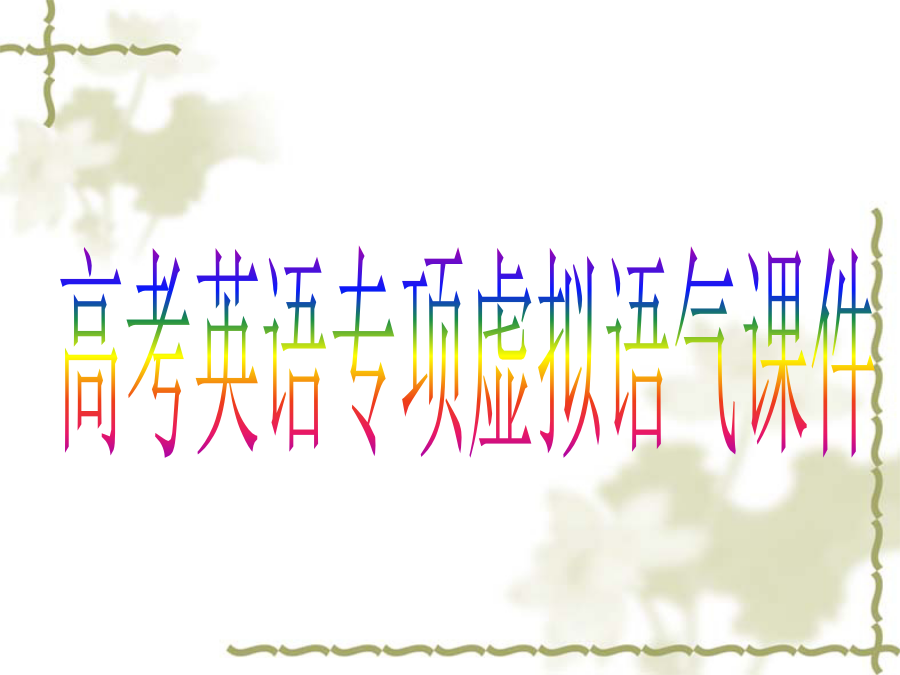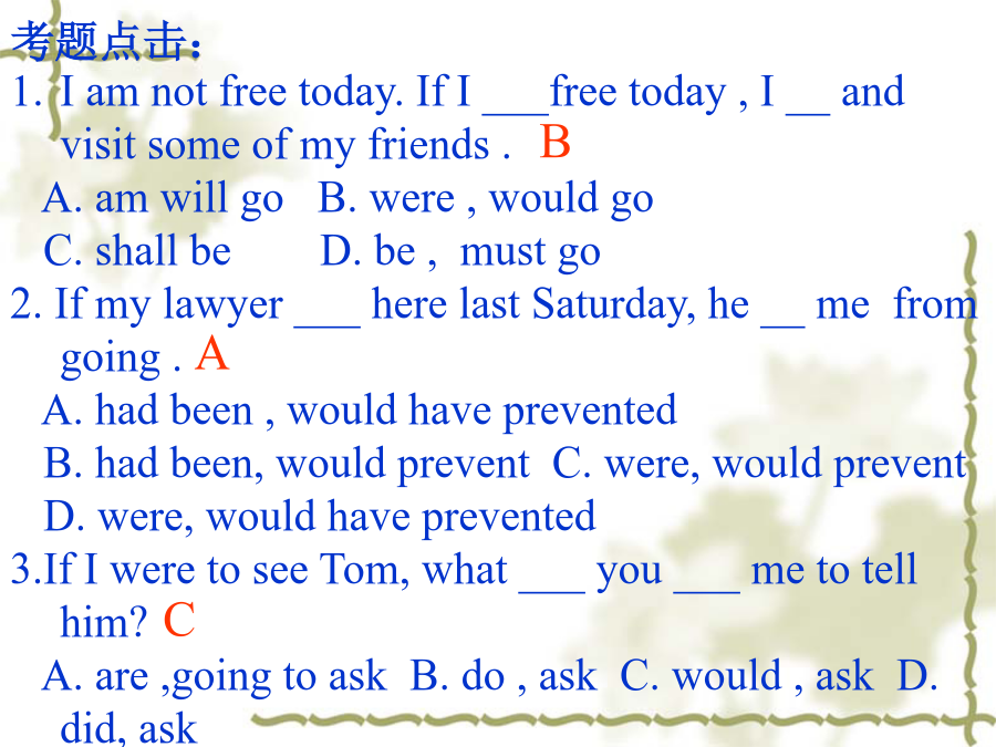 高考英语专项虚拟语气课件一、非真实条件句中的虚拟语气 二、宾语从句中的虚拟语气 三、主语从句中的虚拟语气 四、表语从句、同位语从句中的虚拟语气 五、状语从句中的虚拟语气 六、几种特殊的虚拟语气考题点击: Iamnotfreetoday.IfI___freetoday,I__andvisitsomeofmyfriends. A.amwillgoB.were,wouldgo C.shallbeD.be,mustgo 2.Ifmylawyer___herelastSaturday,he__mefromgoing. A.hadbeen,wouldhaveprevented B.hadbeen,wouldpreventC.were,wouldprevent D.were,wouldhaveprevented 3.IfIweretoseeTom,what___you___metotellhim? A.are,goingtoaskB.do,askC.would,askD.did,ask 时态 时态考题点击:考题点击: Isitnecessarythathe_____theexamination? A.takes B.hastotake C.musttake D.take 2.Itisstrangethathe_____youthis. A.wouldtellB.shouldtell C.hadtoldD.hastold 3.Itwasorderedthatnosmoking____inthe library. A.shouldallowB.beallowed C.willbeallowedD.isallowed 三、主语从句中的虚拟语气考题点击: Hissuggestionthatyou_____oncemoresoundsreasonable. A.try B.tries C.musttryD.cantry 2.Hegaveanadvicethatthey____eachother. A.helpedB.musthelpC.helpD.hadhelped 3.Mysuggestionisthatafewmorepeople___there tohelpme. A.besentB.havesentC.sentD.shouldsent四、表语从句、同位语从句中的虚拟语气考题点击: 1.Wefeltasifwe_____eachotherforyears. A.knewB.wereknowing C.hadknownD.haveknowing 2.Hetookawaytheoxygentankforfearthat it______. A.mayexploreB.exploded C.explodeD.hadexplode 五、状语从句中的虚拟语气六、几种特殊的虚拟语气2)错综时间的条件状语从句的虚拟语气 Ifyou_____himyesterday,you___whattodonow. asked…wouldknow B.hadasked…wouldhaveknown C.askedhim…know D.hadasked…wouldknow3)介词短语表条件的虚拟语气 Butforyourhelp,wecouldn’thavesucceeded. Nothingcouldlivewithoutthesun.4)情境中提供虚拟语气 Supposetherewerenogravity,objectswouldnotfallto thegroundwhendropped. Shewasn’tfeelingverywell.Otherwiseshewouldn’t haveleftthemeetingsoearly. 考题点击: Iwentbyplane;otherwiseI____muchlongertime. A.couldtakeB.wouldtake C.willhavetakenD.wouldhavetaken 5)比较ifonly与onlyif onlyif表示“只有”引导条件状语从句,陈述事实; Iwakeuponlyifthealarmclockrings. ifonly则表示“如果……就好了”。其从句中的谓语动词用一般过去时或过去完成时。 IfonlyIknewmore. Ifonlythealarmclockhadrung. Ifonlygrandmother____thistogetherwithusnow. A.willseeB.couldseeC.mustseeD.shouldsee 6)It’s(high/about)time从句: Itis(high)timethat后面的从句谓语动词要用一般过