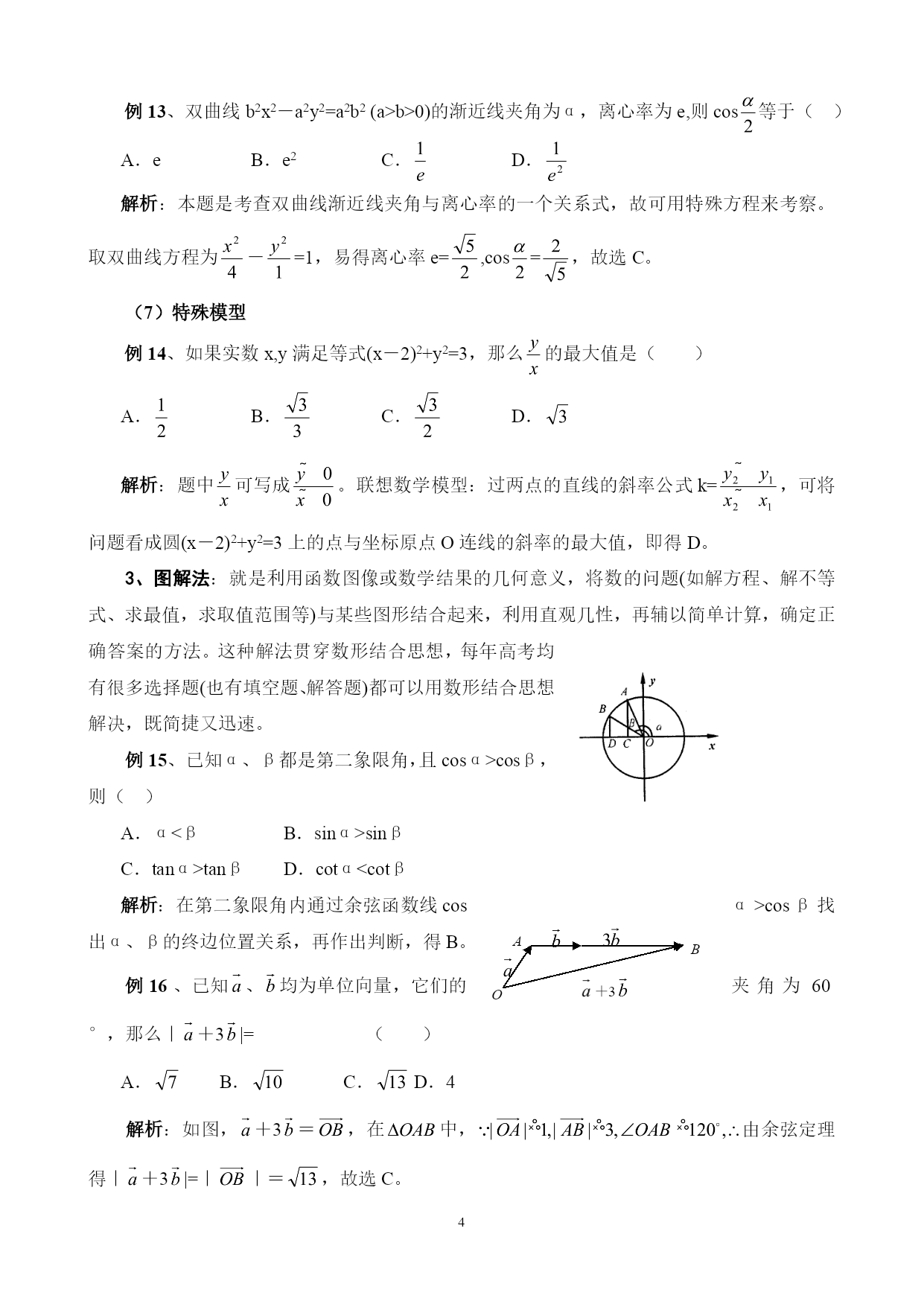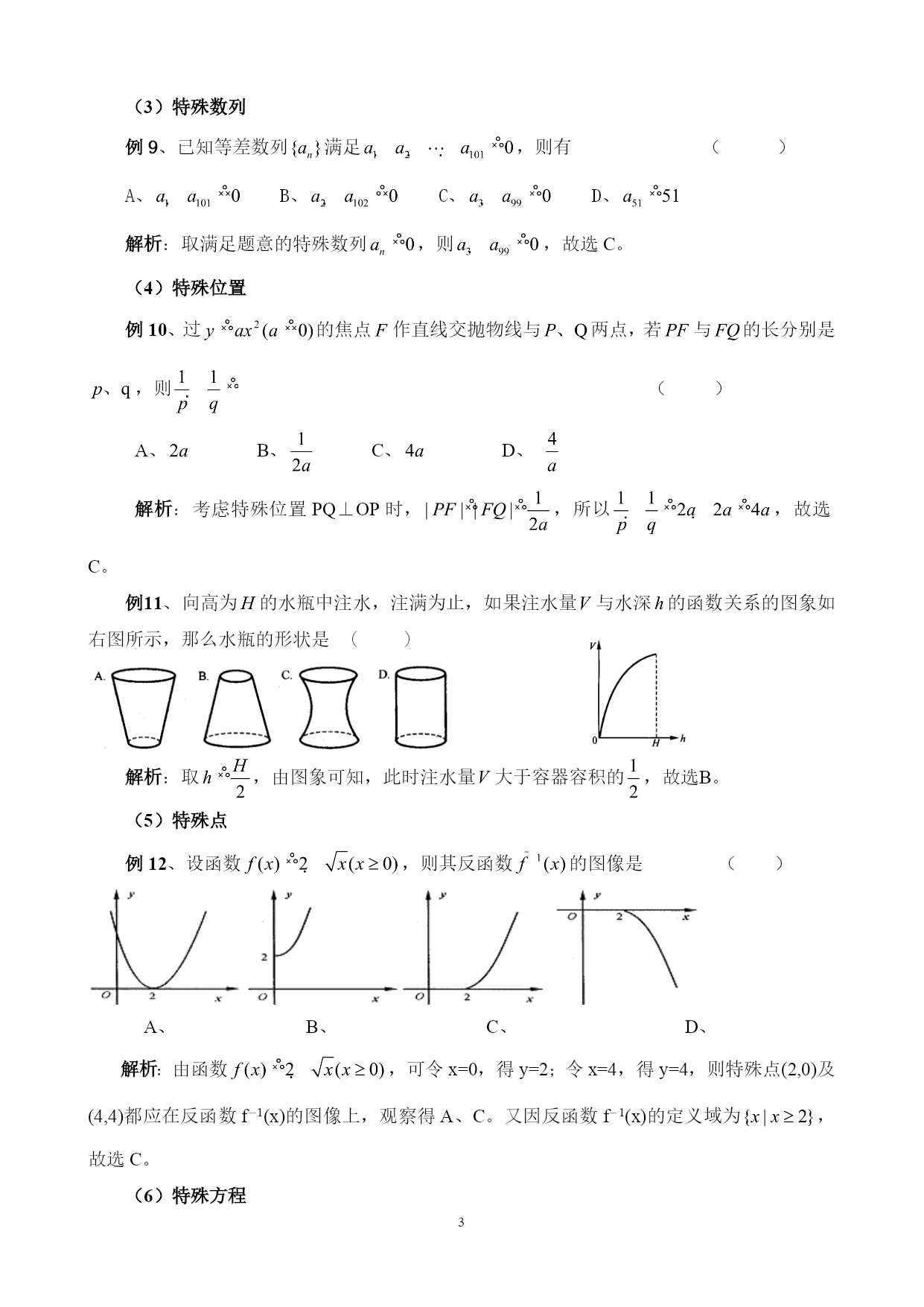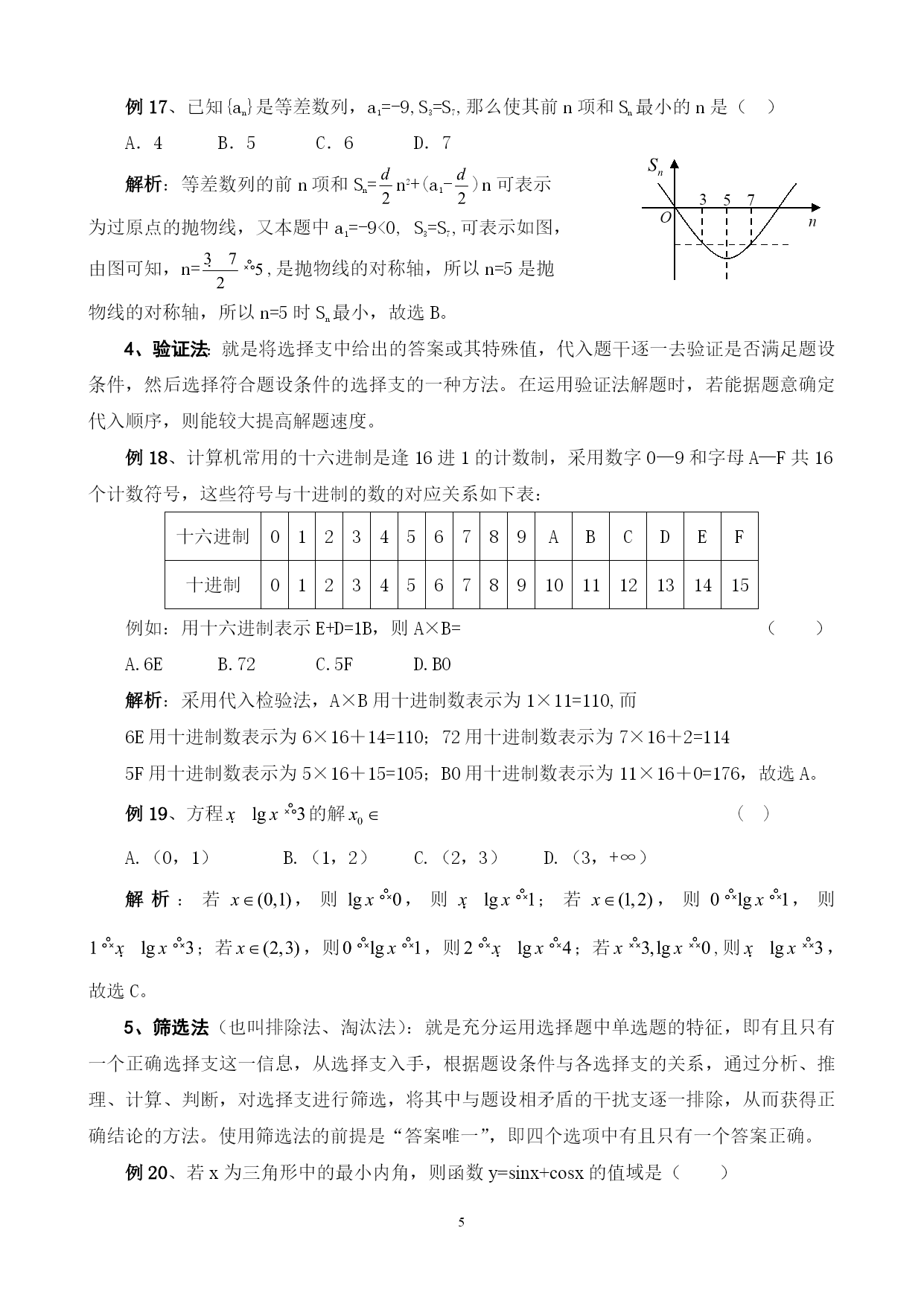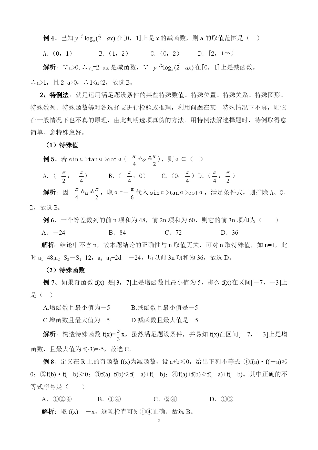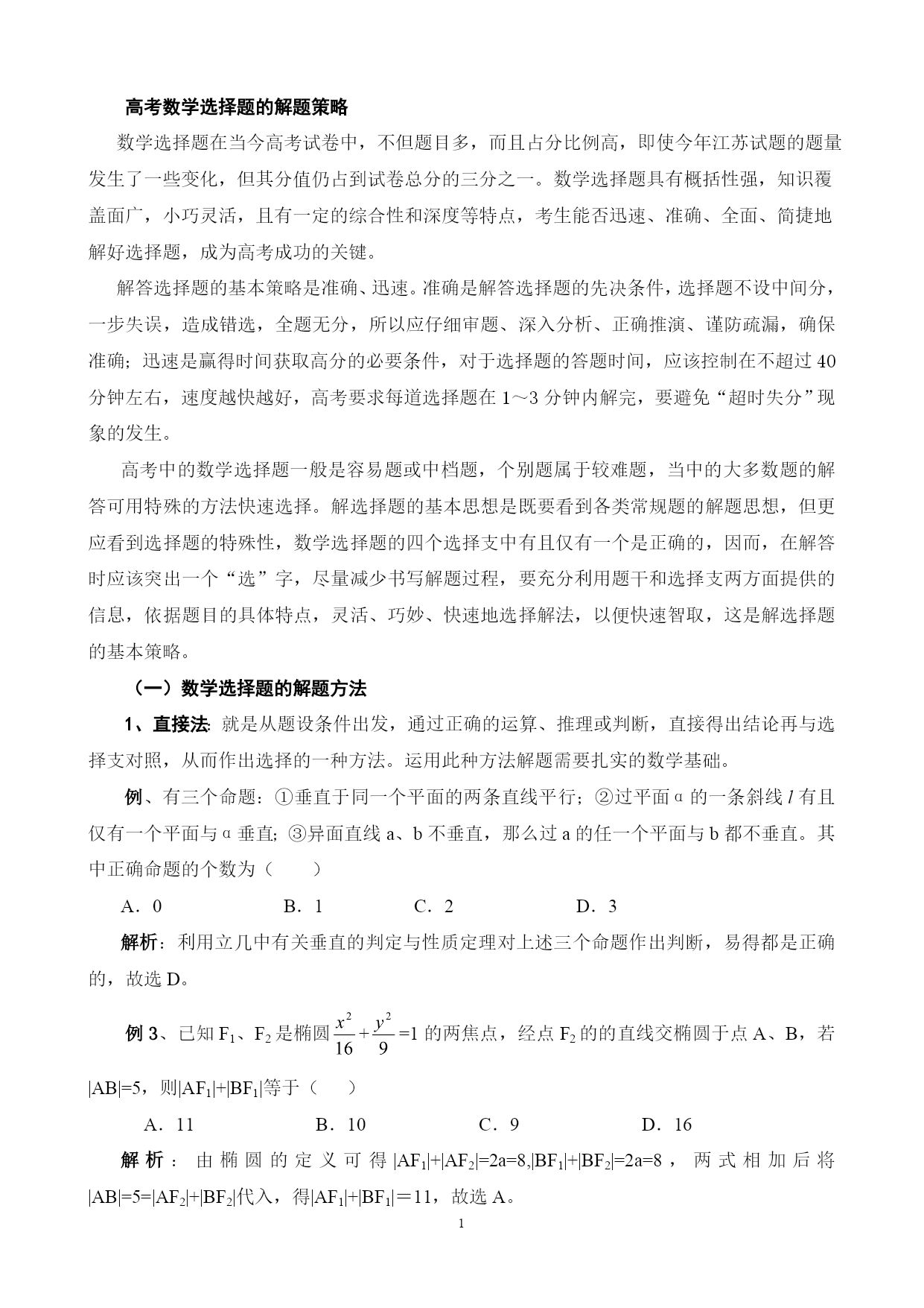 高考数学选择题的解题策略 数学选择题在当今高考试卷中,不但题目多,而且占分比例高,即使今年江苏试题的题量发生了一些变化,但其分值仍占到试卷总分的三分之一。数学选择题具有概括性强,知识覆盖面广,小巧灵活,且有一定的综合性和深度等特点,考生能否迅速、准确、全面、简捷地解好选择题,成为高考成功的关键。 解答选择题的基本策略是准确、迅速。准确是解答选择题的先决条件,选择题不设中间分,一步失误,造成错选,全题无分,所以应仔细审题、深入分析、正确推演、谨防疏漏,确保准确;迅速是赢得时间获取高分的必要条件,对于选择题的答题时间,应该控制在不超过40分钟左右,速度越快越好,高考要求每道选择题在1~3分钟内解完,要避免“超时失分”现象的发生。 高考中的数学选择题一般是容易题或中档题,个别题属于较难题,当中的大多数题的解答可用特殊的方法快速选择。解选择题的基本思想是既要看到各类常规题的解题思想,但更应看到选择题的特殊性,数学选择题的四个选择支中有且仅有一个是正确的,因而,在解答时应该突出一个“选”字,尽量减少书写解题过程,要充分利用题干和选择支两方面提供的信息,依据题目的具体特点,灵活、巧妙、快速地选择解法,以便快速智取,这是解选择题的基本策略。 (一)数学选择题的解题方法 1、直接法:就是从题设条件出发,通过正确的运算、推理或判断,直接得出结论再与选择支对照,从而作出选择的一种方法。运用此种方法解题需要扎实的数学基础。 例、有三个命题:①垂直于同一个平面的两条直线平行;②过平面α的一条斜线l有且仅有一个平面与α垂直;③异面直线a、b不垂直,那么过a的任一个平面与b都不垂直。其中正确命题的个数为() A.0 B.1 C.2 D.3 解析:利用立几中有关垂直的判定与性质定理对上述三个命题作出判断,易得都是正确的,故选D。 例3、已知F1、F2是椭圆+=1的两焦点,经点F2的的直线交椭圆于点A、B,若|AB|=5,则|AF1|+|BF1|等于() A.11 B.10 C.9 D.16 解析:由椭圆的定义可得|AF1|+|AF2|=2a=8,|BF1|+|BF2|=2a=8,两式相加后将|AB|=5=|AF2|+|BF2|代入,得|AF1|+|BF1|=11,故选A。 例4、已知在[0,1]上是的减函数,则a的取值范围是() A.(0,1) B.(1,2)C.(0,2) D.[2,+∞) 解析:∵a>0,∴y1=2-ax是减函数,∵在[0,1]上是减函数。 ∴a>1,且2-a>0,∴1<a<2,故选B。 2、特例法:就是运用满足题设条件的某些特殊数值、特殊位置、特殊关系、特殊图形、特殊数列、特殊函数等对各选择支进行检验或推理,利用问题在某一特殊情况下不真,则它在一般情况下也不真的原理,由此判明选项真伪的方法。用特例法解选择题时,特例取得愈简单、愈特殊愈好。 (1)特殊值 例5、若sinα>tanα>cotα(),则α∈() A.(,) B.(,0)C.(0,) D.(,) 解析:因,取α=-代入sinα>tanα>cotα,满足条件式,则排除A、C、D,故选B。 例6、一个等差数列的前n项和为48,前2n项和为60,则它的前3n项和为() A.-24 B.84 C.72 D.36 解析:结论中不含n,故本题结论的正确性与n取值无关,可对n取特殊值,如n=1,此时a1=48,a2=S2-S1=12,a3=a1+2d=-24,所以前3n项和为36,故选D。 (2)特殊函数 例7、如果奇函数f(x)是[3,7]上是增函数且最小值为5,那么f(x)在区间[-7,-3]上是() A.增函数且最小值为-5 B.减函数且最小值是-5 C.增函数且最大值为-5 D.减函数且最大值是-5 解析:构造特殊函数f(x)=x,虽然满足题设条件,并易知f(x)在区间[-7,-3]上是增函数,且最大值为f(-3)=-5,故选C。 例8、定义在R上的奇函数f(x)为减函数,设a+b≤0,给出下列不等式:①f(a)·f(-a)≤0;②f(b)·f(-b)≥0;③f(a)+f(b)≤f(-a)+f(-b);④f(a)+f(b)≥f(-a)+f(-b)。其中正确的不等式序号是() A.①②④ B.①④ C.②④ D.①③ 解析:取f(x)=-x,逐项检查可知①④正确。故选B。 (3)特殊数列 例9、已知等差数列满足,则有() A、B、C、D、 解析:取满足题意的特殊数列,则,故选C。 (4)特殊位置 例10、过的焦点作直线交抛物线与两点,若与的长分别是,则() A、B、C、D、 解析:考虑特殊位置PQ⊥OP时,,所以,故选C。 例11、向高为的水瓶中注水,注满为止,如果注水量与水深的函数关系的图象如右图所示,