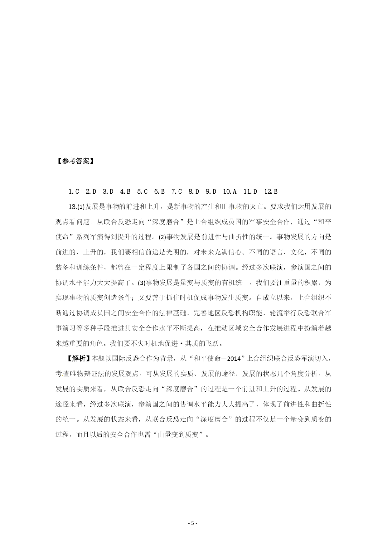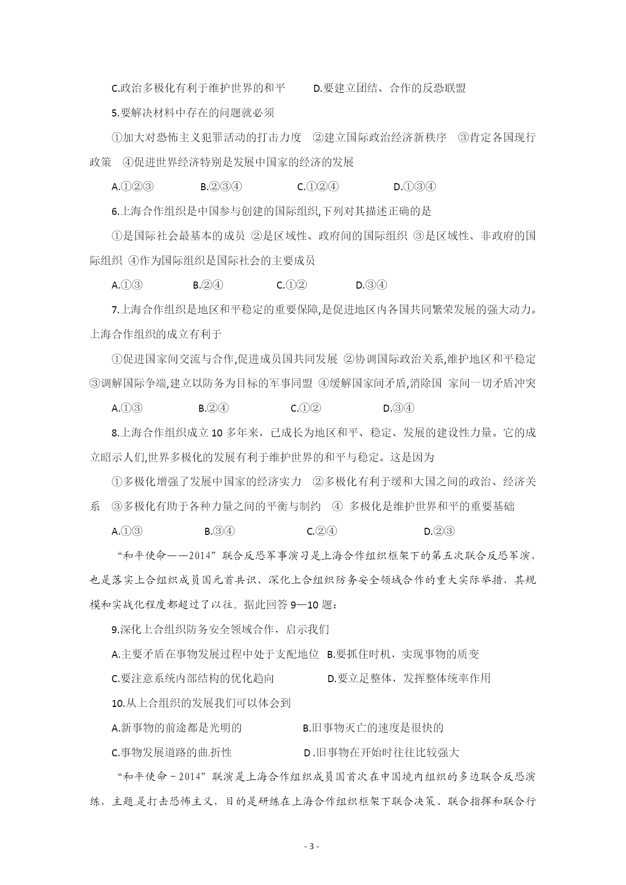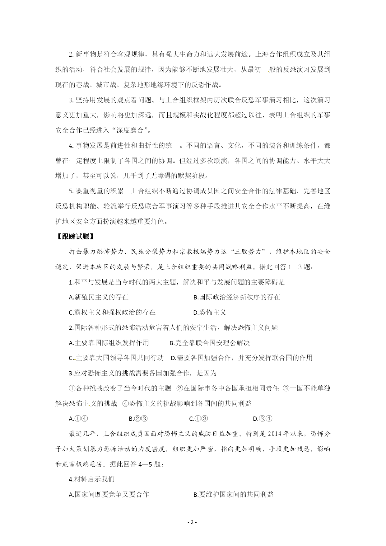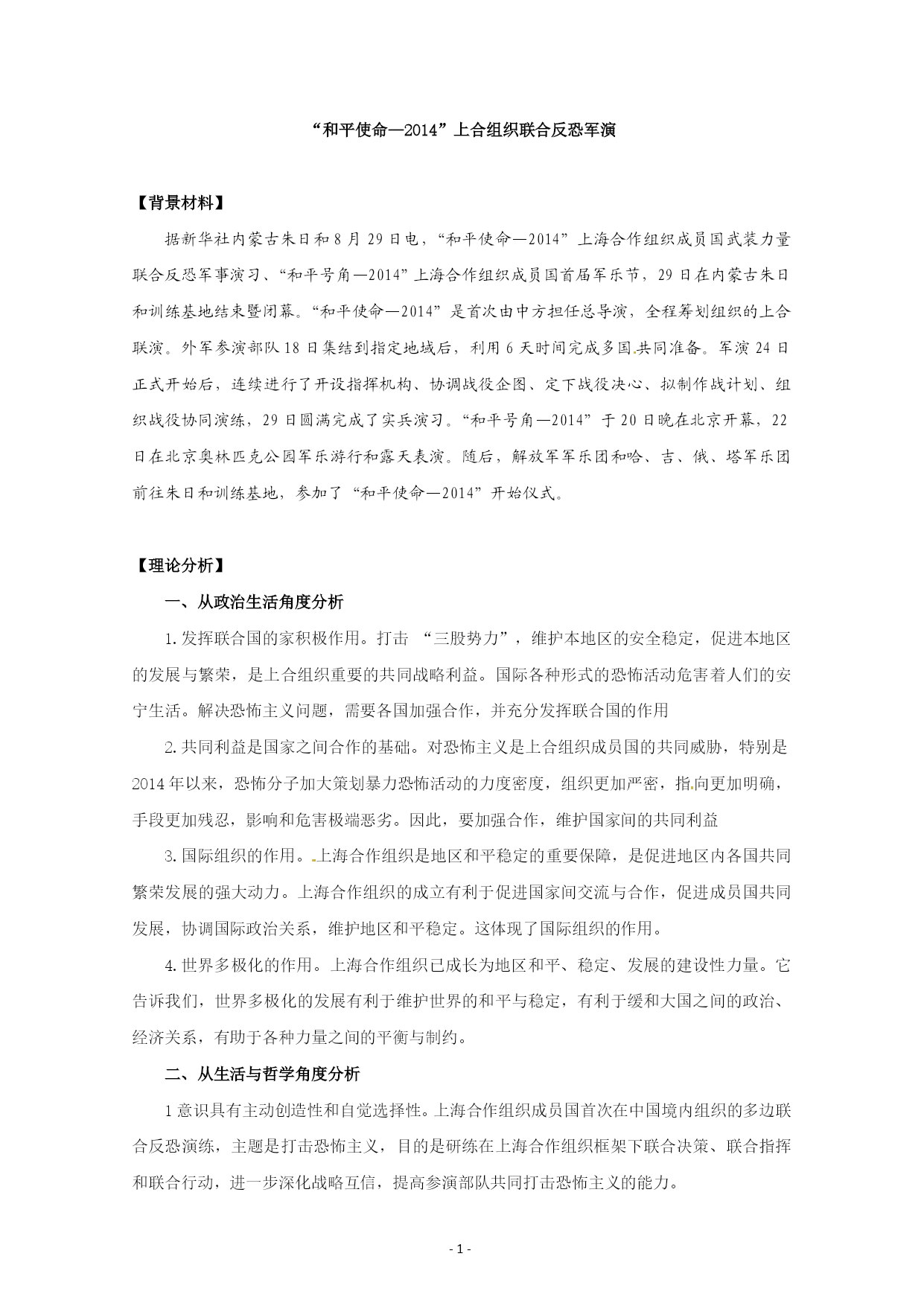PAGE-5- “和平使命—2014”上合组织联合反恐军演 【背景材料】 据新华社内蒙古朱日和8月29日电,“和平使命—2014”上海合作组织成员国武装力量联合反恐军事演习、“和平号角—2014”上海合作组织成员国首届军乐节,29日在内蒙古朱日和训练基地结束暨闭幕。“和平使命—2014”是首次由中方担任总导演,全程筹划组织的上合联演。外军参演部队18日集结到指定地域后,利用6天时间完成多国共同准备。军演24日正式开始后,连续进行了开设指挥机构、协调战役企图、定下战役决心、拟制作战计划、组织战役协同演练,29日圆满完成了实兵演习。“和平号角—2014”于20日晚在北京开幕,22日在北京奥林匹克公园军乐游行和露天表演。随后,解放军军乐团和哈、吉、俄、塔军乐团前往朱日和训练基地,参加了“和平使命—2014”开始仪式。 【理论分析】 一、从政治生活角度分析 1.发挥联合国的家积极作用。打击“三股势力”,维护本地区的安全稳定,促进本地区的发展与繁荣,是上合组织重要的共同战略利益。国际各种形式的恐怖活动危害着人们的安宁生活。解决恐怖主义问题,需要各国加强合作,并充分发挥联合国的作用 2.共同利益是国家之间合作的基础。对恐怖主义是上合组织成员国的共同威胁,特别是2014年以来,恐怖分子加大策划暴力恐怖活动的力度密度,组织更加严密,指向更加明确,手段更加残忍,影响和危害极端恶劣。因此,要加强合作,维护国家间的共同利益 3.国际组织的作用。上海合作组织是地区和平稳定的重要保障,是促进地区内各国共同繁荣发展的强大动力。上海合作组织的成立有利于促进国家间交流与合作,促进成员国共同发展,协调国际政治关系,维护地区和平稳定。这体现了国际组织的作用。 4.世界多极化的作用。上海合作组织已成长为地区和平、稳定、发展的建设性力量。它告诉我们,世界多极化的发展有利于维护世界的和平与稳定,有利于缓和大国之间的政治、经济关系,有助于各种力量之间的平衡与制约。 二、从生活与哲学角度分析 1意识具有主动创造性和自觉选择性。上海合作组织成员国首次在中国境内组织的多边联合反恐演练,主题是打击恐怖主义,目的是研练在上海合作组织框架下联合决策、联合指挥和联合行动,进一步深化战略互信,提高参演部队共同打击恐怖主义的能力。 2.新事物是符合客观规律,具有强大生命力和远大发展前途。上海合作组织成立及其组织的活动,符合社会发展的规律,因为能够不断地发展壮大,从最初一般的反恐演习发展到现在的巷战、城市战、复杂地形地缘环境下的反恐作战。 3.坚持用发展的观点看问题。与上合组织框架内历次联合反恐军事演习相比,这次演习意义更加重大,影响将更加深远,而且规模和实战化程度都超过以往,表明上合组织的军事安全合作已经进入“深度磨合”。 4.事物发展是前进性和曲折性的统一。不同的语言、文化,不同的装备和训练条件,都曾在一定程度上限制了各国之间的协调。但经过多次联演,各国之间的协调能力、水平大大增加了,甚至可以说,几乎到了无障碍的默契阶段。 5.要重视量的积累。上合组织不断通过协调成员国之间安全合作的法律基础、完善地区反恐机构职能、轮流举行反恐联合军事演习等多种手段推进其安全合作水平不断提高,在维护地区安全方面扮演越来越重要角色。 【跟踪试题】 打击暴力恐怖势力、民族分裂势力和宗教极端势力这“三股势力”,维护本地区的安全稳定,促进本地区的发展与繁荣,是上合组织重要的共同战略利益。据此回答1—3题: 1.和平与发展是当今时代的两大主题,解决和平与发展问题的主要障碍是 A.新殖民主义的存在B.国际政治经济新秩序的存在 C.霸权主义和强权政治的存在D.恐怖主义 2.国际各种形式的恐怖活动危害着人们的安宁生活。解决恐怖主义问题 A.主要靠国际组织发挥作用B.完全靠联合国安理会解决 C.主要靠大国领导各国共同行动D.需要各国加强合作,并充分发挥联合国的作用 3.应对恐怖主义的挑战需要各国加强合作,是因为 ①各种挑战改变了当今时代的主题②在国际事务中各国承担相同责任③一国不能单独解决恐怖主义的挑战④恐怖主义的挑战影响到各国间的共同利益 A.①④B.②③C.①③D.③④ 最近几年,上合组织成员国面对恐怖主义的威胁日益加重。特别是2014年以来,恐怖分子加大策划暴力恐怖活动的力度密度,组织更加严密,指向更加明确,手段更加残忍,影响和危害极端恶劣。据此回答4—5题: 4.材料启示我们 A.国家间既要竞争又要合作B.要维护国家间的共同利益 C.政治多极化有利于维护世界的和平D.要建立团结、合作的反恐联盟 5.要解决材料中存在的问题就必须 ①加大对恐怖主义犯罪活动的打击力度②建立国际政治经济新秩序③肯定各国现行政策④促进世界经济特别是发展中国家的经济的发展 A.①②③B.②③④C.①②④D.①③④ 6.
