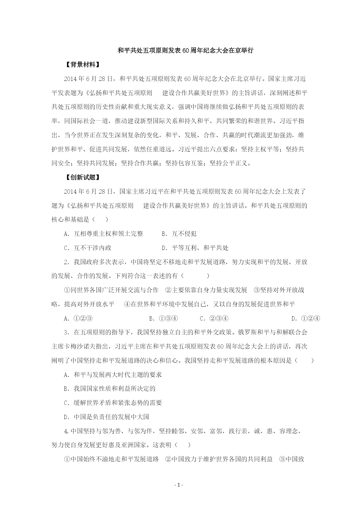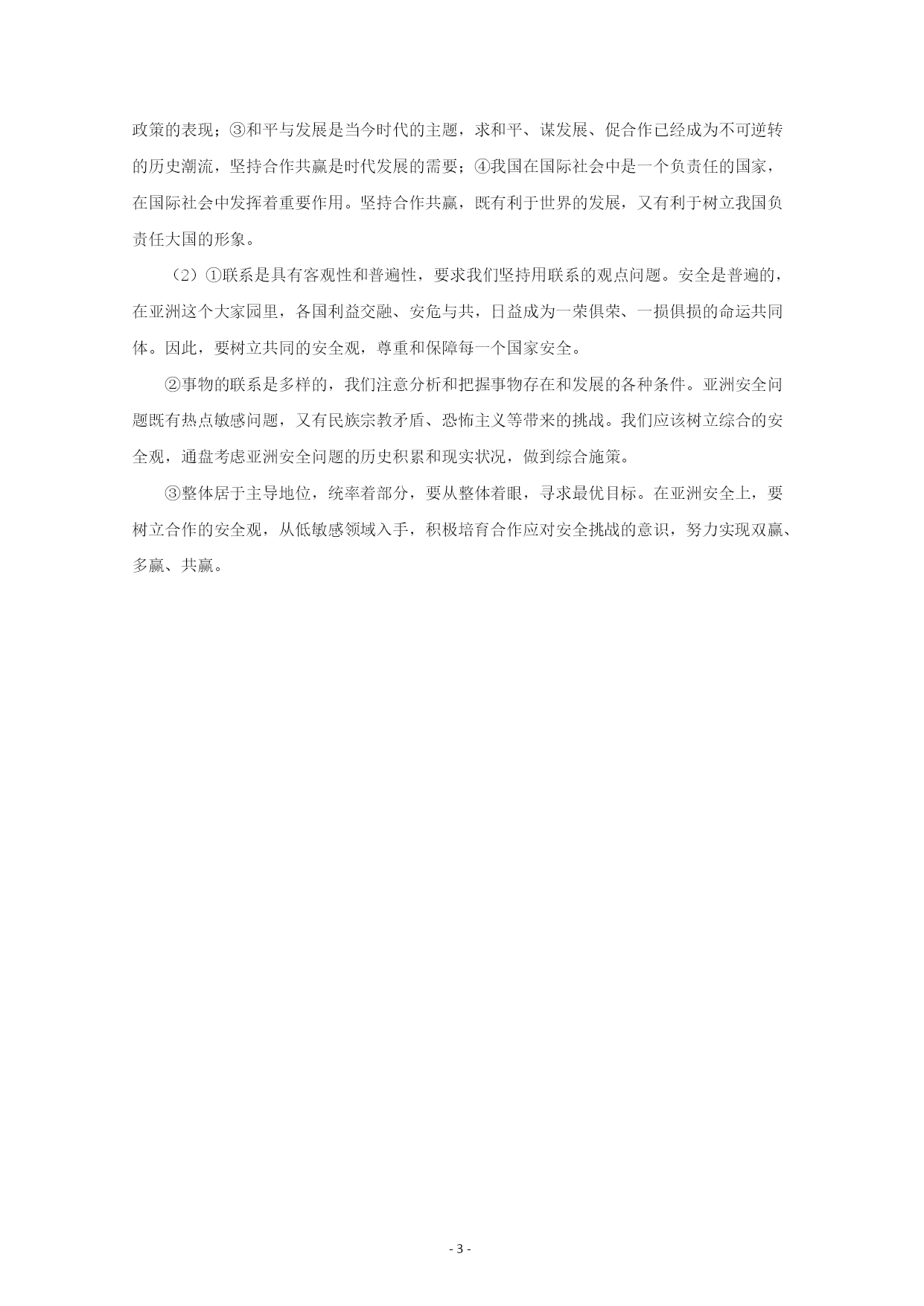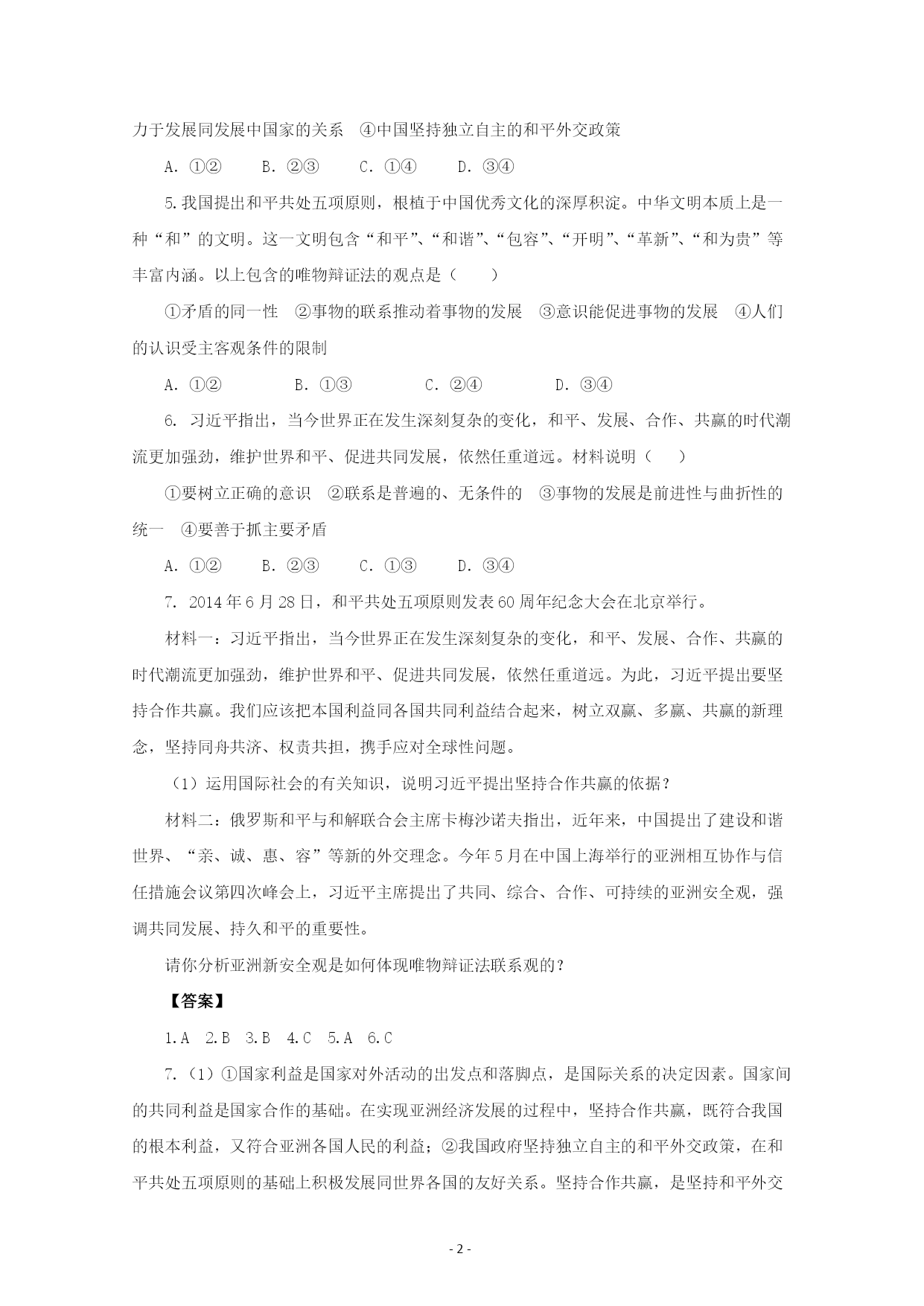 PAGE-3- 和平共处五项原则发表60周年纪念大会在京举行 【背景材料】 2014年6月28日,和平共处五项原则发表60周年纪念大会在北京举行。国家主席习近平发表题为《弘扬和平共处五项原则建设合作共赢美好世界》的主旨讲话,深刻阐述和平共处五项原则的历史性贡献和重大现实意义,强调中国将继续做弘扬和平共处五项原则的表率,同国际社会一道,推动建设新型国际关系和持久和平、共同繁荣的和谐世界。习近平指出,当今世界正在发生深刻复杂的变化,和平、发展、合作、共赢的时代潮流更加强劲,维护世界和平、促进共同发展,依然任重道远。习近平提出六点要求:坚持主权平等;坚持共同安全;坚持共同发展;坚持合作共赢;坚持包容互鉴;坚持公平正义。 【创新试题】 2014年6月28日,国家主席习近平在和平共处五项原则发表60周年纪念大会上发表了题为《弘扬和平共处五项原则建设合作共赢美好世界》的主旨讲话。和平共处五项原则的核心和基础是() A.互相尊重主权和领土完整B.互不侵犯 C.互不干涉内政D.平等互利、和平共处 2.我国政府多次表示,中国将坚定不移地走和平发展道路,努力实现和平的发展、开放的发展、合作的发展。下列符合这一表述的有() ①同世界各国广泛开展交流与合作②主要依靠自身力量实现发展③坚持对外开放战略,提高对外开放水平④在世界和平环境中发展自己,又以自身的发展促进世界和平 A.①②③B.①③④C.②③④D.①②④ 3.在五项原则的指导下,我国坚持独立自主的和平外交政策。俄罗斯和平与和解联合会主席卡梅沙诺夫指出,习近平主席在和平共处五项原则发表60周年纪念大会上的讲话,再次阐明了中国坚持走和平发展道路的决心和信心。我国坚持走和平发展道路的根本原因是() A.和平与发展两大时代主题的要求 B.我国国家性质和利益所决定的 C.缓解世界矛盾和紧张态势的需要 D.中国是负责任的发展中大国 4.中国坚持与邻为善、与邻为伴,坚持睦邻、安邻、富邻,践行亲、诚、惠、容理念,努力使自身发展更好惠及亚洲国家。这表明() ①中国始终不渝地走和平发展道路②中国致力于维护世界各国的共同利益 ③中国致力于发展同发展中国家的关系④中国坚持独立自主的和平外交政策 A.①② B.②③ C.①④ D.③④ 5.我国提出和平共处五项原则,根植于中国优秀文化的深厚积淀。中华文明本质上是一种“和”的文明。这一文明包含“和平”、“和谐”、“包容”、“开明”、“革新”、“和为贵”等丰富内涵。以上包含的唯物辩证法的观点是() ①矛盾的同一性②事物的联系推动着事物的发展③意识能促进事物的发展④人们的认识受主客观条件的限制 A.①②B.①③C.②④D.③④ 6.习近平指出,当今世界正在发生深刻复杂的变化,和平、发展、合作、共赢的时代潮流更加强劲,维护世界和平、促进共同发展,依然任重道远。材料说明() ①要树立正确的意识②联系是普遍的、无条件的③事物的发展是前进性与曲折性的统一④要善于抓主要矛盾 A.①② B.②③ C.①③ D.③④ 7.2014年6月28日,和平共处五项原则发表60周年纪念大会在北京举行。 材料一:习近平指出,当今世界正在发生深刻复杂的变化,和平、发展、合作、共赢的时代潮流更加强劲,维护世界和平、促进共同发展,依然任重道远。为此,习近平提出要坚持合作共赢。我们应该把本国利益同各国共同利益结合起来,树立双赢、多赢、共赢的新理念,坚持同舟共济、权责共担,携手应对全球性问题。 (1)运用国际社会的有关知识,说明习近平提出坚持合作共赢的依据? 材料二:俄罗斯和平与和解联合会主席卡梅沙诺夫指出,近年来,中国提出了建设和谐世界、“亲、诚、惠、容”等新的外交理念。今年5月在中国上海举行的亚洲相互协作与信任措施会议第四次峰会上,习近平主席提出了共同、综合、合作、可持续的亚洲安全观,强调共同发展、持久和平的重要性。 请你分析亚洲新安全观是如何体现唯物辩证法联系观的? 【答案】 1.A2.B3.B4.C5.A6.C 7.(1)①国家利益是国家对外活动的出发点和落脚点,是国际关系的决定因素。国家间的共同利益是国家合作的基础。在实现亚洲经济发展的过程中,坚持合作共赢,既符合我国的根本利益,又符合亚洲各国人民的利益;②我国政府坚持独立自主的和平外交政策,在和平共处五项原则的基础上积极发展同世界各国的友好关系。坚持合作共赢,是坚持和平外交政策的表现;③和平与发展是当今时代的主题,求和平、谋发展、促合作已经成为不可逆转的历史潮流,坚持合作共赢是时代发展的需要;④我国在国际社会中是一个负责任的国家,在国际社会中发挥着重要作用。坚持合作共赢,既有利于世界的发展,又有利于树立我国负责任大国的形象。 (2)①联系是具有客观性和普遍性,要求我们坚持用联系的观点问题。安全是普遍的,在亚洲这个大家园里,各国利益交