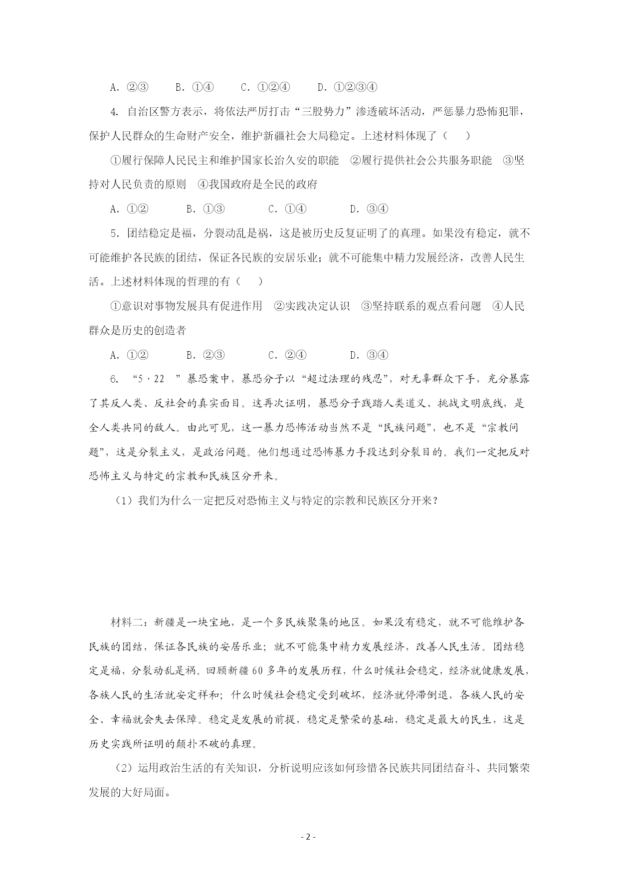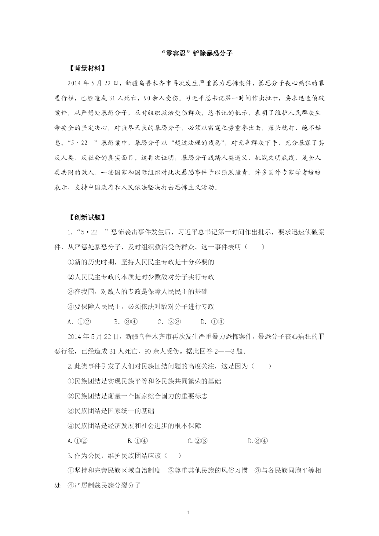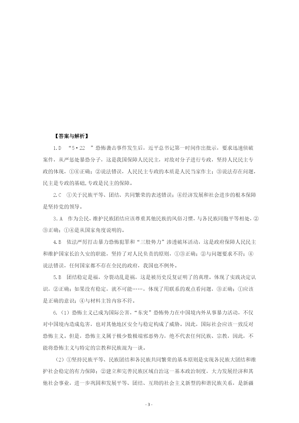 PAGE-4- “零容忍”铲除暴恐分子 【背景材料】 2014年5月22日,新疆乌鲁木齐市再次发生严重暴力恐怖案件,暴恐分子丧心病狂的罪恶行径,已经造成31人死亡,90余人受伤。习近平总书记第一时间作出批示,要求迅速侦破案件,从严惩处暴恐分子,及时组织救治受伤群众。总书记的批示,表明了维护人民群众生命安全的坚定决心,对丧尽天良的暴恐分子,必须以雷霆之势重拳出击,露头就打、绝不姑息。“5·22”暴恐案中,暴恐分子以“超过法理的残忍”,对无辜群众下手,充分暴露了其反人类、反社会的真实面目。这再次证明,暴恐分子践踏人类道义、挑战文明底线,是全人类共同的敌人。一些国家和国际组织对此次暴恐事件予以强烈谴责。许多国外专家学者纷纷表示,支持中国政府和人民依法坚决打击恐怖主义活动。 【创新试题】 1.“5·22”恐怖袭击事件发生后,习近平总书记第一时间作出批示,要求迅速侦破案件,从严惩处暴恐分子,及时组织救治受伤群众。这一事件表明() ①新的历史时期,坚持人民民主专政是十分必要的 ②人民民主专政的本质是对少数敌对分子实行专政 ③在我国,对敌人的专政是保障人民民主的基础 ④要保障人民民主,必须依法对敌对分子进行专政 A.①②B.③④C.②③D.①④ 2014年5月22日,新疆乌鲁木齐市再次发生严重暴力恐怖案件,暴恐分子丧心病狂的罪恶行径,已经造成31人死亡,90余人受伤。据此回答2——3题。 2.此类事件引发了人们对民族团结问题的高度关注,这是因为() ①民族团结是实现民族平等和各民族共同繁荣的基础 ②民族团结是衡量一个国家综合国力的重要标志 ③民族团结是国家统一的基础 ④民族团结是经济发展和社会进步的根本保障 A.①②B.①④C.②③D.③④ 3.作为公民,维护民族团结应该() ①坚持和完善民族区域自治制度②尊重其他民族的风俗习惯③与各民族同胞平等相处④严厉制裁民族分裂分子 A.②③B.①④C.①②④D.①②③④ 4.自治区警方表示,将依法严厉打击“三股势力”渗透破坏活动,严惩暴力恐怖犯罪,保护人民群众的生命财产安全,维护新疆社会大局稳定。上述材料体现了() ①履行保障人民民主和维护国家长治久安的职能②履行提供社会公共服务职能③坚持对人民负责的原则④我国政府是全民的政府 A.①②B.①③C.①④D.③④ 5.团结稳定是福,分裂动乱是祸,这是被历史反复证明了的真理。如果没有稳定,就不可能维护各民族的团结,保证各民族的安居乐业;就不可能集中精力发展经济,改善人民生活。上述材料体现的哲理的有() ①意识对事物发展具有促进作用②实践决定认识③坚持联系的观点看问题④人民群众是历史的创造者 A.①②B.②③C.②④D.③④ 6.“5·22”暴恐案中,暴恐分子以“超过法理的残忍”,对无辜群众下手,充分暴露了其反人类、反社会的真实面目。这再次证明,暴恐分子践踏人类道义、挑战文明底线,是全人类共同的敌人。由此可见,这一暴力恐怖活动当然不是“民族问题”,也不是“宗教问题”,这是分裂主义,是政治问题。他们想通过恐怖暴力手段达到分裂目的。我们一定把反对恐怖主义与特定的宗教和民族区分开来。 (1)我们为什么一定把反对恐怖主义与特定的宗教和民族区分开来? 材料二:新疆是一块宝地,是一个多民族聚集的地区。如果没有稳定,就不可能维护各民族的团结,保证各民族的安居乐业;就不可能集中精力发展经济,改善人民生活。团结稳定是福,分裂动乱是祸。回顾新疆60多年的发展历程,什么时候社会稳定,经济就健康发展,各族人民的生活就安定祥和;什么时候社会稳定受到破坏,经济就停滞倒退,各族人民的安全、幸福就会失去保障。稳定是发展的前提,稳定是繁荣的基础,稳定是最大的民生,这是历史实践所证明的颠扑不破的真理。 (2)运用政治生活的有关知识,分析说明应该如何珍惜各民族共同团结奋斗、共同繁荣发展的大好局面。 【答案与解析】 1.D“5·22”恐怖袭击事件发生后,近平总书记第一时间作出批示,要求迅速侦破案件,从严惩处暴恐分子,这是我国保障人民民主,对敌对分子进行专政,坚持人民民主专政的体现,①④正确;②说法错误,人民民主专政的本质是人民当家作主;③说法存在问题,民主是专政的基础,专政是民主的保障。 2.C①关于民族平等、团结、共同繁荣的表述错误;④经济发展和社会进步的根本保障是坚持党的领导。 3.A作为公民,维护民族团结应该尊重其他民族的风俗习惯,与各民族同胞平等相处,②③正确;①④是从国家角度说明的。 4.B依法严厉打击暴力恐怖犯罪和“三股势力”渗透破坏活动,这是政府保障人民民主和维护国家长治久安的职能,坚持了对人民负责的原则,①③正确;②与问题要求不符;④说法错误,任何国家都不存在全民的政府,我国也不例外。 5.B团结稳定是福,分裂动乱是祸,这是被历史反复证