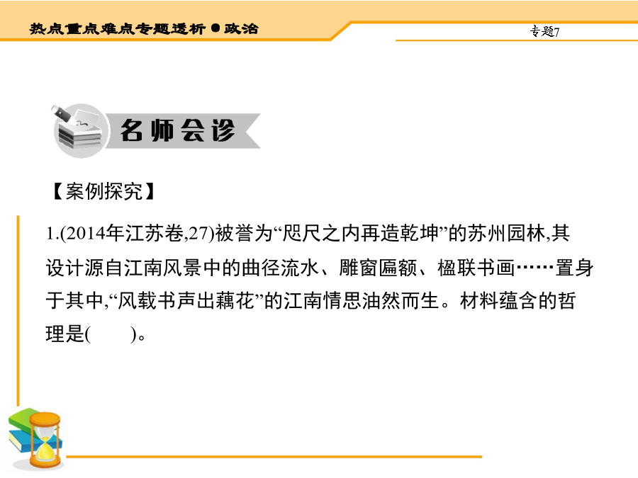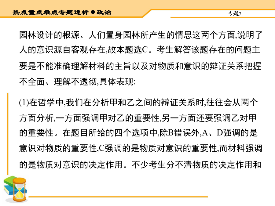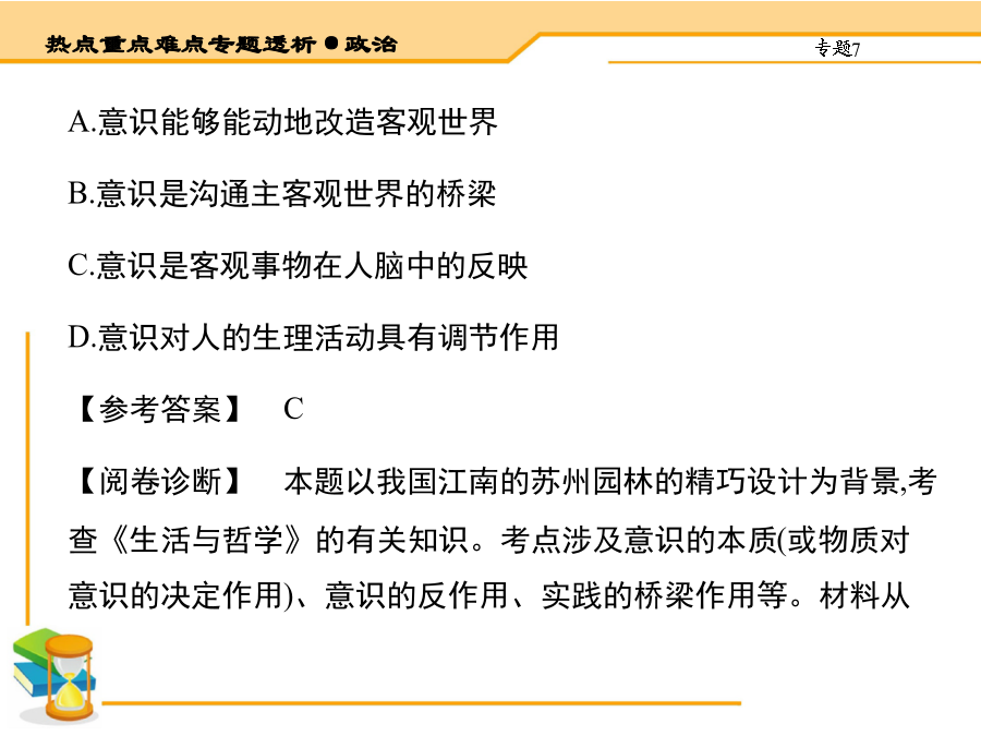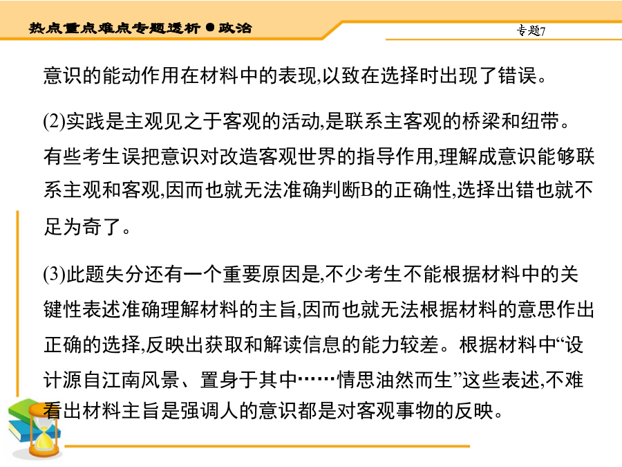 A.意识能够能动地改造客观世界园林设计的根源、人们置身园林所产生的情思这两个方面,说明了人的意识源自客观存在,故本题选C。考生解答该题存在的问题主要是不能准确理解材料的主旨以及对物质和意识的辩证关系把握不全面、理解不透彻,具体表现:意识的能动作用在材料中的表现,以致在选择时出现了错误。2.(2014年大纲卷,30)农谚说:“蚯蚓叫,大雨到。”一位农民气象员对此感到怀疑。经过反复观察和实验,他发现下雨前鸣叫的是蝼蛄而不是蚯蚓,于是把这条农谚改成“蝼蛄叫,大雨到”。经过进一步观察和研究,他又发现“春秋蝼蛄叫,大雨定会到”,但“盛夏蝼蛄叫,大雨不会到”。这表明()。【阅卷诊断】本题以一句农谚的不断演进为背景,考查辩证唯物主义认识论的有关知识。考点涉及实践决定认识的四个表现。材料以“质疑——实验证明——再研究——得出正确结论”这条主线,说明实践是认识的来源和发展动力,是检验认识真理性的唯一标准,②④正确。考生解答该题存在的问题主要是不能依据材料调用知识作出正确判断,以及缺乏辩证思维能力,具体表现在:的,但我们不能由此得出“亲身的实践经验比他人的实践经验更可靠”的结论。这一方面是不理解人们获取知识的途径有两个,一个是获取直接经验,即自己亲自实践所得;一个是获取间接经验,即向他人学,向前人学,向书本学。另一方面,也说明缺少辩证思维,获取知识的两个途径各有各的优势,不能笼统地说哪个更可靠,更优 越。一标准,而不能说明实践是认识的最终目的和归宿。3.(2014年四川卷,14)让人民享有健康丰富的精神文化生活,是全面建成小康社会的重要内容。阅读材料,回答问题。色文化产业,文化产业连续多年保持28%以上的增速;搭建社区文化中心、农村文化中心等文化舞台,让老百姓自我参与、自我展示、自我教育。外经验,立足四川实际,发展特色文化,建设文化强省。遗漏。心、主旋律”联想到主次矛盾和矛盾主次方面,进而联想到坚持两点论和重点论的统一;不能从“特色”联想到矛盾特殊性。点:①全面准确掌握基础知识,不留记忆死角,更不能留有理解死角。②要能够依据教材知识的分析角度和分析层次,归纳记忆和理解知识、分析和解答问题的角度,提高思维的严密性和答题的准确率。③要学会通过总结归纳,提高获取和解读信息、调动和运用知识的能力。要总结归纳分析材料层次和主旨的方法,要总结归纳根据关键词和关键表述等提取相应哲学道理的方法,等等。④要提高分析和阐述事物的能力。既能找准所用知识,又能对材料进行准确的分析和阐述,切忌照搬教材知识,或照抄材料表述。⑤要能够准确掌握和灵活运用基本的答题方法。如,要运用“立正法”解答组合式选择题;要运用“原理或方法论+材料分析”的格式作答哲学问题等等。以上这些,归根到底要在训练中才能达成。 实践是认识的来源,真理是客观的、具体的、有条件的,认识具有反复性、无限性和上升性等问题。年高考将更多地从世界观、方法论角度考查唯物论、辩证法和认识论相关知识。考生在复习时,一定要注意辩证唯物主义三大组成部分的区别,构建各板块的知识网络,做到有的放矢。 2.理解四对关系(续表)3.把握一个方法论:一切从实际出发,实事求是(如何做到) 3.意识能够促进客观事物的发展。发现,特别适用于解释一些疾病发生的原理,并研发药物以用于治疗。这说明()。【解析】材料主要说明,正是由于发现了细胞内囊泡运输调控机制这一客观规律,人们才研发出治疗相关疾病的药物。发现了细胞内囊泡运输调控机制,这是人们认识规律的表现,借此研发出治疗相关疾病的药物,这是利用规律的表现,故本题选A;自然界有其自身的运动变化规律,故B说法是错误的;C、D表述均是正确的,但与题意不符。2.现实世界空间是三维的,绘画作为平面艺术是二维的。画家在二维平面所画的,只能是三维现实空间中实际物体的一部分,而人脑则通过这个部分将其想象成完整情形。这种现象表明,意识是 ()。【解析】材料说明,人脑能将绘画中二维平面所画的部分物体,想象成三维现实空间中完整的实际物体,可见意识对客观事物的反映不是被动机械的,而是主动积极的,是加工改造的结果,故本题选B;意识既有对事物本质的反映,也有对事物现象的反映,故A说法有误;意识对客观事物的反映,既有正确的,也有错误的,故C错误;意识对客观对象的反映不是直观的,而是抽象的,它不同于照相和复制,故D错误。3.近年来,食品安全一直是我国着力强抓的一项,但尽管如此隐患仍然接连发生,从染色馒头、牛肉膏、瘦肉精、毒血旺、绝育黄瓜等到品牌型的全聚德、双汇、亿客隆等等,这些曾经都是贴近老百姓生活饮食之本的食物,却接连发生惊人黑幕,让人胆战心惊,部分知名企业面临着信任危机。为应对危机,有人认为相关企业应针对这一事实采取相应措施,如召回问题产品,对受害人作出相应赔偿等;相关企业应树立产品质量意识、安全意识,严把产品质量关,保