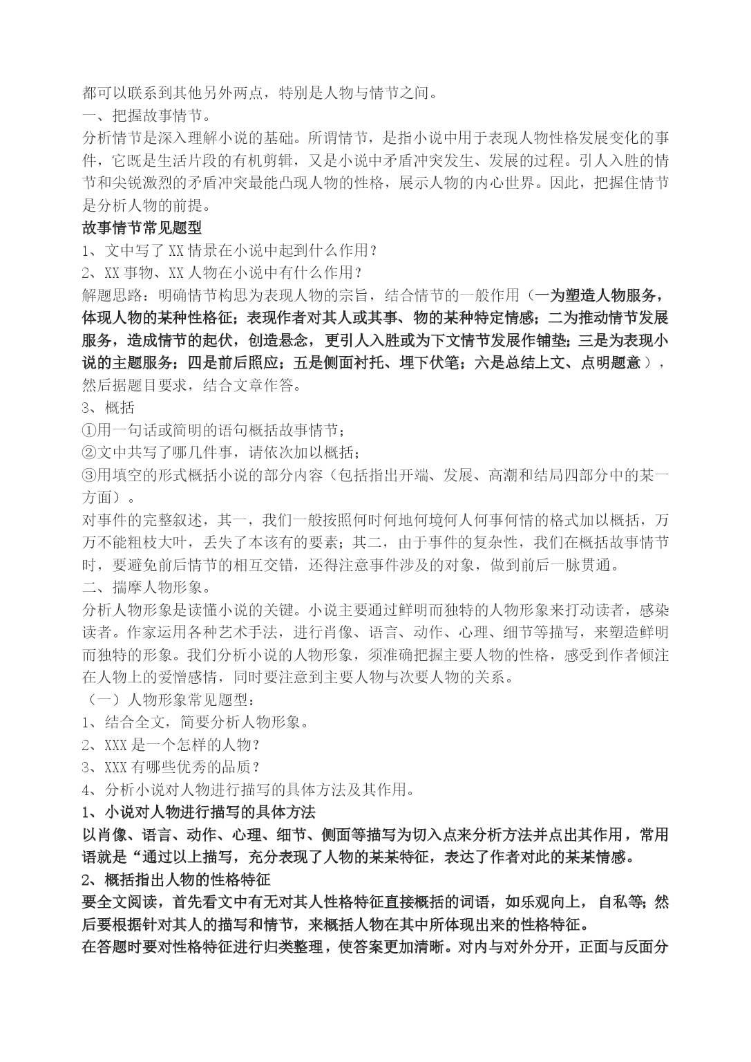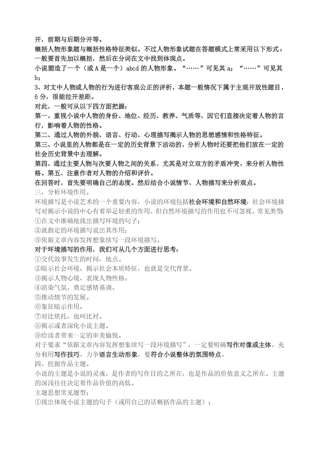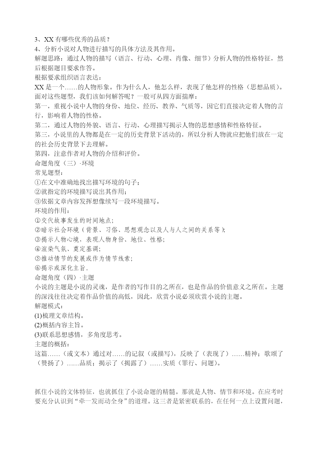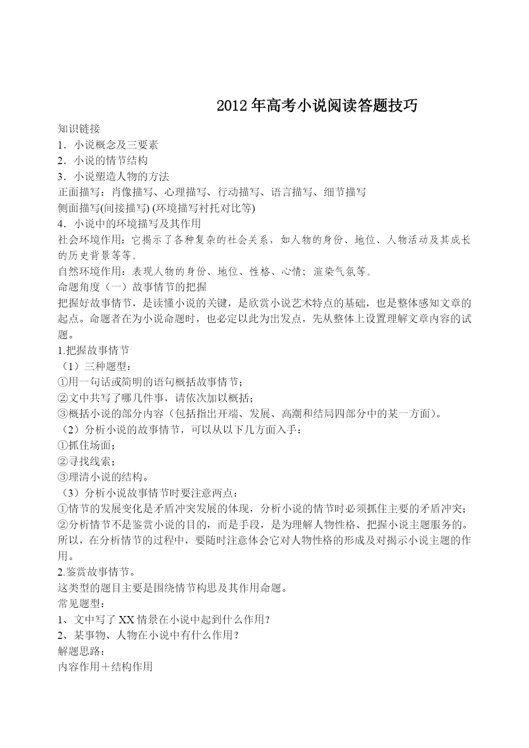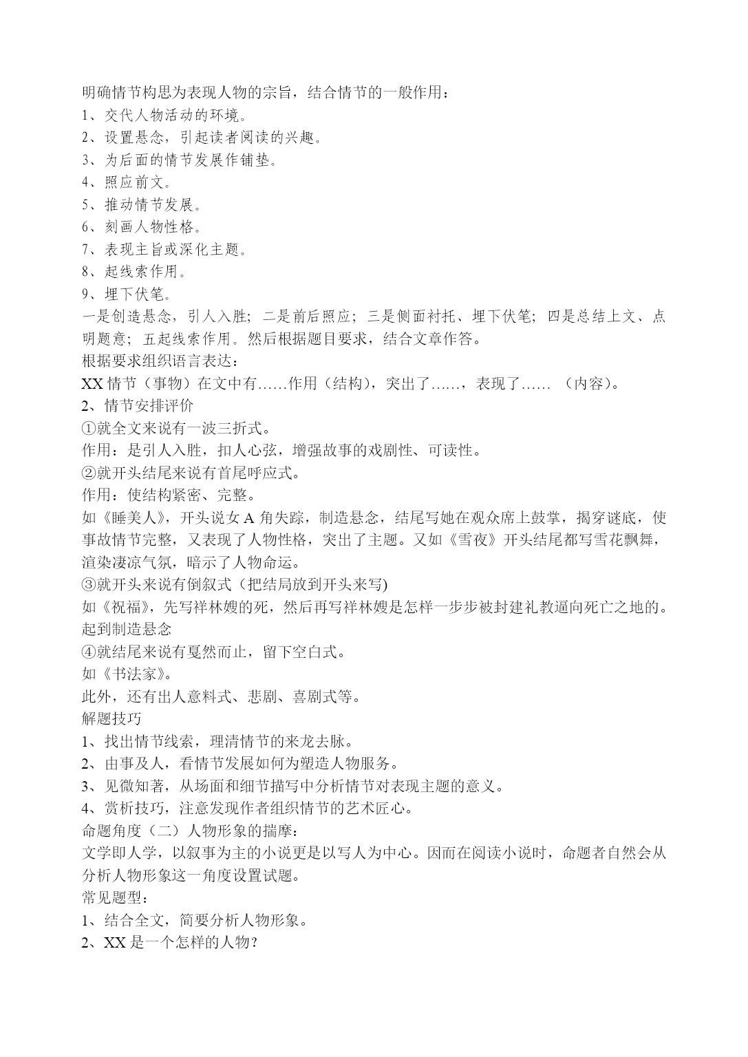 2012年高考小说阅读答题技巧知识链接1.小说概念及三要素2.小说的情节结构3.小说塑造人物的方法正面描写:肖像描写、心理描写、行动描写、语言描写、细节描写侧面描写(间接描写)(环境描写衬托对比等)4.小说中的环境描写及其作用社会环境作用:它揭示了各种复杂的社会关系,如人物的身份、地位、人物活动及其成长的历史背景等等。自然环境作用:表现人物的身份、地位、性格、心情;渲染气氛等。命题角度(一)故事情节的把握把握好故事情节,是读懂小说的关键,是欣赏小说艺术特点的基础,也是整体感知文章的起点。命题者在为小说命题时,也必定以此为出发点,先从整体上设置理解文章内容的试题。1.把握故事情节(1)三种题型:①用一句话或简明的语句概括故事情节;②文中共写了哪几件事,请依次加以概括;③概括小说的部分内容(包括指出开端、发展、高潮和结局四部分中的某一方面)。(2)分析小说的故事情节,可以从以下几方面入手:①抓住场面;②寻找线索;③理清小说的结构。(3)分析小说故事情节时要注意两点:①情节的发展变化是矛盾冲突发展的体现,分析小说的情节时必须抓住主要的矛盾冲突;②分析情节不是鉴赏小说的目的,而是手段,是为理解人物性格、把握小说主题服务的。所以,在分析情节的过程中,要随时注意体会它对人物性格的形成及对揭示小说主题的作用。2.鉴赏故事情节。这类型的题目主要是围绕情节构思及其作用命题。常见题型:1、文中写了XX情景在小说中起到什么作用?2、某事物、人物在小说中有什么作用?解题思路:内容作用+结构作用明确情节构思为表现人物的宗旨,结合情节的一般作用:1、交代人物活动的环境。2、设置悬念,引起读者阅读的兴趣。3、为后面的情节发展作铺垫。4、照应前文。5、推动情节发展。6、刻画人物性格。7、表现主旨或深化主题。8、起线索作用。9、埋下伏笔。一是创造悬念,引人入胜;二是前后照应;三是侧面衬托、埋下伏笔;四是总结上文、点明题意;五起线索作用。然后根据题目要求,结合文章作答。根据要求组织语言表达:XX情节(事物)在文中有……作用(结构),突出了……,表现了……(内容)。2、情节安排评价①就全文来说有一波三折式。作用:是引人入胜,扣人心弦,增强故事的戏剧性、可读性。②就开头结尾来说有首尾呼应式。作用:使结构紧密、完整。如《睡美人》,开头说女A角失踪,制造悬念,结尾写她在观众席上鼓掌,揭穿谜底,使事故情节完整,又表现了人物性格,突出了主题。又如《雪夜》开头结尾都写雪花飘舞,渲染凄凉气氛,暗示了人物命运。③就开头来说有倒叙式(把结局放到开头来写)如《祝福》,先写祥林嫂的死,然后再写祥林嫂是怎样一步步被封建礼教逼向死亡之地的。起到制造悬念④就结尾来说有戛然而止,留下空白式。如《书法家》。此外,还有出人意料式、悲剧、喜剧式等。解题技巧1、找出情节线索,理清情节的来龙去脉。2、由事及人,看情节发展如何为塑造人物服务。3、见微知著,从场面和细节描写中分析情节对表现主题的意义。4、赏析技巧,注意发现作者组织情节的艺术匠心。命题角度(二)人物形象的揣摩:文学即人学,以叙事为主的小说更是以写人为中心。因而在阅读小说时,命题者自然会从分析人物形象这一角度设置试题。常见题型:1、结合全文,简要分析人物形象。2、XX是一个怎样的人物?3、XX有哪些优秀的品质?4、分析小说对人物进行描写的具体方法及其作用。解题思路:通过人物的描写(语言、行动、心理、肖像、细节)分析人物的性格特征,然后根据题目要求作答。根据要求组织语言表达:XX是一个……的人物形象。作为什么人,他怎么样,表现了他怎样的性格(思想品质)。面对这些题型,我们该如何解答呢?一般可从四方面揣摩:第一,重视小说中人物的身份、地位、经历、教养、气质等,因它们直接决定着人物的言行,影响着人物的性格。第二,通过人物的外貌、语言、行动、心理描写揭示人物的思想感情和性格特征。第三,小说里的人物都是在一定的历史背景下活动的,所以分析人物就应把他们放在一定的社会历史背景下去理解。第四,注意作者对人物的介绍和评价。命题角度(三)·环境常见题型:①在文中准确地找出描写环境的句子;②就指定的环境描写说出其作用;③依据文章内容发挥想像续写一段环境描写。环境的作用:①交代故事发生的时间地点;②暗示社会环境(背景、习俗、思想观念以及人与人之间的关系等);③揭示人物心境,表现人物身份、地位、性格;④渲染气氛、奠定基调;⑤推动情节的发展或作为情节线索;⑥揭示或深化主旨。命题角度(四)·主题小说的主题是小说的灵魂,是作者的写作目的之所在,也是作品的价值意义之所在。主题的深浅往往决定着作品价值的高低,因此,欣赏小说必须欣赏小说的主题。解题模式:(1)梳理文章结构。(2)概括内容主旨。(3)联系思想感情,多角度思考。主题的概括:这篇……(或文本)通过对……的记