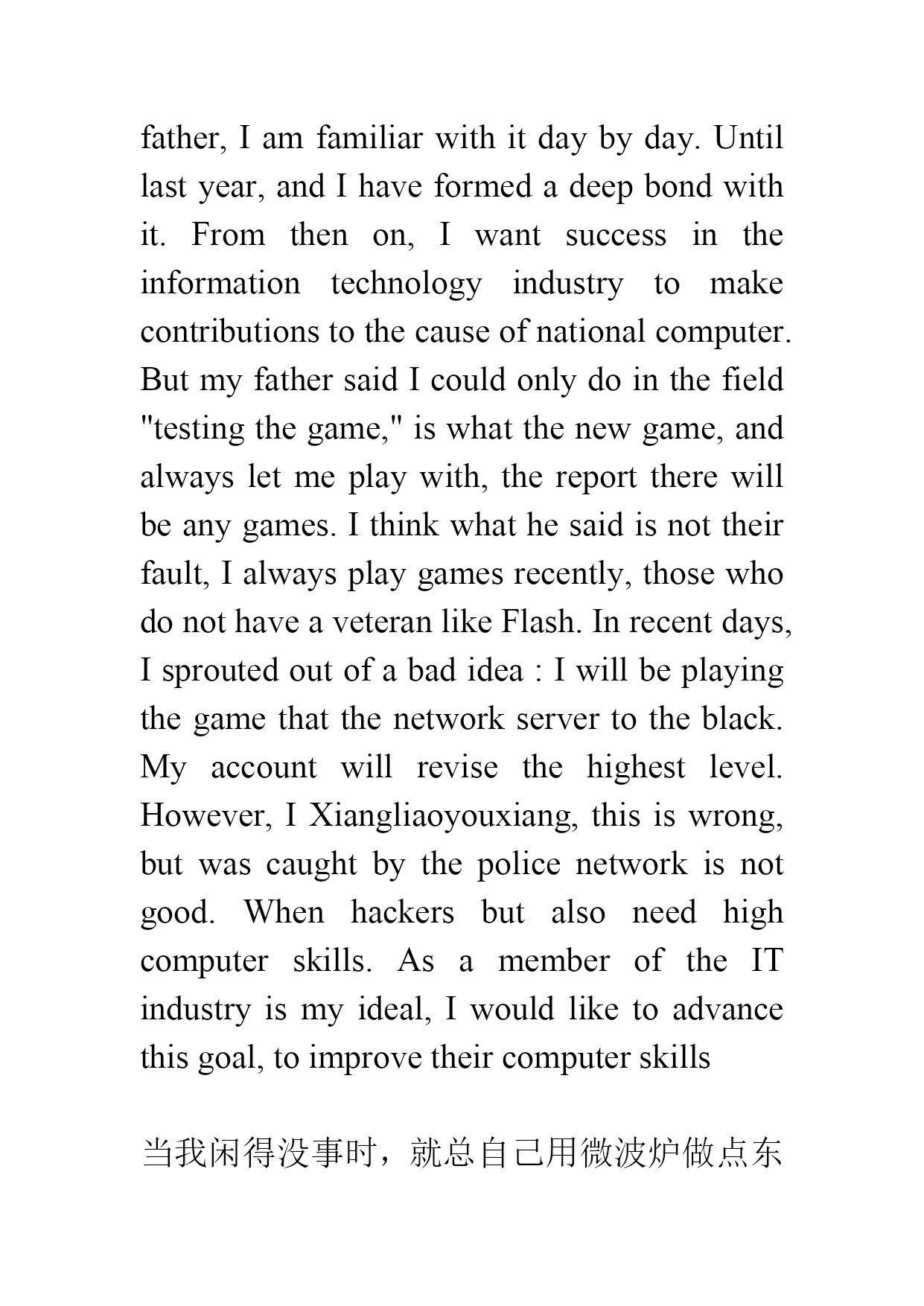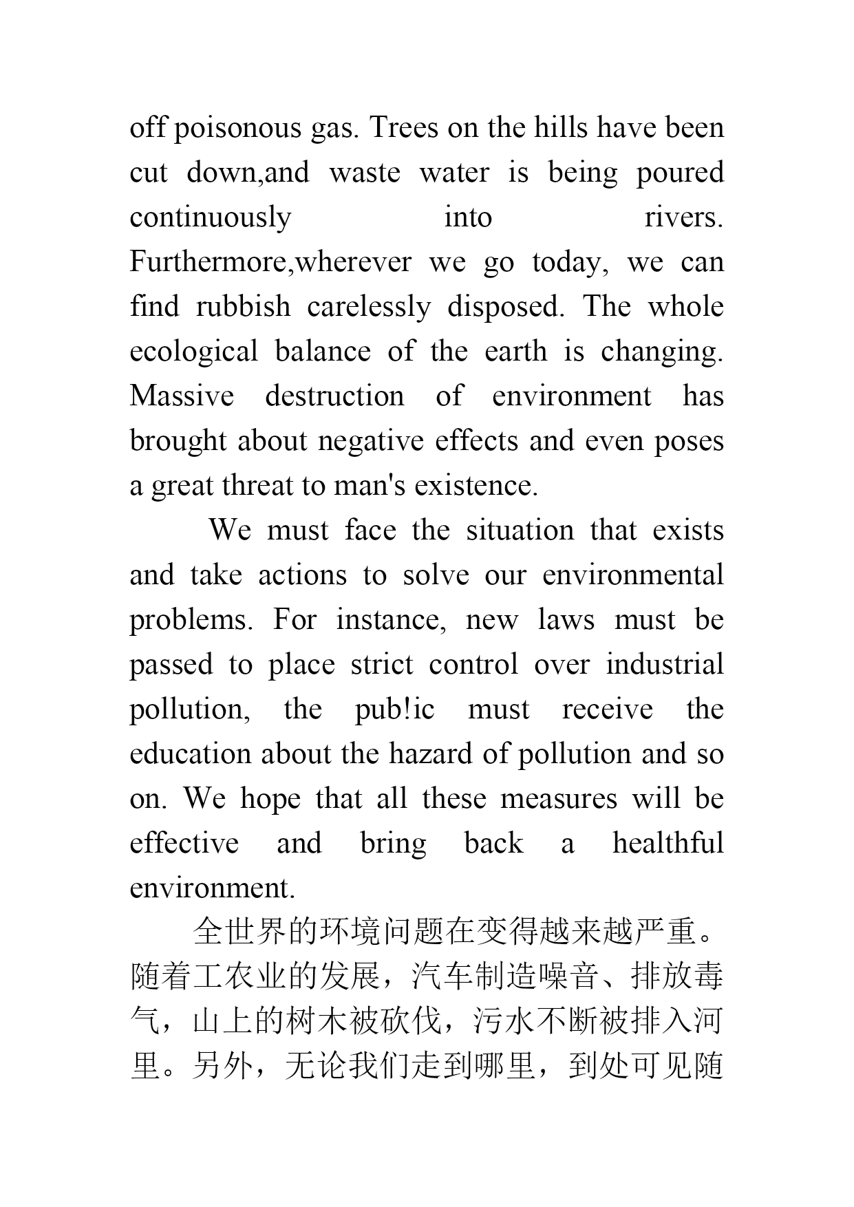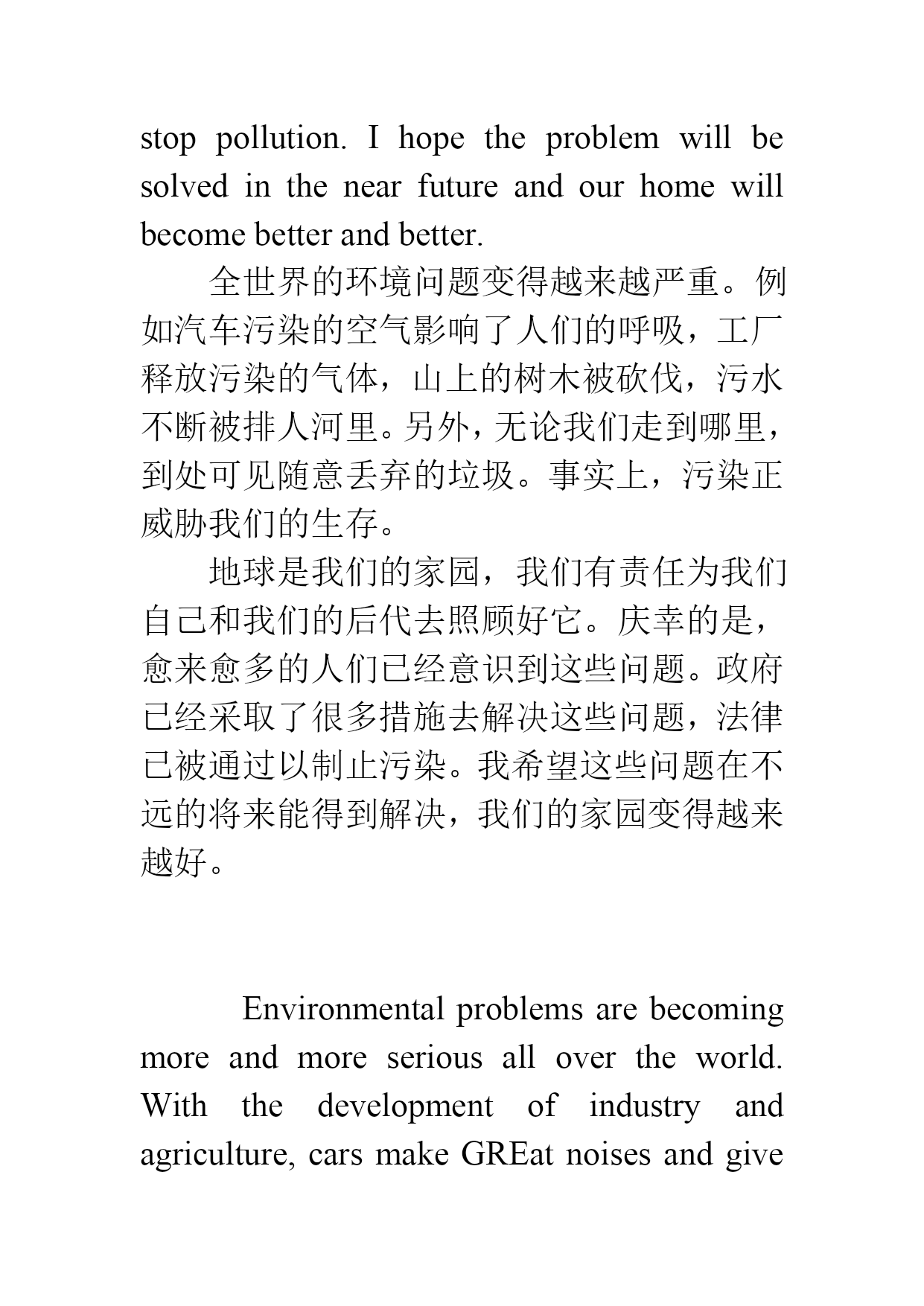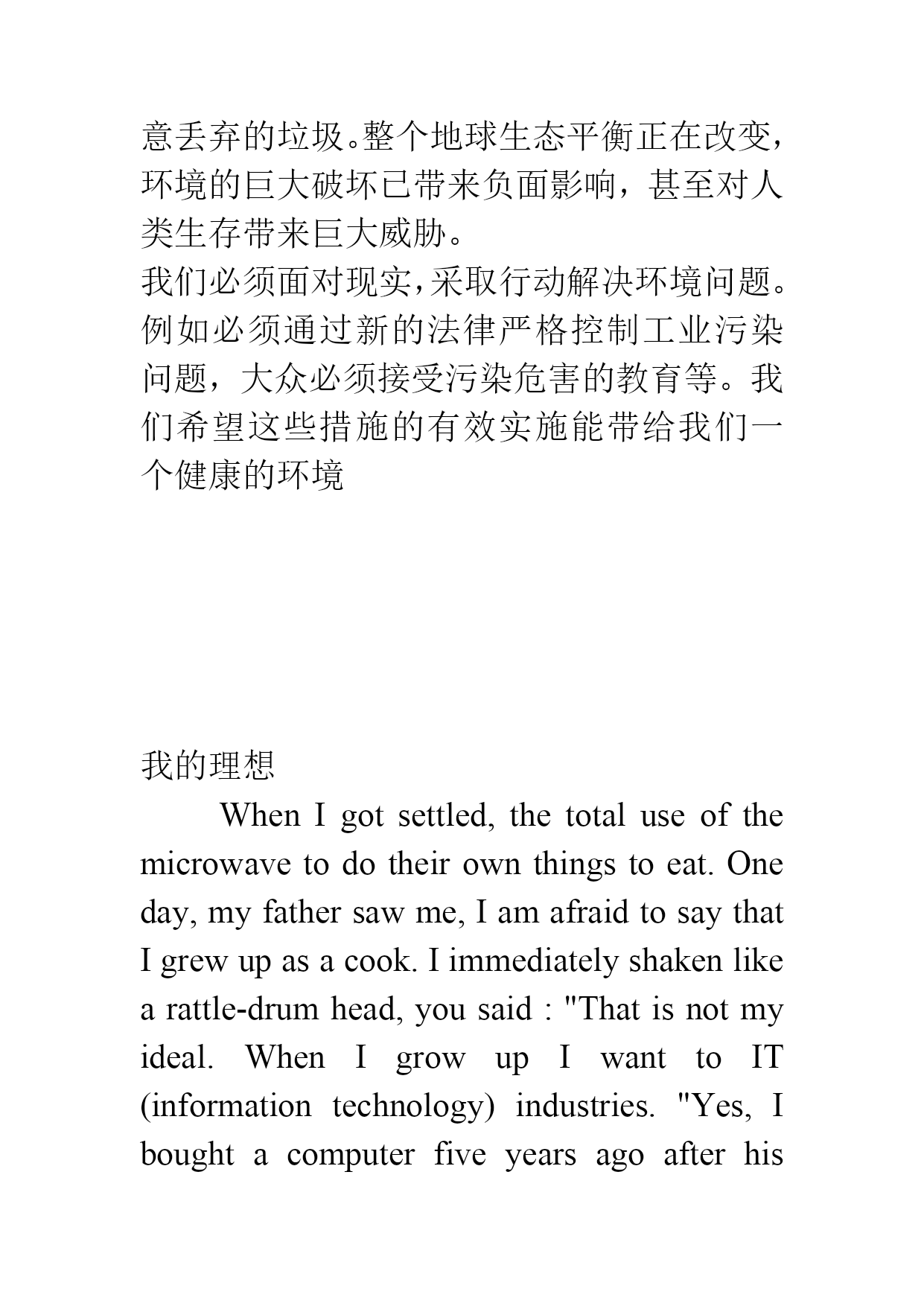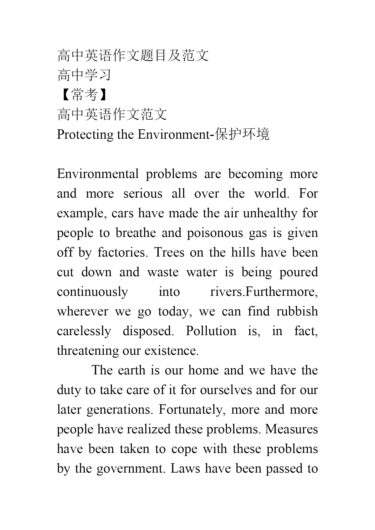 高中英语作文题目及范文 高中学习 【常考】 高中英语作文范文 ProtectingtheEnvironment-保护环境 Environmentalproblemsarebecomingmoreandmoreseriousallovertheworld.Forexample,carshavemadetheairunhealthyforpeopletobreatheandpoisonousgasisgivenoffbyfactories.Treesonthehillshavebeencutdownandwastewaterisbeingpouredcontinuouslyintorivers.Furthermore,whereverwegotoday,wecanfindrubbishcarelesslydisposed.Pollutionis,infact,threateningourexistence. Theearthisourhomeandwehavethedutytotakecareofitforourselvesandforourlatergenerations.Fortunately,moreandmorepeoplehaverealizedtheseproblems.Measureshavebeentakentocopewiththeseproblemsbythegovernment.Lawshavebeenpassedtostoppollution.Ihopetheproblemwillbesolvedinthenearfutureandourhomewillbecomebetterandbetter. 全世界的环境问题变得越来越严重。例如汽车污染的空气影响了人们的呼吸,工厂释放污染的气体,山上的树木被砍伐,污水不断被排人河里。另外,无论我们走到哪里,到处可见随意丢弃的垃圾。事实上,污染正威胁我们的生存。 地球是我们的家园,我们有责任为我们自己和我们的后代去照顾好它。庆幸的是,愈来愈多的人们已经意识到这些问题。政府已经采取了很多措施去解决这些问题,法律已被通过以制止污染。我希望这些问题在不远的将来能得到解决,我们的家园变得越来越好。 Environmentalproblemsarebecomingmoreandmoreseriousallovertheworld.Withthedevelopmentofindustryandagriculture,carsmakeGREatnoisesandgiveoffpoisonousgas.Treesonthehillshavebeencutdown,andwastewaterisbeingpouredcontinuouslyintorivers.Furthermore,whereverwegotoday,wecanfindrubbishcarelesslydisposed.Thewholeecologicalbalanceoftheearthischanging.Massivedestructionofenvironmenthasbroughtaboutnegativeeffectsandevenposesagreatthreattoman'sexistence. Wemustfacethesituationthatexistsandtakeactionstosolveourenvironmentalproblems.Forinstance,newlawsmustbepassedtoplacestrictcontroloverindustrialpollution,thepub!icmustreceivetheeducationaboutthehazardofpollutionandsoon.Wehopethatallthesemeasureswillbeeffectiveandbringbackahealthfulenvironment. 全世界的环境问题在变得越来越严重。随着工农业的发展,汽车制造噪音、排放毒气,山上的树木被砍伐,污水不断被排入河里。另外,无论我们走到哪里,到处可见随意丢弃的垃圾。整个地球生态平衡正在改变,环境的巨大破坏已带来负面影响,甚至对人类生存带来巨大威胁。 我们必须面对现实,采取行动解决环境问题。例如必须通过新的法律严格控制工业污染问题,大众必须接受污染危害的教育等。我们希望这些措施的有效实施能带给我们一个健康的环境 我的理想 WhenIgotsettled,thetotaluseofthemicrowavetodotheirownthingstoeat.Oneday,myfathersawme,Iamafraidtosayth