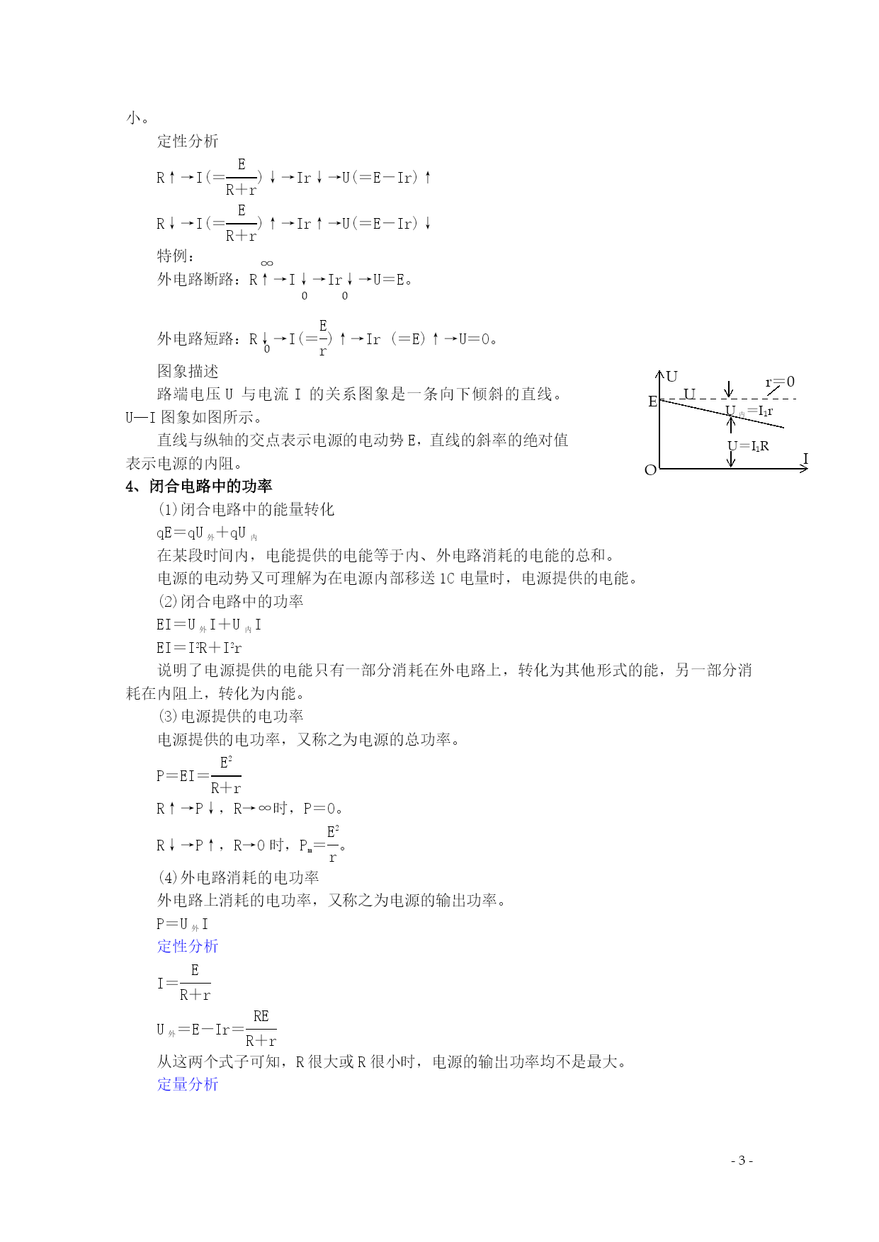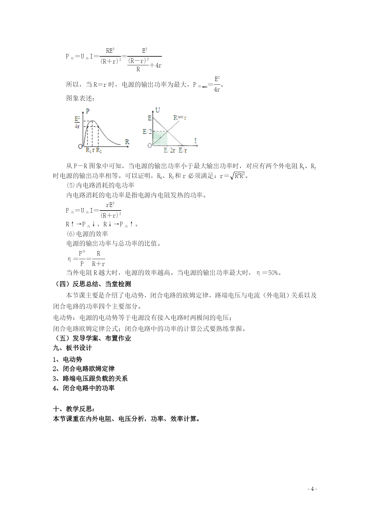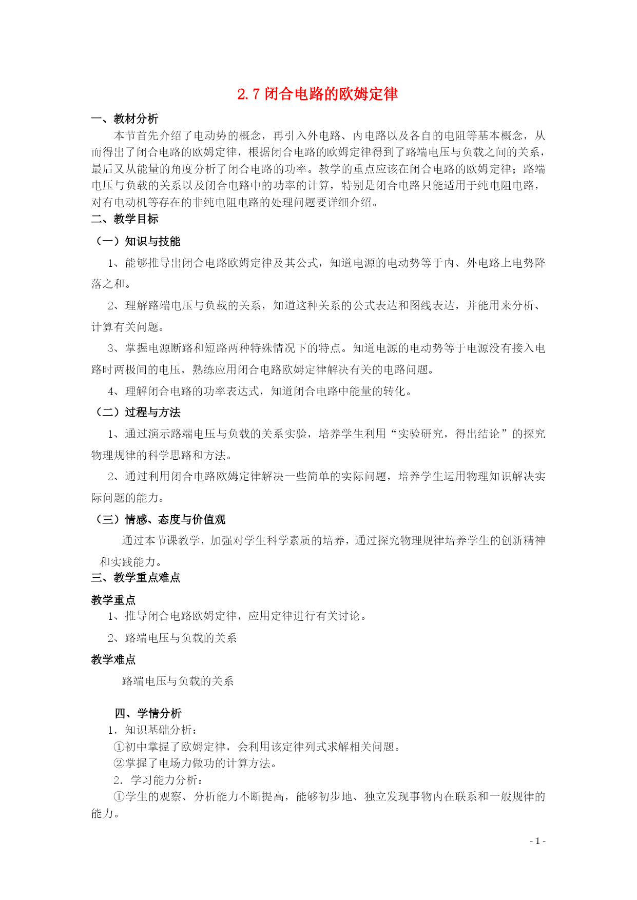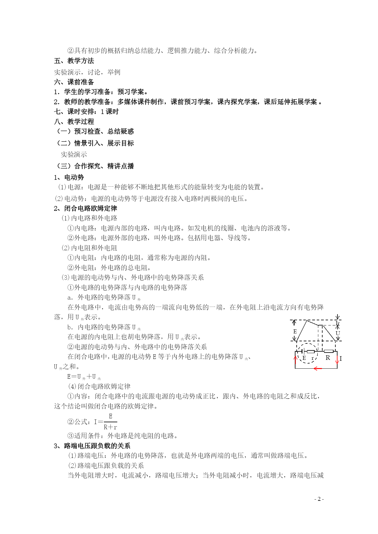 PAGE-4- 2.7闭合电路的欧姆定律 一、教材分析 本节首先介绍了电动势的概念,再引入外电路、内电路以及各自的电阻等基本概念,从而得出了闭合电路的欧姆定律,根据闭合电路的欧姆定律得到了路端电压与负载之间的关系,最后又从能量的角度分析了闭合电路的功率。教学的重点应该在闭合电路的欧姆定律;路端电压与负载的关系以及闭合电路中的功率的计算,特别是闭合电路只能适用于纯电阻电路,对有电动机等存在的非纯电阻电路的处理问题要详细介绍。 二、教学目标 (一)知识与技能 1、能够推导出闭合电路欧姆定律及其公式,知道电源的电动势等于内、外电路上电势降落之和。 2、理解路端电压与负载的关系,知道这种关系的公式表达和图线表达,并能用来分析、计算有关问题。 3、掌握电源断路和短路两种特殊情况下的特点。知道电源的电动势等于电源没有接入电路时两极间的电压,熟练应用闭合电路欧姆定律解决有关的电路问题。 4、理解闭合电路的功率表达式,知道闭合电路中能量的转化。 (二)过程与方法 1、通过演示路端电压与负载的关系实验,培养学生利用“实验研究,得出结论”的探究物理规律的科学思路和方法。 2、通过利用闭合电路欧姆定律解决一些简单的实际问题,培养学生运用物理知识解决实际问题的能力。 (三)情感、态度与价值观 通过本节课教学,加强对学生科学素质的培养,通过探究物理规律培养学生的创新精神和实践能力。 三、教学重点难点 教学重点 1、推导闭合电路欧姆定律,应用定律进行有关讨论。 2、路端电压与负载的关系 教学难点 路端电压与负载的关系 四、学情分析 1.知识基础分析: ①初中掌握了欧姆定律,会利用该定律列式求解相关问题。 ②掌握了电场力做功的计算方法。 2.学习能力分析: ①学生的观察、分析能力不断提高,能够初步地、独立发现事物内在联系和一般规律的能力。 ②具有初步的概括归纳总结能力、逻辑推力能力、综合分析能力。 五、教学方法 实验演示,讨论,举例 六、课前准备 1.学生的学习准备:预习学案。 2.教师的教学准备:多媒体课件制作,课前预习学案,课内探究学案,课后延伸拓展学案。七、课时安排:1课时 八、教学过程 (一)预习检查、总结疑惑 (二)情景引入、展示目标 实验演示 (三)合作探究、精讲点播 1、电动势 (1)电源:电源是一种能够不断地把其他形式的能量转变为电能的装置。 (2)电动势:电源的电动势等于电源没有接入电路时两极间的电压。 2、闭合电路欧姆定律 (1)内电路和外电路 ①内电路:电源内部的电路,叫内电路。如发电机的线圈、电池内的溶液等。 ②外电路:电源外部的电路,叫外电路。包括用电器、导线等。 (2)内电阻和外电阻 ①内电阻:内电路的电阻,通常称为电源的内阻。 ②外电阻:外电路的总电阻。 (3)电源的电动势与内、外电路中的电势降落关系 ①外电路的电势降落与内电路的电势降落 a.外电路的电势降落U外 Er E U Ir R I 在外电路中,电流由电势高的一端流向电势低的一端,在外电阻上沿电流方向有电势降落,用U外表示。 b.内电路的电势降落U内 在电源的内电阻上也胡电势降落,用U内表示。 ②电源的电动势与内、外电路中的电势降落关系 在闭合电路中,电源的电动势E等于内外电路上的电势降落U内、U外之和。 E=U外+U内 (4)闭合电路欧姆定律 ①内容:闭合电路中的电流跟电源的电动势成正比,跟内、外电路的电阻之和成反比,这个结论叫做闭合电路的欧姆定律。 ②公式:I=EQ\F(E,R+r) ③适用条件:外电路是纯电阻的电路。 3、路端电压跟负载的关系 (1)路端电压:外电路的电势降落,也就是外电路两端的电压,通常叫做路端电压。 (2)路端电压跟负载的关系 当外电阻增大时,电流减小,路端电压增大;当外电阻减小时,电流增大,路端电压减小。 定性分析 R↑→I(=EQ\F(E,R+r))↓→Ir↓→U(=E-Ir)↑ R↓→I(=EQ\F(E,R+r))↑→Ir↑→U(=E-Ir)↓ ∞ 特例: 0 0 外电路断路:R↑→I↓→Ir↓→U=E。 0 外电路短路:R↓→I(=EQ\F(E,r))↑→Ir(=E)↑→U=0。 U U r=0 I O E U内=I1r U=I1R 图象描述 路端电压U与电流I的关系图象是一条向下倾斜的直线。U—I图象如图所示。 直线与纵轴的交点表示电源的电动势E,直线的斜率的绝对值表示电源的内阻。 4、闭合电路中的功率 (1)闭合电路中的能量转化 qE=qU外+qU内 在某段时间内,电能提供的电能等于内、外电路消耗的电能的总和。 电源的电动势又可理解为在电源内部移送1C电量时,电源提供的电能。 (2)闭合电路中的功率 EI=U外I+U内I EI=I2R+I2r 说明了电源提供的电能只有一部分消耗在外电