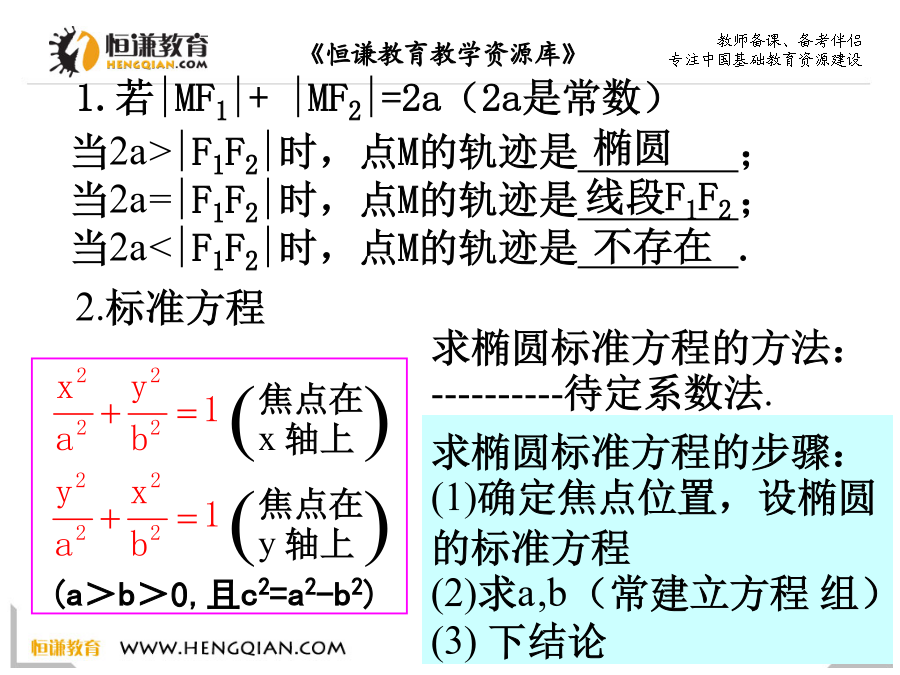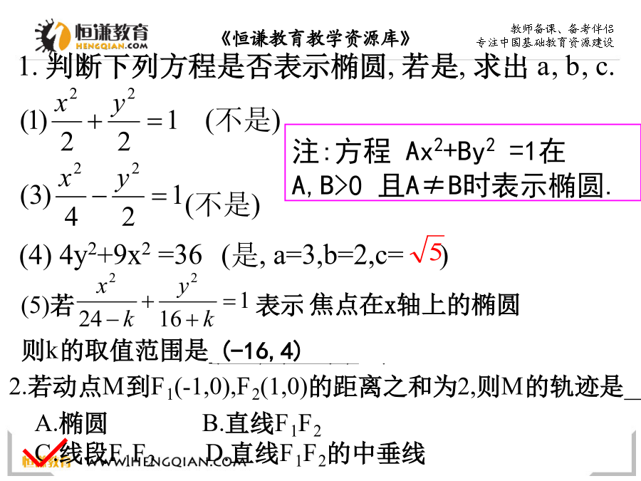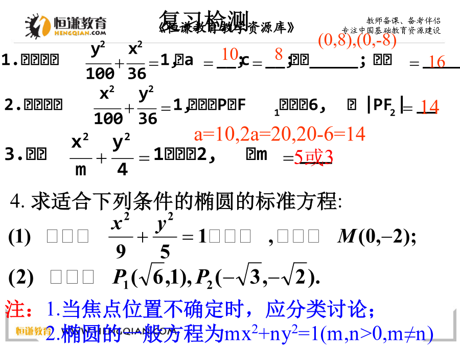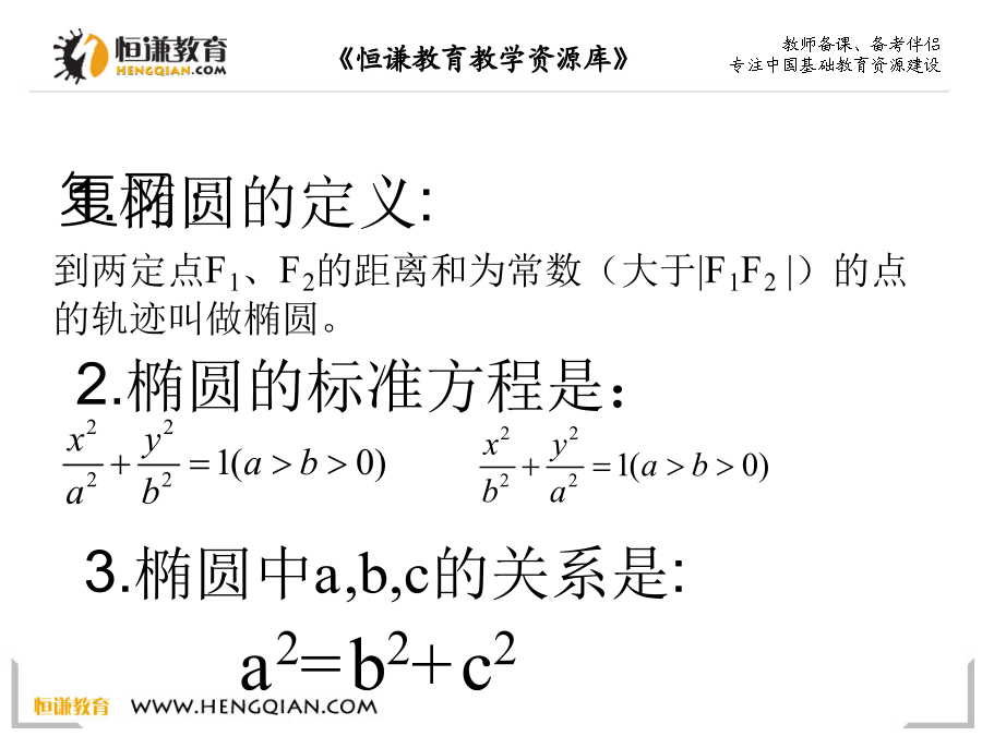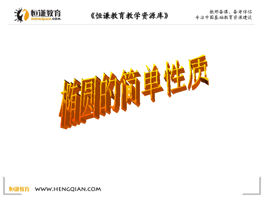 椭圆的简单性质复习:(a>b>0,且c2=a2-b2)1.判断下列方程是否表示椭圆,若是,求出a,b,c.复习检测一、椭圆的范围二、椭圆的对称性三、椭圆的顶点四、椭圆的离心率标准方程例1已知椭圆方程为16x2+25y2=400,例1:基础训练 (1)椭圆的长轴位于轴,长轴长等于;短轴位于轴,短轴长等于;焦点在轴上,焦点坐标分别 是和;离心率;左顶点坐标是;下顶点坐标是;椭圆上点P 的横坐标的范围是;纵坐标的范围是;右准线方程是。(2)若椭圆的焦点在x轴上,离心率,则m=。(2)若椭圆短轴一端点到椭圆一焦点的距离是该焦点到同侧长轴一端点距离的3倍,则椭圆的离心率=。(3)若椭圆的长轴长不大于短轴长的2倍,则椭圆的离心率。练习.已知椭圆方程为6x2+y2=6例2.已知椭圆中心在原点,对称轴为坐标轴,焦点在y轴,长轴是短轴的2倍,焦距为2,离心率为,求椭圆的方程。已知椭圆的方程为x2+a2y2=a(a>0且a1)5.我国发射的第一颗人造地球卫星的运行轨 道,是以地心F2作为一个焦点的椭圆.已 知它的近地点A距地面439km,远地点 B距地面2384km,并且F2、A、B 在同一直线上,地球半径约为6371km,求卫星运行的轨道方程(精确到1km).解:以点A、B、F2所在直线为x轴,F2为右焦点 (F1为左焦点)建系如图.小结:基本元素