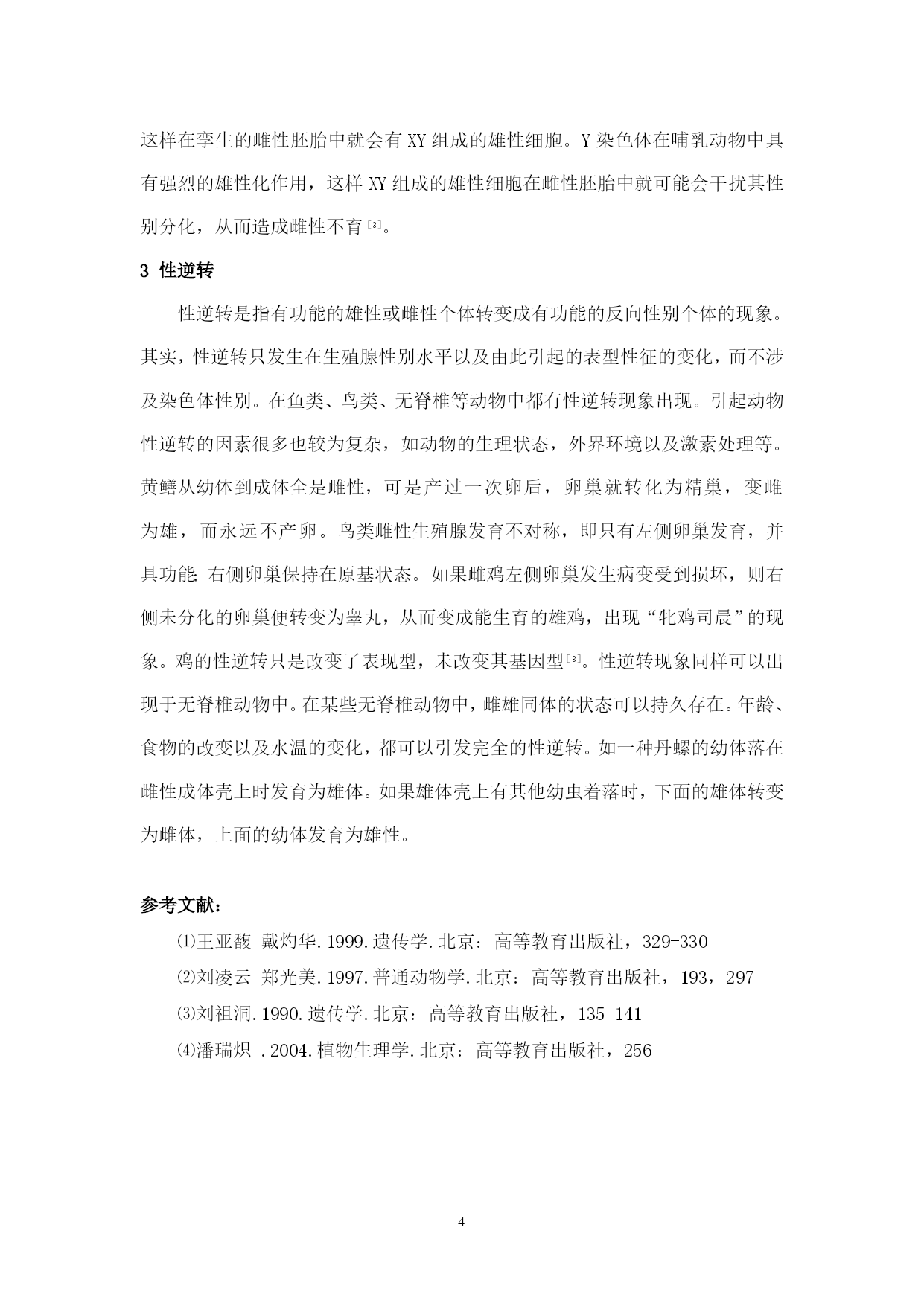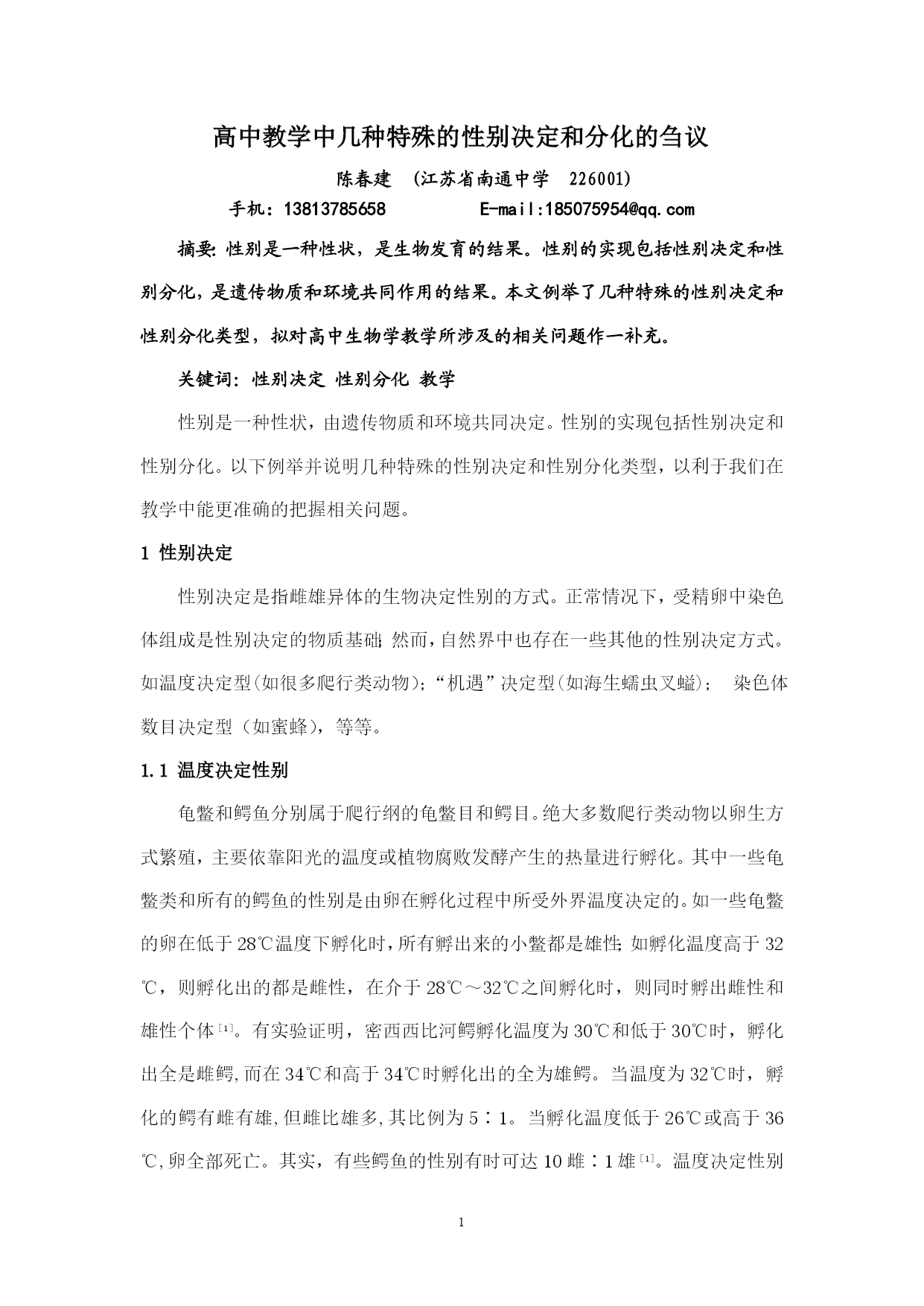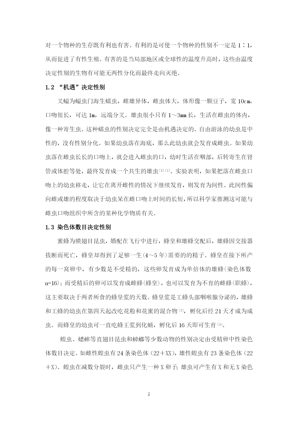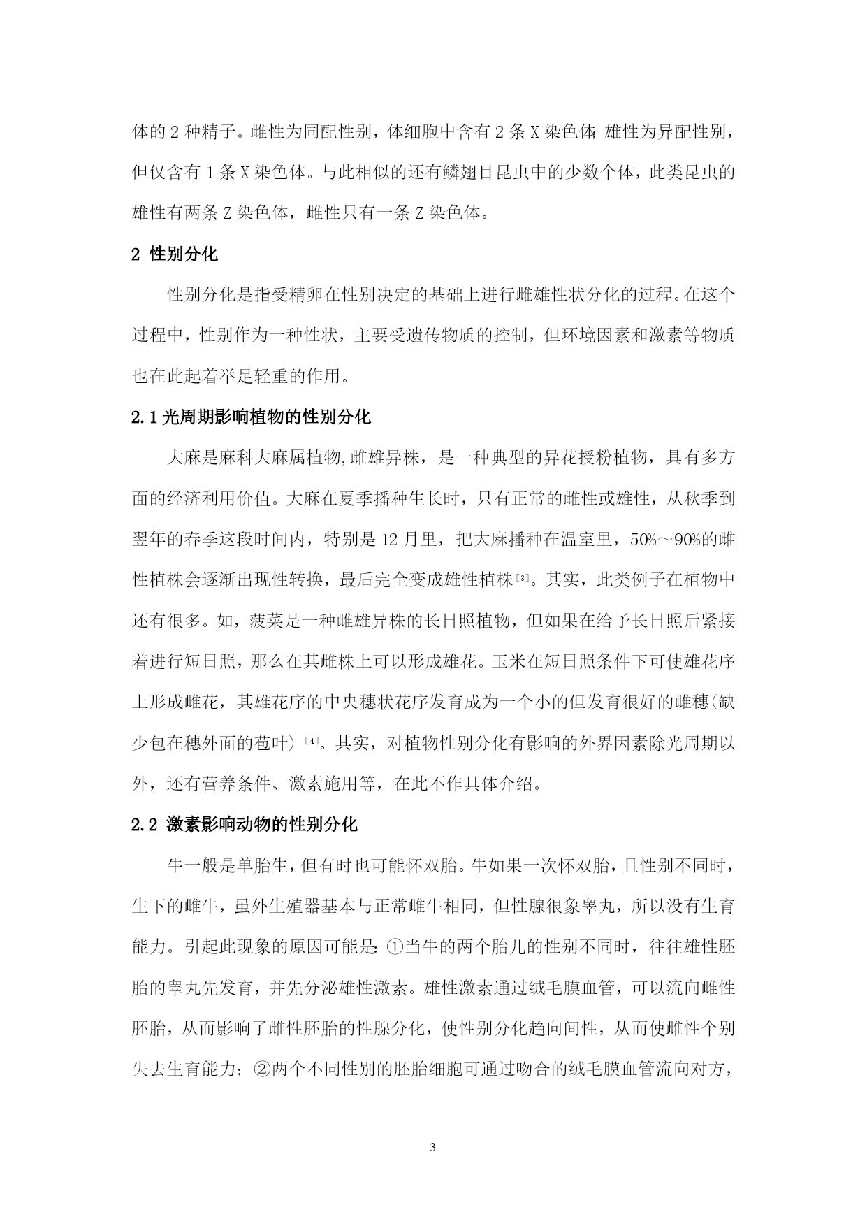 高中教学中几种特殊的性别决定和分化的刍议 陈春建(江苏省南通中学226001) 手机:13813785658E-mail:185075954@qq.com 摘要:性别是一种性状,是生物发育的结果。性别的实现包括性别决定和性别分化,是遗传物质和环境共同作用的结果。本文例举了几种特殊的性别决定和性别分化类型,拟对高中生物学教学所涉及的相关问题作一补充。 关键词:性别决定性别分化教学 性别是一种性状,由遗传物质和环境共同决定。性别的实现包括性别决定和性别分化。以下例举并说明几种特殊的性别决定和性别分化类型,以利于我们在教学中能更准确的把握相关问题。 1性别决定 性别决定是指雌雄异体的生物决定性别的方式。正常情况下,受精卵中染色体组成是性别决定的物质基础;然而,自然界中也存在一些其他的性别决定方式。如温度决定型(如很多爬行类动物);“机遇”决定型(如海生蠕虫叉螠);染色体数目决定型(如蜜蜂),等等。 1.1温度决定性别 龟鳖和鳄鱼分别属于爬行纲的龟鳖目和鳄目。绝大多数爬行类动物以卵生方式繁殖,主要依靠阳光的温度或植物腐败发酵产生的热量进行孵化。其中一些龟鳖类和所有的鳄鱼的性别是由卵在孵化过程中所受外界温度决定的。如一些龟鳖的卵在低于28℃温度下孵化时,所有孵出来的小鳖都是雄性;如孵化温度高于32℃,则孵化出的都是雌性,在介于28℃~32℃之间孵化时,则同时孵出雌性和雄性个体[1]。有实验证明,密西西比河鳄孵化温度为30℃和低于30℃时,孵化出全是雌鳄,而在34℃和高于34℃时孵化出的全为雄鳄。当温度为32℃时,孵化的鳄有雌有雄,但雌比雄多,其比例为5∶1。当孵化温度低于26℃或高于36℃,卵全部死亡。其实,有些鳄鱼的性别有时可达10雌∶1雄[1]。温度决定性别对一个物种的生存既有利也有害。有利的是可使一个物种的性别不一定是1∶1,从而促进了有性生殖。有害的是当局部地区或全球性的温度升高时,这些由温度决定性别的生物有可能无两性分化而最终走向灭绝。 1.2“机遇”决定性别 叉螠为螠虫门海生蠕虫,雌雄异体,雌虫体大,体形像一颗豆子,宽10cm,口吻很长,可达1m,远端分叉。雄虫很小只有1~3mm长,生活在雌虫的体内,像一种寄生虫。这种蠕虫的性别决定完全是由机遇决定的。自由游泳的幼虫是中性的,没有性别分化。如果幼虫落在海底,那么此幼虫就会发育成雌虫。如果幼虫落在雌虫长长的口吻上,就会进入雌虫的口,幼时生活在咽部,后转寄生在肾管或体腔等处,最终发育成一个共生的雄虫[1][2]。实验表明,如果把落在雌虫口吻上的幼虫移走,让它在离开雌性的情况下继续发育,则发育为间性。此间性偏向雌或雄的程度取决于幼虫呆在雌口吻上时间的长短,所以科学家推测这可能与雌虫口吻组织中所含的某种化学物质有关。 1.3染色体数目决定性别 蜜蜂为膜翅目昆虫,婚配在飞行中进行,蜂皇和雄蜂交配后,雄蜂因交接器拔断而死亡,蜂皇却得到了足够一生(4~5年)需要的的精子。蜂皇在接下所产的每一窝卵中,有少数是不受精的,这些卵发育成为单倍体的雄蜂(染色体数n=16);而受精后的卵可以发育成雌蜂(蜂皇),也可以发育为不育的雌蜂(职蜂),这主要取决于两者所食的蜂皇浆的天数。蜂皇浆是工蜂头部咽喉腺分泌的,雄蜂和工蜂的幼虫在第四天起改吃花粉和花蜜的混合物[2],孵化后经21天才成为成虫。而蜂皇的幼虫可一直吃蜂王浆到化蛹,孵化后16天即可生育[3]。 蝗虫、蟋蟀等直翅目昆虫和蟑螂等少数动物的性别决定由受精卵中性染色体数目决定。如雌性蝗虫有24条染色体(22+XX),雄性蝗虫有23条染色体(22+X)。蝗虫在减数分裂时,雌虫只产生一种X卵子;雄虫可产生有X和无X染色体的2种精子。雌性为同配性别,体细胞中含有2条X染色体;雄性为异配性别,但仅含有1条X染色体。与此相似的还有鳞翅目昆虫中的少数个体,此类昆虫的雄性有两条Z染色体,雌性只有一条Z染色体。 2性别分化 HYPERLINK"http://baike.baidu.com/view/26498.htm"\t"_blank"性别分化是指受精卵在性别决定的基础上进行雌雄性状分化的过程。在这个过程中,性别作为一种性状,主要受遗传物质的控制,但环境因素和激素等物质也在此起着举足轻重的作用。 2.1光周期影响植物的性别分化 大麻是麻科大麻属植物,雌雄异株,是一种典型的异花授粉植物,具有多方面的经济利用价值。大麻在夏季播种生长时,只有正常的雌性或雄性,从秋季到翌年的春季这段时间内,特别是12月里,把大麻播种在温室里,50%~90%的雌性植株会逐渐出现性转换,最后完全变成雄性植株[3]。其实,此类例子在植物中还有很多。如,菠菜是一种雌雄异株的长日照植物,但如果在给予长日照后紧接着进行短日照,那么在其雌株上可以形成雄花。玉米在短日照条件下可使雄花序上形成雌