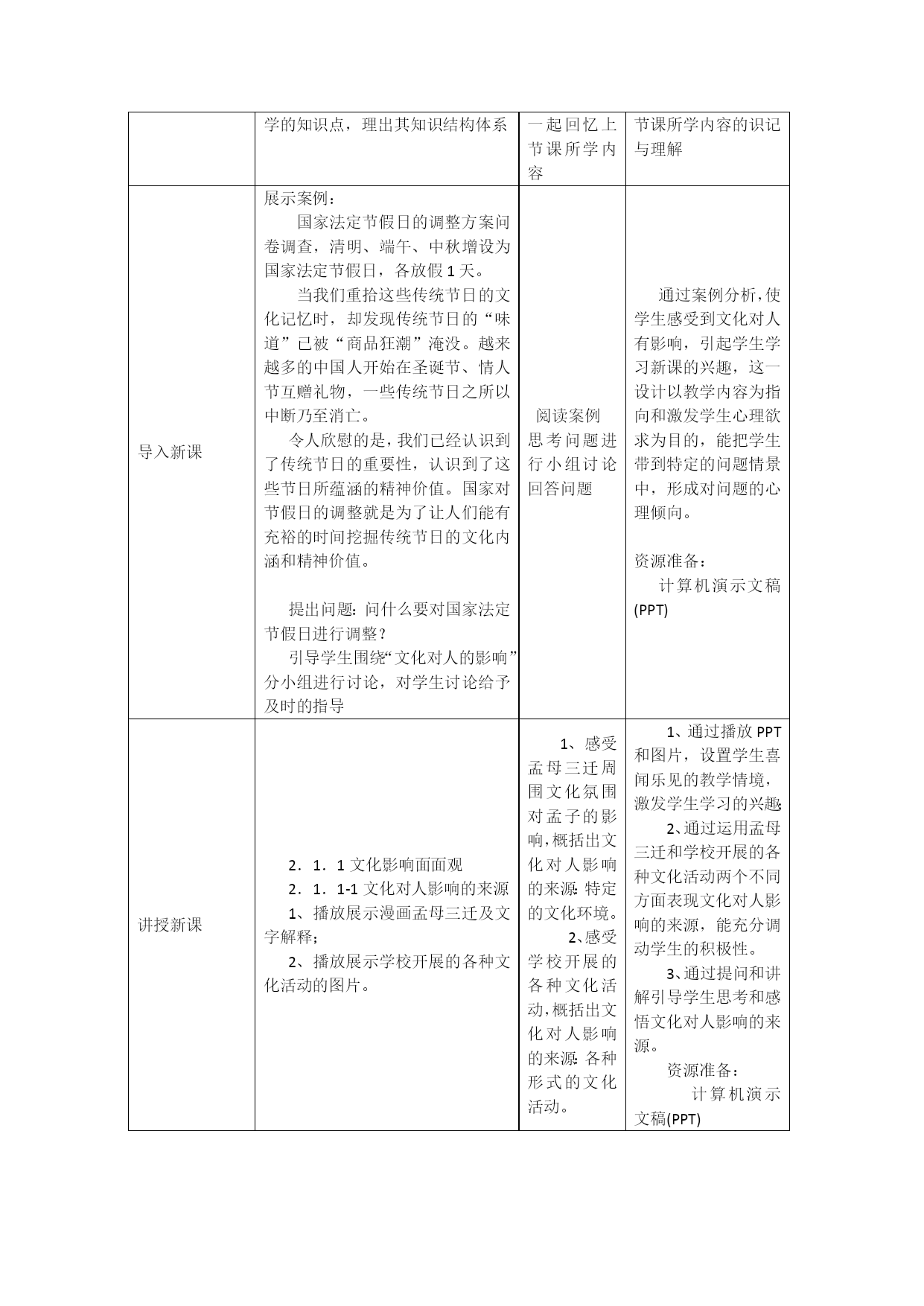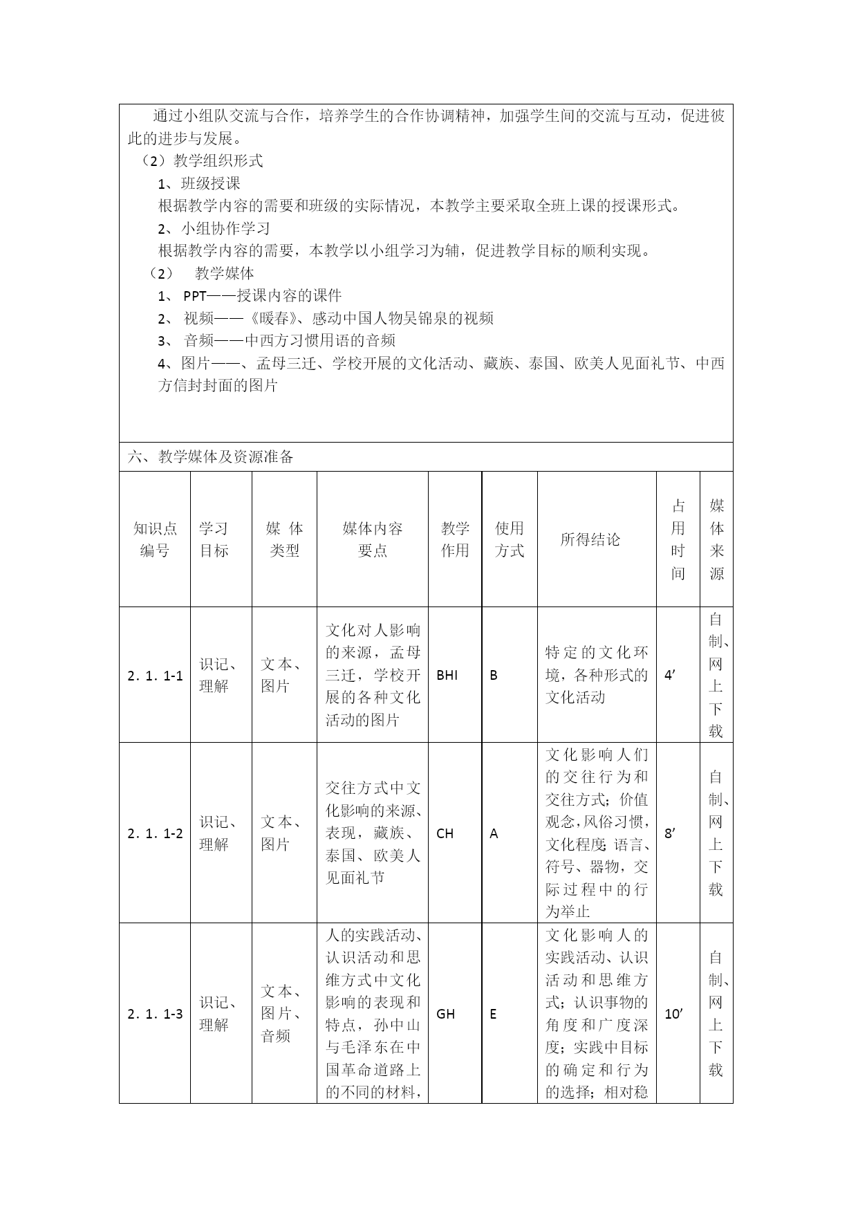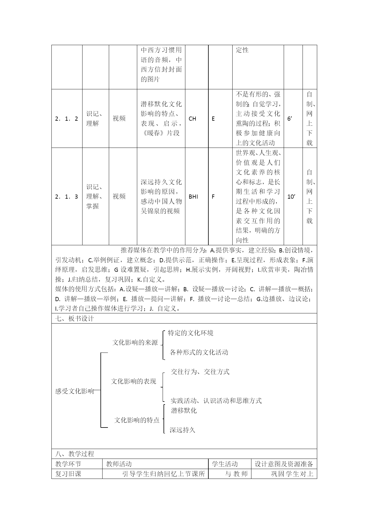 课题名称2.1感受文化影响科目高中思想政治授课年级高二课时一课时一、教学内容梗概要(列出知识点)2.1.1-1文化对人影响的来源 2.1.1-2交往方式中文化影响的来源、表现 2.1.1-3实践活动、认识活动和思维方式中文化影响的表现和特点 2.1.2潜移默化文化影响的特点、表现、启示 2.1.3深远持久文化影响的原因 二、学习者特征分析 1、教学对象的一般特征 进入高二,学生已经普遍具有稳定的认知方式和一定的认识水平,学习动机也趋于明确化、科学化和行动化,追求知识,渴望进步,在日常生活中对文化和生活有所体验和感悟。并且,本班学生学习能力较强,接受能力较好,比较活泼,乐于小组合作学习和讨论交流,课堂气氛活跃。 2、教学对象的初始能力 ①先决技能的预估:通过《体味文化》的学习,学生对文化的特点有了一定的认识;通过上一节课《文化与经济、政治》的课后小验和学生分享的有关个人对文化与生活的资料收集,了解到学生已经具备进行新的学习所必须掌握的知识与技能; ②目标技能的预估:在语文课的学习中,学生对文化与生活已有了初步的认识;在开始上新课之前,通过分析学生以前学过的文化与生活的内容,了解学生掌握的目标技能情况; ③学习态度的了解:通过谈话法和观察法了解学生对将要学习的《感受文化影响》有着浓厚的兴趣,能够主动了解和接触文化与生活的丰富内容,积极与老师和同学交流和分享。 教学目标 (1)知识与技能 1、识记文化对人影响的来源。 感受文化影响人的交往行为、交往方式、实践活动、认识活动和思维方式。 理解文化影响人的特点。 4、培养理论联系实际的能力,结合文化对人的影响,积极参加健康向上的文化活动,培养自己正确的交往方式和思维方式。 (2)过程与方法 1、通过收集文化对人的影响的相关资料,深入体验和感悟文化对人的影响,理解积极参加健康向上的文化的文化活动,自觉接受健康向上的文化熏陶。 通过合作探究,体验文化对人的影响,对比中外文化的差异。 (3)情感态度与价值观 1、自觉接受健康向上的文化熏陶,树立正确的世界观、人生观、价值观,丰富精神世界,增强精神力量,具有热爱生活的情感态度,保持昂扬向上的精神状态,接受优秀文化,促进自身全面发展。 2、正确对待各种文化现象,辨识落后文化,抵制腐朽文化,积极参加健康有益的文化活动,投身社会主义精神文明建设。感悟文化的差异性,增进文化沟通交流意识。四、重点与难点项目内容解决措施教学重点文化影响人们的交往行为和交往方式 文化影响人们的实践活动、认识活动和思维方式1、展示藏族、泰国、欧美人见面礼节的图片及文字说明;(交往行为、交往方式); 2、展示孙中山与毛泽东在中国革命道路上的不同的材料;(实践活动); 3、播放中西方习惯用语的音频;(认识活动); 4、展示中西方信封封面的图片;(思维方式); 5、针对每个知识点适时引导学生进行讨论以及思考问题,加深对文化对人影响的表现的理解。教学难点 文化对人深远持久的影响播放感动中国人物吴锦泉的视频 通过提问和讲解引导学 生思考和理解文化影响人的世界观、人生观、价值观,感受文化影响深远持久的特点,是学生树立正确的世界观、人生观、价值观。五、教学策略选择与设计教学方法 1、讲授法 根据教学目标的设定,要求学生学习和掌握基本知识,在短时间内理解和接受知识,所 以本教学主要采取教师主导、以学生为主体的模式。教师主要通过借助多媒体向学生进行知识的讲授和知识的构建。 2、演示法 通过案例、图片和视频的展示,结合板书,加强学生的理解和调动学生理智和情感的主 动性和积极性。 3、讨论法 通过学生对讨论和交流和老师的适时指导,培养学生发现问题和解决问题的能力, 提高学生的积极性,发挥教师和学生双主体的作用。 4、练习—反馈法 通过课堂练习和反馈,及时了解学生对知识的掌握程度,对教学效果进行初步评估, 适当对教学计划作出调整。 5、发现学习法 通过在自主学习和小组交流,培养学生发现问题的能力,引导学生自主解决问题,充分 发挥学生的主体性和主动性。 6、合作学习法 通过小组队交流与合作,培养学生的合作协调精神,加强学生间的交流与互动,促进彼 此的进步与发展。 (2)教学组织形式 1、班级授课 根据教学内容的需要和班级的实际情况,本教学主要采取全班上课的授课形式。 2、小组协作学习 根据教学内容的需要,本教学以小组学习为辅,促进教学目标的顺利实现。 教学媒体 PPT——授课内容的课件 视频——《暖春》、感动中国人物吴锦泉的视频 音频——中西方习惯用语的音频 4、图片——、孟母三迁、学校开展的文化活动、藏族、泰国、欧美人见面礼节、中西方信封封面的图片 六、教学媒体及资源准备 知识点 编号 学习 目标 媒体 类型媒体内容 要点教学作用使用方式所得结论占用时间媒体来源2.1.1-1识记、理解文本