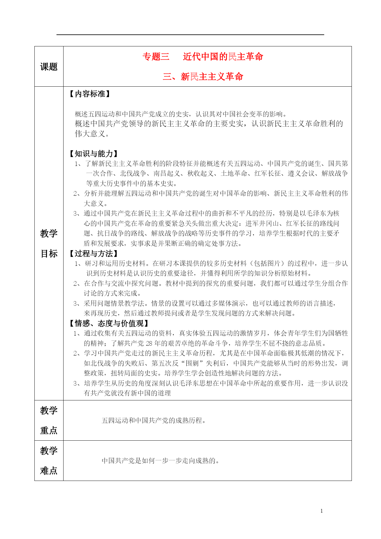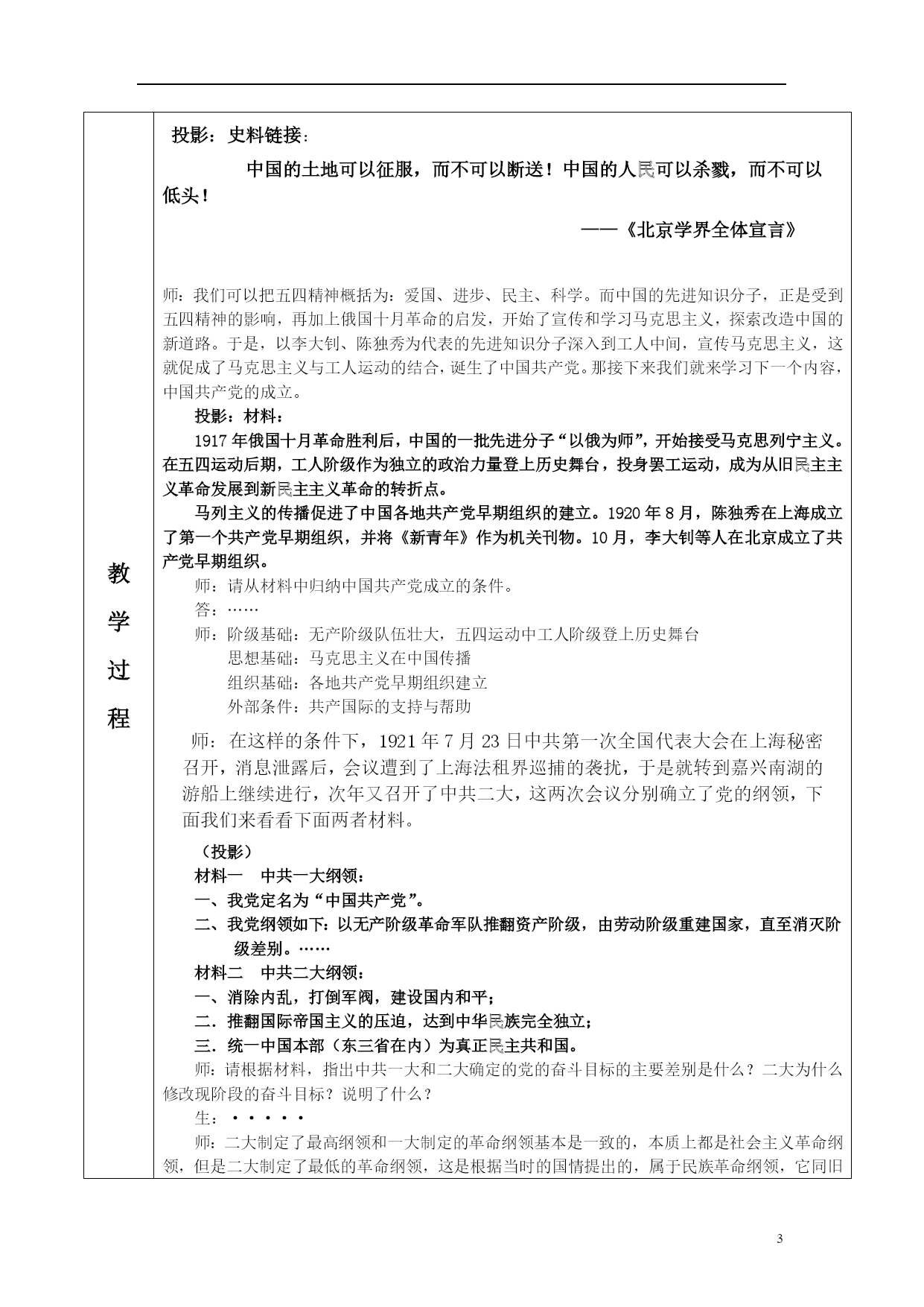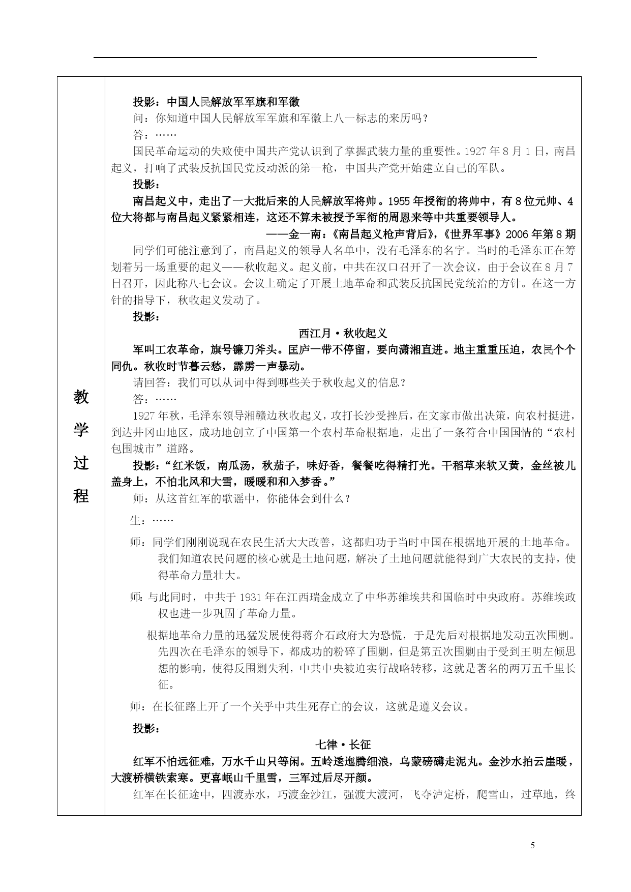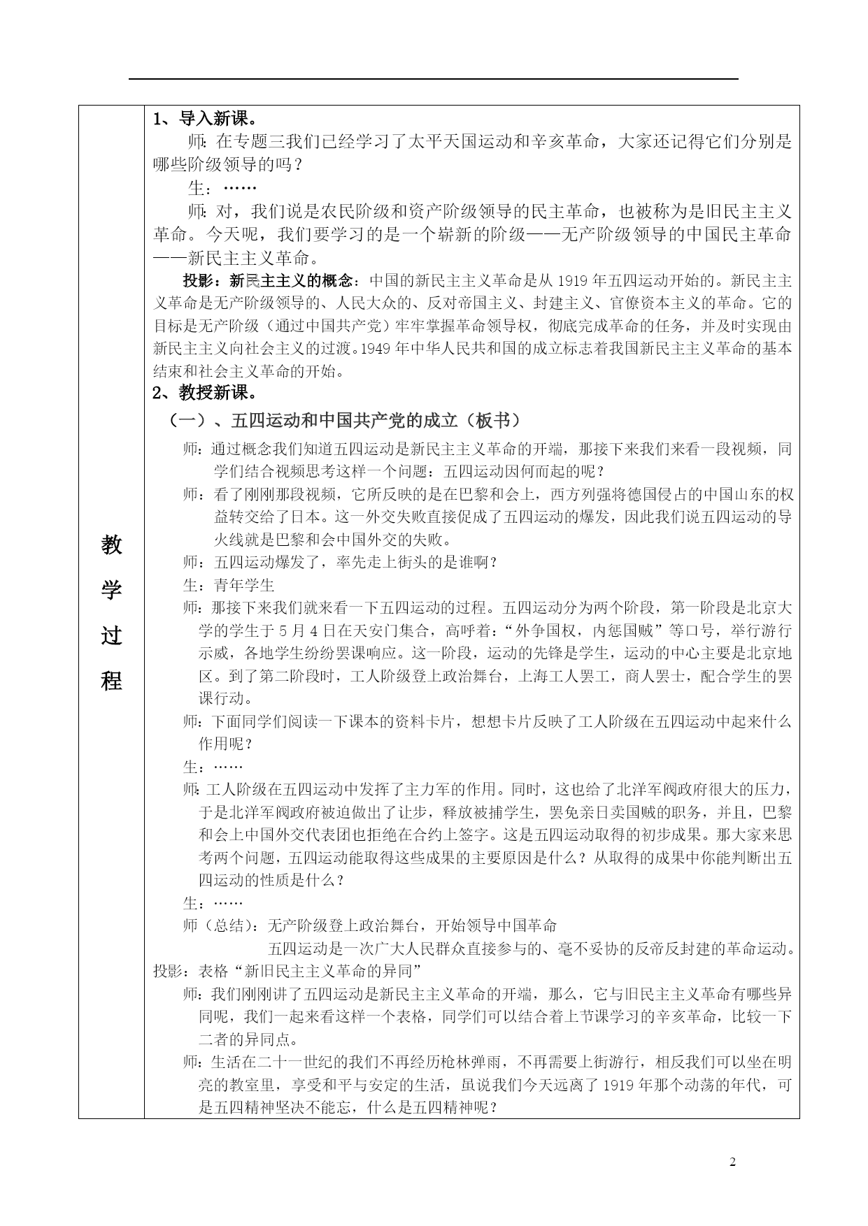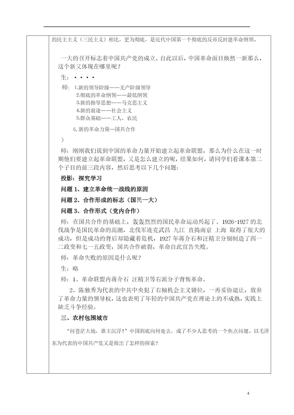 课题专题三近代中国的民主革命 三、新民主主义革命教学目标【内容标准】 概述五四运动和中国共产党成立的史实,认识其对中国社会变革的影响。 概述中国共产党领导的新民主主义革命的主要史实,认识新民主主义革命胜利的伟大意义。 【知识与能力】 1、了解新民主主义革命胜利的阶段特征并能概述有关五四运动、中国共产党的诞生、国共第一次合作、北伐战争、南昌起义、秋收起义、土地革命、红军长征、遵义会议、解放战争等重大历史事件中的基本史实。 2、分析并能理解五四运动和中国共产党的诞生对中国革命的影响、新民主主义革命胜利的伟大意义。 3、通过中国共产党在新民主主义革命过程中的曲折和不平凡的经历,特别是以毛泽东为核心的中国共产党在革命的重要紧急关头做出重大决定:进军井冈山、红军长征的路线问题、抗日战争的路线、解放战争的战略等历史事件的学习,培养学生根据时代的主要矛盾和发展要求,实事求是并果断正确的确定处事方法。 【过程与方法】 1、研习和运用历史材料。在研习本课提供的较多历史材料(包括图片)的过程中,进一步认识到历史材料是认识历史的重要途径,并懂得利用所学的知识分析原始材料。 2、在合作与交流中探究问题。教材中提到的探究的重要问题,我们都可以通过学生分组合作讨论的方式来完成。 3、采用问题情景教学法。情景的设置可以通过多媒体演示,也可以通过教师的语言描述,来再现历史,然后通过教师提问或者是学生发现问题的方式来解决问题。 【情感、态度与价值观】 1、通过收集有关五四运动的资料,真实体验五四运动的激情岁月,体会青年学生们为国牺牲的精神;了解共产党28年的艰苦卓绝的革命斗争,培养学生不屈不挠的意志品质。 2、学习中国共产党走过的新民主主义革命历程,尤其是在中国革命面临极其低潮的情况下,如北伐战争的失败后、第五次反“围剿”失利后,中国共产党能够从当时的形势出发,调整政策,扭转局面的史实。培养学生学会创造性地解决问题的方法。 3、培养学生从历史的角度深刻认识毛泽东思想在中国革命中所起的重要作用,进一步认识没有共产党就没有新中国的道理教学重点五四运动和中国共产党的成熟历程。教学难点中国共产党是如何一步一步走向成熟的。 教 学 过 程1、导入新课。 师:在专题三我们已经学习了太平天国运动和辛亥革命,大家还记得它们分别是哪些阶级领导的吗? 生:…… 师:对,我们说是农民阶级和资产阶级领导的民主革命,也被称为是旧民主主义革命。今天呢,我们要学习的是一个崭新的阶级——无产阶级领导的中国民主革命——新民主主义革命。 投影:新民主主义的概念:中国的新民主主义革命是从1919年五四运动开始的。新民主主义革命是无产阶级领导的、人民大众的、反对帝国主义、封建主义、官僚资本主义的革命。它的目标是无产阶级(通过中国共产党)牢牢掌握革命领导权,彻底完成革命的任务,并及时实现由新民主主义向社会主义的过渡。1949年中华人民共和国的成立标志着我国新民主主义革命的基本结束和社会主义革命的开始。 2、教授新课。 (一)、五四运动和中国共产党的成立(板书) 师:通过概念我们知道五四运动是新民主主义革命的开端,那接下来我们来看一段视频,同学们结合视频思考这样一个问题:五四运动因何而起的呢? 师:看了刚刚那段视频,它所反映的是在巴黎和会上,西方列强将德国侵占的中国山东的权益转交给了日本。这一外交失败直接促成了五四运动的爆发,因此我们说五四运动的导火线就是巴黎和会中国外交的失败。 师:五四运动爆发了,率先走上街头的是谁啊? 生:青年学生 师:那接下来我们就来看一下五四运动的过程。五四运动分为两个阶段,第一阶段是北京大学的学生于5月4日在天安门集合,高呼着:“外争国权,内惩国贼”等口号,举行游行示威,各地学生纷纷罢课响应。这一阶段,运动的先锋是学生,运动的中心主要是北京地区。到了第二阶段时,工人阶级登上政治舞台,上海工人罢工,商人罢士,配合学生的罢课行动。 师:下面同学们阅读一下课本的资料卡片,想想卡片反映了工人阶级在五四运动中起来什么作用呢? 生:…… 师:工人阶级在五四运动中发挥了主力军的作用。同时,这也给了北洋军阀政府很大的压力,于是北洋军阀政府被迫做出了让步,释放被捕学生,罢免亲日卖国贼的职务,并且,巴黎和会上中国外交代表团也拒绝在合约上签字。这是五四运动取得的初步成果。那大家来思考两个问题,五四运动能取得这些成果的主要原因是什么?从取得的成果中你能判断出五四运动的性质是什么? 生:…… 师(总结):无产阶级登上政治舞台,开始领导中国革命 五四运动是一次广大人民群众直接参与的、毫不妥协的反帝反封建的革命运动。 投影:表格“新旧民主主义革命的异同” 师:我们刚刚讲了五四运动是新民主主义革命的开端,那么,它与旧民主主义革命有哪些异同呢,我们一起来看这样一个表格,同学们可以结合着上节课