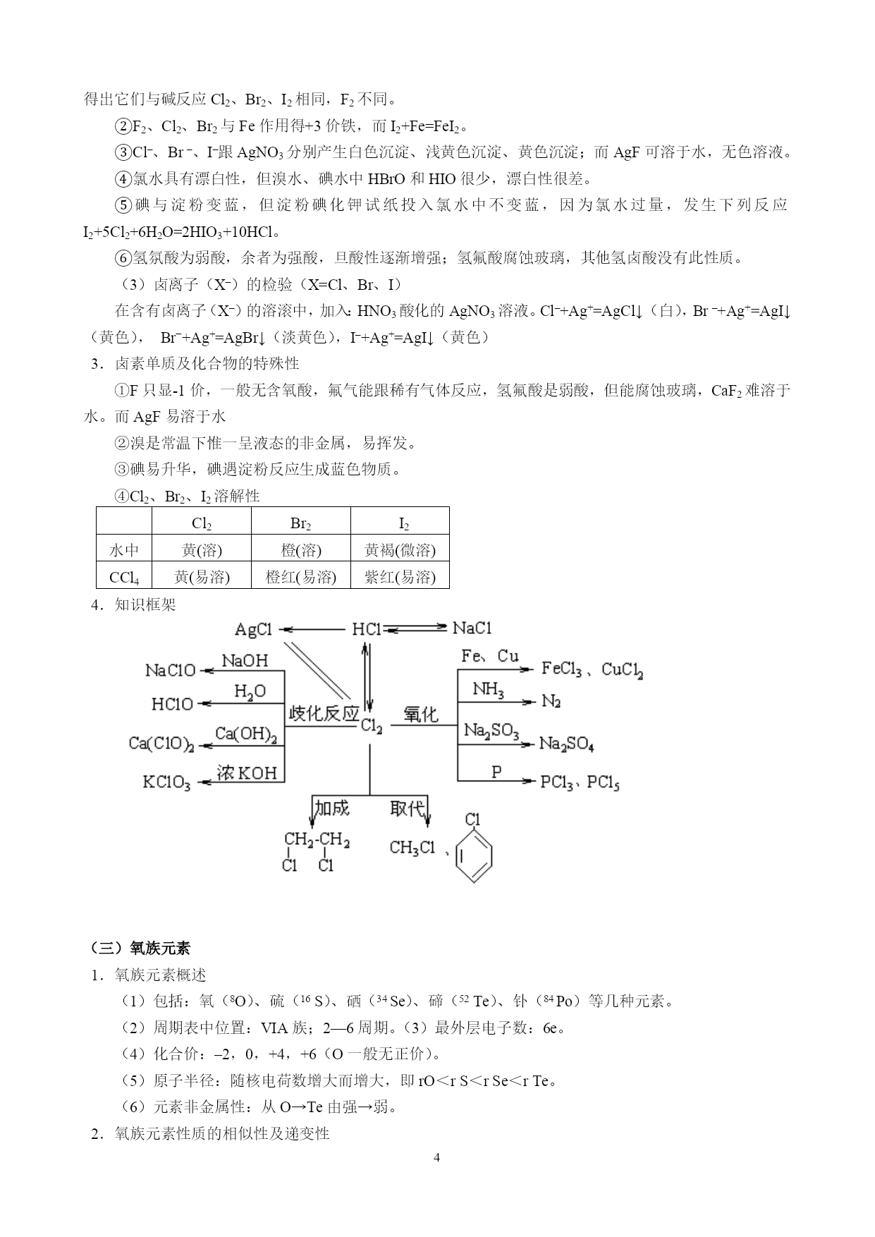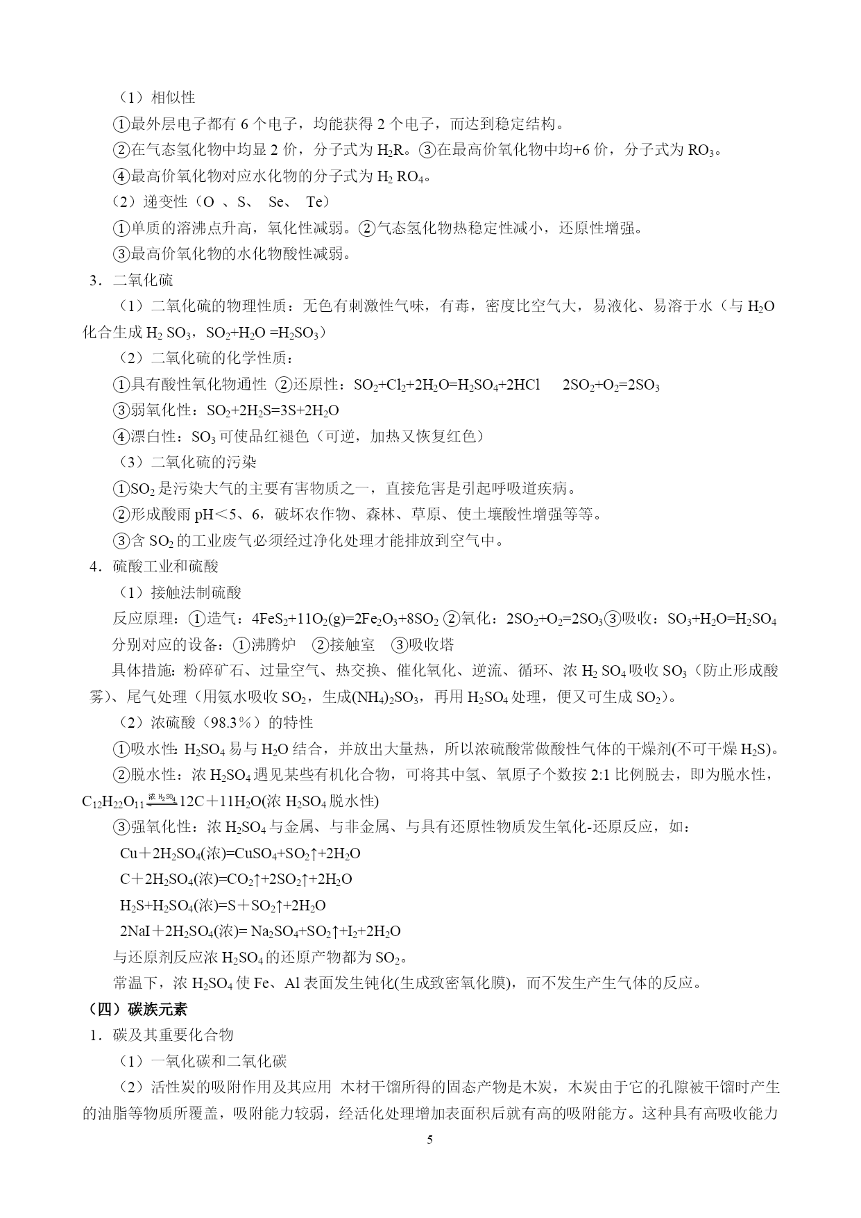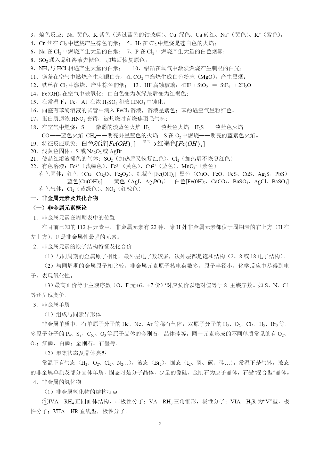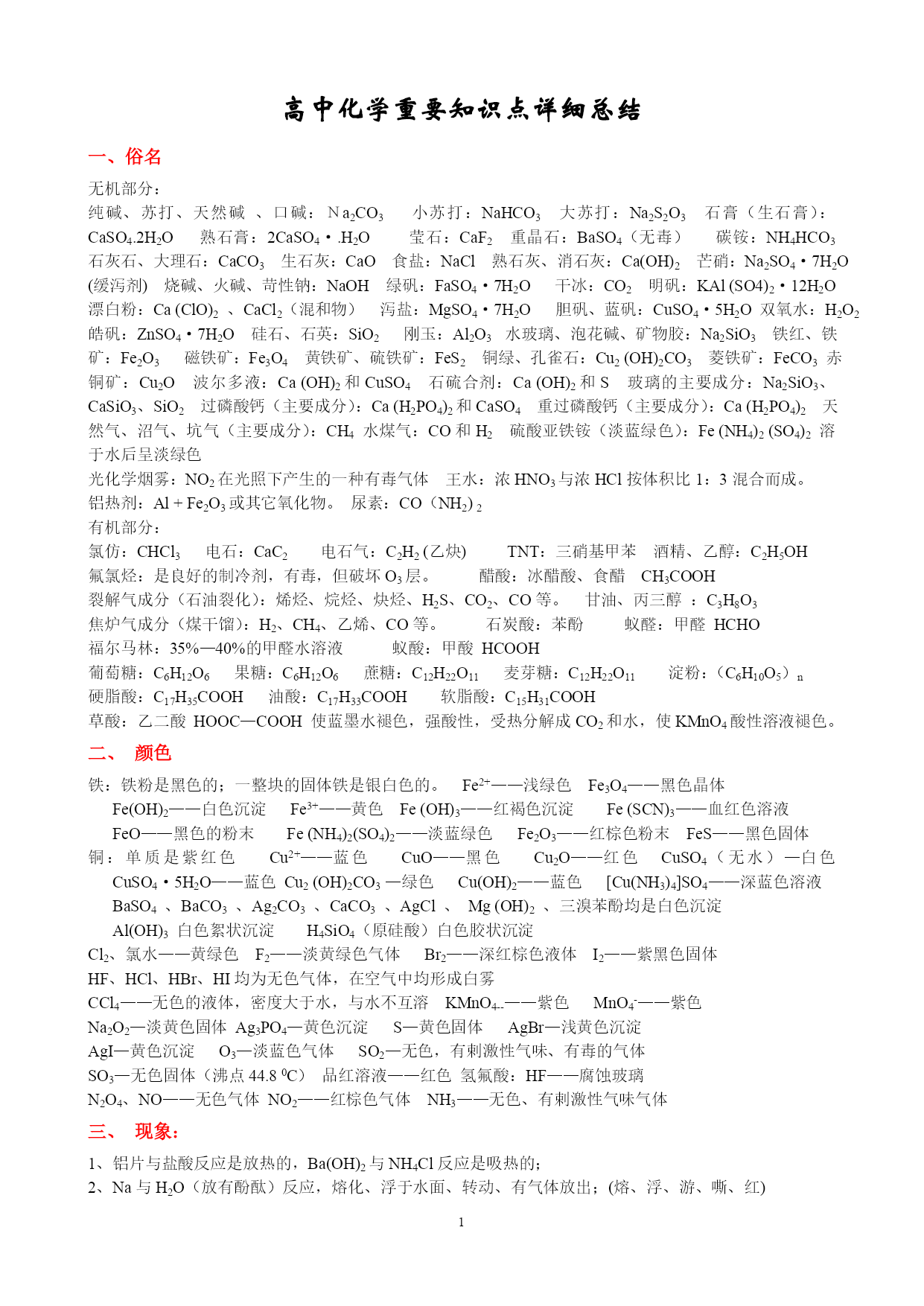 高中化学重要知识点详细总结 一、俗名 无机部分: 纯碱、苏打、天然碱、口碱:Na2CO3小苏打:NaHCO3大苏打:Na2S2O3石膏(生石膏):CaSO4.2H2O熟石膏:2CaSO4·.H2O莹石:CaF2重晶石:BaSO4(无毒)碳铵:NH4HCO3石灰石、大理石:CaCO3生石灰:CaO食盐:NaCl熟石灰、消石灰:Ca(OH)2芒硝:Na2SO4·7H2O(缓泻剂)烧碱、火碱、苛性钠:NaOH绿矾:FaSO4·7H2O干冰:CO2明矾:KAl(SO4)2·12H2O漂白粉:Ca(ClO)2、CaCl2(混和物)泻盐:MgSO4·7H2O胆矾、蓝矾:CuSO4·5H2O双氧水:H2O2皓矾:ZnSO4·7H2O硅石、石英:SiO2刚玉:Al2O3水玻璃、泡花碱、矿物胶:Na2SiO3铁红、铁矿:Fe2O3磁铁矿:Fe3O4黄铁矿、硫铁矿:FeS2铜绿、孔雀石:Cu2(OH)2CO3菱铁矿:FeCO3赤铜矿:Cu2O波尔多液:Ca(OH)2和CuSO4石硫合剂:Ca(OH)2和S玻璃的主要成分:Na2SiO3、CaSiO3、SiO2过磷酸钙(主要成分):Ca(H2PO4)2和CaSO4重过磷酸钙(主要成分):Ca(H2PO4)2天然气、沼气、坑气(主要成分):CH4水煤气:CO和H2硫酸亚铁铵(淡蓝绿色):Fe(NH4)2(SO4)2溶于水后呈淡绿色 光化学烟雾:NO2在光照下产生的一种有毒气体王水:浓HNO3与浓HCl按体积比1:3混合而成。 铝热剂:Al+Fe2O3或其它氧化物。尿素:CO(NH2)2 有机部分: 氯仿:CHCl3电石:CaC2电石气:C2H2(乙炔)TNT:三硝基甲苯酒精、乙醇:C2H5OH 氟氯烃:是良好的制冷剂,有毒,但破坏O3层。醋酸:冰醋酸、食醋CH3COOH 裂解气成分(石油裂化):烯烃、烷烃、炔烃、H2S、CO2、CO等。甘油、丙三醇:C3H8O3 焦炉气成分(煤干馏):H2、CH4、乙烯、CO等。石炭酸:苯酚蚁醛:甲醛HCHO 福尔马林:35%—40%的甲醛水溶液蚁酸:甲酸HCOOH 葡萄糖:C6H12O6果糖:C6H12O6蔗糖:C12H22O11麦芽糖:C12H22O11淀粉:(C6H10O5)n 硬脂酸:C17H35COOH油酸:C17H33COOH软脂酸:C15H31COOH 草酸:乙二酸HOOC—COOH使蓝墨水褪色,强酸性,受热分解成CO2和水,使KMnO4酸性溶液褪色。 二、颜色 铁:铁粉是黑色的;一整块的固体铁是银白色的。Fe2+——浅绿色Fe3O4——黑色晶体 Fe(OH)2——白色沉淀Fe3+——黄色Fe(OH)3——红褐色沉淀Fe(SCN)3——血红色溶液 FeO——黑色的粉末Fe(NH4)2(SO4)2——淡蓝绿色Fe2O3——红棕色粉末FeS——黑色固体 铜:单质是紫红色Cu2+——蓝色CuO——黑色Cu2O——红色CuSO4(无水)—白色CuSO4·5H2O——蓝色Cu2(OH)2CO3—绿色Cu(OH)2——蓝色[Cu(NH3)4]SO4——深蓝色溶液 BaSO4、BaCO3、Ag2CO3、CaCO3、AgCl、Mg(OH)2、三溴苯酚均是白色沉淀 Al(OH)3白色絮状沉淀H4SiO4(原硅酸)白色胶状沉淀 Cl2、氯水——黄绿色F2——淡黄绿色气体Br2——深红棕色液体I2——紫黑色固体 HF、HCl、HBr、HI均为无色气体,在空气中均形成白雾 CCl4——无色的液体,密度大于水,与水不互溶KMnO4--——紫色MnO4-——紫色 Na2O2—淡黄色固体Ag3PO4—黄色沉淀S—黄色固体AgBr—浅黄色沉淀 AgI—黄色沉淀O3—淡蓝色气体SO2—无色,有剌激性气味、有毒的气体 SO3—无色固体(沸点44.80C)品红溶液——红色氢氟酸:HF——腐蚀玻璃 N2O4、NO——无色气体NO2——红棕色气体NH3——无色、有剌激性气味气体 三、现象: 1、铝片与盐酸反应是放热的,Ba(OH)2与NH4Cl反应是吸热的; 2、Na与H2O(放有酚酞)反应,熔化、浮于水面、转动、有气体放出;(熔、浮、游、嘶、红) 3、焰色反应:Na黄色、K紫色(透过蓝色的钴玻璃)、Cu绿色、Ca砖红、Na+(黄色)、K+(紫色)。 4、Cu丝在Cl2中燃烧产生棕色的烟;5、H2在Cl2中燃烧是苍白色的火焰; 6、Na在Cl2中燃烧产生大量的白烟;7、P在Cl2中燃烧产生大量的白色烟雾; 8、SO2通入品红溶液先褪色,加热后恢复原色; 9、NH3与HCl相遇产生大量的白烟;10、铝箔在氧气中激烈燃烧产生刺眼的白光; 11、镁条在空气中燃烧产生刺眼白光,在CO2中燃烧生成白色粉末(MgO),产生黑烟; 12、铁丝在Cl2中燃烧,产生棕色的烟;13、HF腐蚀玻璃:4HF+SiO