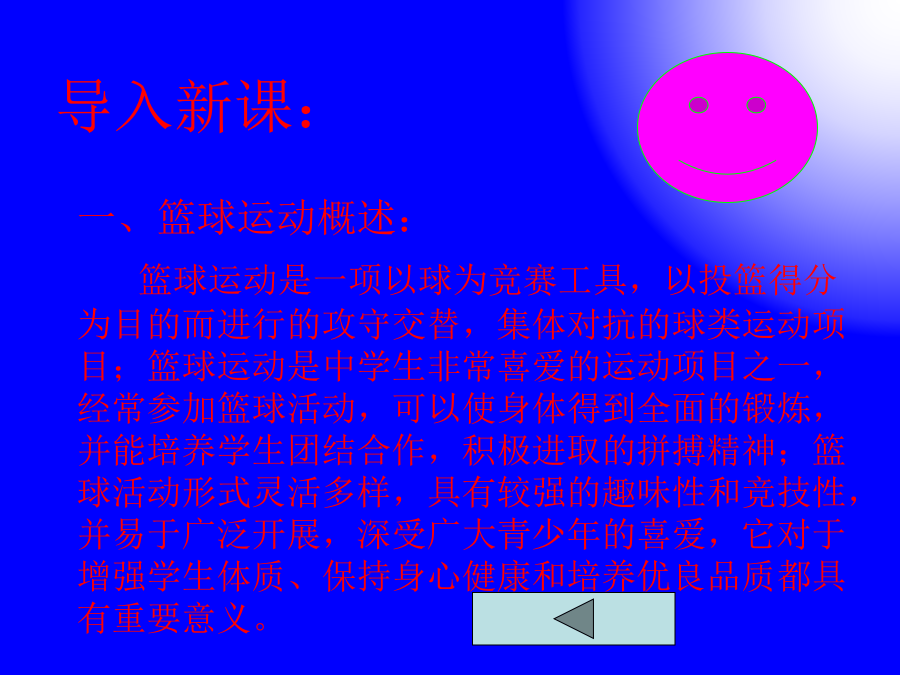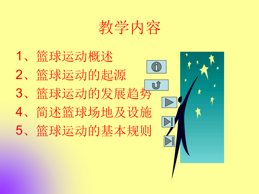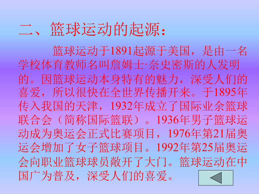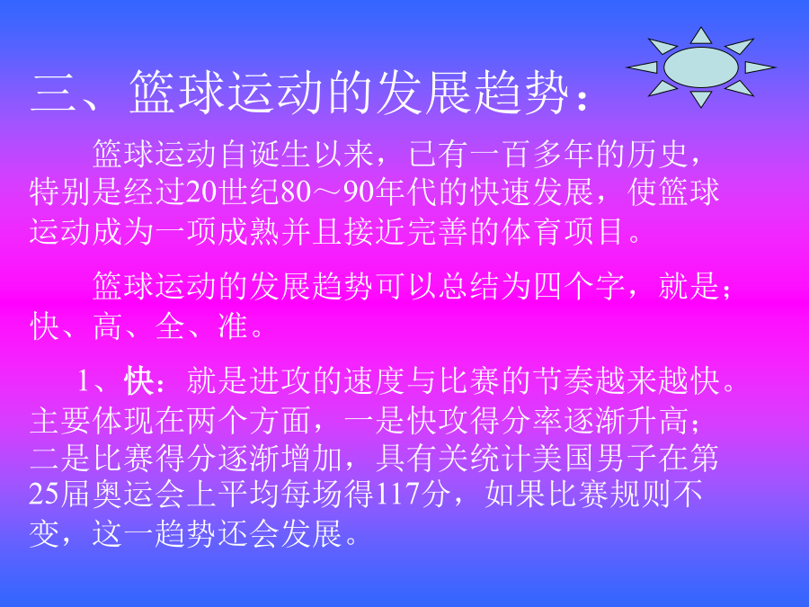 篮球理论知识教学内容导入新课:二、篮球运动的起源: 篮球运动于1891起源于美国,是由一名学校体育教师名叫詹姆士·奈史密斯的人发明的。因篮球运动本身特有的魅力,深受人们的喜爱,所以很快在全世界传播开来。于1895年传入我国的天津,1932年成立了国际业余篮球联合会(简称国际篮联)。1936年男子篮球运动成为奥运会正式比赛项目,1976年第21届奥运会增加了女子篮球项目。1992年第25届奥运会向职业篮球球员敞开了大门。篮球运动在中国广为普及,深受人们的喜爱。三、篮球运动的发展趋势: 篮球运动自诞生以来,已有一百多年的历史,特别是经过20世纪80~90年代的快速发展,使篮球运动成为一项成熟并且接近完善的体育项目。 篮球运动的发展趋势可以总结为四个字,就是;快、高、全、准。 1、快:就是进攻的速度与比赛的节奏越来越快。主要体现在两个方面,一是快攻得分率逐渐升高;二是比赛得分逐渐增加,具有关统计美国男子在第25届奥运会上平均每场得117分,如果比赛规则不变,这一趋势还会发展。 2、高:就是比赛双方争夺的高度越来越高。目前高水平的比赛争夺高度已达到3.5米以上;主要体现在队员的身材高和弹跳力好;随着选材的科学化和早期专业化训练,这一趋势还将进一步发展。 3、全:全队的配置和个人的素质、技术越来越全面。全队的全面是指全队队员的实力平均,比赛时可以频繁换人而不影响进攻和防守的水平;个人的全面是指队员具有全面的身体素质和各种位置的攻守、战术,比赛打破了位置的界限,使战术配合更灵活,实战效果更好。 4、准:主要表现在投篮的准确性。随着篮球运动的发展,比赛时投篮命中率在不断地增长。 四、简述篮球场地及设施:五、篮球基本规则(包括违例和犯规) 1、违例:违反规则但未能造成犯规的行为叫违例。,(或者说,这种违反规则的行为是与对方没有发生身体接触和不包含有不道德行为的,叫违例)。罚则是发生违例的队失去球权。违例的种类有:⑴走步;⑵两次运球;⑶脚踢球;⑷球回后场;⑸使球出界;⑹罚球违例;⑺跳球违例;⑻违反时间方面的违例等等。(违反时间的违例有:3秒违例,5秒违例,8秒违例,24秒违例四种情况。 2、犯规:犯规是违反规则的行为,含有身体接触和不道德的举止。罚则是对犯规对员进行登记,并按照规则的有关条款进行处罚。犯规共分两大类:一种是侵人犯规;另一种是技术犯规。㈠、侵人犯规:侵人犯规是一种与对方发生身体接触的队员犯规,但队员发生了身体接触冻一定是侵人犯规。侵人犯规有:一般性经常发生的犯规;故意犯规;取消比赛资格的犯规;双方犯规;聚众犯规;双方犯规和另一起犯规;特殊情况下的犯规共有七种。 ㈡、技术犯规:两个比赛队的成员都必须遵守比赛规则,服从裁判,发扬优良的道德作风,积极地与裁判员密切合作,保证比赛顺利进行,以最大的努力打出风格、打出水平。双方在比赛中如故意或连续违反上述精神,应视为技术犯规。技术犯规有场上队员的犯规、教练员的技术犯规、替补队员的技术犯规。罚则是:凡属技术犯规,裁判员应按规则的规定严格要求,根据场上队员和教练员或替补队员的行为,视其有意或无意、严重程度,本着教育为主,分别进行劝告、提醒、警告、判罚,直到取消比赛资格。 六、作业布置:画一个篮球场