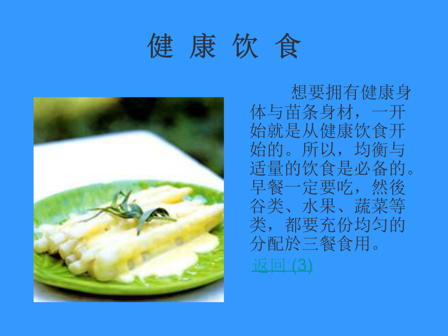 体育与健康课课件健康塑身饮食规则守则(首叶)健康饮食加速身体代谢的循环少量多餐适量的运动每天早睡早起吃东西避免盐份的摄取每天摄取足够的水谢谢!