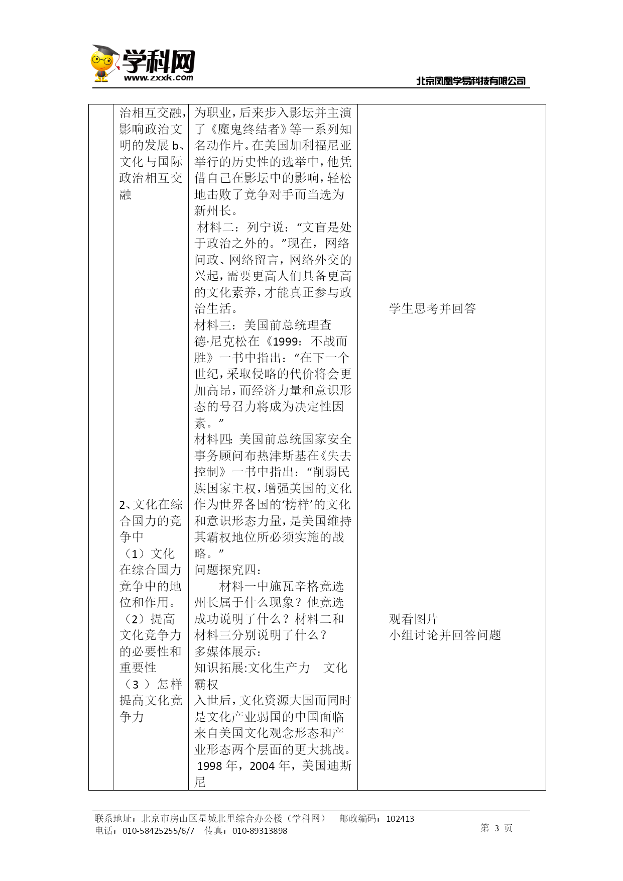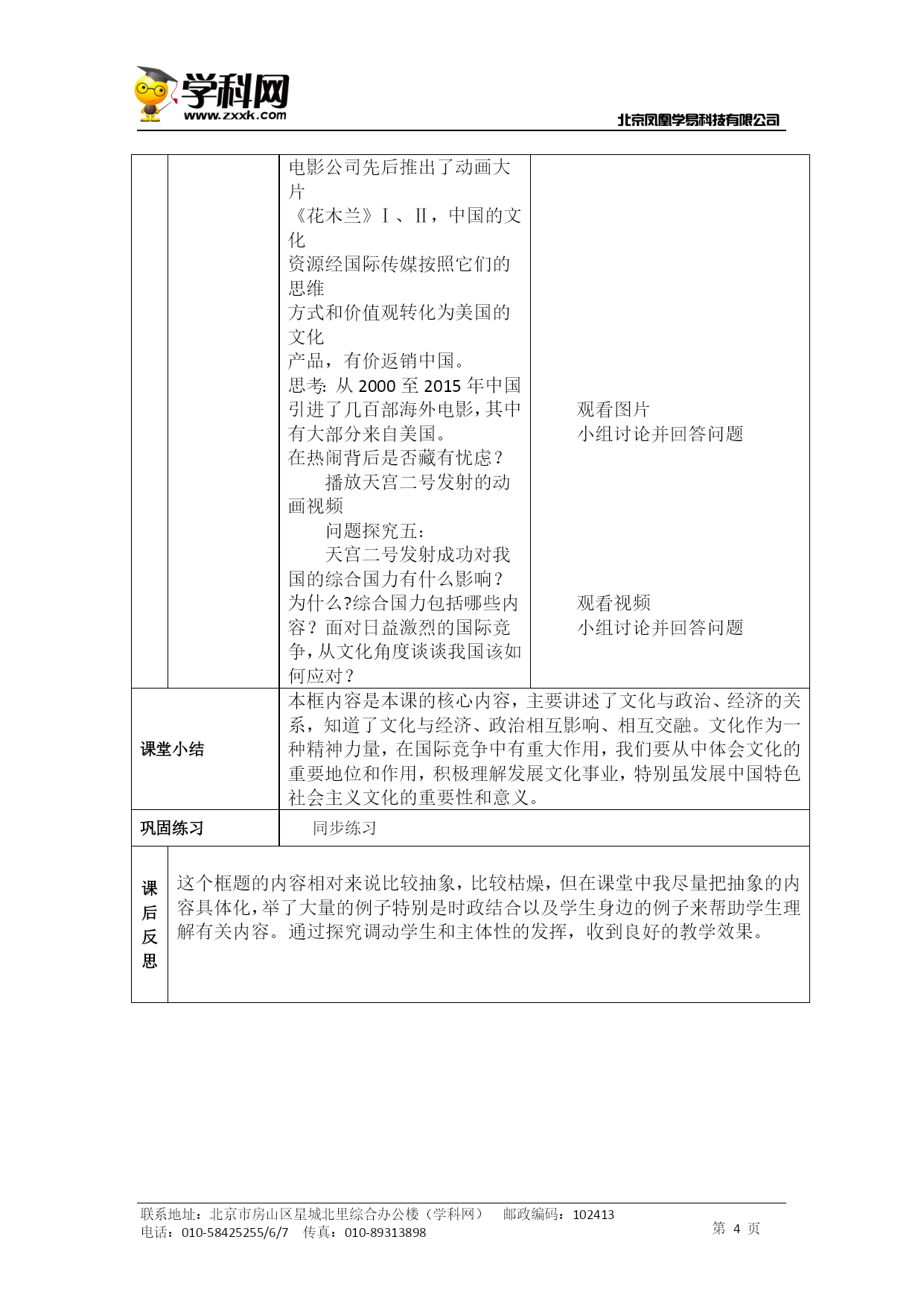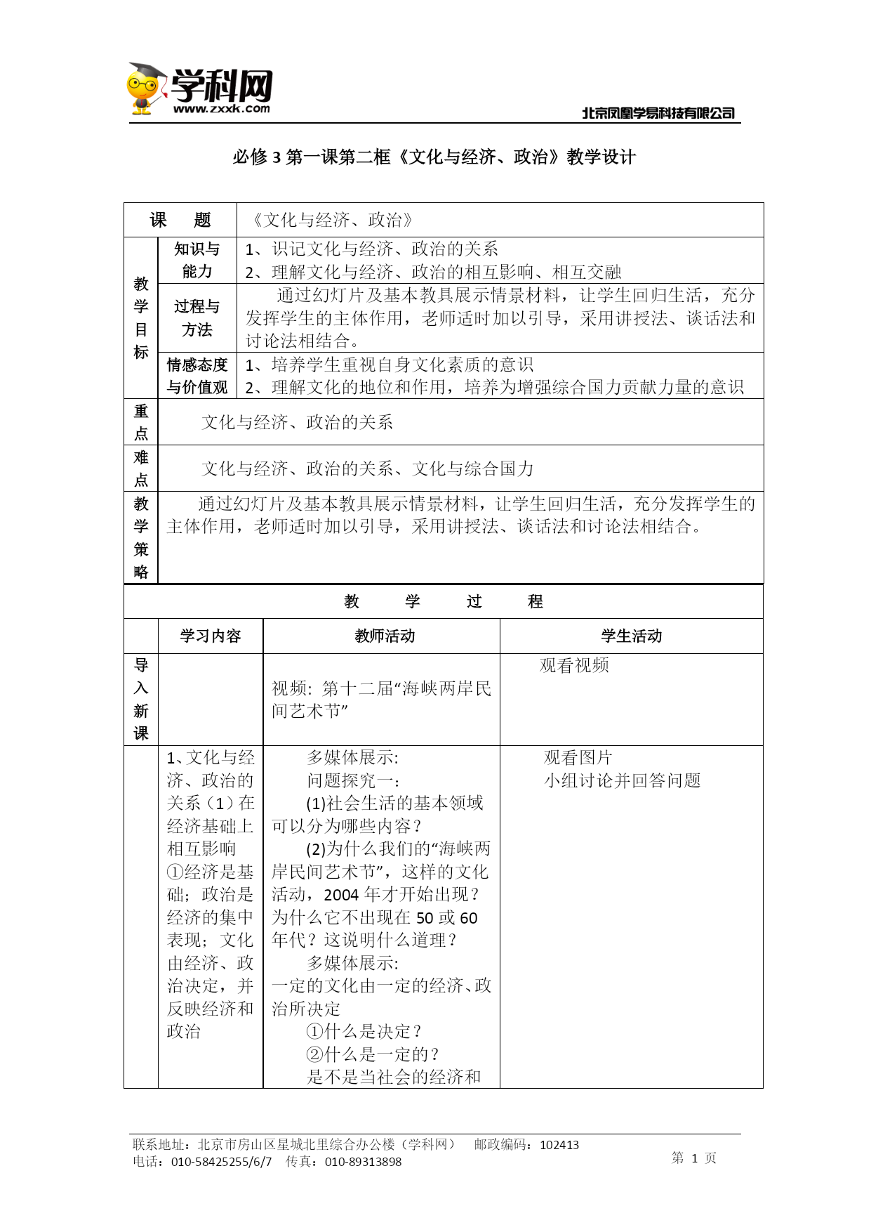 第PAGE\*MERGEFORMAT4页 联系地址:北京市房山区星城北里综合办公楼(学科网)邮政编码:102413 电话:010-58425255/6/7传真:010-89313898 课题《文化与经济、政治》教学目标知识与 能力1、识记文化与经济、政治的关系2、理解文化与经济、政治的相互影响、相互交融过程与 方法通过幻灯片及基本教具展示情景材料,让学生回归生活,充分发挥学生的主体作用,老师适时加以引导,采用讲授法、谈话法和讨论法相结合。情感态度 与价值观1、培养学生重视自身文化素质的意识2、理解文化的地位和作用,培养为增强综合国力贡献力量的意识重点文化与经济、政治的关系难点文化与经济、政治的关系、文化与综合国力教学策略通过幻灯片及基本教具展示情景材料,让学生回归生活,充分发挥学生的主体作用,老师适时加以引导,采用讲授法、谈话法和讨论法相结合。必修3第一课第二框《文化与经济、政治》教学设计 教学过程学习内容教师活动学生活动导 入 新 课视频:第十二届“海峡两岸民间艺术节”观看视频 导 学 新 课 1、文化与经济、政治的关系(1)在经济基础上相互影响 ①经济是基础;政治是经济的集中表现;文化由经济、政治决定,并反映经济和政治 ②文化反作用于经济、政治,给经济、政治重大影响 (2)在时代发展的进程中互相交融 ①文化与经济相互交融(经济文化化、文化经济化) ②文化与政治相互交融(政治文化化、文化政治化) 表现:a、文化与民主政治相互交融,影响政治文明的发展b、文化与国际政治相互交融 2、文化在综合国力的竞争中 (1)文化在综合国力竞争中的地位和作用。 (2)提高文化竞争力的必要性和重要性 (3)怎样提高文化竞争力 多媒体展示: 问题探究一: (1)社会生活的基本领域可以分为哪些内容? (2)为什么我们的“海峡两岸民间艺术节”,这样的文化活动,2004年才开始出现?为什么它不出现在50或60年代?这说明什么道理? 多媒体展示: 一定的文化由一定的经济、政治所决定 ①什么是决定? ②什么是一定的? 是不是当社会的经济和政治制度一旦发生变化,文化也会随即产生变化?为什么? 问题探究二 议一议:管子曰:“仓廪实而知礼节,衣食足而知荣辱。”因此,经济发展了,文化必然就发展了。这种说法对吗? 多媒体展示: 问题探究三 我们为什么要举办“艺术节”,这样的文化活动?这是不是亏本生意? 点评:中国的发展深受儒家文化的影响,西方的发展深受文艺复兴运动的影响。今天,中国特色的社会主义文化为我国社会主义事业的发展提供了强大的精神动力和智力支持。 小结:要求学生用图表的方式把文化与经济、政治的相互影响关系写出来。 多媒体展示:两种关系图 多媒体展示: 1、资源争夺由“物”转为“人才”的争夺 2、我县连天红古典家具征对联 上联:仙游仙游骑石马看HYPERLINK"http://shop.jiatx.com/jiaju/productlist_1______________/"\t"_blank"家具 横批:连天红 参考下联一:福建福建访莆仙拜天后 参考下联二:福建福建请妈祖梦九鲤 3、第八届海峡两岸文化产业博览交易会 多媒体展示: 材料一:共和党候选人施瓦辛格出生在奥地利,原先以健美为职业,后来步入影坛并主演了《魔鬼终结者》等一系列知名动作片。在美国加利福尼亚举行的历史性的选举中,他凭借自己在影坛中的影响,轻松地击败了竞争对手而当选为新州长。 材料二:列宁说:“文盲是处于政治之外的。”现在,网络问政、网络留言,网络外交的兴起,需要更高人们具备更高的文化素养,才能真正参与政治生活。 材料三:美国前总统理查德·尼克松在《1999:不战而胜》一书中指出:“在下一个世纪,采取侵略的代价将会更加高昂,而经济力量和意识形态的号召力将成为决定性因素。” 材料四:美国前总统国家安全事务顾问布热津斯基在《失去控制》一书中指出:“削弱民族国家主权,增强美国的文化作为世界各国的‘榜样’的文化和意识形态力量,是美国维持其霸权地位所必须实施的战略。” 问题探究四: 材料一中施瓦辛格竞选州长属于什么现象?他竞选成功说明了什么?材料二和材料三分别说明了什么? 多媒体展示: 知识拓展:文化生产力文化霸权 入世后,文化资源大国而同时是文化产业弱国的中国面临来自美国文化观念形态和产业形态两个层面的更大挑战。 1998年,2004年,美国迪斯尼 电影公司先后推出了动画大片 《花木兰》Ⅰ、Ⅱ,中国的文化 资源经国际传媒按照它们的思维 方式和价值观转化为美国的文化 产品,有价返销中国。 思考:从2000至2015年中国引进了几百部海外电影,其