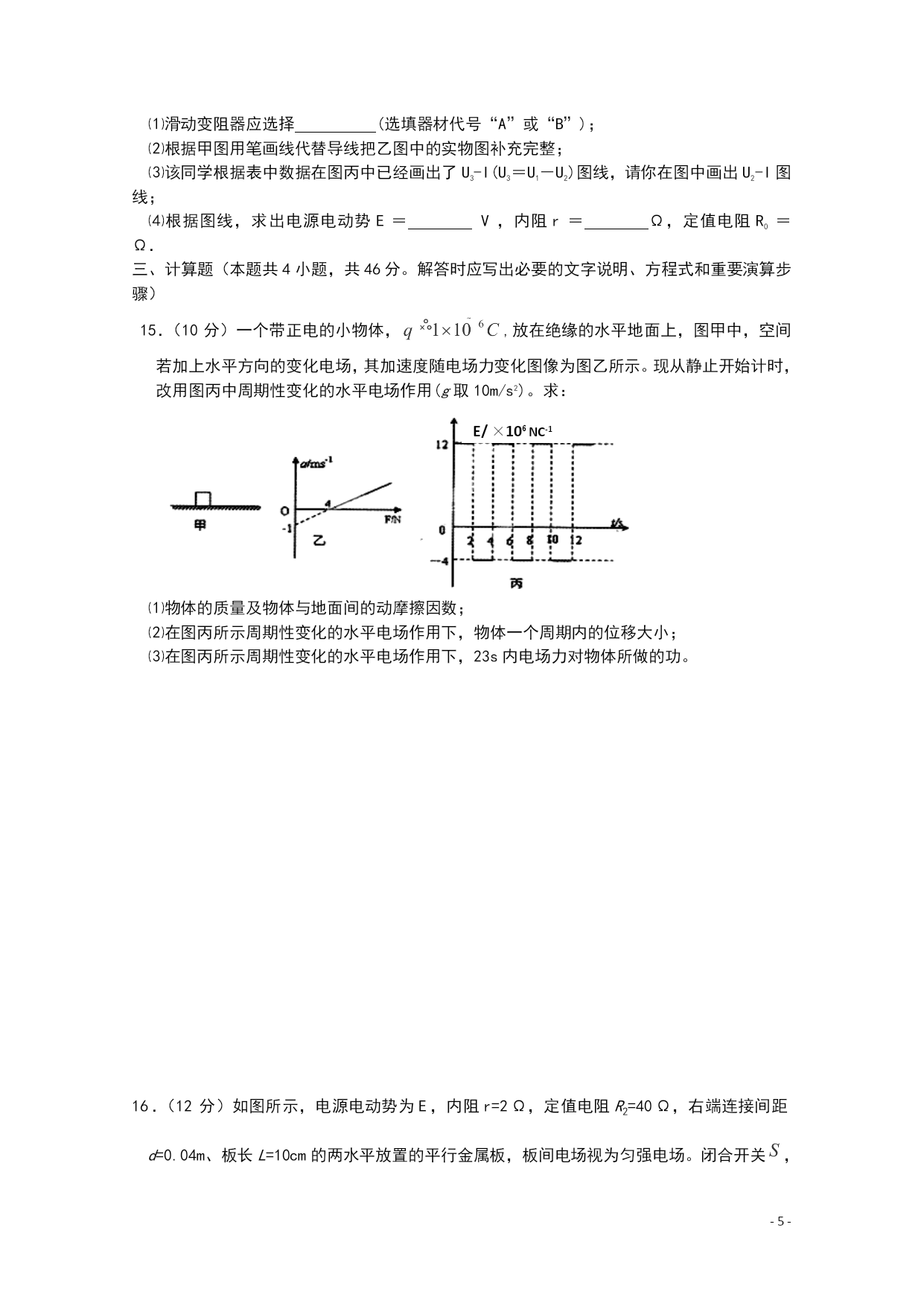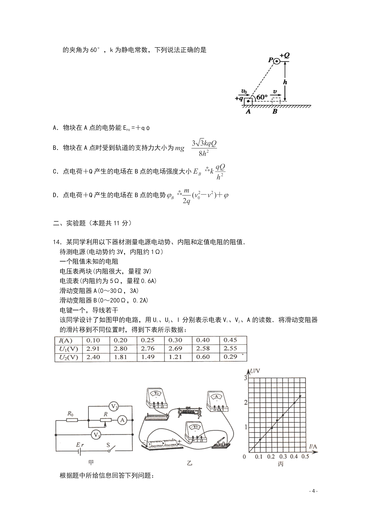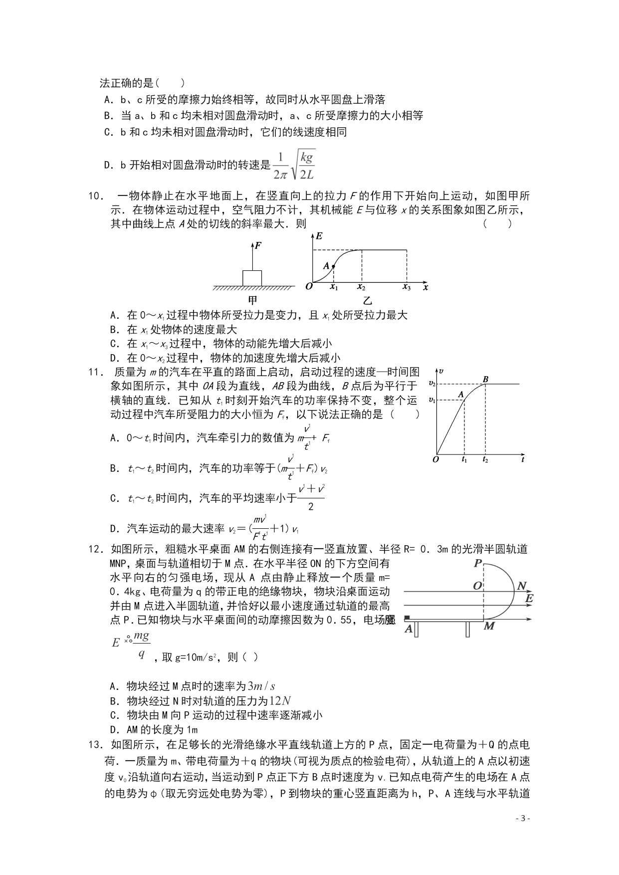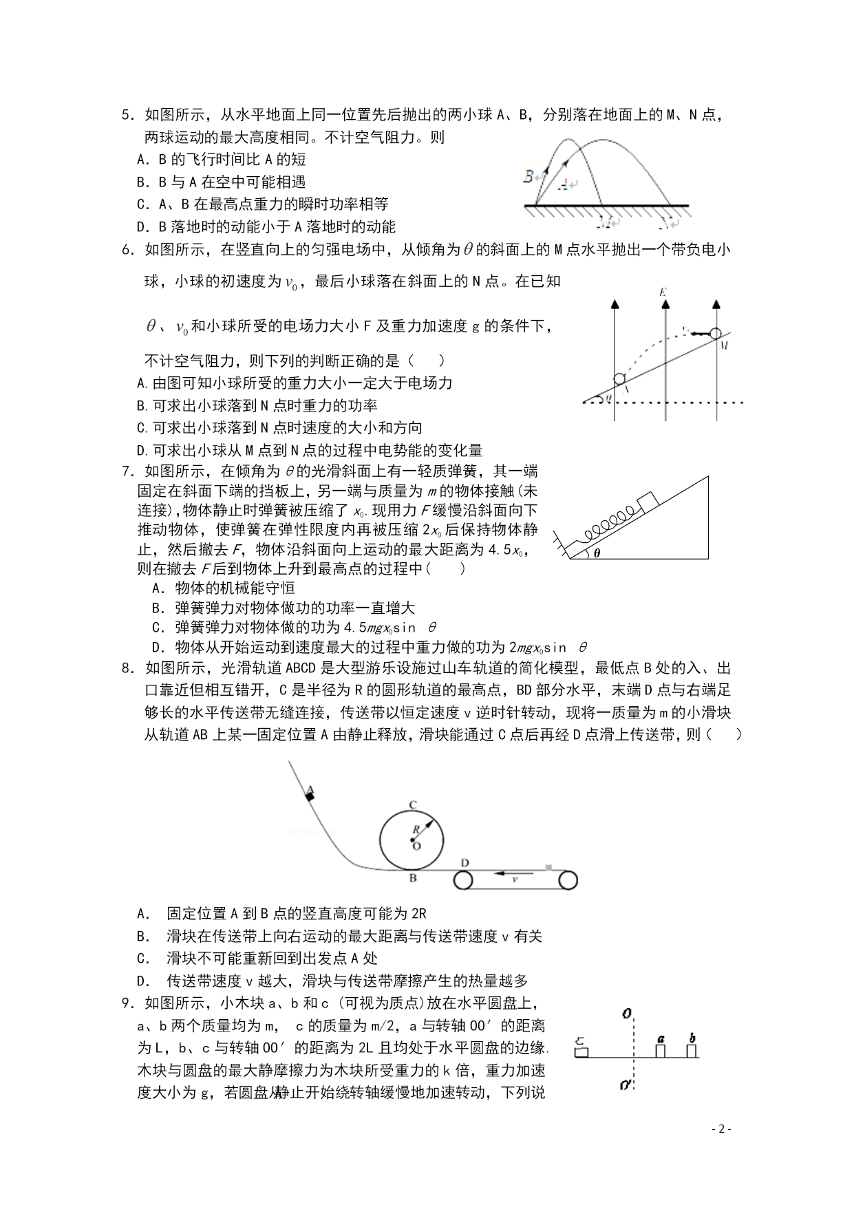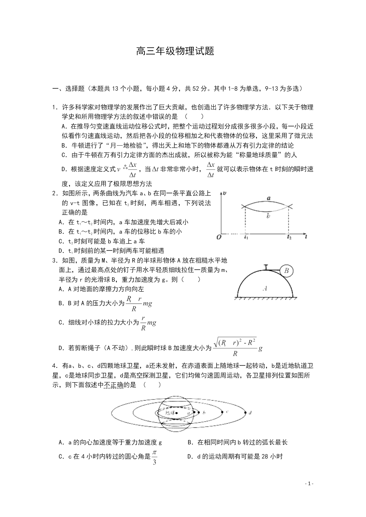 PAGE-8- 高三年级物理试题 一、选择题(本题共13个小题,每小题4分,共52分。其中1-8为单选,9-13为多选) 1.许多科学家对物理学的发展作出了巨大贡献,也创造出了许多物理学方法.以下关于物理学史和所用物理学方法的叙述中错误的是 () A.在推导匀变速直线运动位移公式时,把整个运动过程划分成很多很多小段,每一小段近似看作匀速直线运动,然后把各小段的位移相加之和代表物体的位移,这里采用了微元法 B.牛顿进行了“月—地检验”,得出天上和地下的物体都遵从万有引力定律的结论 C.由于牛顿在万有引力定律方面的杰出成就,所以被称为能“称量地球质量”的人 D.根据速度定义式,当非常非常小时,就可以表示物体在t时刻的瞬时速度,该定义应用了极限思想方法 2.如图所示,两条曲线为汽车a、b在同一条平直公路上的v-t图像,已知在t2时刻,两车相遇,下列说法正确的是 A.在t1~t2时间内,a车加速度先增大后减小 B.在t1~t2时间内,a车的位移比b车的小 C.t2时刻可能是b车追上a车 D.t1时刻前的某一时刻两车可能相遇 3.如图,质量为M、半径为R的半球形物体A放在粗糙水平地面上,通过最高点处的钉子用水平轻质细线拉住一质量为m、半径为r的光滑球B,重力加速度为g。则() A.A对地面的摩擦力方向向左 B.B对A的压力大小为 C.细线对小球的拉力大小为 D.若剪断绳子(A不动),则此瞬时球B加速度大小为 4.有a、b、c、d四颗地球卫星,a还未发射,在赤道表面上随地球一起转动,b是近地轨道卫星,c是地球同步卫星,d是高空探测卫星,它们均做匀速圆周运动,各卫星排列位置如图所示,则下面叙述中不正确的是() A.a的向心加速度等于重力加速度gB.在相同时间内b转过的弧长最长 C.c在4小时内转过的圆心角是D.d的运动周期有可能是28小时 5.如图所示,从水平地面上同一位置先后抛出的两小球A、B,分别落在地面上的M、N点,两球运动的最大高度相同。不计空气阻力。则 A.B的飞行时间比A的短 B.B与A在空中可能相遇 C.A、B在最高点重力的瞬时功率相等 D.B落地时的动能小于A落地时的动能 6.如图所示,在竖直向上的匀强电场中,从倾角为的斜面上的M点水平抛出一个带负电小球,小球的初速度为,最后小球落在斜面上的N点。在已知、和小球所受的电场力大小F及重力加速度g的条件下,不计空气阻力,则下列的判断正确的是() A.由图可知小球所受的重力大小一定大于电场力 B.可求出小球落到N点时重力的功率 C.可求出小球落到N点时速度的大小和方向 D.可求出小球从M点到N点的过程中电势能的变化量 7.如图所示,在倾角为θ的光滑斜面上有一轻质弹簧,其一端固定在斜面下端的挡板上,另一端与质量为m的物体接触(未连接),物体静止时弹簧被压缩了x0.现用力F缓慢沿斜面向下推动物体,使弹簧在弹性限度内再被压缩2x0后保持物体静止,然后撤去F,物体沿斜面向上运动的最大距离为4.5x0,则在撤去F后到物体上升到最高点的过程中 () A.物体的机械能守恒 B.弹簧弹力对物体做功的功率一直增大 C.弹簧弹力对物体做的功为4.5mgx0sinθ D.物体从开始运动到速度最大的过程中重力做的功为2mgx0sinθ 8.如图所示,光滑轨道ABCD是大型游乐设施过山车轨道的简化模型,最低点B处的入、出口靠近但相互错开,C是半径为R的圆形轨道的最高点,BD部分水平,末端D点与右端足够长的水平传送带无缝连接,传送带以恒定速度v逆时针转动,现将一质量为m的小滑块从轨道AB上某一固定位置A由静止释放,滑块能通过C点后再经D点滑上传送带,则() A.固定位置A到B点的竖直高度可能为2R B.滑块在传送带上向右运动的最大距离与传送带速度v有关 C.滑块不可能重新回到出发点A处 D.传送带速度v越大,滑块与传送带摩擦产生的热量越多 9.如图所示,小木块a、b和c(可视为质点)放在水平圆盘上,a、b两个质量均为m,c的质量为m/2,a与转轴OO′的距离为L,b、c与转轴OO′的距离为2L且均处于水平圆盘的边缘.木块与圆盘的最大静摩擦力为木块所受重力的k倍,重力加速度大小为g,若圆盘从静止开始绕转轴缓慢地加速转动,下列说法正确的是() A.b、c所受的摩擦力始终相等,故同时从水平圆盘上滑落 B.当a、b和c均未相对圆盘滑动时,a、c所受摩擦力的大小相等 C.b和c均未相对圆盘滑动时,它们的线速度相同 D.b开始相对圆盘滑动时的转速是 10.一物体静止在水平地面上,在竖直向上的拉力F的作用下开始向上运动,如图甲所示.在物体运动过程中,空气阻力不计,其机械能E与位移x的关系图象如图乙所示,其中曲线上点A处的切线的斜率最大.则 () A.在0~x1过程中物体所受拉力是变力,