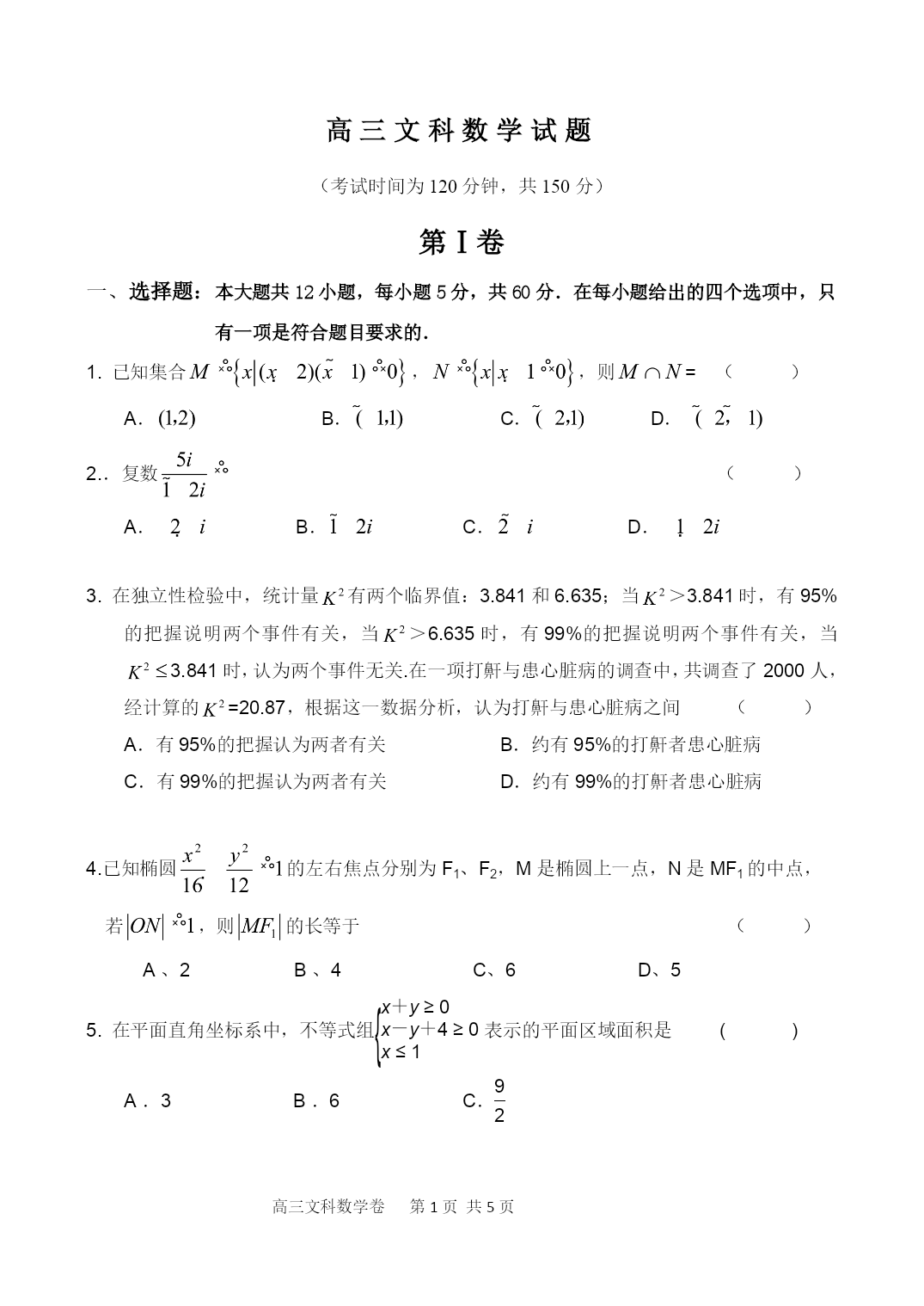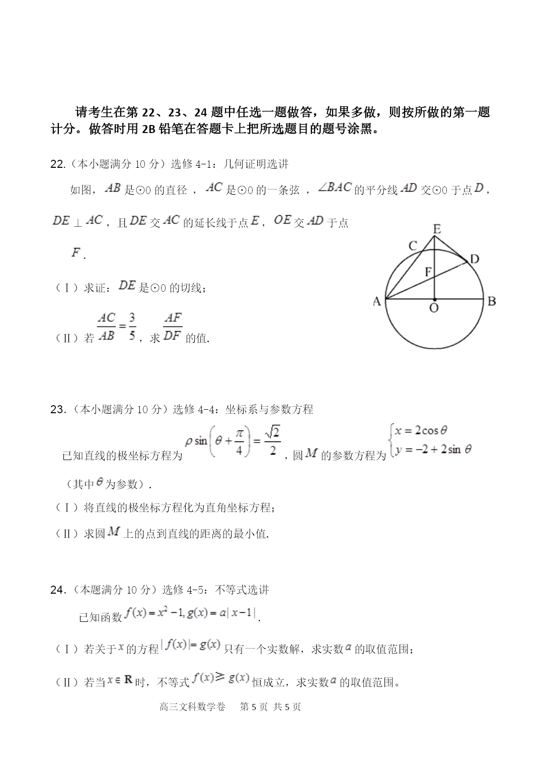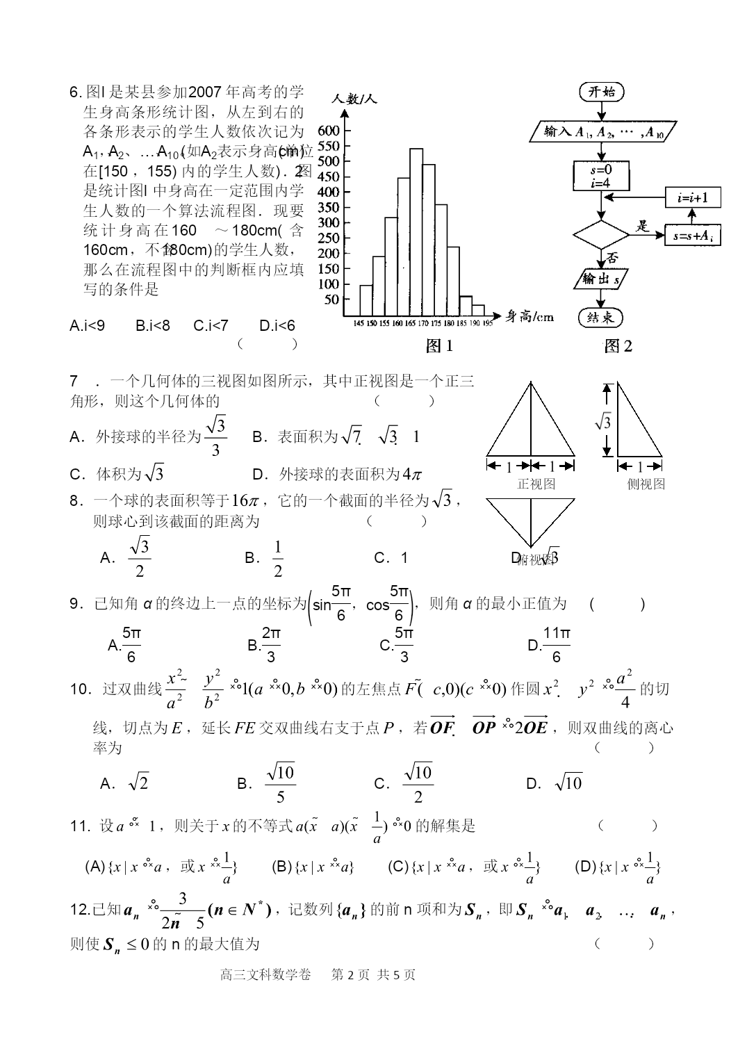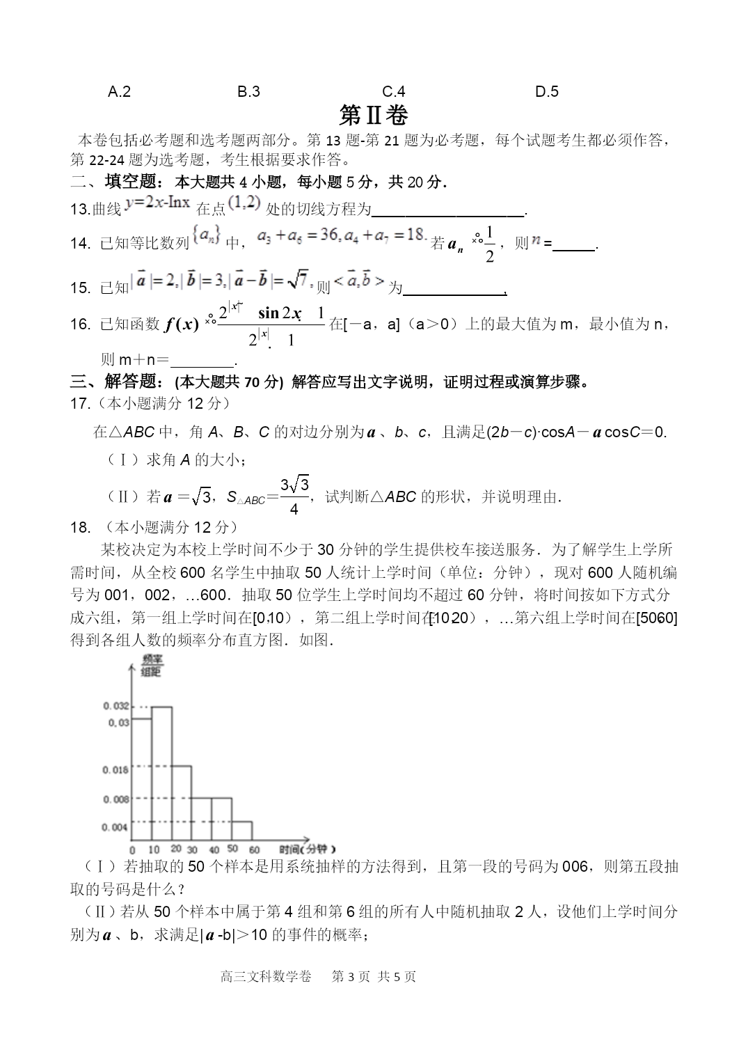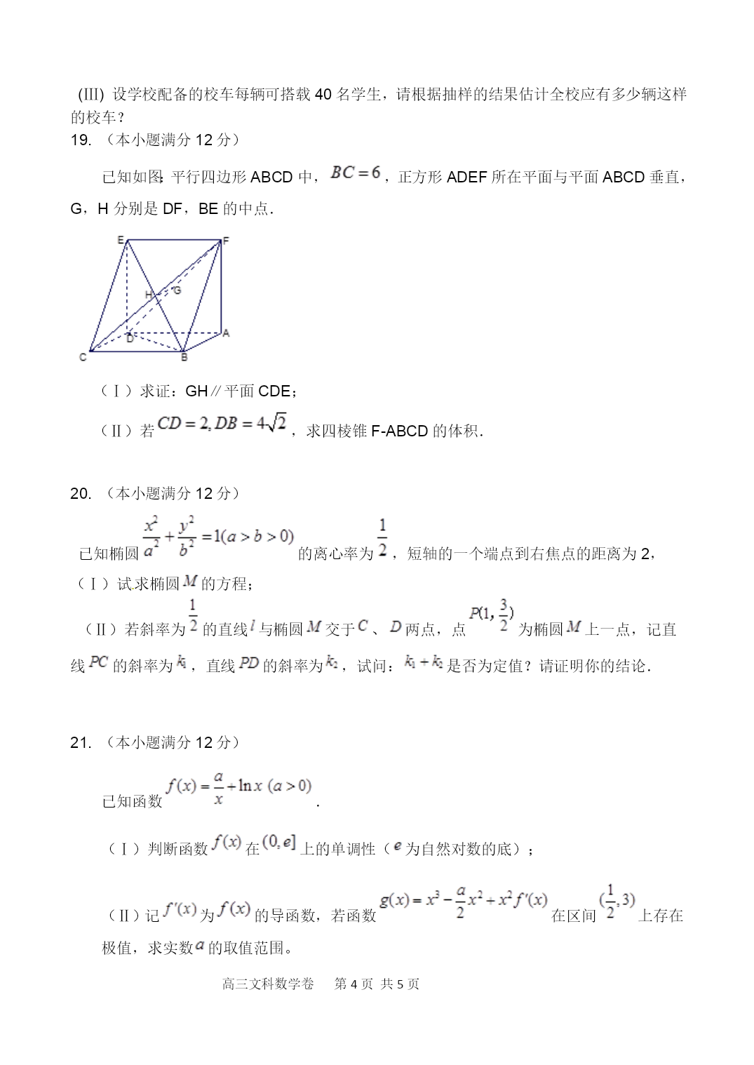 第页 高三文科数学卷 高三文科数学试题 (考试时间为120分钟,共150分) 第Ⅰ卷 一、选择题:本大题共12小题,每小题5分,共60分.在每小题给出的四个选项中,只有一项是符合题目要求的. 1.已知集合,,则=() A. B. C. D. 2..复数() A. B. C. D. 3.在独立性检验中,统计量有两个临界值:3.841和6.635;当>3.841时,有95%的把握说明两个事件有关,当>6.635时,有99%的把握说明两个事件有关,当3.841时,认为两个事件无关.在一项打鼾与患心脏病的调查中,共调查了2000人,经计算的=20.87,根据这一数据分析,认为打鼾与患心脏病之间() A.有95%的把握认为两者有关 B.约有95%的打鼾者患心脏病 C.有99%的把握认为两者有关 D.约有99%的打鼾者患心脏病 4.已知椭圆的左右焦点分别为F1、F2,M是椭圆上一点,N是MF1的中点, 若,则的长等于() A、2B、4C、6D、5 5.在平面直角坐标系中,不等式组eq\b\lc\{\rc\(\a\vs4\al\co1(x+y≥0,x-y+4≥0,x≤1))表示的平面区域面积是() A.3B.6C.eq\f(9,2) D.9 6.图l是某县参加2007年高考的学生身高条形统计图,从左到右的各条形表示的学生人数依次记为A1,、A2、…、A10。(如A2表示身高(单位:cm)在[150,155)内的学生人数).图2是统计图l中身高在一定范围内学生人数的一个算法流程图.现要统计身高在160~180cm(含160cm,不含180cm)的学生人数,那么在流程图中的判断框内应填写的条件是 A.i<9B.i<8C.i<7D.i<6 () 正视图 侧视图 俯视图 7.一个几何体的三视图如图所示,其中正视图是一个正三角形,则这个几何体的() A.外接球的半径为 B.表面积为 C.体积为 D.外接球的表面积为 8.一个球的表面积等于,它的一个截面的半径为, 则球心到该截面的距离为() A. B. C.1 D. 9.已知角α的终边上一点的坐标为eq\b\lc\(\rc\)(\a\vs4\al\co1(sin\f(5π,6),cos\f(5π,6))),则角α的最小正值为() A.eq\f(5π,6)B.eq\f(2π,3)C.eq\f(5π,3)D.eq\f(11π,6) 10.过双曲线的左焦点作圆的切线,切点为,延长交双曲线右支于点,若,则双曲线的离心率为() A. B. C. D. 11.设,则关于的不等式的解集是() (A),或(B)(C),或(D) 12.已知,记数列的前n项和为,即,则使的n的最大值为() A.2B.3C.4D.5 第Ⅱ卷 本卷包括必考题和选考题两部分。第13题-第21题为必考题,每个试题考生都必须作答,第22-24题为选考题,考生根据要求作答。 二、填空题:本大题共4小题,每小题5分,共20分. 13.曲线在点处的切线方程为__________________. 14.已知等比数列中,若,则=. 15.已知则为________, 16.已知函数在[-a,a](a>0)上的最大值为m,最小值为n,则m+n=. 三、解答题:(本大题共70分)解答应写出文字说明,证明过程或演算步骤。 17.(本小题满分12分) 在△ABC中,角A、B、C的对边分别为、b、c,且满足(2b-c)·cosA-cosC=0. (Ⅰ)求角A的大小; (Ⅱ)若=eq\r(3),S△ABC=eq\f(3\r(3),4),试判断△ABC的形状,并说明理由. 18.(本小题满分12分) 某校决定为本校上学时间不少于30分钟的学生提供校车接送服务.为了解学生上学所需时间,从全校600名学生中抽取50人统计上学时间(单位:分钟),现对600人随机编号为001,002,…600.抽取50位学生上学时间均不超过60分钟,将时间按如下方式分成六组,第一组上学时间在[0,10),第二组上学时间在[10,20),…第六组上学时间在[50,60]得到各组人数的频率分布直方图.如图. (Ⅰ)若抽取的50个样本是用系统抽样的方法得到,且第一段的号码为006,则第五段抽取的号码是什么? (Ⅱ)若从50个样本中属于第4组和第6组的所有人中随机抽取2人,设他们上学时间分别为、b,求满足|-b|>10的事件的概率; (Ⅲ)设学校配备的校车每辆可搭载40名学生,请根据抽样的结果估计全校应有多少辆这样的校车? 19.(本小题满分12分) 已知如图:平行四边形ABCD中,,正方形ADEF所在平面与平面ABCD垂直,G,H分别是DF,BE的中点. (Ⅰ)求证:GH∥平面CDE; (Ⅱ)若,求四棱锥F-ABC