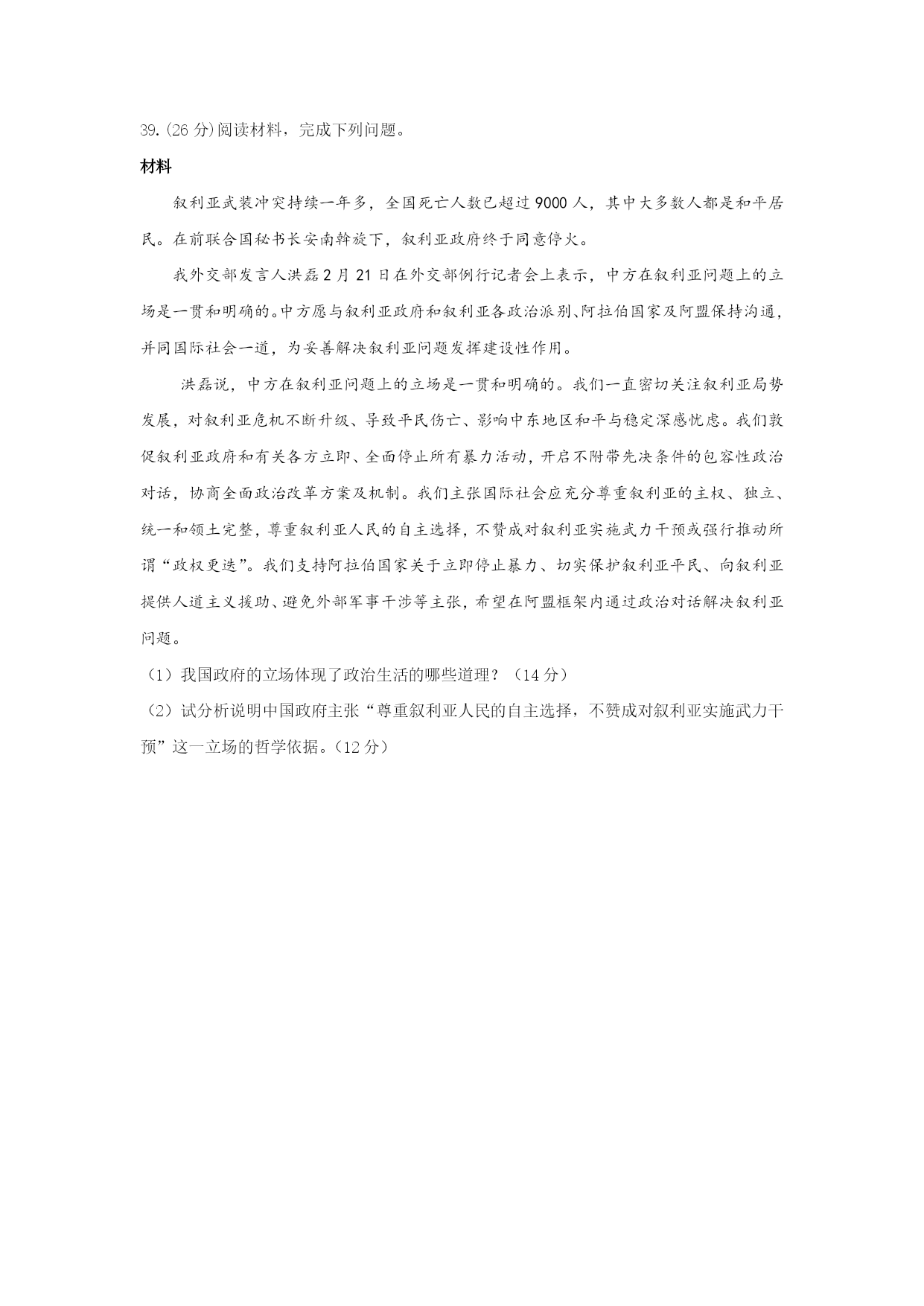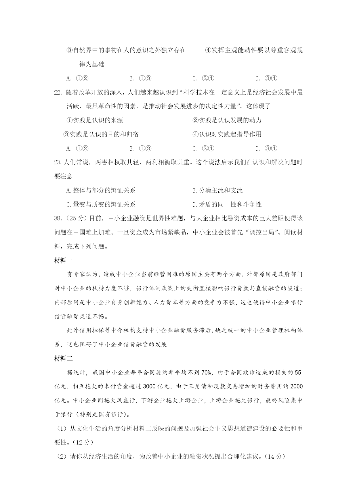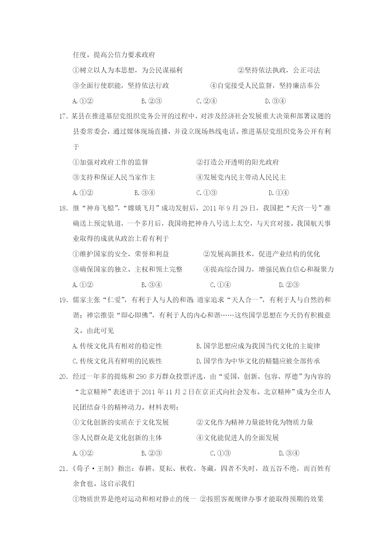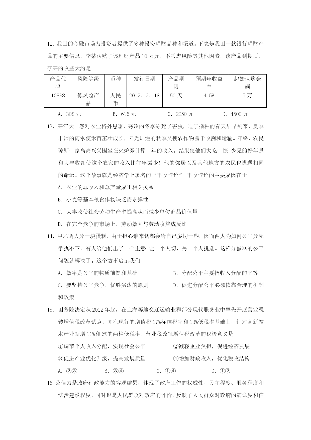 12.我国的金融市场为投资者提供了多种投资理财品种和渠道。下表是我国一款银行理财产品的主要信息。李某认购了该理财产品10万元,不考虑风险等其他因素,该产品到期后,李某的收益大约是 产品代码风险等级币种发行日期产品期限预期年收益率起始认购金额10888低风险产品人民币2012.2.1850天4.5%5万A.308元 B.616元 C.2250元 D.4500元 13.某年大自然对农业格外恩惠,寒冷的冬季冻死了害虫,适于播种的春天早早到来,夏季丰沛的雨水使禾苗茁壮成长,阳光灿烂的秋季又使农作物易于收割和运输。年终,农民琼斯一家高高兴兴围坐在火炉旁计算一年的收入。结果使他们大吃一惊:少见的好年景和大丰收却使这个农家的收入比往年减少!他的邻居以及其他地方的农民也遭遇相同的命运。这个故事就是经济学上著名的“丰收悖论”。丰收悖论的主要成因在于 A.农业的总收入和总产量成正相关关系 B.小麦等基本粮食作物缺乏需求弹性 C.大丰收使社会劳动生产率提高从而减少单位商品价值量 D.在完全竞争的市场上,劳动效率与劳动收益成反比 14.甲乙两人分一块蛋糕,由于担心谁来切都会给自己多切一些,因而两人为如何公平分配争执不下。有人给他们出了一个主意:让一个人切,另一个人挑选。这样分蛋糕的公平问题就解决了。这个故事启示我们 A.效率是公平的物质前提和基础B.分配公平主要指收入分配的平等 C.要坚持公平竞争、优胜劣汰的原则D.促进分配公平必须依靠合理的机制和政策 15.国务院决定从2012年起,在上海等地交通运输业和部分现代服务业中率先开展营业税转增值税改革试点,并在现行的增值税17%标准税率和13%低税率基础上,针对高新技术产业新增11%和6%的两档低税率。营业税改征增值税改革的积极意义是 ①调节个人收入分配,实现社会公平②减轻企业负担,促进经济发展 ③促进产业优化升级,提高发展质量④增加财政收入,优化税收结构 A.②③ B.③④ C.①④ D.①② 16.公信力是政府行政能力的客观结果,体现了政府工作的权威性、民主程度、服务程度和法治建设程度,同时也是人民群众对政府的评价,反映了人民群众对政府的满意度和信任度。提高公信力要求政府 ①树立以人为本思想,为公民谋福利 ②坚持依法执政,公正司法 ③全面行使职能,坚持依法行政 ④自觉接受人民监督,坚持廉洁奉公 A.①② B.②③ C.②④ D.③④ 17.某县在推进基层党组织党务公开的过程中,对涉及经济社会发展重大决策和部署议题的县委常委会,通过媒体现场直播,并设立现场热线电话。推进基层党组织党务公开有利于 ①加强对政府工作的监督②打造公开透明的阳光政府 ③支持和保证人民当家作主④发展党内民主带动人民民主 A.①②B.③④C.①③ D.①④ 18.继“神舟飞船”,“嫦娥飞月”成功发射后,2011年9月29日,我国把“天宫一号”准确送上预定轨道,一个多月后,我国将把神舟八号送上太空,与天宫对接。我国航天事业取得的成就从政治上看有利于 ①维护国家的安全、荣誉和利益②发展高新技术,促进产业结构的优化 ③确保国家的独立、主权和领土完整④提高综合国力,增强民族自信心和凝聚力 A.①② B.③④ C.①④ D.②③ 19.儒家主张“仁爱”,有利于人与人的和谐;道家追求“天人合一”,有利于人与自然的和谐;禅宗推崇“即心即佛”,有利于人的内心和谐……这些国学思想在今天仍有积极意义。由此可见 A.传统文化具有相对的稳定性B.国学思想应成为我国当代文化的主旋律 C.传统文化具有鲜明的民族性D.国学作为中华文化的精髓应被全部传承 20.经过一年多的提炼和290多万群众投票评选,由“爱国、创新、包容、厚德”为内容的“北京精神”表述语于2011年11月2日在京正式向社会发布。北京精神”成为全市人民团结奋斗的精神动力。材料表明: ①文化创新的实质在于文化发展 ②文化作为精神力量能转化为物质力量 ③人民群众是文化创新的主体 ④文化能促进人的全面发展 A.①② B.②③ C.①③ D.③④ 21.《荀子·王制》指出:春耕、夏耘、秋收、冬藏,四者不失时,故五谷不绝,而百姓有余食也。这启示我们 ①物质世界是绝对运动和相对静止的统一②按照客观规律办事才能取得预期的效果 ③自然界中的事物在人的意识之外独立存在 ④发挥主观能动性要以尊重客观规律为基础 A.①② B.①③ C.②④ D.③④ 22.随着改革开放的深入,人们越来越认识到“科学技术在一定意义上是经济社会发展中最活跃、最具革命性的因素,是推动社会发展进步的决定性力量”。这体现了 ①实践是认识的来源 ②实践是认识发展的动力 ③实践是认识的目的和归宿 ④认识对实践起指导作用 A.①
