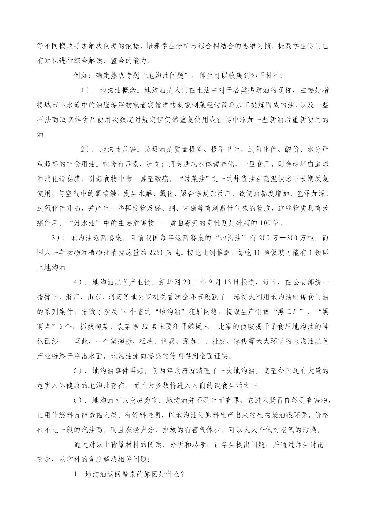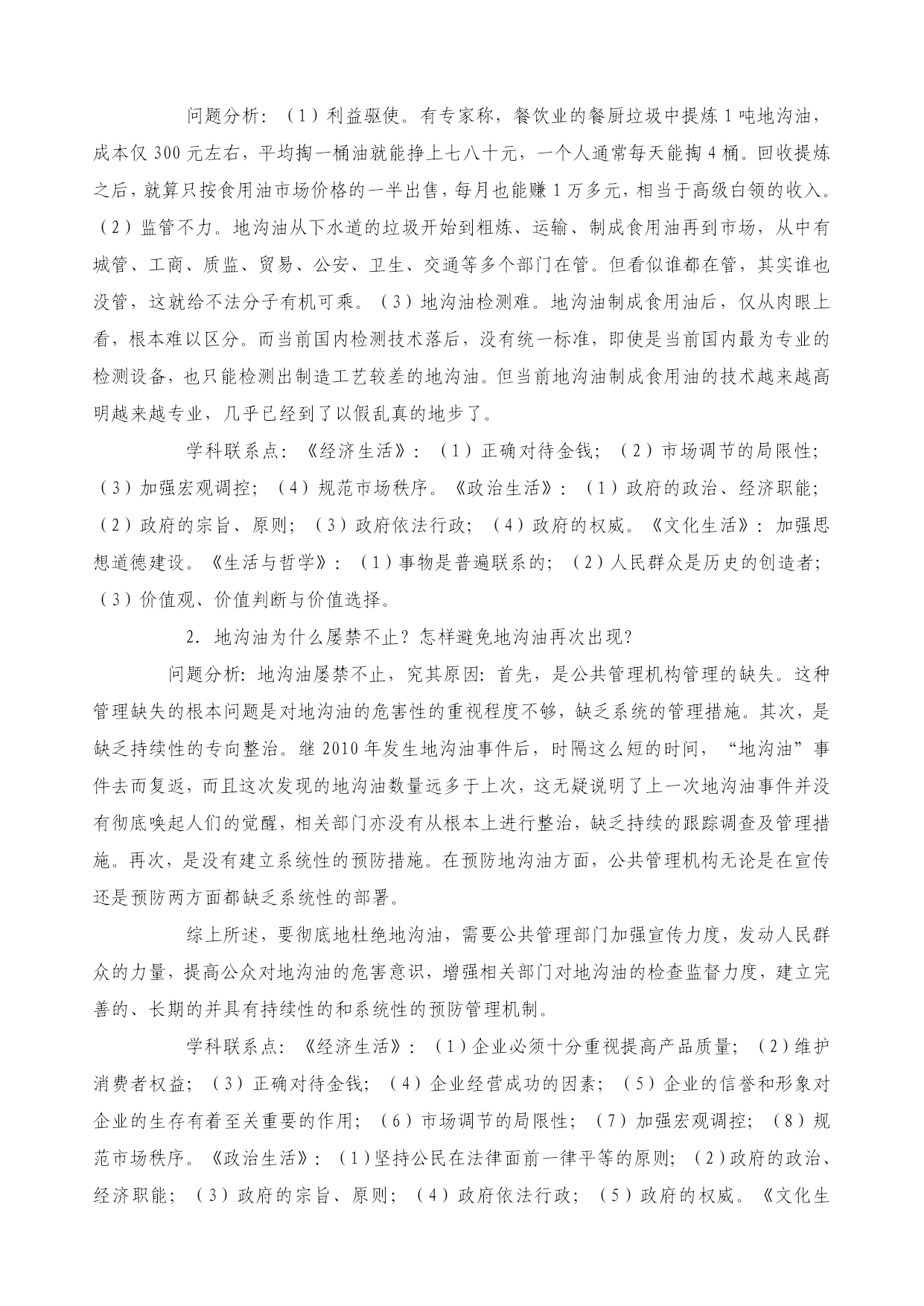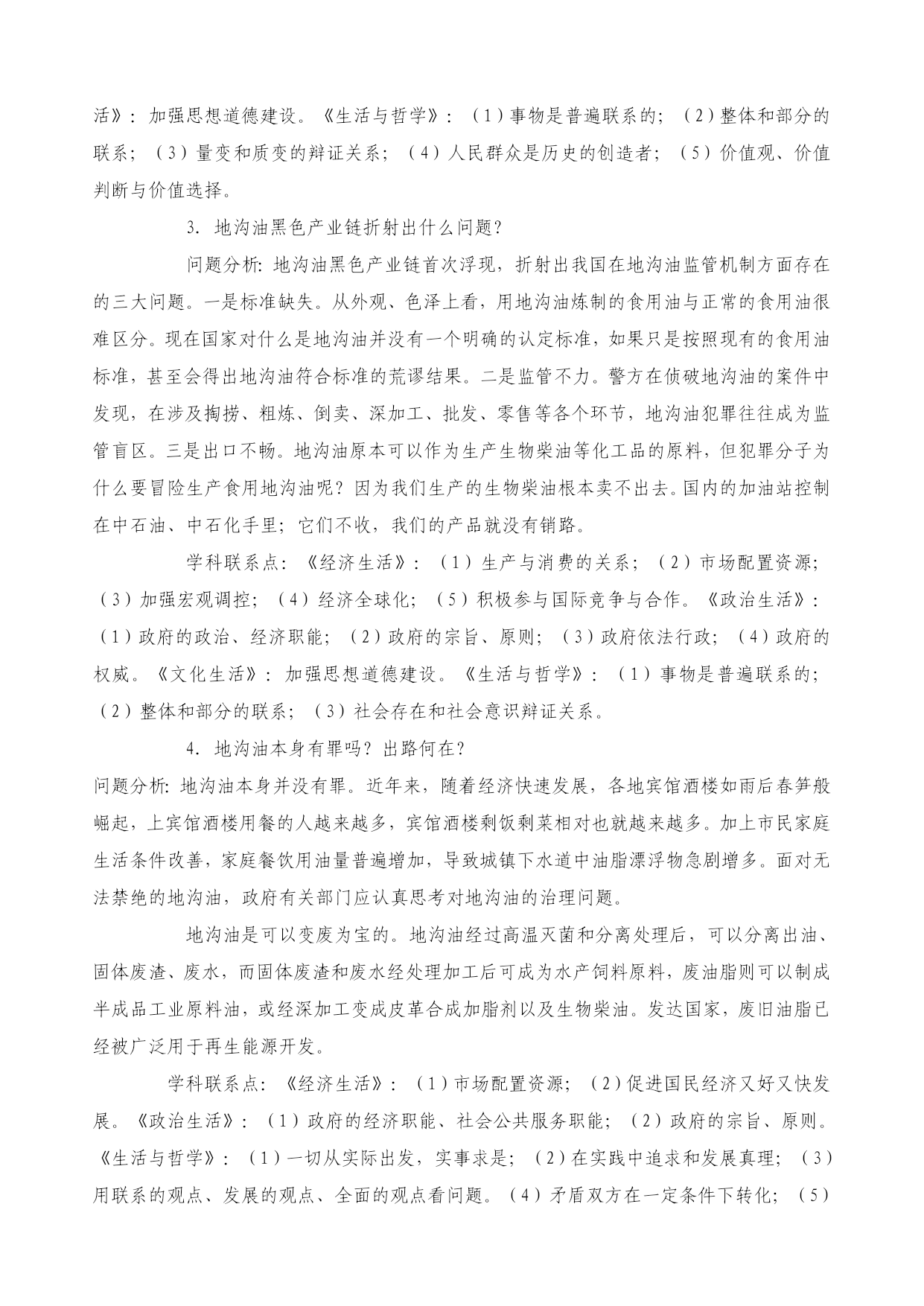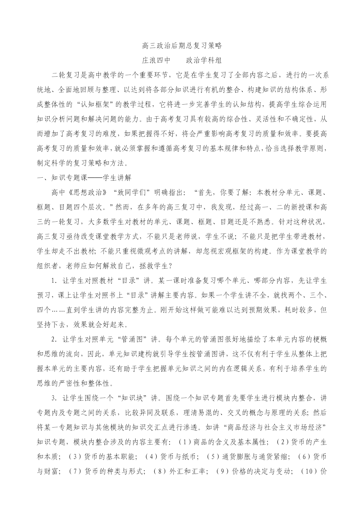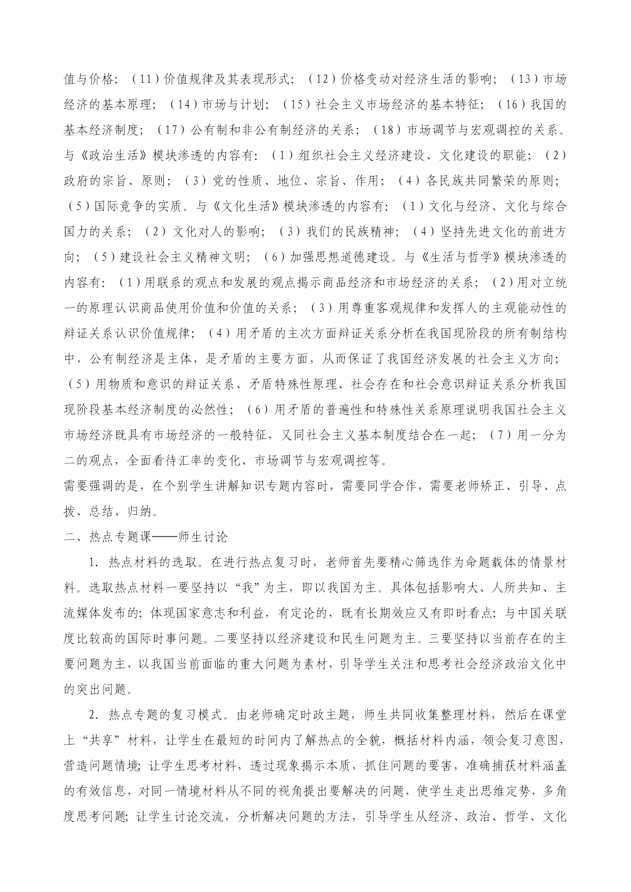 高三政治后期总复习策略 庄浪四中政治学科组 二轮复习是高中教学的一个重要环节,它是在学生复习了全部内容之后,进行的一次系统地、全面地回顾与整理、以达到将各部分知识进行有机的整合、构建知识的结构体系、形成整体性的“认知框架”的教学过程,它将进一步完善学生的认知结构,提高学生综合运用知识分析问题和解决问题的能力。由于高考复习具有较高的综合性、灵活性和不确定性,从而增加了高考复习的难度,如果把握得不好,将会严重影响高考复习的质量和效率。要提高高考复习的质量和效率,就必须掌握和遵循高考复习的基本规律和特点,恰当选择教学原则,制定科学的复习策略和方法。 一、知识专题课──学生讲解 高中《思想政治》“致同学们”明确指出:“首先,你要了解:本教材分单元、课题、框题、目题四个层次。”然而,在多年的高三复习中,我发现,经过高一、二的新授课和高三的一轮复习,大多数学生对教材的单元、课题、框题、目题还是不熟悉。针对这种状况,高三复习亟待改变课堂教学方式,不能只是老师说,学生不说;不能只是把学生带进教材,学生却走不出教材;不能只重视微观考点的讲解,却忽视宏观框架的构建。作为课堂教学的组织者,老师应如何解放自己,拯救学生? 1.让学生对照教材“目录”讲。某一课时准备复习哪个单元、哪部分内容,先让学生预习,课上让学生对照书上“目录”讲解主要内容。如果一个学生讲不全,就找两个、三个、四个……直到学生讲的内容完整为止。刚开始这样做可能难以达到预期效果,耗时较多,但坚持下去,效果就会好起来。 2.让学生对照单元“管涌图”讲。每个单元的管涌图很好地描绘了本单元内容的梗概和思维的流向,因此,单元知识建构就引导学生按管涌图讲,这不仅有利于学生从整体上把握本单元的主要内容,还有助于学生把握单元知识之间的内在逻辑关系,有利于培养学生的思维的严密性和整体性。 3.让学生围绕一个“知识块”讲。围绕一个知识专题首先要学生进行模块内整合,讲专题内及专题之间的关系,比较异同及联系,理清易混的、交叉的概念与原理的关系;然后将某一专题知识与其他模块的知识交汇点进行渗透。如讲“商品经济与社会主义市场经济”知识专题,模块内整合涉及的内容主要有:(1)商品的含义及基本属性;(2)货币的产生和本质;(3)货币的基本职能;(4)货币与纸币;(5)通货膨胀与通货紧缩;(6)货币与财富;(7)货币的种类与形式;(8)外汇和汇率;(9)价格的决定与变动;(10)价值与价格;(11)价值规律及其表现形式;(12)价格变动对经济生活的影响;(13)市场经济的基本原理;(14)市场与计划;(15)社会主义市场经济的基本特征;(16)我国的基本经济制度;(17)公有制和非公有制经济的关系;(18)市场调节与宏观调控的关系。与《政治生活》模块渗透的内容有:(1)组织社会主义经济建设、文化建设的职能;(2)政府的宗旨、原则;(3)党的性质、地位、宗旨、作用;(4)各民族共同繁荣的原则;(5)国际竞争的实质。与《文化生活》模块渗透的内容有:(1)文化与经济、文化与综合国力的关系;(2)文化对人的影响;(3)我们的民族精神;(4)坚持先进文化的前进方向;(5)建设社会主义精神文明;(6)加强思想道德建设。与《生活与哲学》模块渗透的内容有:(1)用联系的观点和发展的观点揭示商品经济和市场经济的关系;(2)用对立统一的原理认识商品使用价值和价值的关系;(3)用尊重客观规律和发挥人的主观能动性的辩证关系认识价值规律;(4)用矛盾的主次方面辩证关系分析在我国现阶段的所有制结构中,公有制经济是主体,是矛盾的主要方面,从而保证了我国经济发展的社会主义方向;(5)用物质和意识的辩证关系、矛盾特殊性原理、社会存在和社会意识辩证关系分析我国现阶段基本经济制度的必然性;(6)用矛盾的普遍性和特殊性关系原理说明我国社会主义市场经济既具有市场经济的一般特征,又同社会主义基本制度结合在一起;(7)用一分为二的观点,全面看待汇率的变化、市场调节与宏观调控等。 需要强调的是,在个别学生讲解知识专题内容时,需要同学合作,需要老师矫正、引导、点拨、总结、归纳。 二、热点专题课──师生讨论 1.热点材料的选取。在进行热点复习时,老师首先要精心筛选作为命题载体的情景材料。选取热点材料一要坚持以“我”为主,即以我国为主。具体包括影响大、人所共知、主流媒体发布的;体现国家意志和利益,有定论的,既有长期效应又有即时看点;与中国关联度比较高的国际时事问题。二要坚持以经济建设和民生问题为主。三要坚持以当前存在的主要问题为主,以我国当前面临的重大问题为素材,引导学生关注和思考社会经济政治文化中的突出问题。 2.热点专题的复习模式。由老师确定时政主题,师生共同收集整理材料,然后在课堂上“共享”材料,让学生在最短的时间内了解热点的全貌,概括材料内涵,领会复习意图,营造