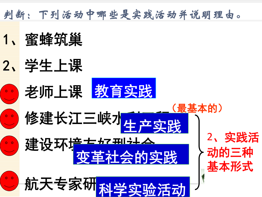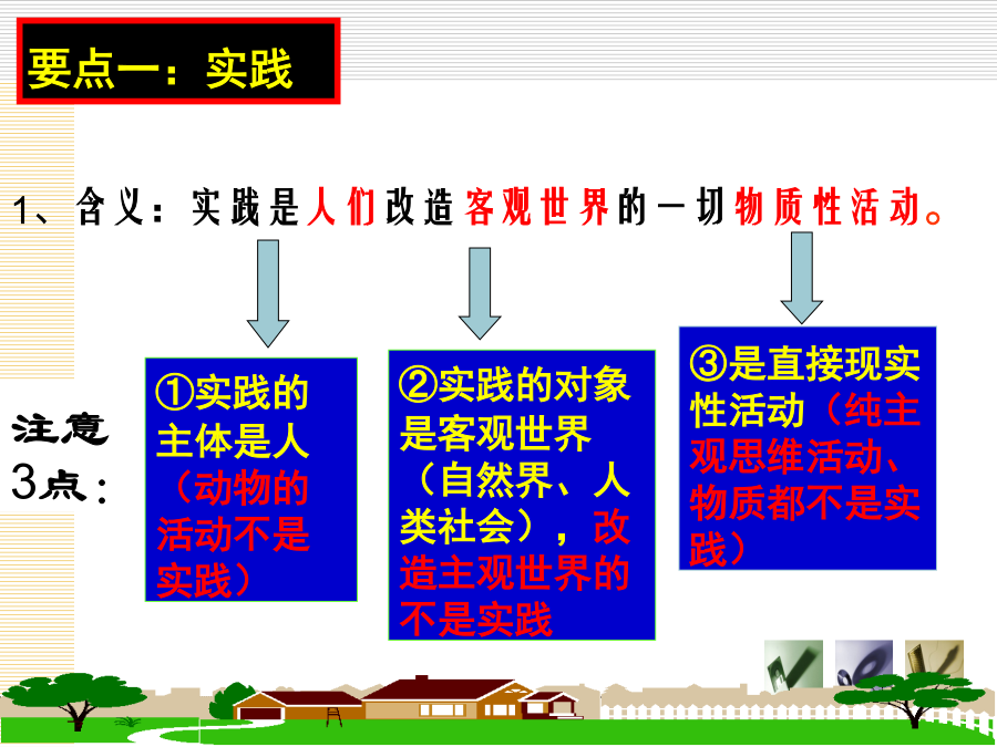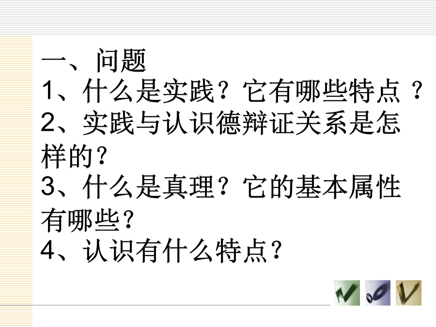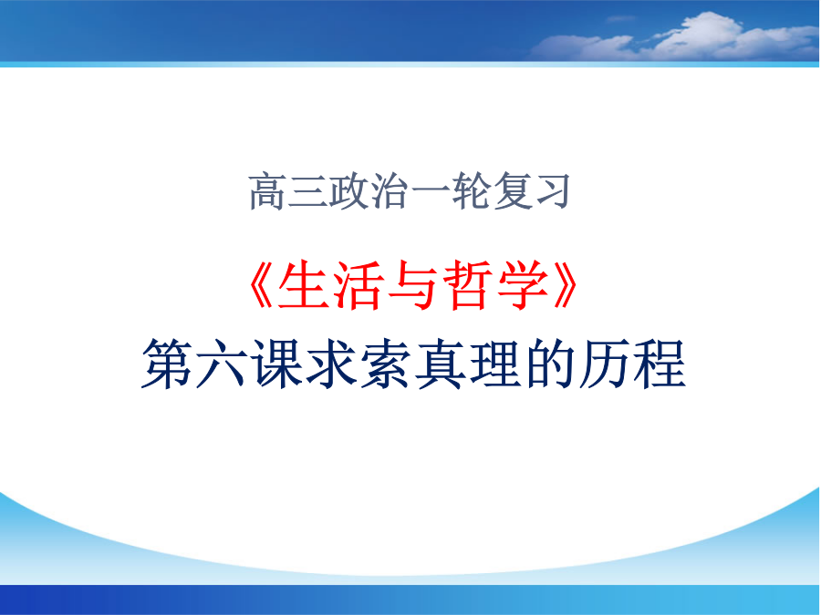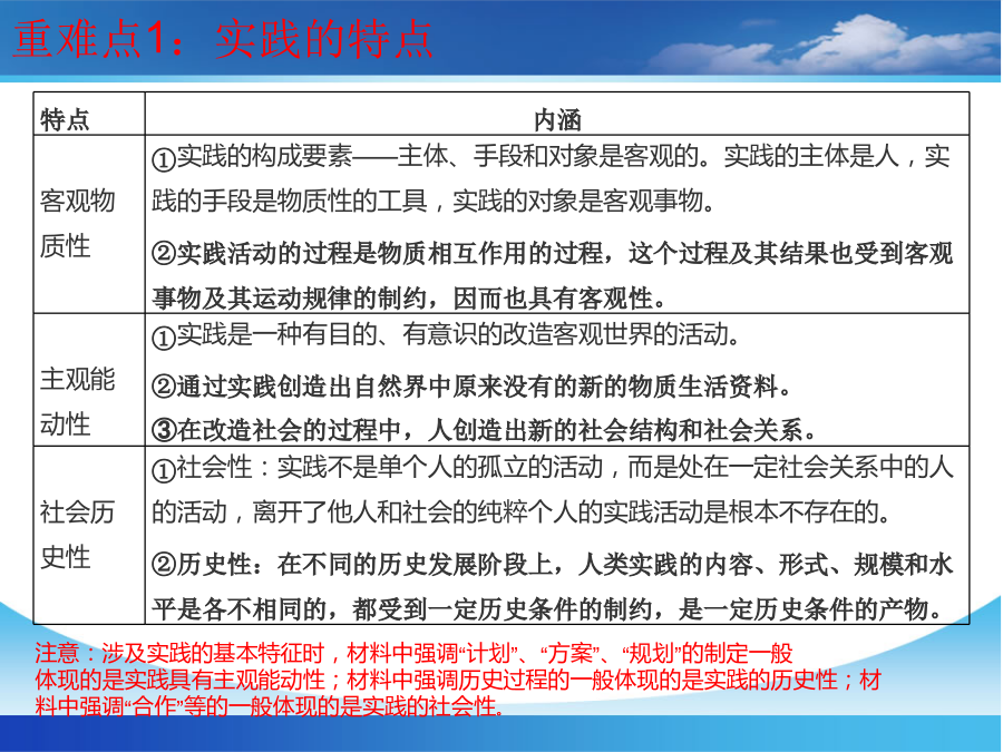 高三政治一轮复习一、问题 1、什么是实践?它有哪些特点? 2、实践与认识德辩证关系是怎样的? 3、什么是真理?它的基本属性有哪些? 4、认识有什么特点?1、含义:实践是人们改造客观世界的一切物质性活动。1、蜜蜂筑巢 2、学生上课 3、老师上课 4、修建长江三峡水利工程 5、建设环境友好型社会 6、航天专家研制“天宫一号”重难点1:实践的特点 (1)实践是认识的_____。 (1)实践是认识的_____。重难点2:实践是认识的基础 近水知鱼性,近山识鸟音。 不入虎穴,焉得虎子。 欲知山中事,须问打樵人。 竹外桃花三两支,春江水暖鸭先知。正确的认识(1)实践是认识的来源 (2)是认识发展的动力 (3)实践是检验认识真理性的唯一标准 (4)是认识的最终目的和归宿 重难点3:实践与认识的辩证关系原理 1.下列与“知暵潦(旱涝)者莫如农,知水草者莫如马,知寒暑者莫如虫”哲理相同的是() ①公说公有理,婆说婆有理 ②一碗酸辣汤,耳闻口讲的,总不如亲口呷一口明白的 ③百闻不如一见 ④塞翁失马,焉知非福 A.①② B.①③C.②③ D.②④ 2.[2014·洛阳统考]WiFi依赖无线电波传输,设备稀有、昂贵、辐射强、效率不高,且存在网络信息安全隐患。德国物理学家哈拉尔德·哈斯提出了一种叫“LiFi”的新型网络信号传输方式,利用丰富、廉价的光线来无线传输数字信息,获得了更快更安全的传输效果。这表明() ①认识产生于人们实践的需要 ②人们观念中的存在通过实践可以变为现实的存在 ③真理都有其适用范围和条件 ④人类实践活动受到一定历史条件的制约要点3真理2、真理的特征思考:“仁者见仁、智者见智”,为什么对同一个确定的对象人们会产生不同的认识?任何真理都有自己的适用条件和范围。重难点4:真理的特点 ①对事物的认识受主体差异的影响 ②认识和改变规律是克服困难的条件 ③辩证的否定是事物之间相互的否定 ④真理都有自己适用的条件和范围 A.①③B.①④C.②③D.②④ 解析:漫画题解答的关键是读懂漫画的意思。一般难度较大。但这题可以用排除法快速解答。因为②错误,规律不能改变;③错误,辩证的否定是事物自身的否定,不是相互的否定。所以正确答案是B。 答案:B1、认识具有反复性人的认识运动不是圆圈式的循环运动,而是波浪式前进或螺旋式上升。原理1.一次,钱学森为解决导师交给他的难题,前后写了五份演算文稿。当他把定稿装入文件袋后,特意在封面上工工整整地写上“Final”(定稿),但他马上又觉得不妥,便在旁边补了一行“Nothingisfinal!!!”(没有什么认识是最后的)。这句“Nothingisfinal!!!”体现的哲学道理是() A.真理是客观的 B.真理是绝对的 C.真理是发展的 D.真理是普遍的2.[2014·湖南长沙联考]倒洗澡水,是一件非常普通的事情。然而麻省理工学院一位教授经过细心观察和研究后指出:由于地球的自转,美国的洗澡水漩涡朝逆时针方向旋转;在南半球,漩涡会顺时针方向旋转;在赤道,则不会形成漩涡。他的见解引起了许多人的怀疑,同时也带来了更广泛的实验。水漩涡方向的研究体现了() ①对既有论断的怀疑是真理发展的基础 ②真理与怀疑在比较和斗争中共同发展 ③任何客观真理都是具体的、有条件的 ④任何真理都有与客观事实相符合的属性 A.①②B.③④C.①③D.②④ 3.[2014·哈师大附中期中]唯一两获老舍文学奖的作家宁肯为了写《蒙面之城》,在西藏生活了2年。他原以为到了西藏肯定能写出不同凡响的作品,但事实却相反。后来经过15年的生活磨砺,才完成了这种超越。其中蕴含的哲学道理主要是() A.认识具有反复性与上升性 B.真理都有条件和范围 C.人的认识水平是无限的 D.实践具有社会历史性A.不同主体对同一对象会产生不同的认识 B.受主客观条件限制,人的认识必然存在一定局限性甚至错误 C.受不同立场的影响,人们对事物的认识会存在一定差异 D.人们对事物的正确认识往往要经过多次反复才能完成