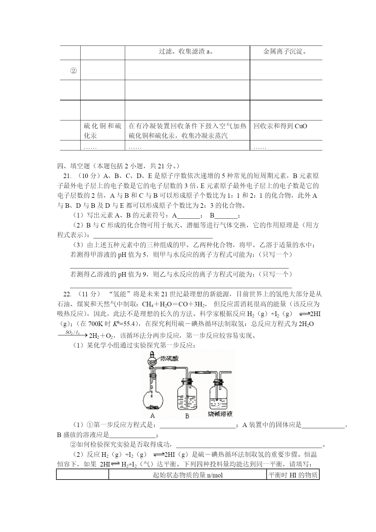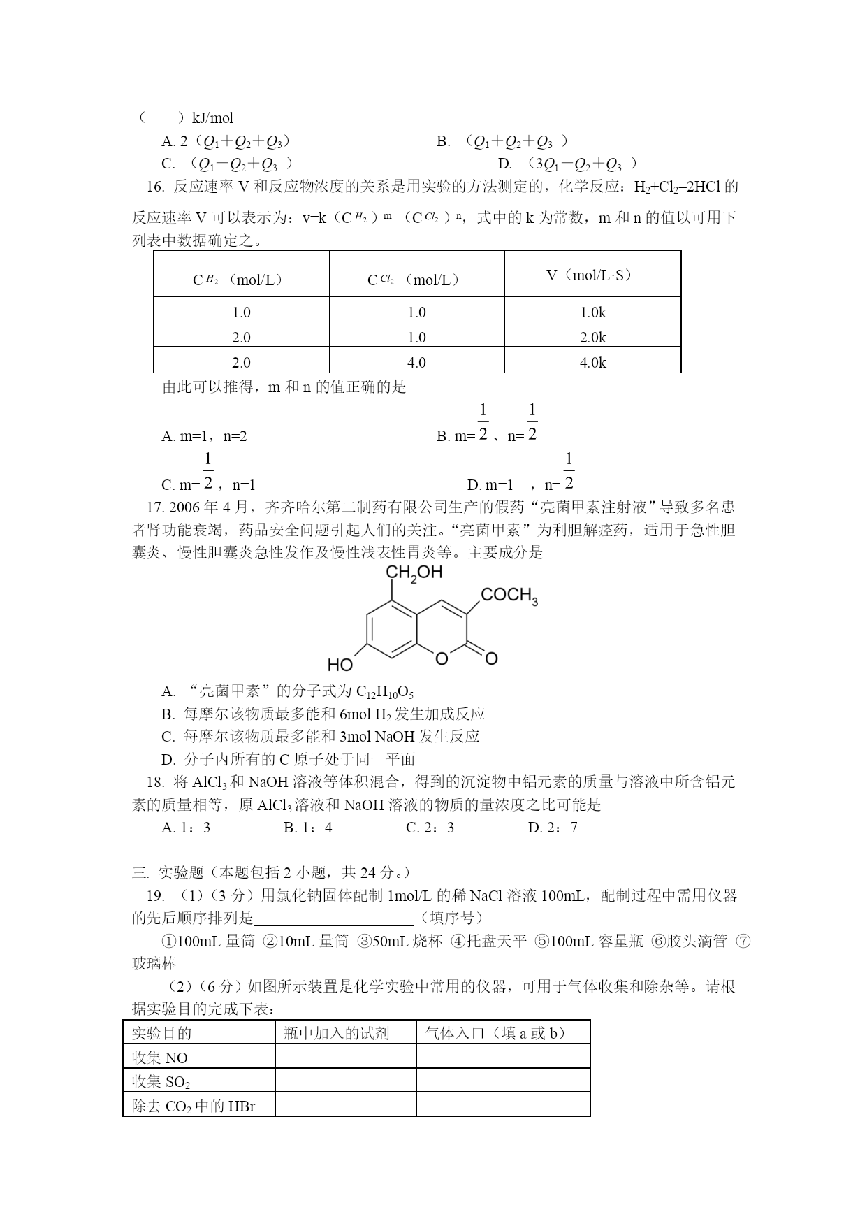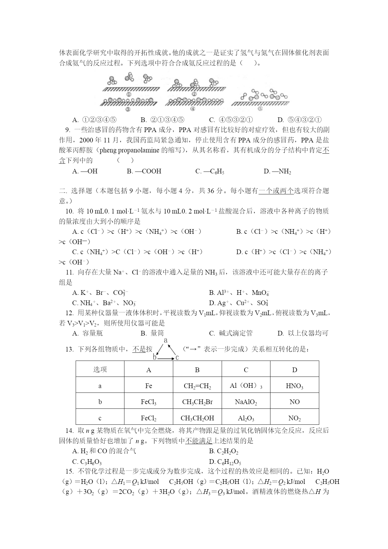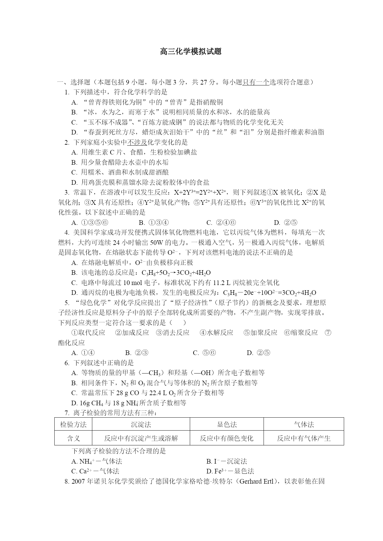 高三化学模拟试题 一、选择题(本题包括9小题,每小题3分,共27分。每小题只有一个选项符合题意) 1.下列描述中,符合化学科学的是 A.“曾青得铁则化为铜”中的“曾青”是指硝酸铜 B.“冰,水为之,而寒于水”说明相同质量的水和冰,水的能量高 C.“玉不琢不成器”、“百炼方能成钢”的说法都与物质的化学变化无关 D.“春蚕到死丝方尽,蜡炬成灰泪始干”中的“丝”和“泪”分别是指纤维素和油脂 2.下列家庭小实验中不涉及化学变化的是 A.用维生素C片、食醋,生粉检验加碘盐 B.用少量食醋除去水壶中的水垢 C.用糯米、酒曲和水制成甜酒酿 D.用鸡蛋壳膜和蒸馏水除去淀粉胶体中的食盐 3.常温下,在溶液中可以发生反应:X+2Y3+=2Y2++X2+,则下列叙述①X被氧化;②X是氧化剂;③X具有还原性;④Y2+是氧化产物;⑤Y2+具有还原性;⑥Y3+的氧化性比X2+的氧化性强。以下叙述中正确的是 A.①③⑤⑥ B.①③④ C.②④⑥ D.②⑤ 4.美国科学家成功开发便携式固体氧化物燃料电池,它以丙烷气体为燃料,每填充一次燃料,大约可连续24小时输出50W的电力。一极通入空气,另一极通入丙烷气体,电解质是固态氧化物,在熔融状态下能传导O2-,下列对该燃料电池的说法不正确的是 A.在熔融电解质中,O2-由负极移向正极 B.该电池的总反应是:C3H8+5O2→3CO2+4H2O C.电路中每流过10mol电子,标准状况下约有11.2L丙烷被完全氧化 D.通丙烷的电极为电池负极,发生的电极反应为:C3H8-20e-+10O2-=3CO2+4H2O 5.“绿色化学”对化学反应提出了“原子经济性”(原子节约)的新概念及要求,理想原子经济性反应是原料分子中的原子全部转化成所需要的产物,不产生副产物,实现零排放。下列反应类型一定符合这一要求的是() ①取代反应②加成反应③消去反应④水解反应⑤加聚反应⑥缩聚反应⑦酯化反应 A.①④ B.②③ C.⑤⑥ D.②⑤ 6.下列叙述中正确的是 A.等物质的量的甲基(—CH3)和羟基(—OH)所含电子数相等 B.相同条件下,N2和O3混合气与等体积的N2所含原子数相等 C.常温常压下28gCO与22.4LO2所含分子数相等 D.16gCH4与18gNH4+所含质子数相等 7.离子检验的常用方法有三种: 检验方法沉淀法显色法气体法含义反应中有沉淀产生或溶解反应中有颜色变化反应中有气体产生下列离子检验的方法不合理的是 A.NH4+-气体法 B.I--沉淀法 C.Ca2+-气体法 D.Fe3+-显色法 8.2007年诺贝尔化学奖颁给了德国化学家格哈德·埃特尔(GerhardErtl),以表彰他在固体表面化学研究中取得的开拓性成就。他的成就之一是证实了氢气与氮气在固体催化剂表面合成氨气的反应过程。下列选项中符合合成氨反应过程的是()。 A.①②③④⑤ B.②①③④⑤ C.④⑤③②① D.⑤④③②① 9.一些治感冒的药物含有PPA成分,PPA对感冒有比较好的对症疗效,但也有较大的副作用,2000年11月,我国药监局紧急通知,停止使用含有PPA成分的感冒药,PPA是盐酸苯丙醇胺(phengpropanolamine的缩写),从其名称看,其有机成分的分子结构中肯定不含下列中的() A.—OH B.—COOH C.—C6H5 D.—NH2 二.选择题(本题包括9小题,每小题4分,共36分。每小题有一个或两个选项符合题意。) 10.将10mL0.1mol·L-1氨水与10mL0.2mol·L-1盐酸混合后,溶液中各种离子的物质的量浓度由大到小的顺序是 A.c(Cl-)>c(H+)>c(NH4+)>c(OH-) B.c(Cl-)>c(NH4+)>c(H+)>c(OH—) C.c(NH4+)>C(Cl-)>c(OH-)>c(H+) D.c(H+)>c(Cl-)>c(NH4+)>c(OH-) 11.向存在大量Na+、Cl-的溶液中通入足量的NH3后,该溶液中还可能大量存在的离子组是 A.K+、Br-、CO32- B.Al3+、H+、MnO4- C.NH4+、Ba2+、NO3- D.Ag+、Cu2+、SO42 12.用某种仪器量一液体体积时,平视读数为V1mL,仰视读数为V2mL,俯视读数为V3mL,若V3>V1>V2,则所使用仪器可能是 A.容量瓶 B.量筒 C.碱式滴定管 D.以上仪器均可 13.下列各组物质中,不是按(“→”表示一步完成)关系相互转化的是: 选项ABCDaFeCH2=CH2Al(OH)3HNO3bFeCl3CH3CH2BrNaAlO2NOcFeCl2CH3CH2OHAl2O3NO214.取ng某物质在氧气中完全燃烧,将其产物