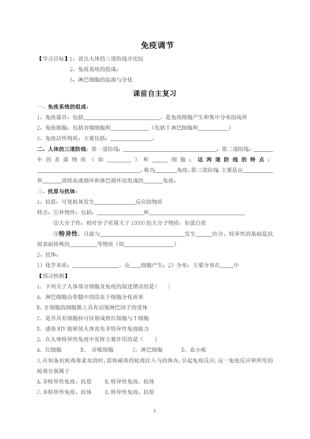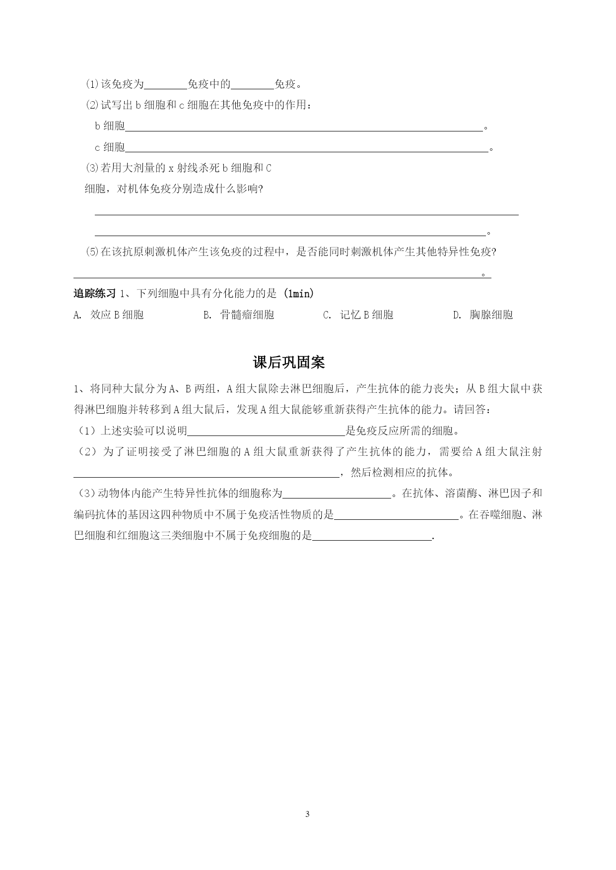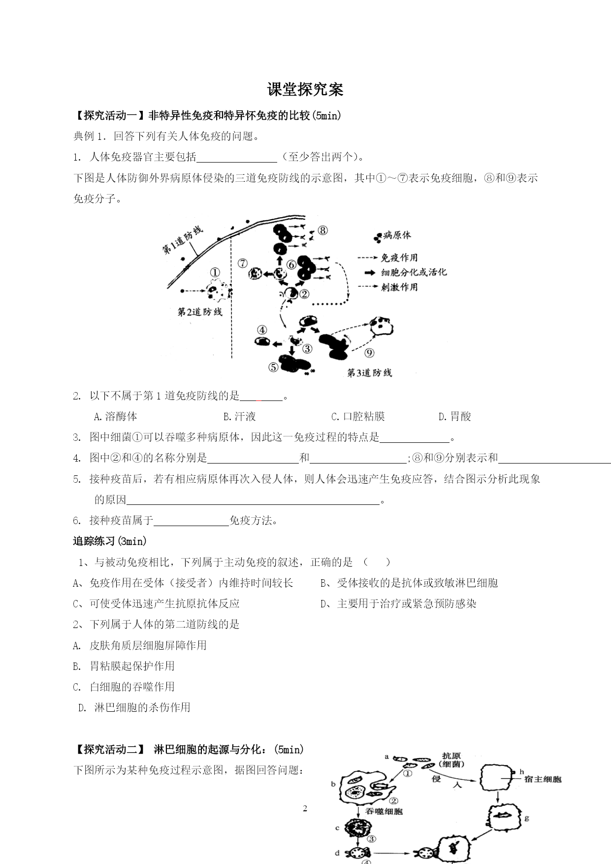 免疫调节 【学习目标】1、说出人体的三道防线并比较 2、免疫系统的组成: 3、淋巴细胞的起源与分化 课前自主复习 一、免疫系统的组成: 1、免疫器官:包括____________________________,是免疫细胞产生和集中分布的场所 2、免疫细胞:包括吞噬细胞和______________(包括T淋巴细胞和___________) 3、免疫活性物质:主要包括:_______________。 二、人体的三道防线:第一道防线:__________________________________;第二道防线:_______中的杀菌物质(如_________)和______细胞;这两道防线的特点:______________________________________,称为________免疫。第三道防线:主要是由___________和_______借助血液循环和淋巴循环而组成的_______免疫。 三、抗原与抗体: 1、抗原:可使机体发生_______________反应的物质 特点:①异物性:包括:_________________和___________________________________ ②大分子性:相对分子质量大于10000的大分子物质,如蛋白质 ③特异性:只能与_______________________________发生______结合。特异性的基础是抗原表面特殊的__________等物质(即__________________) 2、抗体: 1)化学本质:_________________,由____细胞产生;2)分布:主要分布在_____中 【预习检测】 1.下列关于人体部分细胞及免疫的叙述错误的是() A.淋巴细胞由骨髓中的造血干细胞分化而来 B.B细胞的细胞膜上具有识别淋巴因子的受体 C.是否具有细胞核可区别成熟红细胞与T细胞 D.感染HIV能够使人体丧失非特异性免疫能力 2.在人体特异性免疫中发挥主要作用的是()A.红细胞B.吞噬细胞C.淋巴细胞D.血小板 3.在制备抗蛇毒毒素血清时,需将减毒的蛇毒注入马的体内,引起免疫反应,这一免疫反应和所用的蛇毒分别属于A.非特异性免疫、抗原B.特异性免疫、抗体C.非特异性免疫、抗体D.特异性免疫、抗原 课堂探究案 【探究活动一】非特异性免疫和特异怀免疫的比较(5min) 典例1.回答下列有关人体免疫的问题。 1.人体免疫器官主要包括(至少答出两个)。 下图是人体防御外界病原体侵染的三道免疫防线的示意图,其中①~⑦表示免疫细胞,⑧和⑨表示免疫分子。 2.以下不属于第1道免疫防线的是。 A.溶酶体 B.汗液 C.口腔粘膜 D.胃酸 3.图中细菌①可以吞噬多种病原体,因此这一免疫过程的特点是。 4.图中②和④的名称分别是和;⑧和⑨分别表示和。 5.接种疫苗后,若有相应病原体再次入侵人体,则人体会迅速产生免疫应答,结合图示分析此现象的原因。 6.接种疫苗属于免疫方法。 追踪练习(3min) 1、与被动免疫相比,下列属于主动免疫的叙述,正确的是() A、免疫作用在受体(接受者)内维持时间较长B、受体接收的是抗体或致敏淋巴细胞 C、可使受体迅速产生抗原抗体反应D、主要用于治疗或紧急预防感染 2、下列属于人体的第二道防线的是 A.皮肤角质层细胞屏障作用 B.胃粘膜起保护作用 C.白细胞的吞噬作用 D.淋巴细胞的杀伤作用 【探究活动二】淋巴细胞的起源与分化:(5min) 下图所示为某种免疫过程示意图,据图回答问题: (1)该免疫为免疫中的免疫。 (2)试写出b细胞和c细胞在其他免疫中的作用: b细胞。 c细胞。 (3)若用大剂量的x射线杀死b细胞和C 细胞,对机体免疫分别造成什么影响? 。 (5)在该抗原刺激机体产生该免疫的过程中,是否能同时刺激机体产生其他特异性免疫? 。 追踪练习1、下列细胞中具有分化能力的是(1min) A.效应B细胞B.骨髓瘤细胞C.记忆B细胞D.胸腺细胞 课后巩固案 1、将同种大鼠分为A、B两组,A组大鼠除去淋巴细胞后,产生抗体的能力丧失;从B组大鼠中获得淋巴细胞并转移到A组大鼠后,发现A组大鼠能够重新获得产生抗体的能力。请回答: (1)上述实验可以说明_____________________________是免疫反应所需的细胞。 (2)为了证明接受了淋巴细胞的A组大鼠重新获得了产生抗体的能力,需要给A组大鼠注射_________________________________________________,然后检测相应的抗体。 (3)动物体内能产生特异性抗体的细胞称为____________________。在抗体、溶菌酶、淋巴因子和编码抗体的基因这四种物质中不属于免疫活性物质的是______