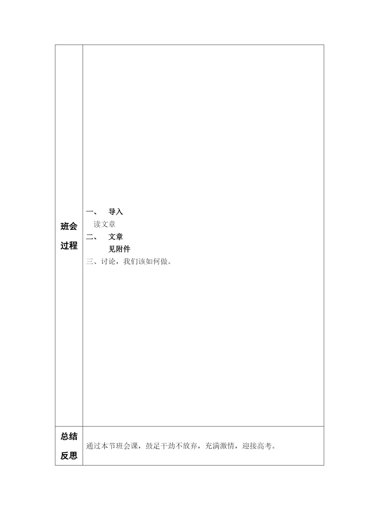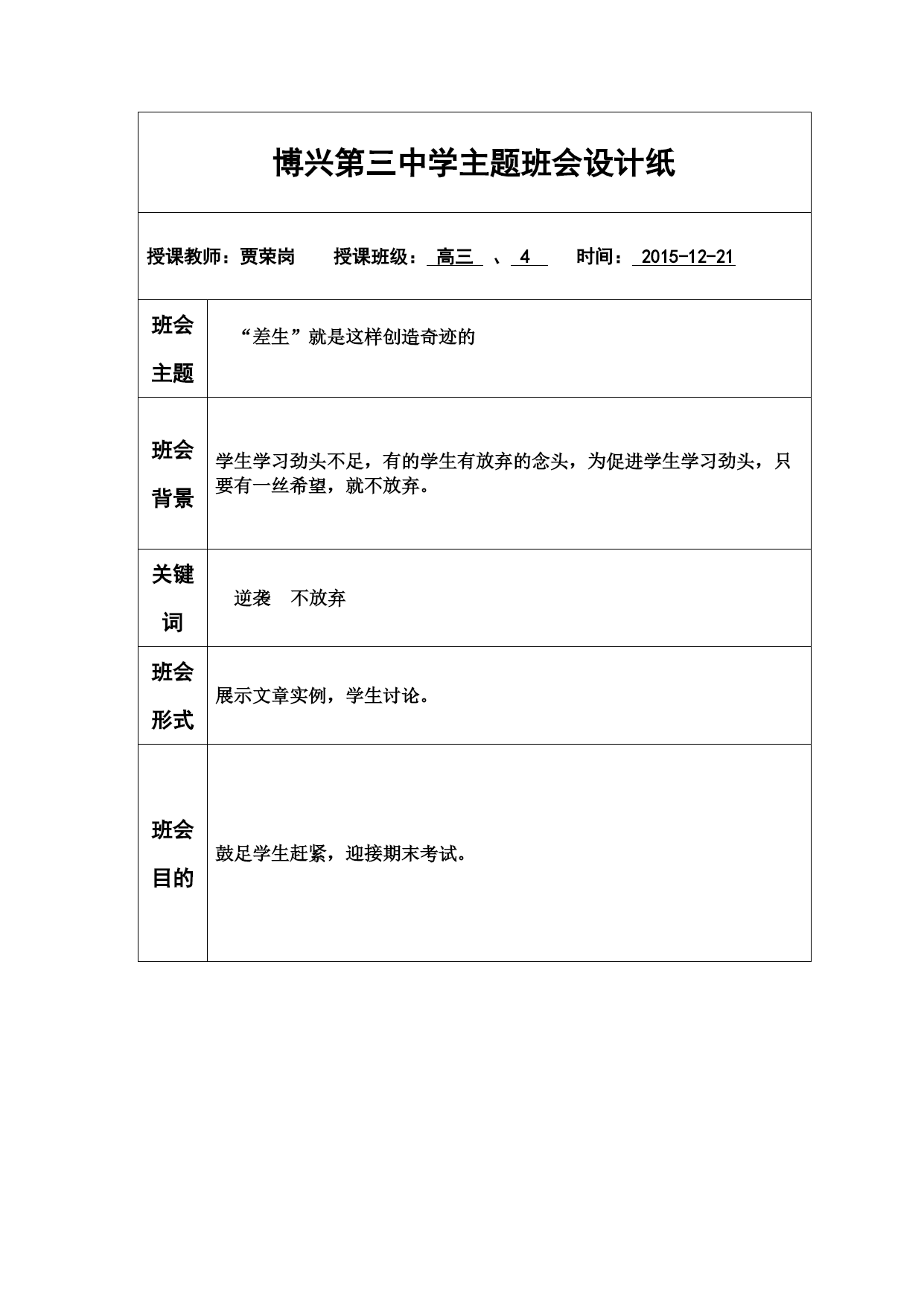博兴第三中学主题班会设计纸授课教师:贾荣岗授课班级:高三、4时间:2015-12-21班会主题“差生”就是这样创造奇迹的 班会背景学生学习劲头不足,有的学生有放弃的念头,为促进学生学习劲头,只要有一丝希望,就不放弃。关键词逆袭不放弃班会形式展示文章实例,学生讨论。班会目的鼓足学生赶紧,迎接期末考试。班会过程导入 读文章 文章 见附件 三、讨论,我们该如何做。总结反思通过本节班会课,鼓足干劲不放弃,充满激情,迎接高考。