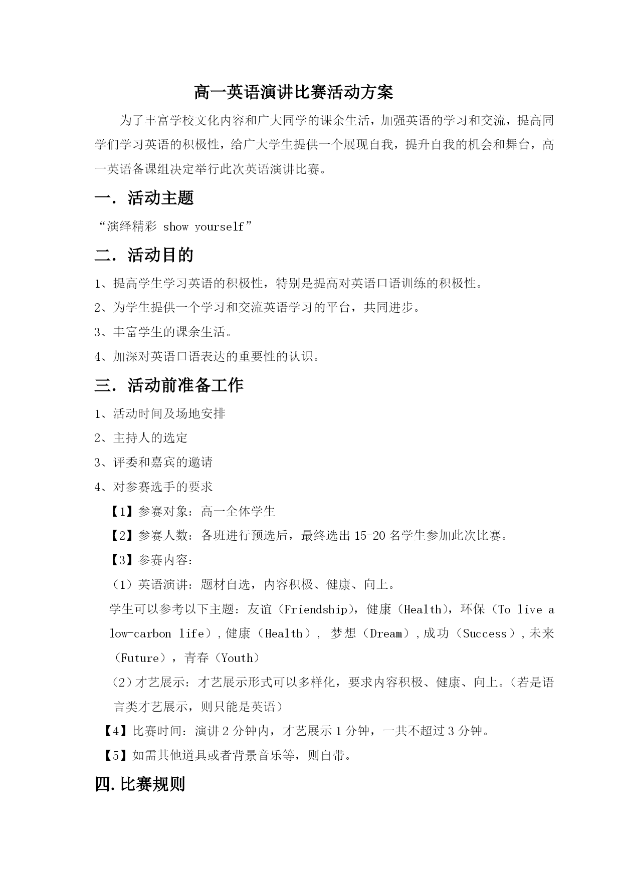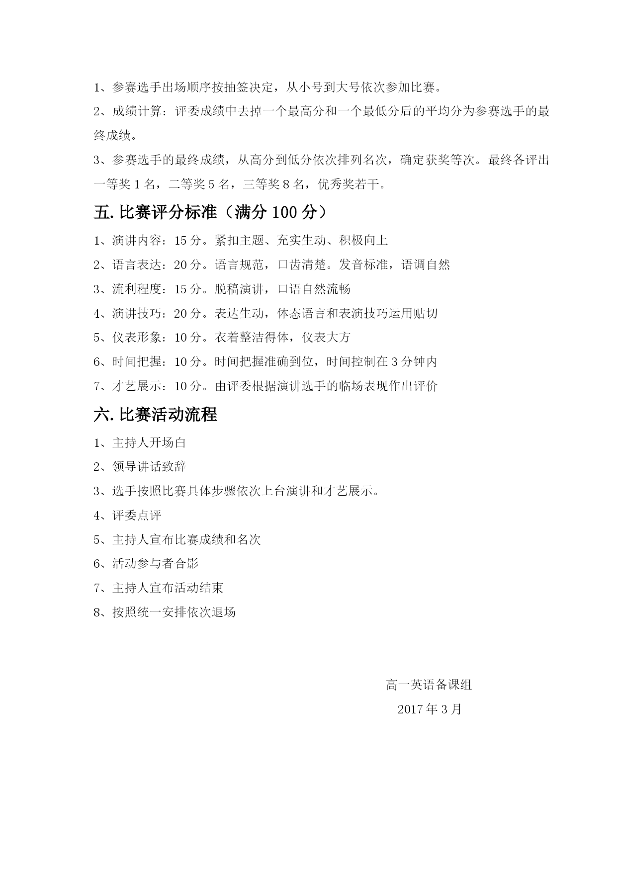 高一英语演讲比赛活动方案 为了丰富学校文化内容和广大同学的课余生活,加强英语的学习和交流,提高同学们学习英语的积极性,给广大学生提供一个展现自我,提升自我的机会和舞台,高一英语备课组决定举行此次英语演讲比赛。 一.活动主题 “演绎精彩showyourself” 二.活动目的 1、提高学生学习英语的积极性,特别是提高对英语口语训练的积极性。 2、为学生提供一个学习和交流英语学习的平台,共同进步。 3、丰富学生的课余生活。 4、加深对英语口语表达的重要性的认识。 三.活动前准备工作 1、活动时间及场地安排 2、主持人的选定 3、评委和嘉宾的邀请 4、对参赛选手的要求 【1】参赛对象:高一全体学生 【2】参赛人数:各班进行预选后,最终选出15-20名学生参加此次比赛。 【3】参赛内容: (1)英语演讲:题材自选,内容积极、健康、向上。 学生可以参考以下主题:友谊(Friendship),健康(Health),环保(Tolivealow-carbonlife),健康(Health),梦想(Dream),成功(Success),未来(Future),青春(Youth) (2)才艺展示:才艺展示形式可以多样化,要求内容积极、健康、向上。(若是语言类才艺展示,则只能是英语) 【4】比赛时间:演讲2分钟内,才艺展示1分钟,一共不超过3分钟。 【5】如需其他道具或者背景音乐等,则自带。 四.比赛规则 1、参赛选手出场顺序按抽签决定,从小号到大号依次参加比赛。2、成绩计算:评委成绩中去掉一个最高分和一个最低分后的平均分为参赛选手的最终成绩。3、参赛选手的最终成绩,从高分到低分依次排列名次,确定获奖等次。最终各评出一等奖1名,二等奖5名,三等奖8名,优秀奖若干。 五.比赛评分标准(满分100分) 1、演讲内容:15分。紧扣主题、充实生动、积极向上2、语言表达:20分。语言规范,口齿清楚。发音标准,语调自然3、流利程度:15分。脱稿演讲,口语自然流畅4、演讲技巧:20分。表达生动,体态语言和表演技巧运用贴切5、仪表形象:10分。衣着整洁得体,仪表大方6、时间把握:10分。时间把握准确到位,时间控制在3分钟内7、才艺展示:10分。由评委根据演讲选手的临场表现作出评价六.比赛活动流程 1、主持人开场白 2、领导讲话致辞 3、选手按照比赛具体步骤依次上台演讲和才艺展示。 4、评委点评 5、主持人宣布比赛成绩和名次 6、活动参与者合影 7、主持人宣布活动结束 8、按照统一安排依次退场 高一英语备课组 2017年3月