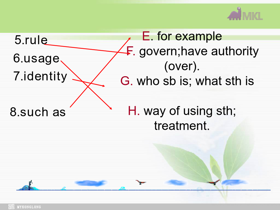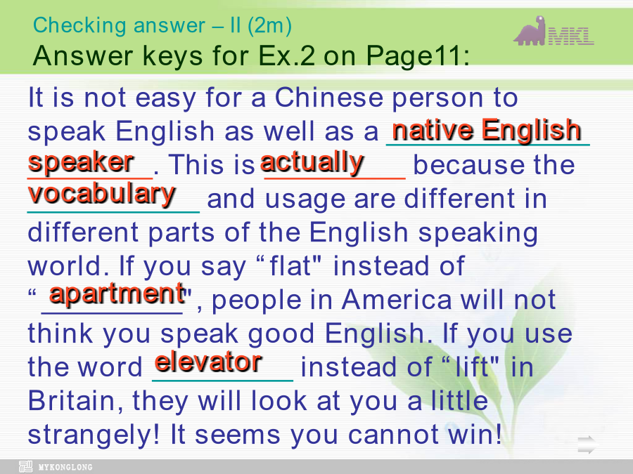 Period3LearningaboutlanguageRevision(3m)Match:(Reviewthenewwords)E.forexampleF.govern;haveauthority(over).G.whosbis;whatsthisH.wayofusingsth;treatment.Checkinganswer–I(1m)AnswerkeysforEx.1onPage11:ItisnoteasyforaChinesepersontospeakEnglishaswellasa_____________________.Thisis_________becausethe___________andusagearedifferentindifferentpartsoftheEnglishspeakingworld.Ifyousay“flat"insteadof“_________",peopleinAmericawillnotthinkyouspeakgoodEnglish.Ifyouusetheword_________insteadof“lift"inBritain,theywilllookatyoualittlestrangely!Itseemsyoucannotwin!Checkinganswer–III(2m)AnswerkeysforEx.3onpage11:Learningusefulstructure–I(2m)Saythefollowingsentencestothreestudents:Learningusefulstructure–II(2m)Makeclearthedifferencebetweencommandsandrequestsandfinishthefollowingexercises:Learningusefulstructure–III(2m)Findtherules:Askthestudentstofinishthefollowingexercises,andtrytofindtherules.祈使句特别提醒Openthewindow.“Writealettertoyourparents.” “Don’tplaygamesintheclassroom.” “CanyoupassonthebooktoTom?” “Willyoupleasenotsmokehere?”“Itisafineday.Let’sgotothecountry forapicnic.”Petersaidtome.感叹句特别提醒1.HesaidtoTom,“Don’tdotheworkanymore.”高考链接: Wewon’tgiveup_______weshouldfail10times. A.evenifB.sinceC.whetherD.until 2.—Idon’thaveanychangewithme.Willyoupaythefareforme? ----________. A.That’sfineB.Nothingserious C.NevermindD.Noproblem 3.----DoyoumindifIkeeppetsinthisbuilding? ----_______. A.I’dratheryoudidn’t,actually B.Ofcoursenot,it’snotallowedhere C.Great!IlovepetsD.No,youcan’t 4.Theteacheraskedus____somuchnoise A.don’tmakeB.notmake C.notmakingD.nottomake 5.Visitors____nottotouchtheexhibits. A.willrequestB.request C.arerequestingD.arerequestedAssignment