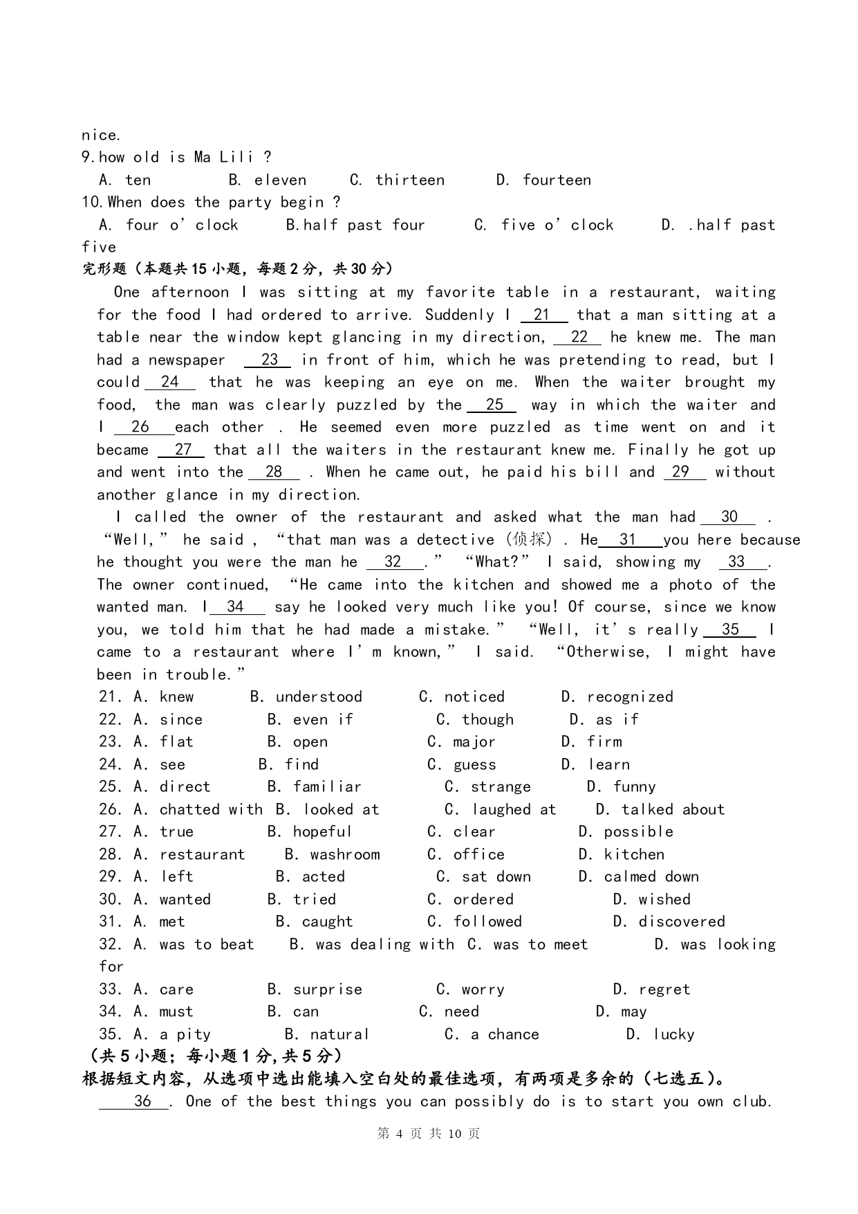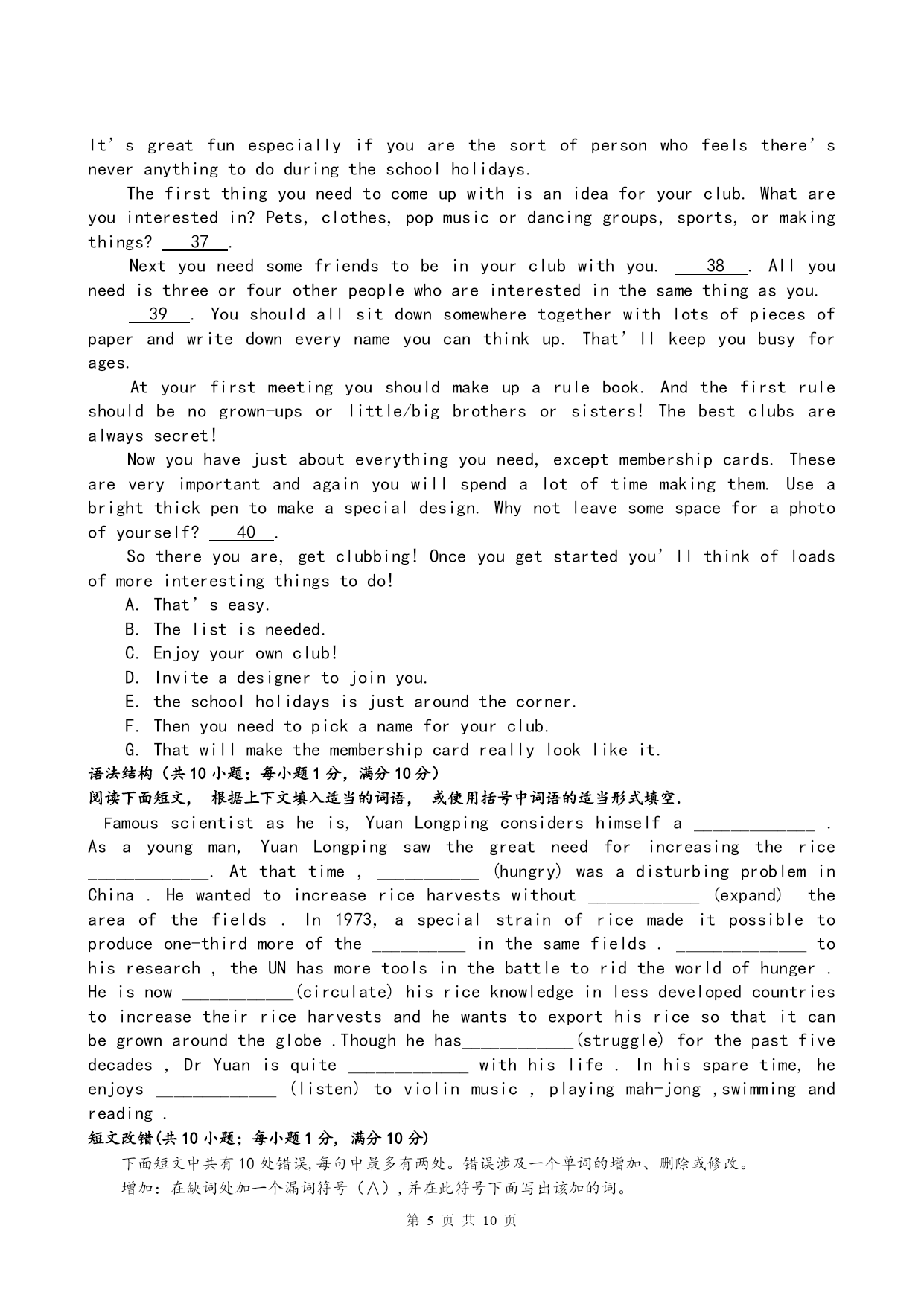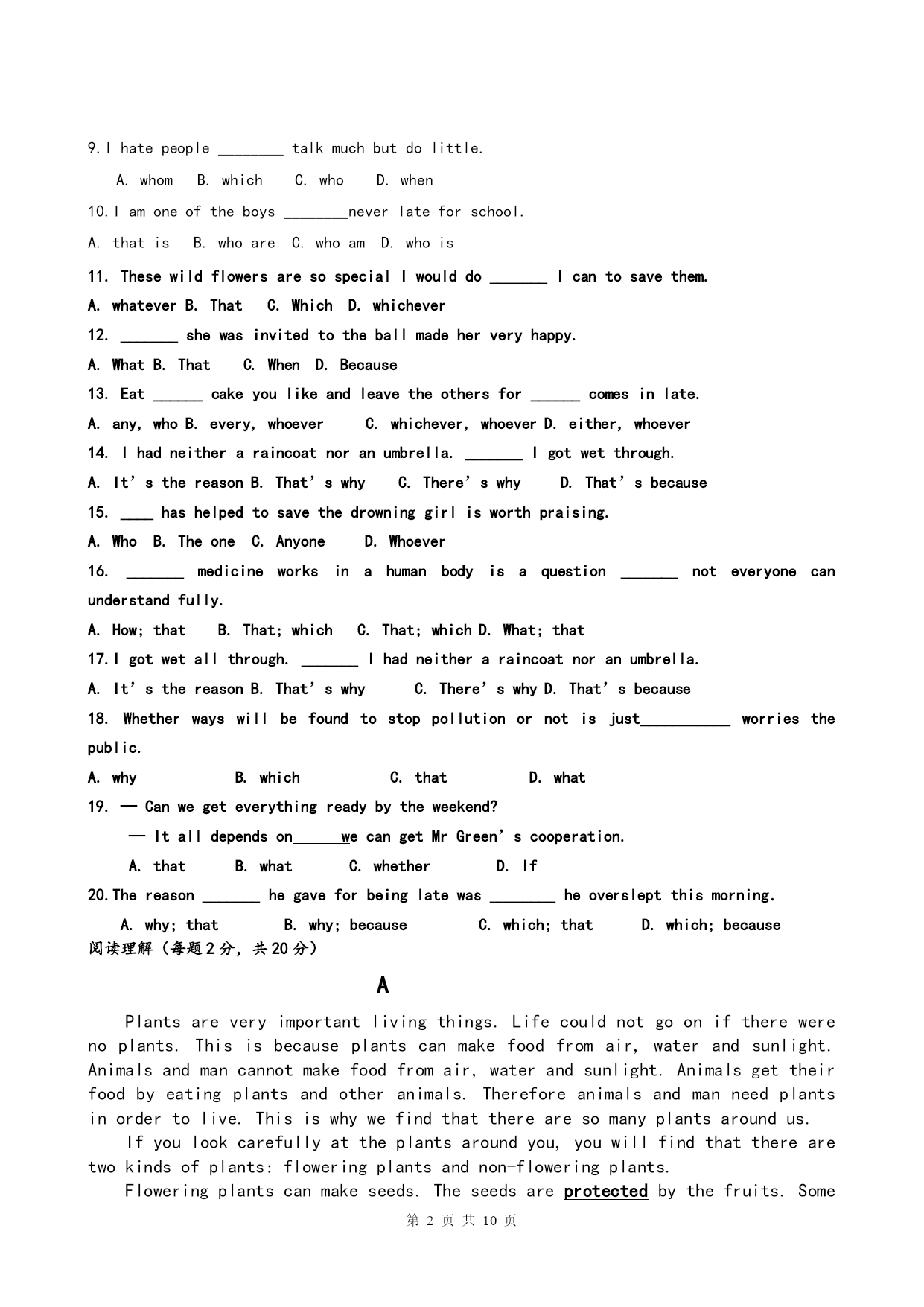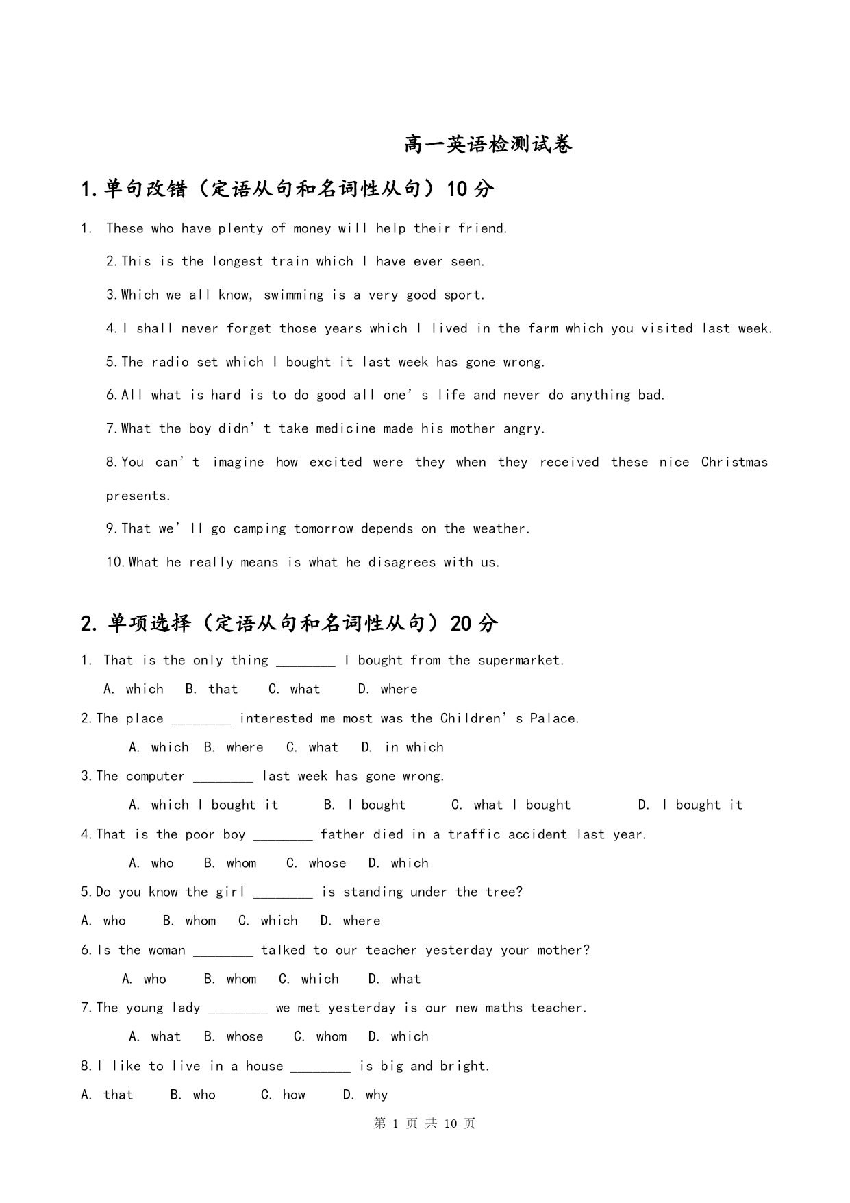 第页共NUMPAGES10页 高一英语检测试卷 1.单句改错(定语从句和名词性从句)10分 Thesewhohaveplentyofmoneywillhelptheirfriend. 2.ThisisthelongesttrainwhichIhaveeverseen.3.Whichweallknow,swimmingisaverygoodsport.4.IshallneverforgetthoseyearswhichIlivedinthefarmwhichyouvisitedlastweek.5.TheradiosetwhichIboughtitlastweekhasgonewrong. 6.Allwhatishardistodogoodallone’slifeandneverdoanythingbad. 7.Whattheboydidn’ttakemedicinemadehismotherangry. 8.Youcan’timaginehowexcitedweretheywhentheyreceivedtheseniceChristmaspresents. 9.Thatwe’llgocampingtomorrowdependsontheweather. 10.Whathereallymeansiswhathedisagreeswithus. 单项选择(定语从句和名词性从句)20分 1.Thatistheonlything________Iboughtfromthesupermarket. A.whichB.thatC.whatD.where 2.Theplace________interestedmemostwastheChildren’sPalace. A.whichB.whereC.whatD.inwhich 3.Thecomputer________lastweekhasgonewrong. A.whichIboughtitB.IboughtC.whatIboughtD.Iboughtit 4.Thatisthepoorboy________fatherdiedinatrafficaccidentlastyear. A.whoB.whomC.whoseD.which 5.Doyouknowthegirl________isstandingunderthetree? A.whoB.whomC.whichD.where 6.Isthewoman________talkedtoourteacheryesterdayyourmother? A.whoB.whomC.whichD.what 7.Theyounglady________wemetyesterdayisournewmathsteacher. A.whatB.whoseC.whomD.which 8.Iliketoliveinahouse________isbigandbright. A.thatB.whoC.howD.why 9.Ihatepeople________talkmuchbutdolittle. A.whomB.whichC.whoD.when 10.Iamoneoftheboys________neverlateforschool. A.thatisB.whoareC.whoamD.whois 11.ThesewildflowersaresospecialIwoulddo_______Icantosavethem. A.whatever B.ThatC.Which D.whichever 12._______shewasinvitedtotheballmadeherveryhappy. A.What B.ThatC.When D.Because 13.Eat______cakeyoulikeandleavetheothersfor______comesinlate. A.any,who B.every,whoeverC.whichever,whoever D.either,whoever 14.Ihadneitheraraincoatnoranumbrella._______Igotwetthrough. A.It’sthereason B.That’swhyC.There’swhy D.That’sbecause 15.____hashelpedtosavethedrowninggirlisworthpraising. A.Who B.TheoneC.Anyone D.Whoever 16._______medicineworksinahumanbodyisaquestion_______noteveryonecanunderstandf