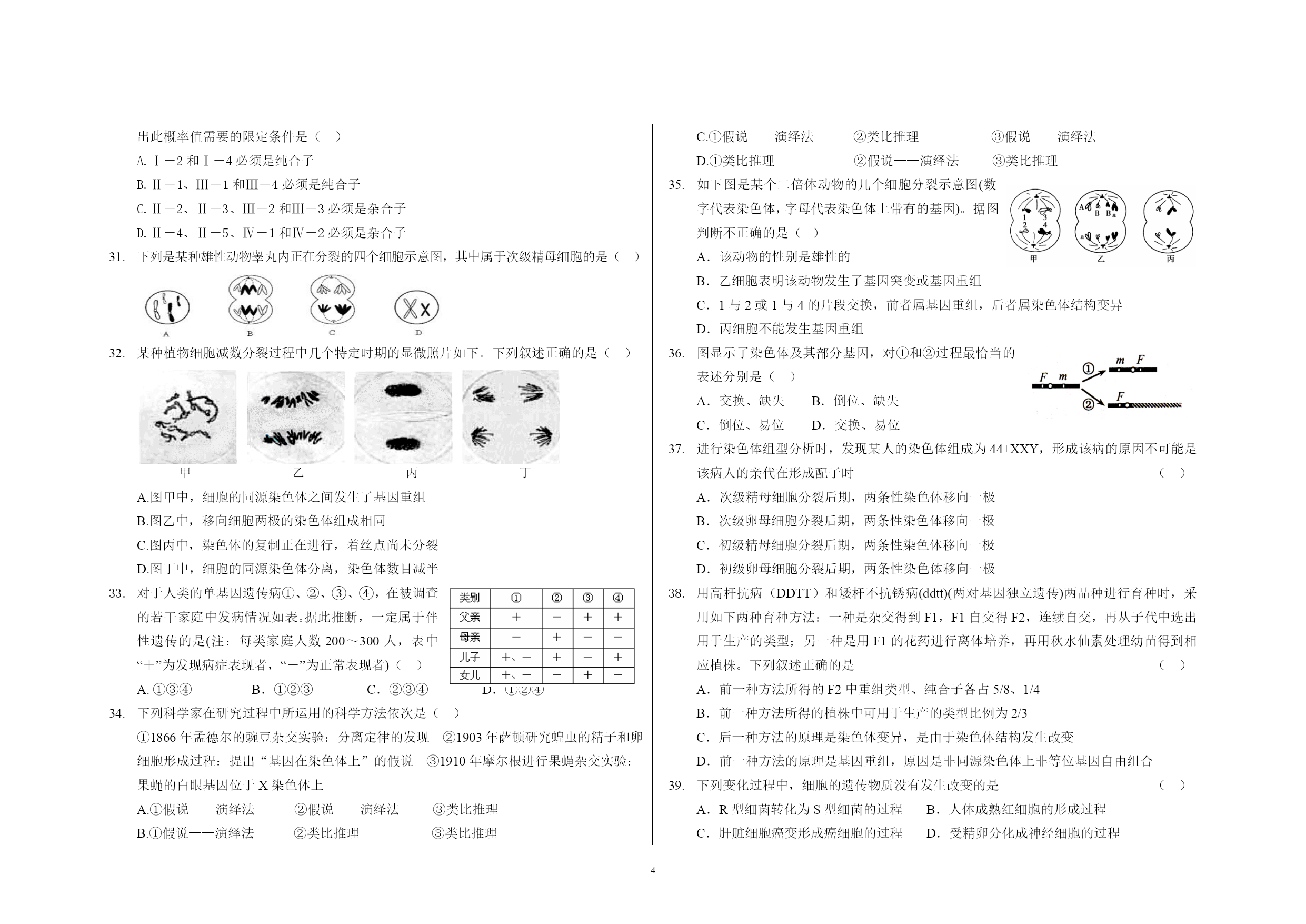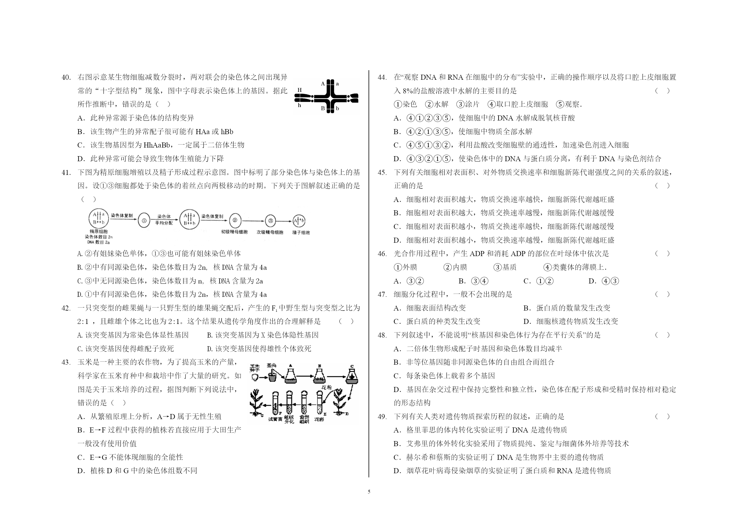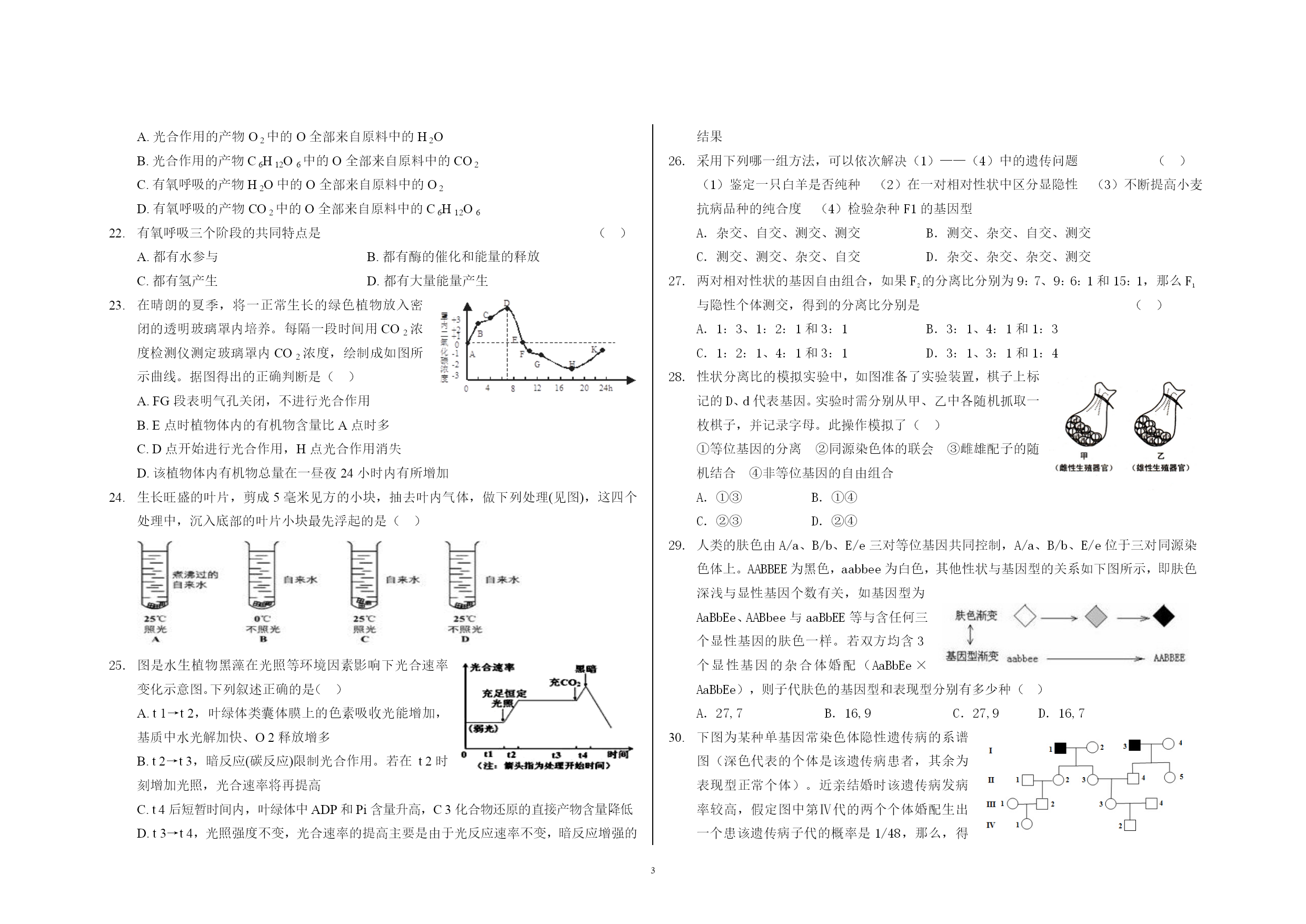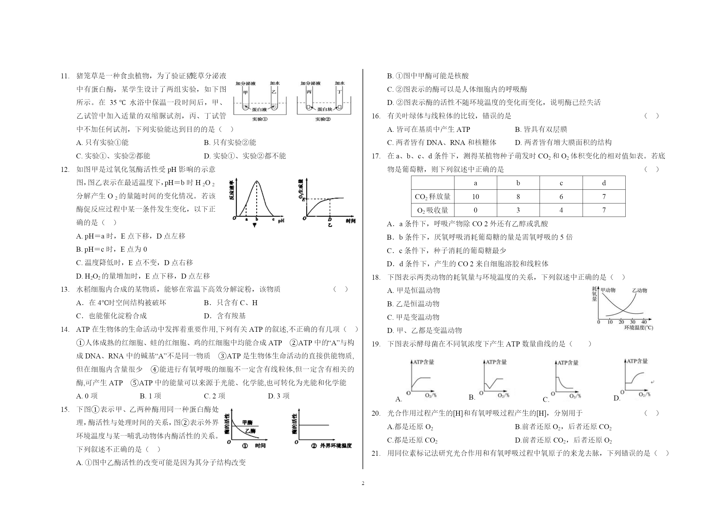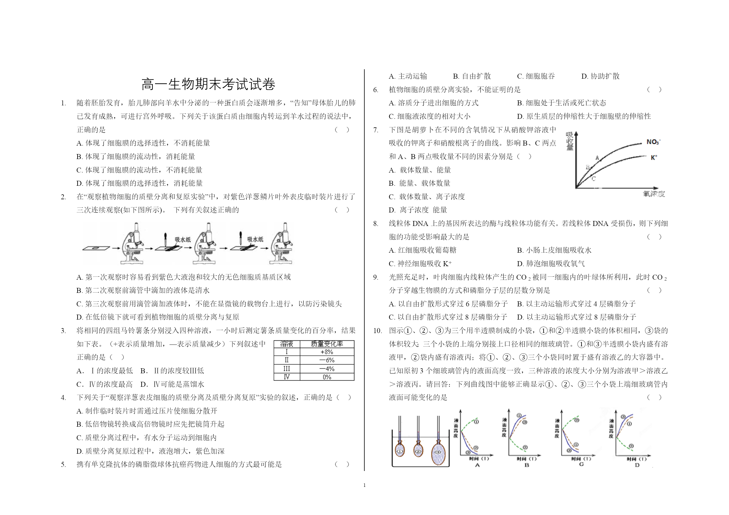 高一生物期末考试试卷 随着胚胎发育,胎儿肺部向HYPERLINK"http://www.21cnjy.com"羊水中分泌的一种蛋白质会逐渐增多,“告知”母体胎儿的肺已发育成熟,可进行宫外呼吸。下列关于该蛋白质由细胞内转运到羊水过程的说法中,正确的是 ()A.体现了细胞膜的选择透性,不消耗能量B.体现了细胞膜的流动性,消耗能量C.体现了细胞膜的流动性,不消耗能量D.体现了细胞膜的选择透性,消耗能量 在“观察植物细胞的质壁分HYPERLINK"http://www.21cnjy.com"离和复原实验”中,对紫色洋葱鳞片叶外表皮临时装片进行了三次连续观察(如下图所示)。下列有关叙述正确的 ()A.第一次观察时容易看到紫色大液泡和较大的无色细胞质基质区域B.第二次观察前滴管中滴加的液体是清水C.第三次观察前用滴管滴加液体时,不能在显微镜的载物台上进行,以防污染镜头D.在低倍镜下就可看到植物细胞的质壁分离与复原 将相同的四组马铃薯条分别浸HYPERLINK"http://www.21cnjy.com"入四种溶液,一小时后测定薯条质量变化的百分率,结果如下表。(+表示质量增加,—表示质量减少)下列叙述中正确的是()A.Ⅰ的浓度最低 B.Ⅱ的浓度较Ⅲ低C.Ⅳ的浓度最高 D.Ⅳ可能是蒸馏水 下列关于“观察洋葱表皮细胞的质壁分离及质壁分离复原”实验的叙述,正确的是()A.制作临时装片时需通过压片使细胞分散开B.低倍物镜转换成高倍物镜时应先把镜筒升起C.质壁分离过程中,有水分子运动到细胞内D.质壁分离复原过程中,液泡增大,紫色加深 携有单克隆抗体的磷脂微球体抗癌药物进人细胞的方式最可能是 ()A.主动运输 B.自由扩散 C.细胞胞吞 D.协助扩散 植物细胞的质壁分离实验,不能证明的是 ()A.溶质分子进出细胞的方式 B.细胞处于生活或死亡状态C.细胞液浓度的相对大小 D.原生质层的伸缩性大于细胞壁的伸缩性 K+ NO3- 下图是胡萝卜在不同的含氧情况下从硝酸钾溶液中吸收的钾离子和硝酸根离子的曲线。影响B、C两点和A、B两点吸收量不同的因素分别是()A.载体数量、能量 B.能量、载体数量C.载体数量、离子浓度D.离子浓度能量 线粒体DNA上的基因所表达的酶与线粒体功能有关。若线粒体DNA受损伤,则下列细胞的功能受影响最大的是 ()A.红细胞吸收葡萄糖 B.小肠上皮细胞吸收水 C.神经细胞吸收K+ D.肺泡细胞吸收氧气 光照充足时HYPERLINK"http://www.21cnjy.com",叶肉细胞内线粒体产生的CO2被同一细胞内的叶绿体所利用,此时CO2分子穿越生物膜的方式和磷脂分子层的层数分别是 ()A.以自由扩散形式穿过6层磷脂分子 B.以主动运输形式穿过4层磷脂分子C.以自由扩散形式穿过8层磷脂分子 D.以主动运输形式穿过8层磷脂分子 图示①、②、③为三个用半透膜制成的小袋,①和②半透膜小袋的体积相同,③袋的体积较大;三个小袋的上端分别接上口径相同的细玻璃管。①和③半透膜小袋内盛有溶液甲,②袋内盛有溶液丙;将①、②、③三个小袋同时置于盛有溶液乙的大容器中。已知原初3个细玻璃管内的液面高度一致,三种溶液的浓度大小分别为溶液甲>溶液乙>溶液丙。请回答:下列曲线图中能够正确显示①、②、③三个小袋上端细玻璃管内液面可能变化的是 () 猪笼草是一种食虫植物HYPERLINK"http://www.21cnjy.com",为了验证猪笼草分泌液中有蛋白酶,某学生设计了两组实验,如下图所示。在35℃水浴中保温一段时间后,甲、乙试管中加入适量的双缩脲试剂,丙、丁试管中不加任何试剂,下列实验能达到目的的是()A.只有实验①能 B.只有实验②能C.实验①、实验②都能 D.实验①、实验②都不能 如图甲是过氧化氢HYPERLINK"http://www.21cnjy.com"酶活性受pH影响的示意图,图乙表示在最适温度下,pH=b时H2O2分解产生O2的量随时间的变化情况。若该酶促反应过程中某一条件发生变化,以下正确的是()A.pH=a时,E点下移,D点左移B.pH=c时,E点为0C.温度降低时,E点不变,D点右移D.H2O2的量增加时,E点下移,D点左移 水稻细胞内合成的某物质,能够在常温下高效分解淀粉,该物质 ()A.在4℃时空间结构被HYPERLINK"http://www.21cnjy.com"破坏 B.只含有C、HC.也能催化淀粉合成 D.含有羧基 ATP在生物体的生命活动中发挥着重要作用,下列有关ATP的叙述,不正确的有几项()①人体成熟的红细胞、蛙的红细胞、HYPERLINK"http://www.21cnjy.com"鸡的红细胞中均能