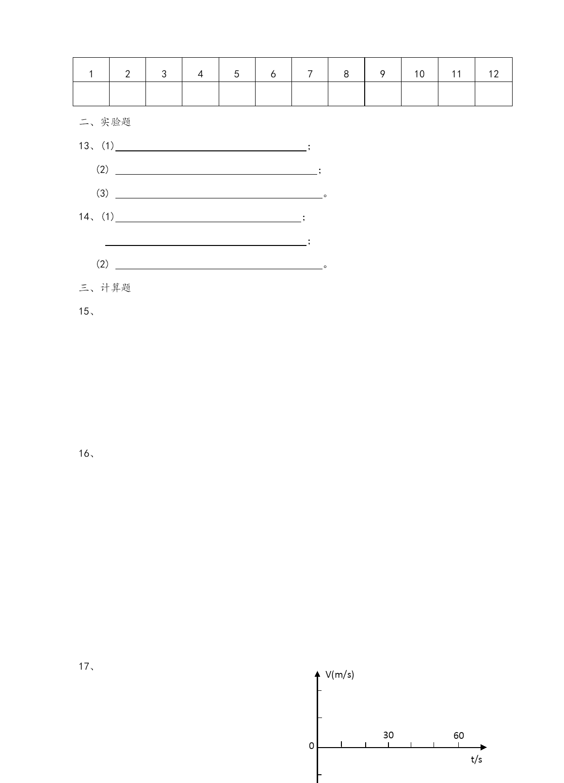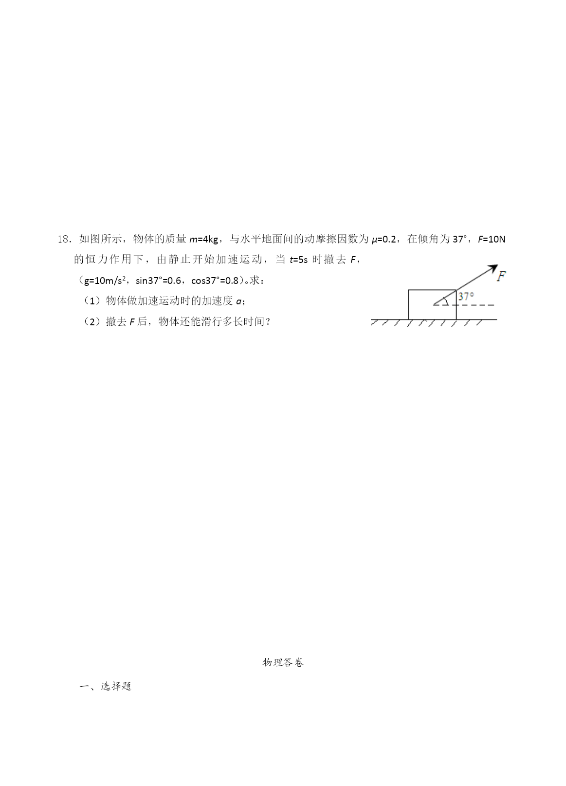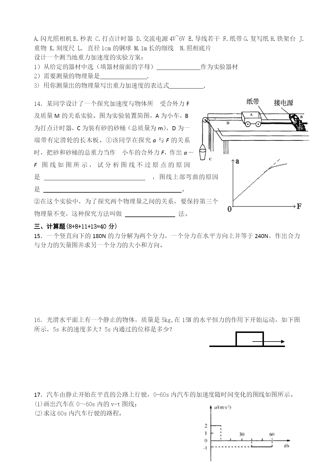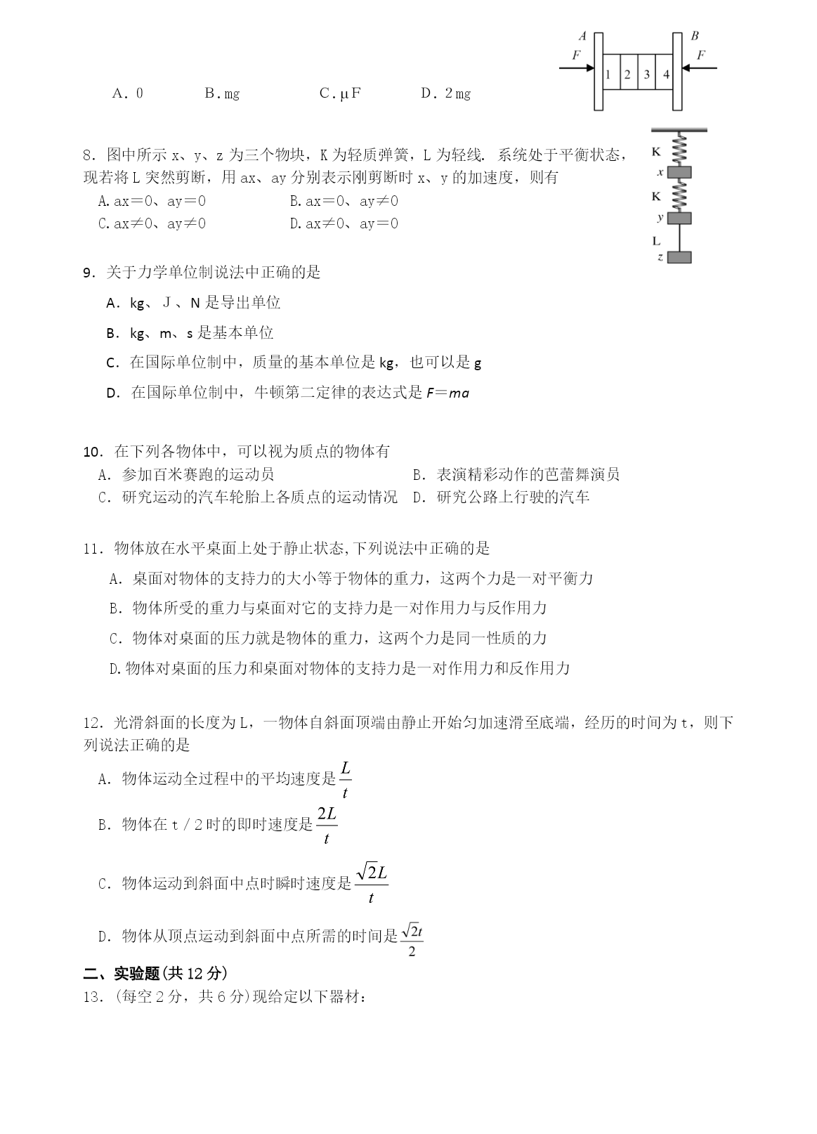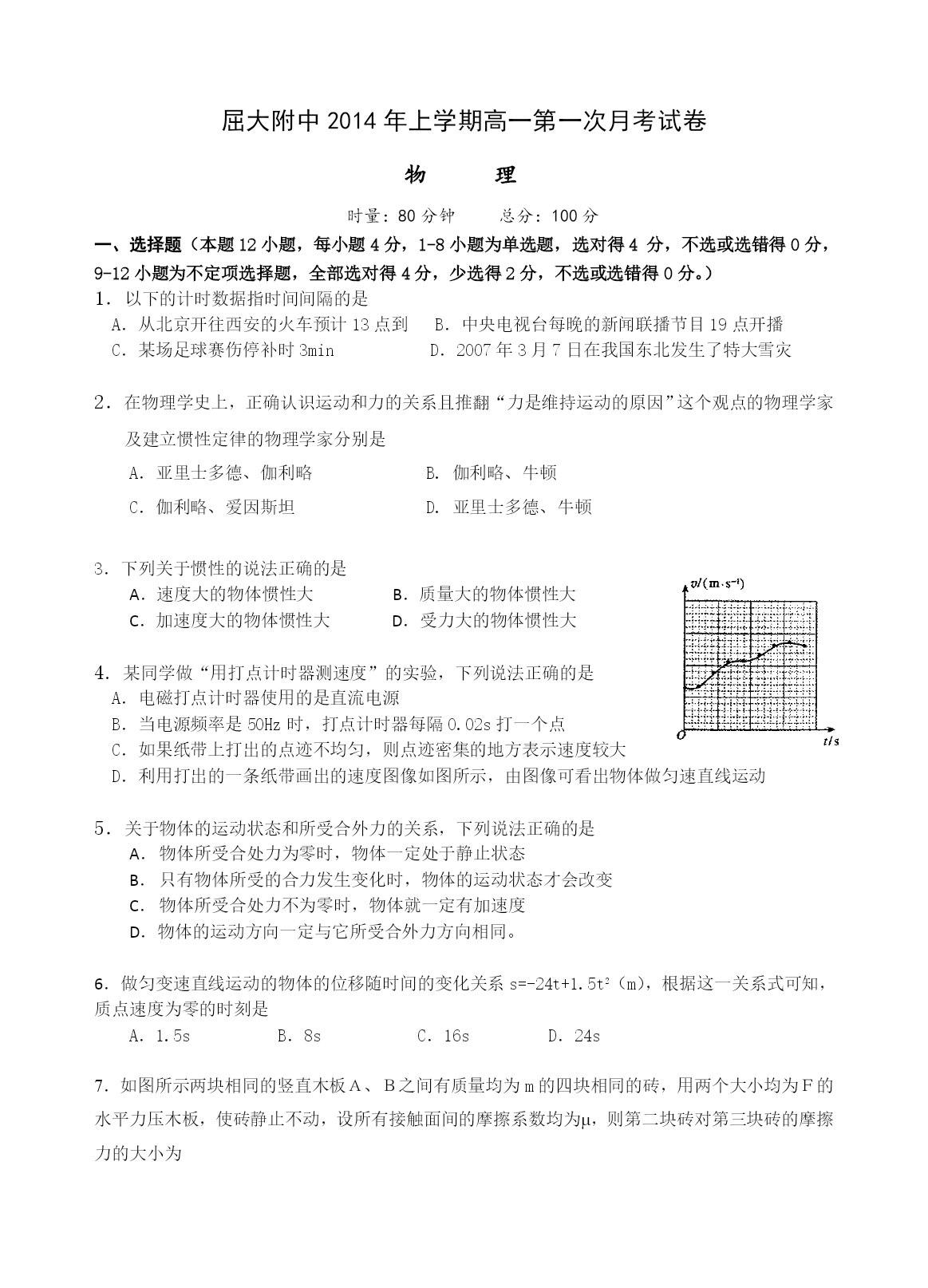 屈大附中2014年上学期高一第一次月考试卷 物理 时量:80分钟总分:100分 一、选择题(本题12小题,每小题4分,1-8小题为单选题,选对得4分,不选或选错得0分,9-12小题为不定项选择题,全部选对得4分,少选得2分,不选或选错得0分。) 1.以下的计时数据指时间间隔的是 A.从北京开往西安的火车预计13点到B.中央电视台每晚的新闻联播节目19点开播 C.某场足球赛伤停补时3minD.2007年3月7日在我国东北发生了特大雪灾 2.在物理学史上,正确认识运动和力的关系且推翻“力是维持运动的原因”这个观点的物理学家及建立惯性定律的物理学家分别是 A.亚里士多德、伽利略B.伽利略、牛顿 C.伽利略、爱因斯坦D.亚里士多德、牛顿 3.下列关于惯性的说法正确的是 A.速度大的物体惯性大B.质量大的物体惯性大 C.加速度大的物体惯性大D.受力大的物体惯性大 4.某同学做“用打点计时器测速度”的实验,下列说法正确的是 A.电磁打点计时器使用的是直流电源 B.当电源频率是50Hz时,打点计时器每隔O.02s打一个点 C.如果纸带上打出的点迹不均匀,则点迹密集的地方表示速度较大 D.利用打出的一条纸带画出的速度图像如图所示,由图像可看出物体做匀速直线运动 5.关于物体的运动状态和所受合外力的关系,下列说法正确的是 物体所受合处力为零时,物体一定处于静止状态 只有物体所受的合力发生变化时,物体的运动状态才会改变 物体所受合处力不为零时,物体就一定有加速度 D.物体的运动方向一定与它所受合外力方向相同。 6.做匀变速直线运动的物体的位移随时间的变化关系s=-24t+1.5t2(m),根据这一关系式可知,质点速度为零的时刻是 A.1.5sB.8sC.16sD.24s 7.如图所示两块相同的竖直木板A、B之间有质量均为m的四块相同的砖,用两个大小均为F的水平力压木板,使砖静止不动,设所有接触面间的摩擦系数均为,则第二块砖对第三块砖的摩擦力的大小为 A.0B.mgC.FD.2mg 8.图中所示x、y、z为三个物块,K为轻质弹簧,L为轻线.系统处于平衡状态,现若将L突然剪断,用ax、ay分别表示刚剪断时x、y的加速度,则有 A.ax=0、ay=0B.ax=0、ay≠0 C.ax≠0、ay≠0D.ax≠0、ay=0 9.关于力学单位制说法中正确的是 A.kg、J、N是导出单位 B.kg、m、s是基本单位 C.在国际单位制中,质量的基本单位是kg,也可以是g D.在国际单位制中,牛顿第二定律的表达式是F=ma 10.在下列各物体中,可以视为质点的物体有 A.参加百米赛跑的运动员B.表演精彩动作的芭蕾舞演员 C.研究运动的汽车轮胎上各质点的运动情况D.研究公路上行驶的汽车 11.物体放在水平桌面上处于静止状态,下列说法中正确的是 A.桌面对物体的支持力的大小等于物体的重力,这两个力是一对平衡力 B.物体所受的重力与桌面对它的支持力是一对作用力与反作用力 C.物体对桌面的压力就是物体的重力,这两个力是同一性质的力 D.物体对桌面的压力和桌面对物体的支持力是一对作用力和反作用力 12.光滑斜面的长度为L,一物体自斜面顶端由静止开始匀加速滑至底端,经历的时间为t,则下列说法正确的是 A.物体运动全过程中的平均速度是 B.物体在t/2时的即时速度是 C.物体运动到斜面中点时瞬时速度是 D.物体从顶点运动到斜面中点所需的时间是 二、实验题(共12分) 13.(每空2分,共6分)现给定以下器材: A.闪光照相机B.秒表C.打点计时器D.交流电源4V~6VE.导线若干F.纸带G.复写纸H.铁架台J.重物K.刻度尺L.直径1cm的钢球M.1m长的细线N.照相底片 设计一个测当地重力加速度的实验方案: 1)从给定的器材中选(填器材前面的字母)______________作为实验器材 2)需要测量的物理量是_______________. 3)用你测量出的物理量写出重力加速度的表达式___________. 14.某同学设计了一个探究加速度与物体所受合外力F及质量M的关系实验。图为实验装置简图,A为小车,B为打点计时器,C为装有砂的砂桶(总质量为m),D为一端带有定滑轮的长木板。①该同学在探究a与F的关系时,把砂和砂桶的总重力当作小车的合外力F,作出a-F图线如图所示,试分析图线不过原点的原因是,图线上部弯曲的原因是。 ②在这个实验中,为了探究两个物理量之间的关系,要保持第三个物理量不变,这种探究方法叫做法。 三、计算题(8+8+11+13=40分) 15.一个竖直向下的180N的力分解为两个分力,一个分力在水平方向上并等于240N,作出合力与分力的矢量图并求另一个分力的大小和方向。 16.光滑水平面上有一个静止的物体,质量是