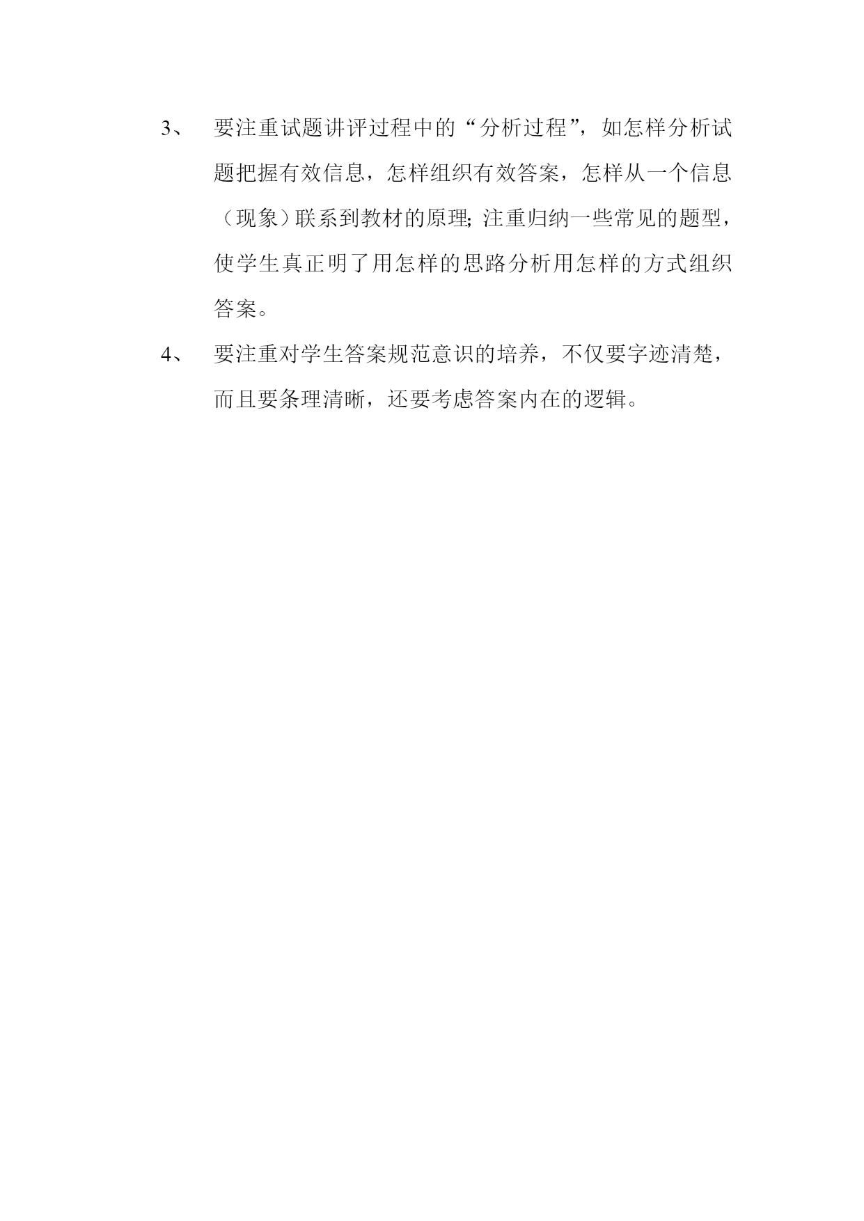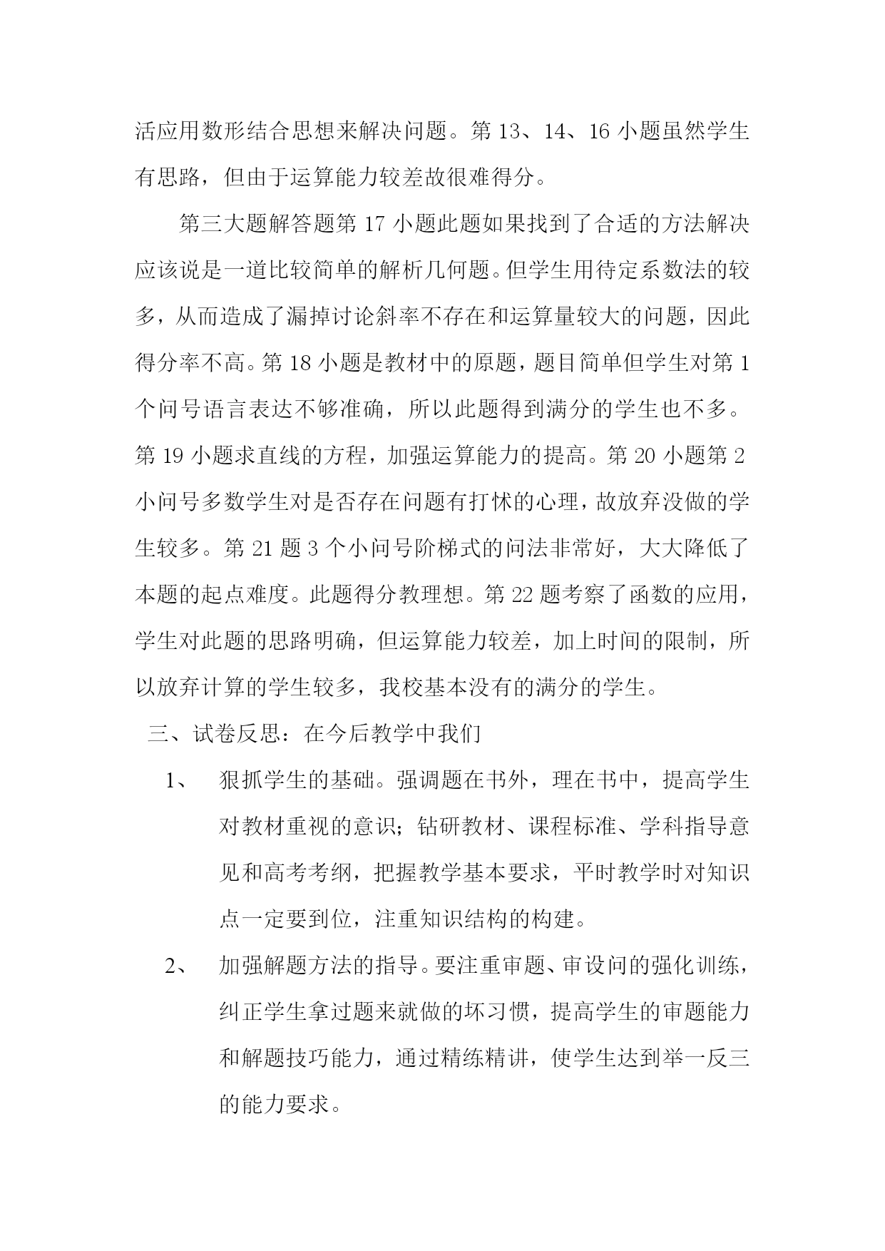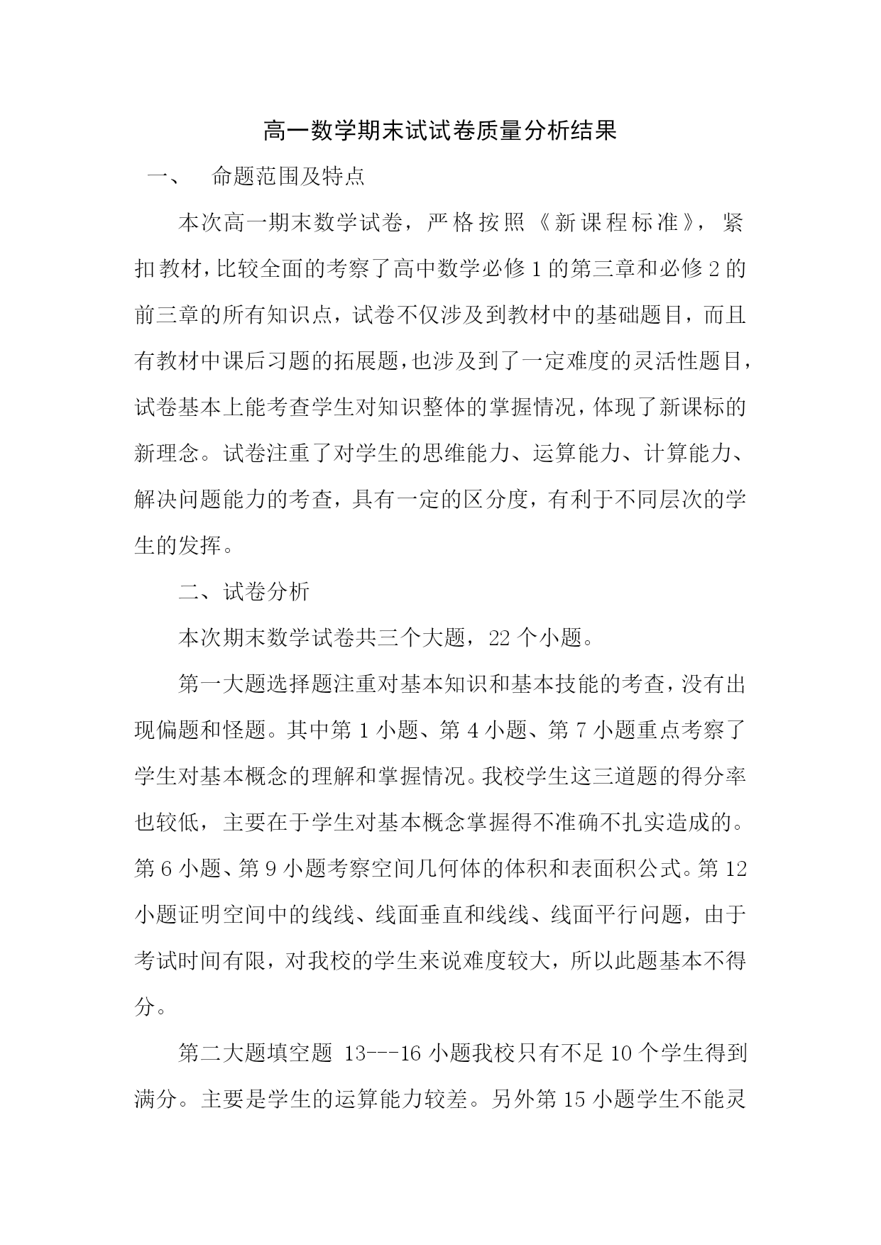 高一数学期末试试卷质量分析结果 命题范围及特点 本次高一期末数学试卷,严格按照《新课程标准》,紧扣教材,比较全面的考察了高中数学必修1的第三章和必修2的前三章的所有知识点,试卷不仅涉及到教材中的基础题目,而且有教材中课后习题的拓展题,也涉及到了一定难度的灵活性题目,试卷基本上能考查学生对知识整体的掌握情况,体现了新课标的新理念。试卷注重了对学生的思维能力、运算能力、计算能力、解决问题能力的考查,具有一定的区分度,有利于不同层次的学生的发挥。 二、试卷分析 本次期末数学试卷共三个大题,22个小题。 第一大题选择题注重对基本知识和基本技能的考查,没有出现偏题和怪题。其中第1小题、第4小题、第7小题重点考察了学生对基本概念的理解和掌握情况。我校学生这三道题的得分率也较低,主要在于学生对基本概念掌握得不准确不扎实造成的。第6小题、第9小题考察空间几何体的体积和表面积公式。第12小题证明空间中的线线、线面垂直和线线、线面平行问题,由于考试时间有限,对我校的学生来说难度较大,所以此题基本不得分。 第二大题填空题13---16小题我校只有不足10个学生得到满分。主要是学生的运算能力较差。另外第15小题学生不能灵活应用数形结合思想来解决问题。第13、14、16小题虽然学生有思路,但由于运算能力较差故很难得分。 第三大题解答题第17小题此题如果找到了合适的方法解决应该说是一道比较简单的解析几何题。但学生用待定系数法的较多,从而造成了漏掉讨论斜率不存在和运算量较大的问题,因此得分率不高。第18小题是教材中的原题,题目简单但学生对第1个问号语言表达不够准确,所以此题得到满分的学生也不多。第19小题求直线的方程,加强运算能力的提高。第20小题第2小问号多数学生对是否存在问题有打怵的心理,故放弃没做的学生较多。第21题3个小问号阶梯式的问法非常好,大大降低了本题的起点难度。此题得分教理想。第22题考察了函数的应用,学生对此题的思路明确,但运算能力较差,加上时间的限制,所以放弃计算的学生较多,我校基本没有的满分的学生。 三、试卷反思:在今后教学中我们 狠抓学生的基础。强调题在书外,理在书中,提高学生对教材重视的意识;钻研教材、课程标准、学科指导意见和高考考纲,把握教学基本要求,平时教学时对知识点一定要到位,注重知识结构的构建。 加强解题方法的指导。要注重审题、审设问的强化训练,纠正学生拿过题来就做的坏习惯,提高学生的审题能力和解题技巧能力,通过精练精讲,使学生达到举一反三的能力要求。 要注重试题讲评过程中的“分析过程”,如怎样分析试题把握有效信息,怎样组织有效答案,怎样从一个信息(现象)联系到教材的原理;注重归纳一些常见的题型,使学生真正明了用怎样的思路分析用怎样的方式组织答案。 要注重对学生答案规范意识的培养,不仅要字迹清楚,而且要条理清晰,还要考虑答案内在的逻辑。
