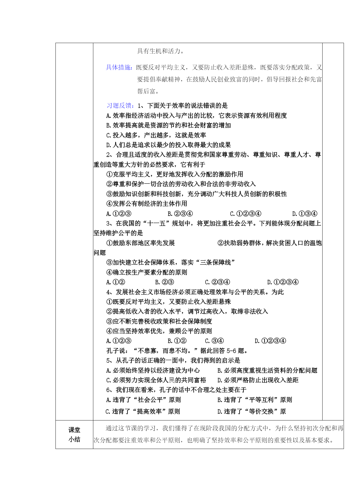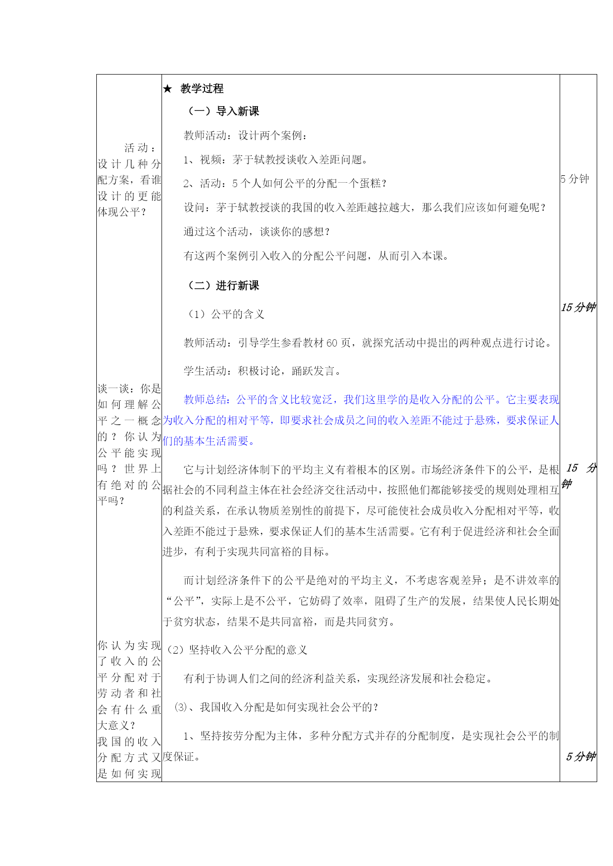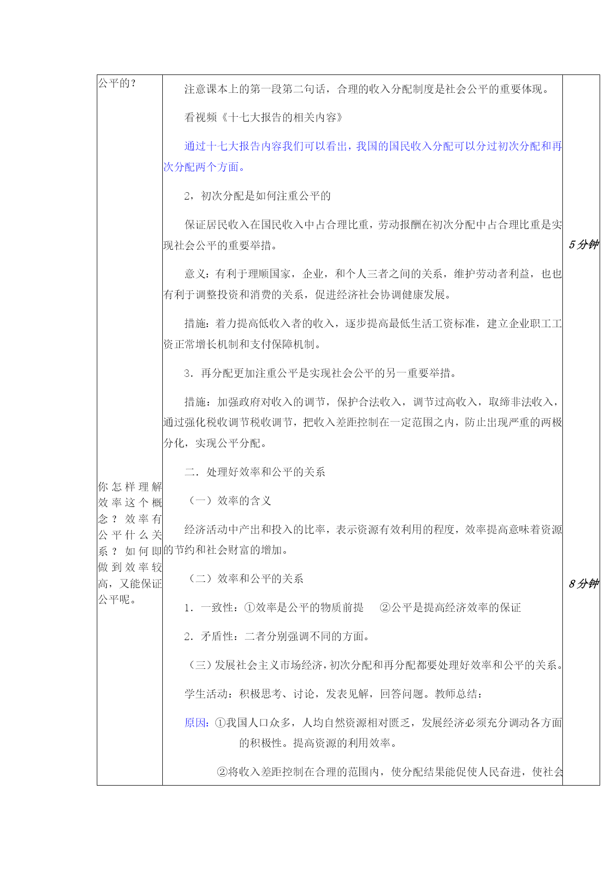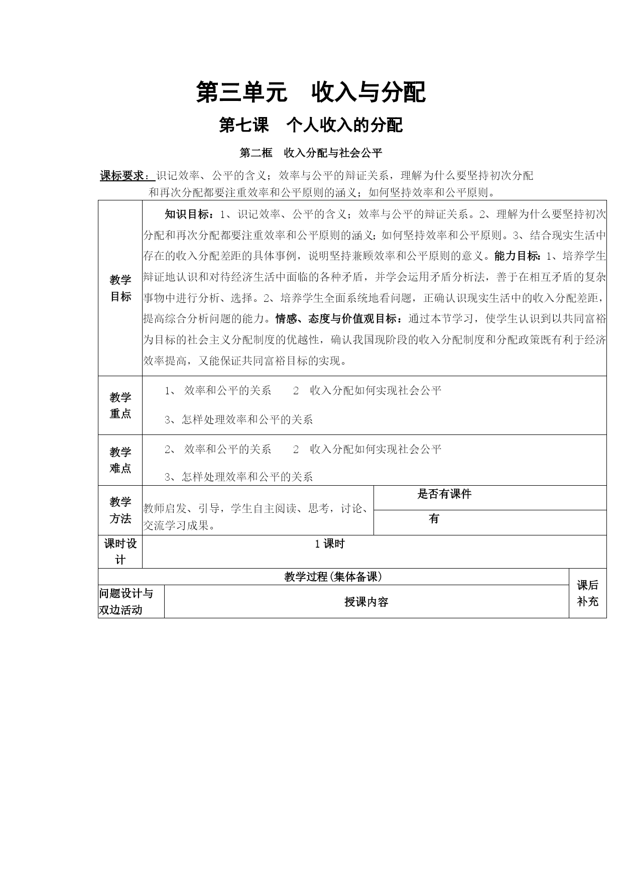 第三单元收入与分配 第七课个人收入的分配 第二框收入分配与社会公平 课标要求:识记效率、公平的含义;效率与公平的辩证关系,理解为什么要坚持初次分配和再次分配都要注重效率和公平原则的涵义;如何坚持效率和公平原则。 教学 目标知识目标:1、识记效率、公平的含义;效率与公平的辩证关系。2、理解为什么要坚持初次分配和再次分配都要注重效率和公平原则的涵义;如何坚持效率和公平原则。3、结合现实生活中存在的收入分配差距的具体事例,说明坚持兼顾效率和公平原则的意义。能力目标:1、培养学生辩证地认识和对待经济生活中面临的各种矛盾,并学会运用矛盾分析法,善于在相互矛盾的复杂事物中进行分析、选择。2、培养学生全面系统地看问题,正确认识现实生活中的收入分配差距,提高综合分析问题的能力。情感、态度与价值观目标:通过本节学习,使学生认识到以共同富裕为目标的社会主义分配制度的优越性,确认我国现阶段的收入分配制度和分配政策既有利于经济效率提高,又能保证共同富裕目标的实现。教学 重点效率和公平的关系2收入分配如何实现社会公平 3、怎样处理效率和公平的关系教学 难点效率和公平的关系2收入分配如何实现社会公平 3、怎样处理效率和公平的关系教学 方法教师启发、引导,学生自主阅读、思考,讨论、交流学习成果。是否有课件有课时设计1课时教学过程(集体备课)课后 补充问题设计与 双边活动授课内容 活动:设计几种分配方案,看谁设计的更能体现公平? 谈一谈:你是如何理解公平之一概念的?你认为公平能实现吗?世界上有绝对的公平吗? 你认为实现了收入的公平分配对于劳动者和社会有什么重大意义? 我国的收入分配方式又是如何实现公平的? 你怎样理解效率这个概念?效率有公平什么关系?如何即做到效率较高,又能保证公平呢。 教学过程 (一)导入新课 教师活动:设计两个案例: 1、视频:茅于轼教授谈收入差距问题。 2、活动:5个人如何公平的分配一个蛋糕? 设问:茅于轼教授谈的我国的收入差距越拉越大,那么我们应该如何避免呢? 通过这个活动,谈谈你的感想? 有这两个案例引入收入的分配公平问题,从而引入本课。 (二)进行新课 (1)公平的含义 教师活动:引导学生参看教材60页,就探究活动中提出的两种观点进行讨论。 学生活动:积极讨论,踊跃发言。 教师总结:公平的含义比较宽泛,我们这里学的是收入分配的公平。它主要表现为收入分配的相对平等,即要求社会成员之间的收入差距不能过于悬殊,要求保证人们的基本生活需要。 它与计划经济体制下的平均主义有着根本的区别。市场经济条件下的公平,是根据社会的不同利益主体在社会经济交往活动中,按照他们都能够接受的规则处理相互的利益关系,在承认物质差别性的前提下,尽可能使社会成员收入分配相对平等,收入差距不能过于悬殊,要求保证人们的基本生活需要。它有利于促进经济和社会全面进步,有利于实现共同富裕的目标。 而计划经济条件下的公平是绝对的平均主义,不考虑客观差异;是不讲效率的“公平”,实际上是不公平,它妨碍了效率,阻碍了生产的发展,结果使人民长期处于贫穷状态,结果不是共同富裕,而是共同贫穷。 (2)坚持收入公平分配的意义 有利于协调人们之间的经济利益关系,实现经济发展和社会稳定。 (3)、我国收入分配是如何实现社会公平的? 1、坚持按劳分配为主体,多种分配方式并存的分配制度,是实现社会公平的制度保证。 注意课本上的第一段第二句话,合理的收入分配制度是社会公平的重要体现。 看视频《十七大报告的相关内容》 通过十七大报告内容我们可以看出,我国的国民收入分配可以分过初次分配和再次分配两个方面。 2,初次分配是如何注重公平的 保证居民收入在国民收入中占合理比重,劳动报酬在初次分配中占合理比重是实现社会公平的重要举措。 意义:有利于理顺国家,企业,和个人三者之间的关系,维护劳动者利益,也也有利于调整投资和消费的关系,促进经济社会协调健康发展。 措施:着力提高低收入者的收入,逐步提高最低生活工资标准,建立企业职工工资正常增长机制和支付保障机制。 3.再分配更加注重公平是实现社会公平的另一重要举措。 措施:加强政府对收入的调节,保护合法收入,调节过高收入,取缔非法收入,通过强化税收调节税收调节,把收入差距控制在一定范围之内,防止出现严重的两极分化,实现公平分配。 二.处理好效率和公平的关系 (一)效率的含义 经济活动中产出和投入的比率,表示资源有效利用的程度,效率提高意味着资源的节约和社会财富的增加。 (二)效率和公平的关系 1.一致性:①效率是公平的物质前提②公平是提高经济效率的保证 2.矛盾性:二者分别强调不同的方面。 (三)发展社会主义市场经济,初次分配和再分配都要处理好效率