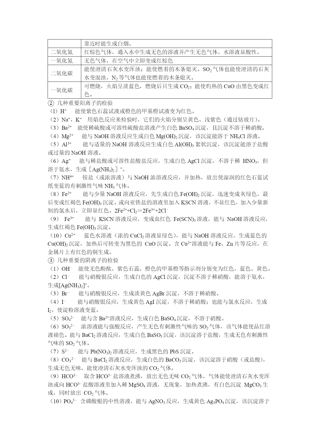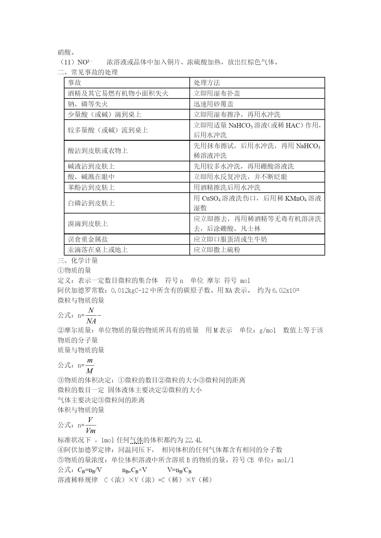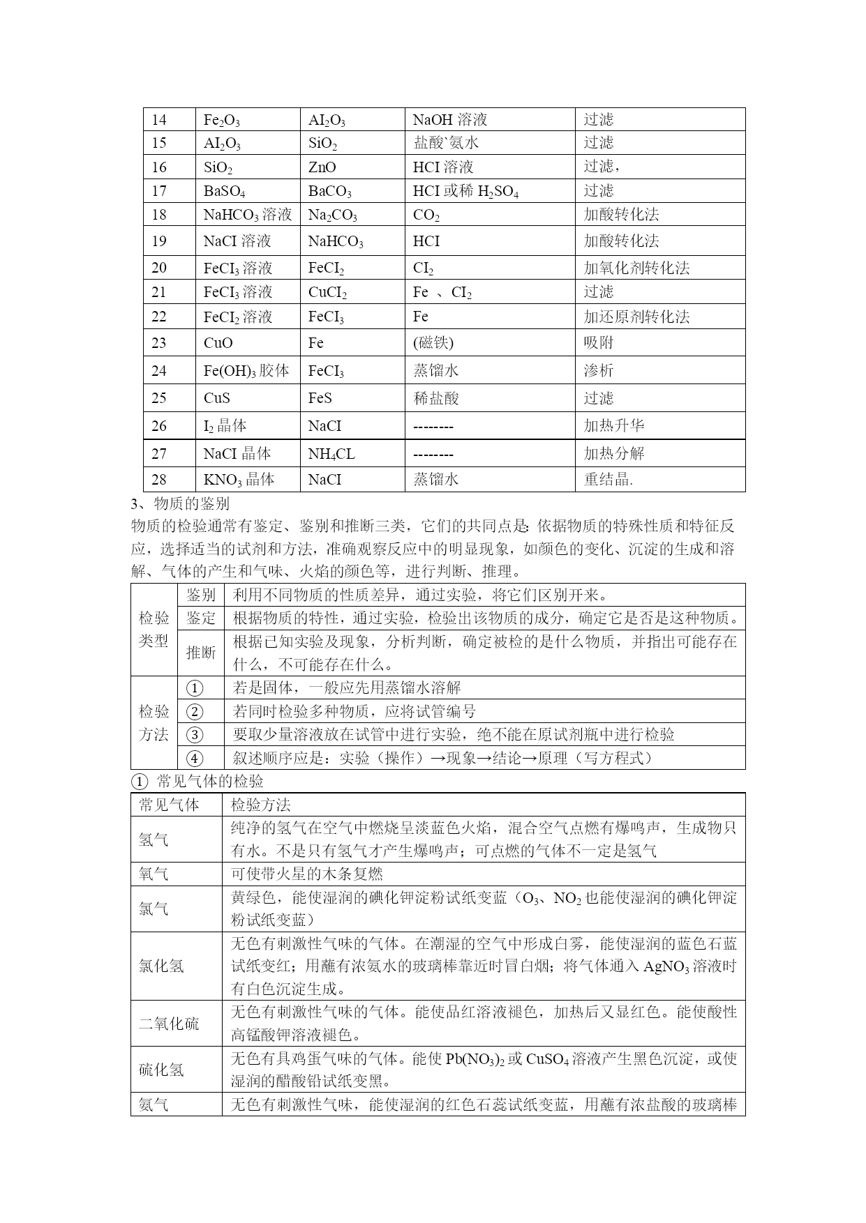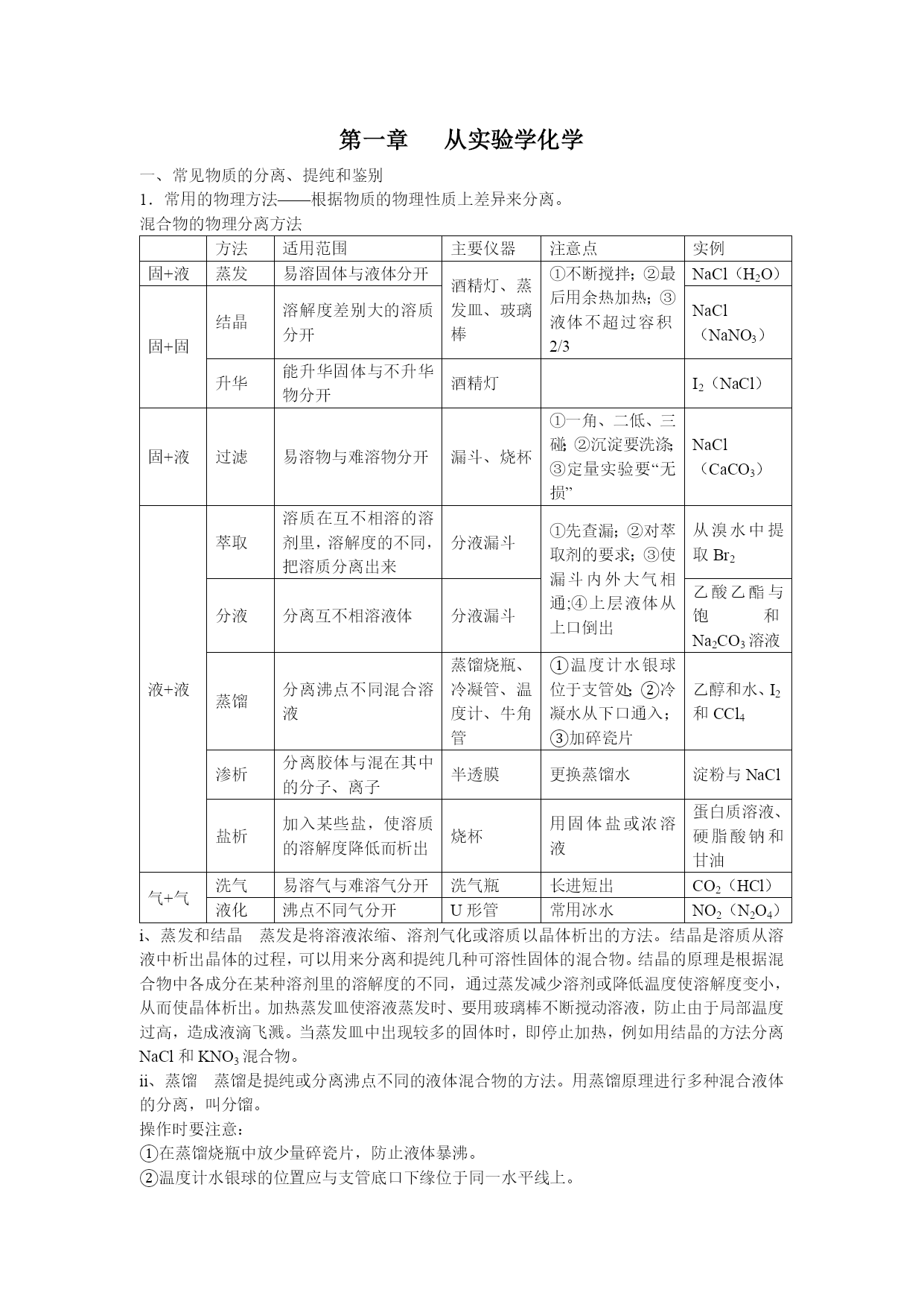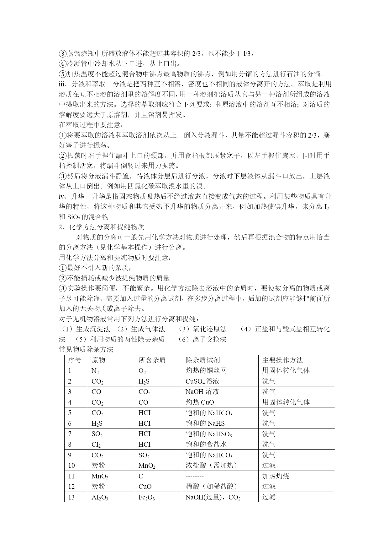 第一章从实验学化学 一、常见物质的分离、提纯和鉴别 1.常用的物理方法——根据物质的物理性质上差异来分离。 混合物的物理分离方法 方法适用范围主要仪器注意点实例固+液蒸发易溶固体与液体分开酒精灯、蒸发皿、玻璃棒①不断搅拌;②最后用余热加热;③液体不超过容积2/3NaCl(H2O)固+固结晶溶解度差别大的溶质分开NaCl(NaNO3)升华能升华固体与不升华物分开酒精灯I2(NaCl)固+液过滤易溶物与难溶物分开漏斗、烧杯①一角、二低、三碰;②沉淀要洗涤;③定量实验要“无损”NaCl(CaCO3)液+液萃取溶质在互不相溶的溶剂里,溶解度的不同,把溶质分离出来分液漏斗①先查漏;②对萃取剂的要求;③使漏斗内外大气相通;④上层液体从上口倒出从溴水中提取Br2分液分离互不相溶液体分液漏斗乙酸乙酯与饱和Na2CO3溶液蒸馏分离沸点不同混合溶液蒸馏烧瓶、冷凝管、温度计、牛角管①温度计水银球位于支管处;②冷凝水从下口通入;③加碎瓷片乙醇和水、I2和CCl4渗析分离胶体与混在其中的分子、离子半透膜更换蒸馏水淀粉与NaCl盐析加入某些盐,使溶质的溶解度降低而析出烧杯用固体盐或浓溶液蛋白质溶液、硬脂酸钠和甘油气+气洗气易溶气与难溶气分开洗气瓶长进短出CO2(HCl)液化沸点不同气分开U形管常用冰水NO2(N2O4)=1\*romani、蒸发和结晶蒸发是将溶液浓缩、溶剂气化或溶质以晶体析出的方法。结晶是溶质从溶液中析出晶体的过程,可以用来分离和提纯几种可溶性固体的混合物。结晶的原理是根据混合物中各成分在某种溶剂里的溶解度的不同,通过蒸发减少溶剂或降低温度使溶解度变小,从而使晶体析出。加热蒸发皿使溶液蒸发时、要用玻璃棒不断搅动溶液,防止由于局部温度过高,造成液滴飞溅。当蒸发皿中出现较多的固体时,即停止加热,例如用结晶的方法分离NaCl和KNO3混合物。 =2\*romanii、蒸馏蒸馏是提纯或分离沸点不同的液体混合物的方法。用蒸馏原理进行多种混合液体的分离,叫分馏。 操作时要注意: ①在蒸馏烧瓶中放少量碎瓷片,防止液体暴沸。 ②温度计水银球的位置应与支管底口下缘位于同一水平线上。 ③蒸馏烧瓶中所盛放液体不能超过其容积的2/3,也不能少于l/3。 ④冷凝管中冷却水从下口进,从上口出。 ⑤加热温度不能超过混合物中沸点最高物质的沸点,例如用分馏的方法进行石油的分馏。 =3\*romaniii、分液和萃取分液是把两种互不相溶、密度也不相同的液体分离开的方法。萃取是利用溶质在互不相溶的溶剂里的溶解度不同,用一种溶剂把溶质从它与另一种溶剂所组成的溶液中提取出来的方法。选择的萃取剂应符合下列要求:和原溶液中的溶剂互不相溶;对溶质的溶解度要远大于原溶剂,并且溶剂易挥发。 在萃取过程中要注意: ①将要萃取的溶液和萃取溶剂依次从上口倒入分液漏斗,其量不能超过漏斗容积的2/3,塞好塞子进行振荡。 ②振荡时右手捏住漏斗上口的颈部,并用食指根部压紧塞子,以左手握住旋塞,同时用手指控制活塞,将漏斗倒转过来用力振荡。 ③然后将分液漏斗静置,待液体分层后进行分液,分液时下层液体从漏斗口放出,上层液体从上口倒出。例如用四氯化碳萃取溴水里的溴。 =4\*romaniv、升华升华是指固态物质吸热后不经过液态直接变成气态的过程。利用某些物质具有升华的特性,将这种物质和其它受热不升华的物质分离开来,例如加热使碘升华,来分离I2和SiO2的混合物。 2、化学方法分离和提纯物质 对物质的分离可一般先用化学方法对物质进行处理,然后再根据混合物的特点用恰当的分离方法(见化学基本操作)进行分离。 用化学方法分离和提纯物质时要注意: ①最好不引入新的杂质; ②不能损耗或减少被提纯物质的质量 ③实验操作要简便,不能繁杂。用化学方法除去溶液中的杂质时,要使被分离的物质或离子尽可能除净,需要加入过量的分离试剂,在多步分离过程中,后加的试剂应能够把前面所加入的无关物质或离子除去。 对于无机物溶液常用下列方法进行分离和提纯: (1)生成沉淀法(2)生成气体法(3)氧化还原法(4)正盐和与酸式盐相互转化法(5)利用物质的两性除去杂质(6)离子交换法 常见物质除杂方法 序号原物所含杂质除杂质试剂主要操作方法1N2O2灼热的铜丝网用固体转化气体2CO2H2SCuSO4溶液洗气3COCO2NaOH溶液洗气4CO2CO灼热CuO用固体转化气体5CO2HCI饱和的NaHCO3洗气6H2SHCI饱和的NaHS洗气7SO2HCI饱和的NaHSO3洗气8CI2HCI饱和的食盐水洗气9CO2SO2饱和的NaHCO3洗气10炭粉MnO2浓盐酸(需加热)过滤11MnO2C--------加热灼烧12炭粉CuO稀酸(如稀盐酸)过滤13AI2O3Fe2O3NaOH(过量),CO2过滤14Fe2O3AI2O3NaOH溶液过