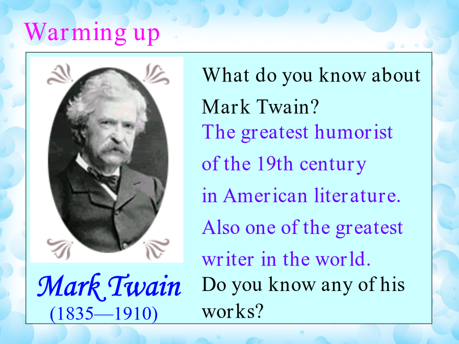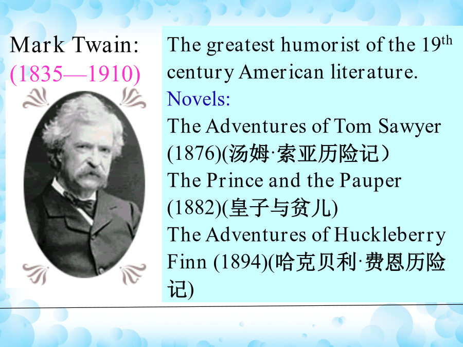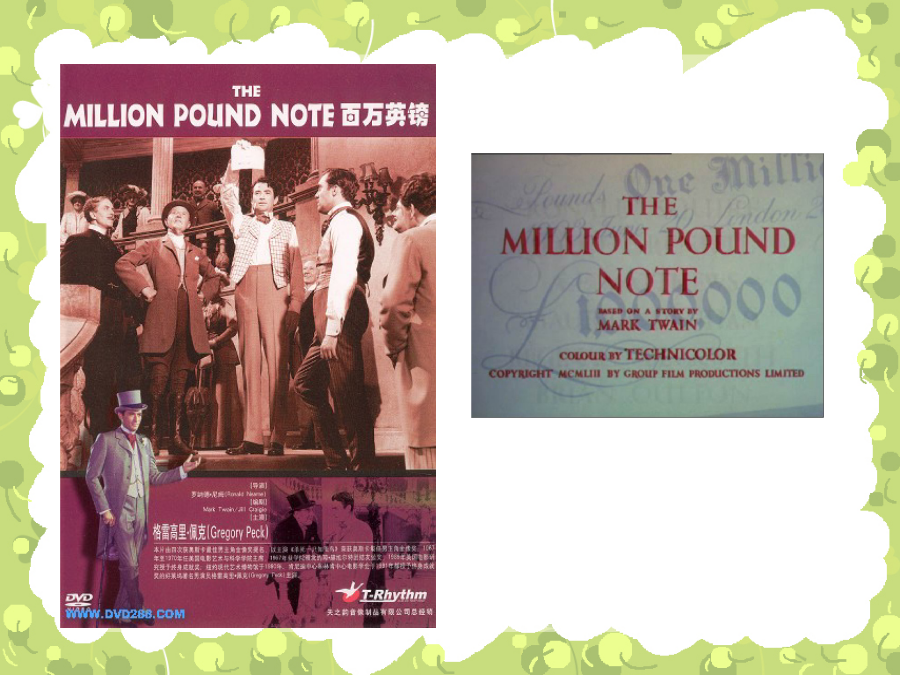 Thegreatesthumoristofthe19thcenturyAmericanliterature. Novels: TheAdventuresofTomSawyer(1876)(汤姆·索亚历险记) ThePrinceandthePauper(1882)(皇子与贫儿) TheAdventuresofHuckleberryFinn(1894)(哈克贝利·费恩历险记)hismasterpiecesTheAdventuresof HuckleberryFinn《哈克贝利·弗恩历 险记》TheAdventuresof TomSawyer 《汤姆·索亚历险记》1.RunningforGovernorRealnameofMTPlacewherehegrewupSummaryofTheadventuresofTomSawyer ThisisastoryaboutayoungboynamedTomSawyerwhoisverymischievousandlikestogoonadventures.HeliveswithhisAuntPollyandhishalf-brotherSid.TomalsohadtwofriendsnamedJoeHarperandHuckleberryFin.BeckyThatcherisTom’sgirlfriendandInjunJoeisthetown’sthiefandmurder.Thisstorytakesplaceinthemid-1800sinasmallvillageinMissourialongtheMississippiRiver.SummaryofTheadventuresofHuckleberryFinn Beforethenovelbegins,HuckFinnhasledalifeofabsolutefreedom.HisparentsareeitherdeadorabsentandsoHuckisnotusedtofollowinganyrules.Themostimportantpartofhischaracterishisdesiretosaveablackslave,Jim,andfreehimfromslavery.HerunsawaywithJimwhomheseesasapersonandnotproperty.TheyescapedowntherivergivingHuckleberrytimetothinkofthebestthingtodo.hisshortstoriesSupposearichpersongivesyouamillionpoundbank-note,whatwillyoudowithit?Givethereasons.Somenewwordsspot:发现 accountfor:导致,作出解释 charity:施舍 byaccident:偶然Wearegoingtostudytheplay“TheMillionPoundBankNote”byMarkTwain.First,let’slearnsomethingaboutplay.什么是戏剧语言? 戏剧语言包括人物语言和舞台说明。舞台说明是写在剧本每一幕的开端,结尾和对话中间的说明性的文字,内容包括人物表、时间、地点、服装、道具、布景、以及人物的表情、动作、上下场等,它具有增强舞台气氛,烘托人物心情,展示人物性格,推动情节展开等多种作用。Listentothetapeandreadtheplay,andfindouttheconflictintheplay.Afterthat,answerthequestions.Characters(人物):Whoisthemaincharacter?Wheredoeshecomefrom?Whenandwheredidthestoryhappen? WherearethecharactersinScene3? WhathappenedinScene3?Readtheplaycarefullyandanswerthefollowingquestions:5.WhydothebrothersgiveHenrythe letter? 6.Canyoufindtheexamplesofpolite requests? 7.Canyouguesswhythebrothersdonot permitHenrytoopentheletteruntil2 o’clock?1.WheredoesHenryAdamscomefrom?DoesheknowmuchaboutLondon? 2.WhyisHenrylostinLondon? Howdidhegetther