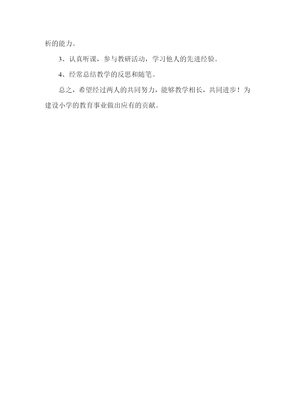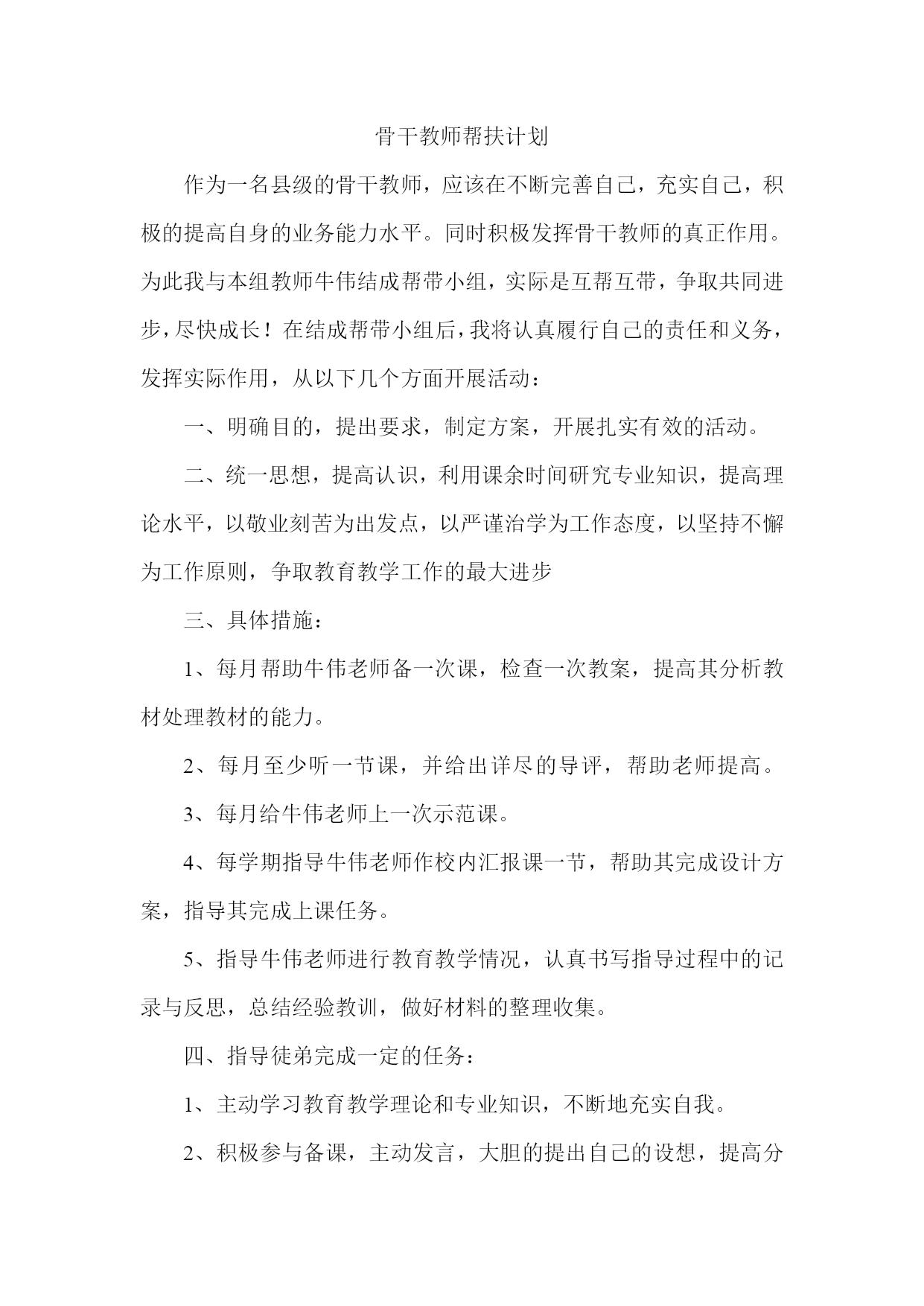 骨干教师帮扶计划 作为一名县级的骨干教师,应该在不断完善自己,充实自己,积极的提高自身的业务能力水平。同时积极发挥骨干教师的真正作用。为此我与本组教师牛伟结成帮带小组,实际是互帮互带,争取共同进步,尽快成长!在结成帮带小组后,我将认真履行自己的责任和义务,发挥实际作用,从以下几个方面开展活动: 一、明确目的,提出要求,制定方案,开展扎实有效的活动。 二、统一思想,提高认识,利用课余时间研究专业知识,提高理论水平,以敬业刻苦为出发点,以严谨治学为工作态度,以坚持不懈为工作原则,争取教育教学工作的最大进步 三、具体措施: 1、每月帮助牛伟老师备一次课,检查一次教案,提高其分析教材处理教材的能力。 2、每月至少听一节课,并给出详尽的导评,帮助老师提高。3、每月给牛伟老师上一次示范课。 4、每学期指导牛伟老师作校内汇报课一节,帮助其完成设计方案,指导其完成上课任务。 5、指导牛伟老师进行教育教学情况,认真书写指导过程中的记录与反思,总结经验教训,做好材料的整理收集。 四、指导徒弟完成一定的任务: 1、主动学习教育教学理论和专业知识,不断地充实自我。 2、积极参与备课,主动发言,大胆的提出自己的设想,提高分析的能力。 3、认真听课,参与教研活动,学习他人的先进经验。 4、经常总结教学的反思和随笔。 总之,希望经过两人的共同努力,能够教学相长,共同进步!为建设小学的教育事业做出应有的贡献。