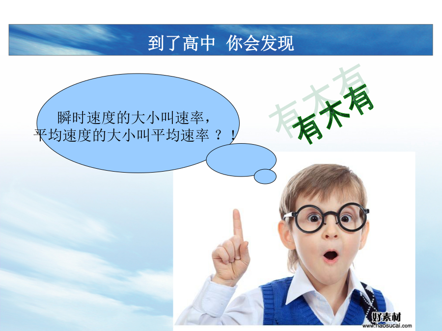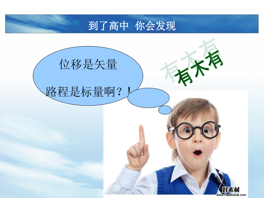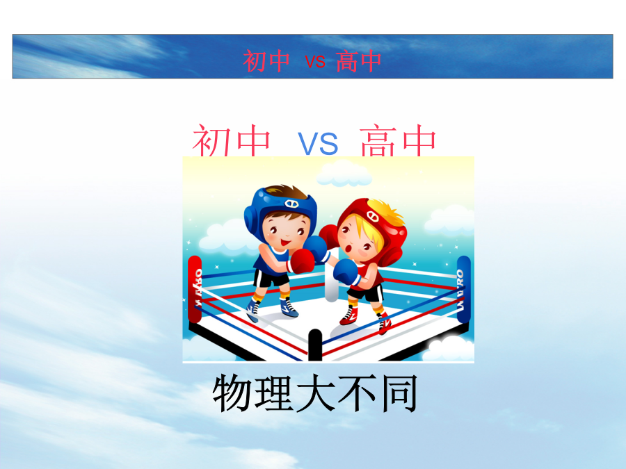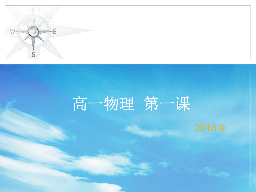 高一物理第一课初中VS高中到了高中你会发现到了高中你会发现到了高中,你会发现初中物理VS高中物理到了高中,努力学习物理吧! 这将改变你的一生!物理——见物思理身边的物理现象身边的物理现象阅读思考问题: 1.物理学有哪几个分支学科? 2.从时间尺度上看,物理学的研究对象从秒到秒.共跨越了多少个数量级? 3.从空间尺度上看,物理学的研究对象从米到米.共跨越了多少个数量级? 物理的起源物理的起源物理学是一门实验科学物理学与其他科学航天与空间技术2、带电粒子在电场磁场中的偏转规律在科学技术中的应用。电视机显像管等。(学完带电粒子在电场磁场中的偏转会了解了。)3、核物理的研究使放射线的应用成为可能。医疗上的放疗。在医疗上还有很多,如用于治疗脑瘤的刀。如核磁共振,超声波,X光机等。4、20世纪初相对论和量子力学的建立,诞生了近代物理,开创了微电子技术的时代。半导体芯片。电子计算机。没有量子力学也就没有现代科技。半导体芯片5、20世纪60年代,激光器诞生。激光物理的进展使激光在制造业、医疗技术和国防工业中的得到了广泛的应用。大家熟悉的微机光盘就是用激光读的。光导纤维等。激光技术6、20世纪80年代高温超导体的研究取得了重大突破,为超导体的实际应用开辟了道路。磁悬浮列车等。80年代,我国高温超导的研究走在世界的前列。7、20世纪90年代发展起来的纳米技术,使人们可以按照自己的需要设计并重新排列原子或者原子团,使其具有人们希望的特性。纳米材料的应用现是一个新兴的又应用很广泛的前沿技术。秦始皇兵马俑的色彩防脱。镶嵌了48个Fe原子的Cu表面的 扫描隧道显微镜照片。48个Fe原子 形成“电子围栏”,围栏中的电子形成驻波:8、生命科学的发展也离不开物理学。脱氧核糖核酸(DNA)是存在于细胞核中的一种重要物质,它是储存和传递生命信息的物质基础。1953年生物学家沃森和物理学家克里克利用X射线衍射的方法在卡文迪许(著名实验物理学家)的实验室成功地测定了DNA的双螺旋结构。物理学与思维观念1、地心说——日心说2、机械决定论——蝴蝶效应洛仑兹的“蝴蝶效应”: 一只蝴蝶在巴西扇动翅膀,有可能在美国得克萨斯引起一场龙卷风。丢失一个钉子,坏了一只蹄铁; 坏了一只蹄铁,折了一匹战马; 折了一匹战马,伤了一位骑士; 伤了一位骑士,输了一场战斗; 输了一场战斗,亡了一个帝国。怎样学好物理?物理课的学习要求物理课的学习要求物理课的学习要求如何学好高中物理 总结: 物理学是研究物质结构和运动基本规律的学科物理学最新物理学科的科学素养要求:欢迎大家正式进入高中物理的学习! 祝大家都能学好物理!!