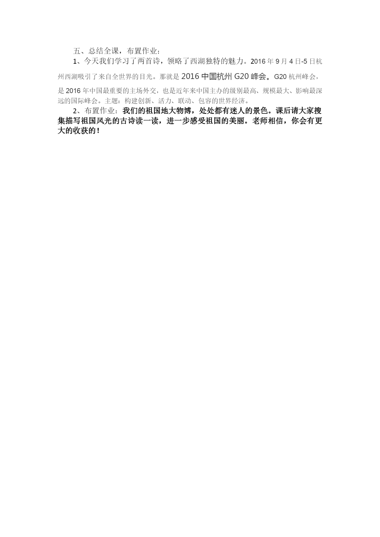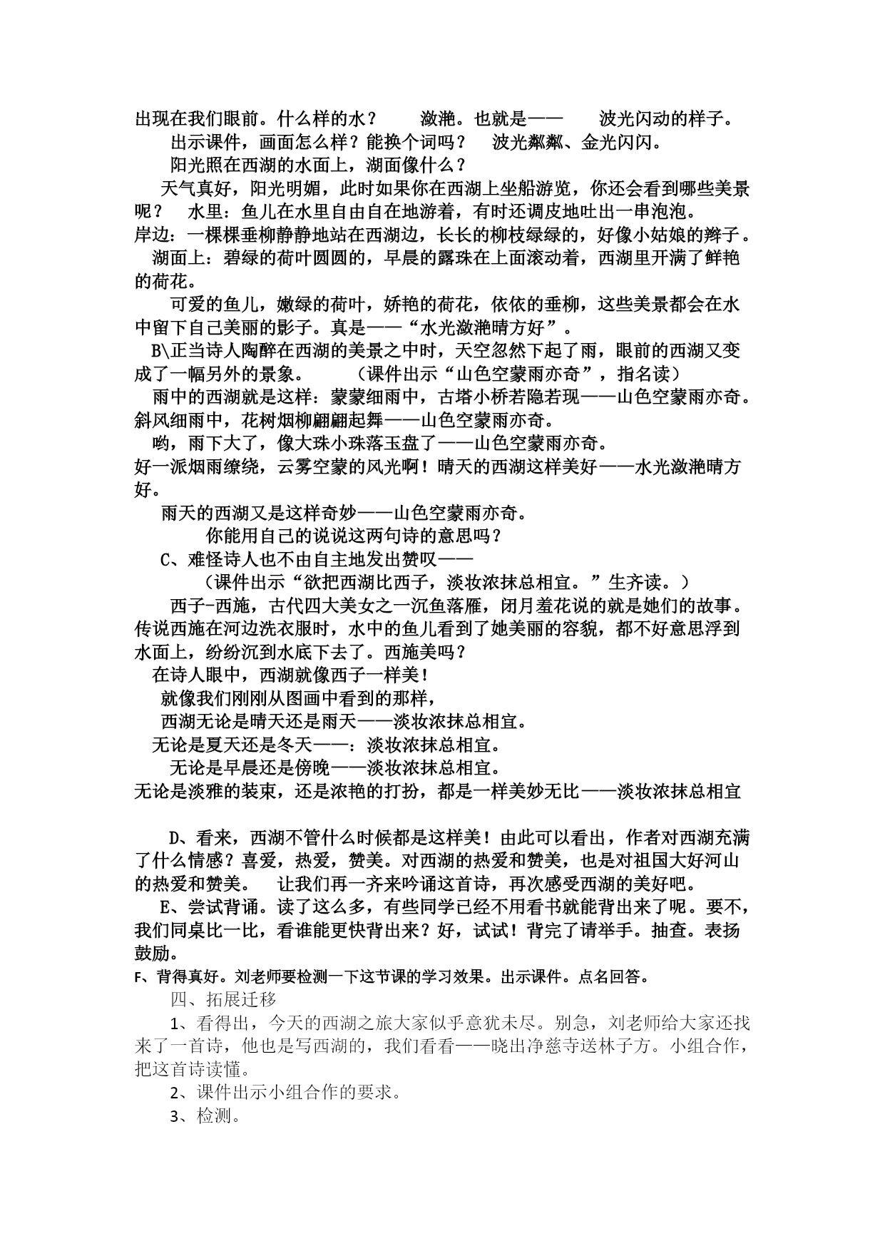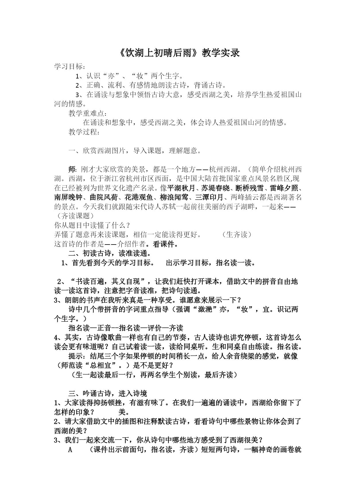 《饮湖上初晴后雨》教学实录 学习目标:1、认识“亦”、“妆”两个生字。2、正确、流利、有感情地朗读古诗,背诵古诗。3、在诵读与想象中领悟古诗大意,感受西湖之美,培养学生热爱祖国山河的情感。教学重难点:在诵读和想象中,感受西湖之美,体会诗人热爱祖国山河的情感。教学过程:一、欣赏西湖图片,导入课题,理解题意。 师:刚才大家欣赏的美景,都是一个地方——杭州西湖。(简单介绍杭州西湖。西湖,位于浙江省杭州市区西面,是中国大陆首批国家重点风景名胜区,现在已经被列为世界文化遗产名录。像HYPERLINK"http://baike.so.com/doc/4705226-4919545.html"\t"http://baike.so.com/doc/_blank"平湖秋月、HYPERLINK"http://baike.so.com/doc/4719274-10470814.html"\t"http://baike.so.com/doc/_blank"苏堤春晓、HYPERLINK"http://baike.so.com/doc/4699189-4913370.html"\t"http://baike.so.com/doc/_blank"断桥残雪、HYPERLINK"http://baike.so.com/doc/5336205-5571644.html"\t"http://baike.so.com/doc/_blank"雷峰夕照、HYPERLINK"http://baike.so.com/doc/5568726-5783903.html"\t"http://baike.so.com/doc/_blank"南屏晚钟、HYPERLINK"http://baike.so.com/doc/5355182-5590647.html"\t"http://baike.so.com/doc/_blank"曲院风荷、HYPERLINK"http://baike.so.com/doc/5430417-5668679.html"\t"http://baike.so.com/doc/_blank"花港观鱼、HYPERLINK"http://baike.so.com/doc/6416405-6630077.html"\t"http://baike.so.com/doc/_blank"柳浪闻莺、HYPERLINK"http://baike.so.com/doc/2835640-2992495.html"\t"http://baike.so.com/doc/_blank"三潭印月、两峰插云都是西湖著名的景点。今天我们就跟随宋代诗人苏轼一起前往美丽的西子湖畔,一起来——(齐读课题) 你从题目中读懂了什么?弄懂了题意再来读课题,相信一定能读得更好。(生齐读)这首诗的作者是——介绍作者。看课件。二、初读古诗,读准读通。1、首先看到今天的学习目标。出示学习目标,指名读一读。 2、“书读百遍,其义自现”,让我们赶快打开课本,借助文中的拼音自由地读一读这首诗,注意把字音读准,把诗句读通。3、朗朗的书声在我听来真是一种享受。谁愿意来展示一下?诗中几个带拼音的字词重点指导(强调“潋滟”亦,“妆”,宜。识记两个生字。)指名读—正音--指名读—评价—齐读 4、其实,古诗像歌曲一样也有自己的节奏,古人读诗也讲究停顿,这首诗怎么读会更有味道呢?自己试着读一读,读给同桌听。生和同桌自由练读。指名读。提示:结尾三个字如果停顿的时间稍长一点,给人余音绕梁的感觉,就像(师范读“总相宜”。)是不是更好?(生一起读最后一行,再两名学生个别读,最后齐读)三、吟诵古诗,进入诗境1、大家读得抑扬顿挫,有滋有味了。在我们一遍遍的诵读中,西湖给你留下了怎样的印象?美。2、请大家借助文中的插图和注释默读古诗,看看诗句中哪些景物让你体会到了西湖的美?3、我们一起来交流一下,你从诗句中哪些地方感受到了西湖很美?A(课件出示前面句,指名读,齐读)短短两句诗,一幅神奇的画卷就出现在我们眼前。什么样的水?潋滟。也就是——波光闪动的样子。出示课件,画面怎么样?能换个词吗?波光粼粼、金光闪闪。阳光照在西湖的水面上,湖面像什么? 天气真好,阳光明媚,此时如果你在西湖上坐船游览,你还会看到哪些美景呢?水里:鱼儿在水里自由自在地游着,有时还调皮地吐出一串泡泡。岸边:一棵棵垂柳静静地站在西湖边,长长的柳枝绿绿的,好像小姑娘的辫子。湖面上:碧绿的荷叶圆圆的,早晨的露珠在上面滚动着,西湖里开满了鲜艳的荷花。可爱的鱼儿,嫩绿的荷叶,娇艳的荷花,依依的垂柳,这些美景都会在水中留下自己美丽的影子。真是——“水光潋滟晴方好”。B\正当诗人陶醉在西湖的美景之中时,天空忽然下起了雨,眼前的西湖又变成了一幅