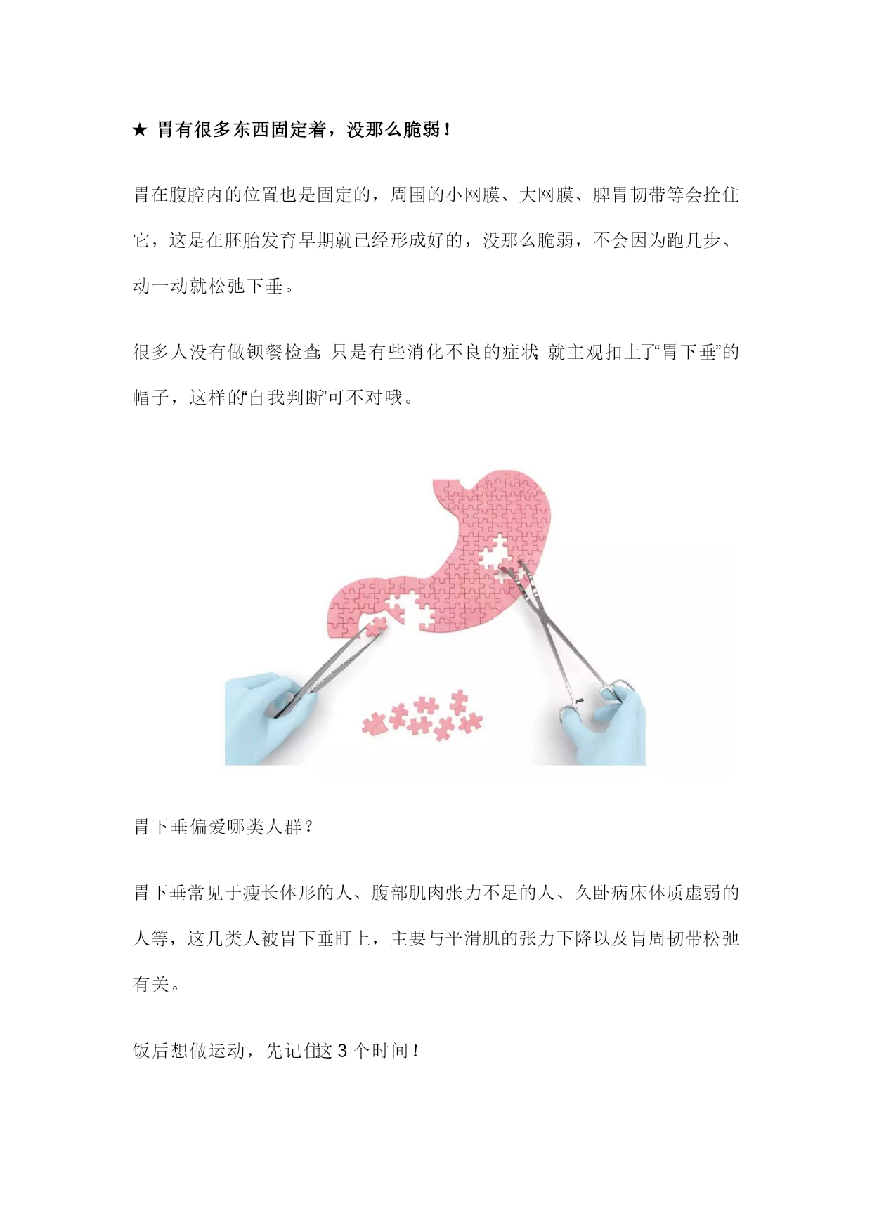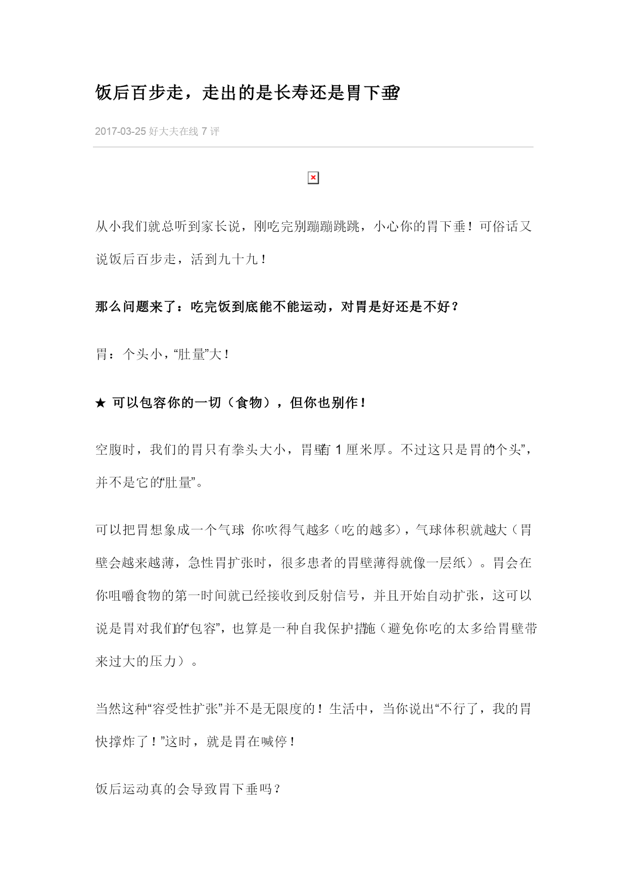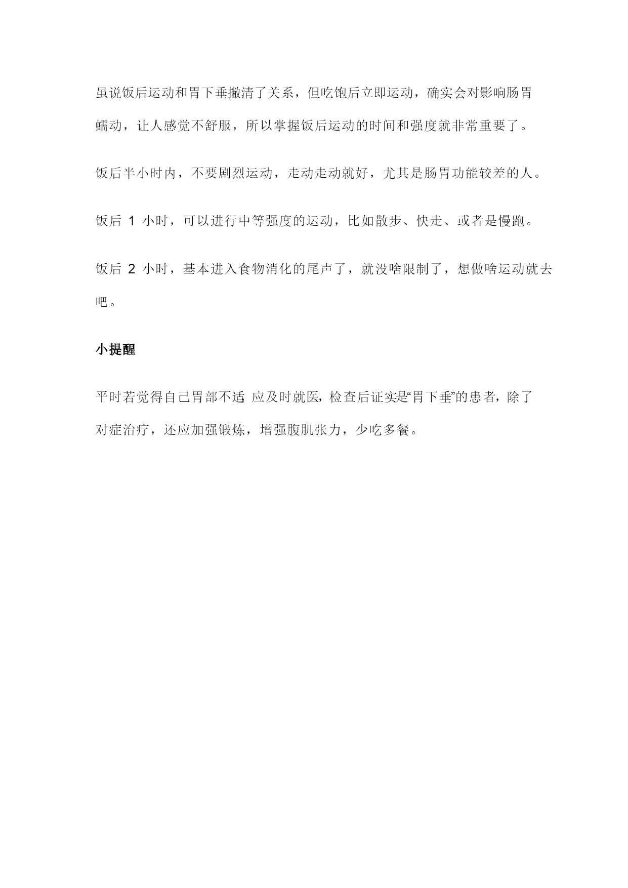 饭后百步走,走出的是长寿还是胃下垂? 2017-03-25好大夫在线7评 从小我们就总听到家长说,刚吃完别蹦蹦跳跳,小心你的胃下垂!可俗话又说饭后百步走,活到九十九! 那么问题来了:吃完饭到底能不能运动,对胃是好还是不好? 胃:个头小,“肚量”大! ★可以包容你的一切(食物),但你也别作! 空腹时,我们的胃只有拳头大小,胃壁有1厘米厚。不过这只是胃的“个头”,并不是它的“肚量”。 可以把胃想象成一个气球,你吹得气越多(吃的越多),气球体积就越大(胃壁会越来越薄,急性胃扩张时,很多患者的胃壁薄得就像一层纸)。胃会在你咀嚼食物的第一时间就已经接收到反射信号,并且开始自动扩张,这可以说是胃对我们的“包容”,也算是一种自我保护措施(避免你吃的太多给胃壁带来过大的压力)。 当然这种“容受性扩张”并不是无限度的!生活中,当你说出“不行了,我的胃快撑炸了!”这时,就是胃在喊停! 饭后运动真的会导致胃下垂吗? ★胃有很多东西固定着,没那么脆弱! 胃在腹腔内的位置也是固定的,周围的小网膜、大网膜、脾胃韧带等会拴住它,这是在胚胎发育早期就已经形成好的,没那么脆弱,不会因为跑几步、动一动就松弛下垂。 很多人没有做钡餐检查,只是有些消化不良的症状,就主观扣上了“胃下垂”的帽子,这样的“自我判断”可不对哦。 胃下垂偏爱哪类人群? 胃下垂常见于瘦长体形的人、腹部肌肉张力不足的人、久卧病床体质虚弱的人等,这几类人被胃下垂盯上,主要与平滑肌的张力下降以及胃周韧带松弛有关。 饭后想做运动,先记住这3个时间! 虽说饭后运动和胃下垂撇清了关系,但吃饱后立即运动,确实会对影响肠胃蠕动,让人感觉不舒服,所以掌握饭后运动的时间和强度就非常重要了。 饭后半小时内,不要剧烈运动,走动走动就好,尤其是肠胃功能较差的人。 饭后1小时,可以进行中等强度的运动,比如散步、快走、或者是慢跑。 饭后2小时,基本进入食物消化的尾声了,就没啥限制了,想做啥运动就去吧。 小提醒 平时若觉得自己胃部不适,应及时就医,检查后证实是“胃下垂”的患者,除了对症治疗,还应加强锻炼,增强腹肌张力,少吃多餐。