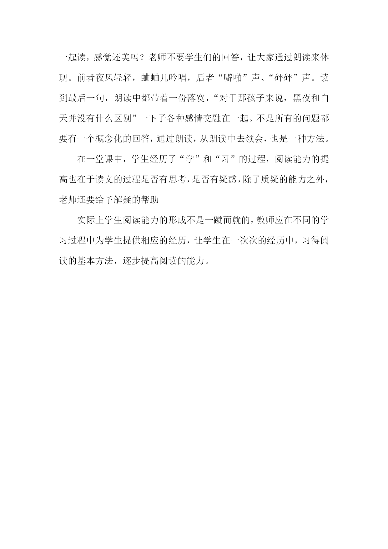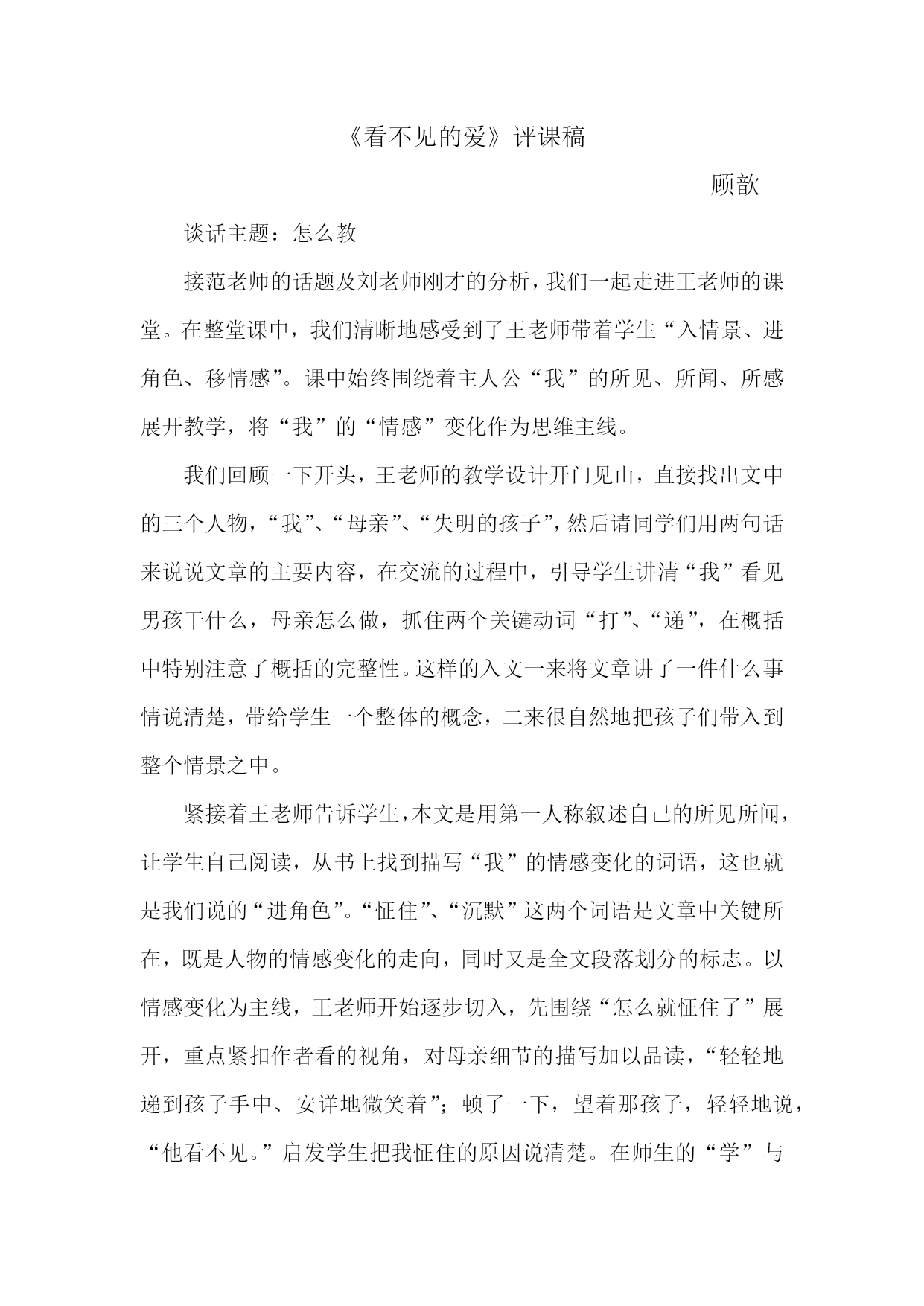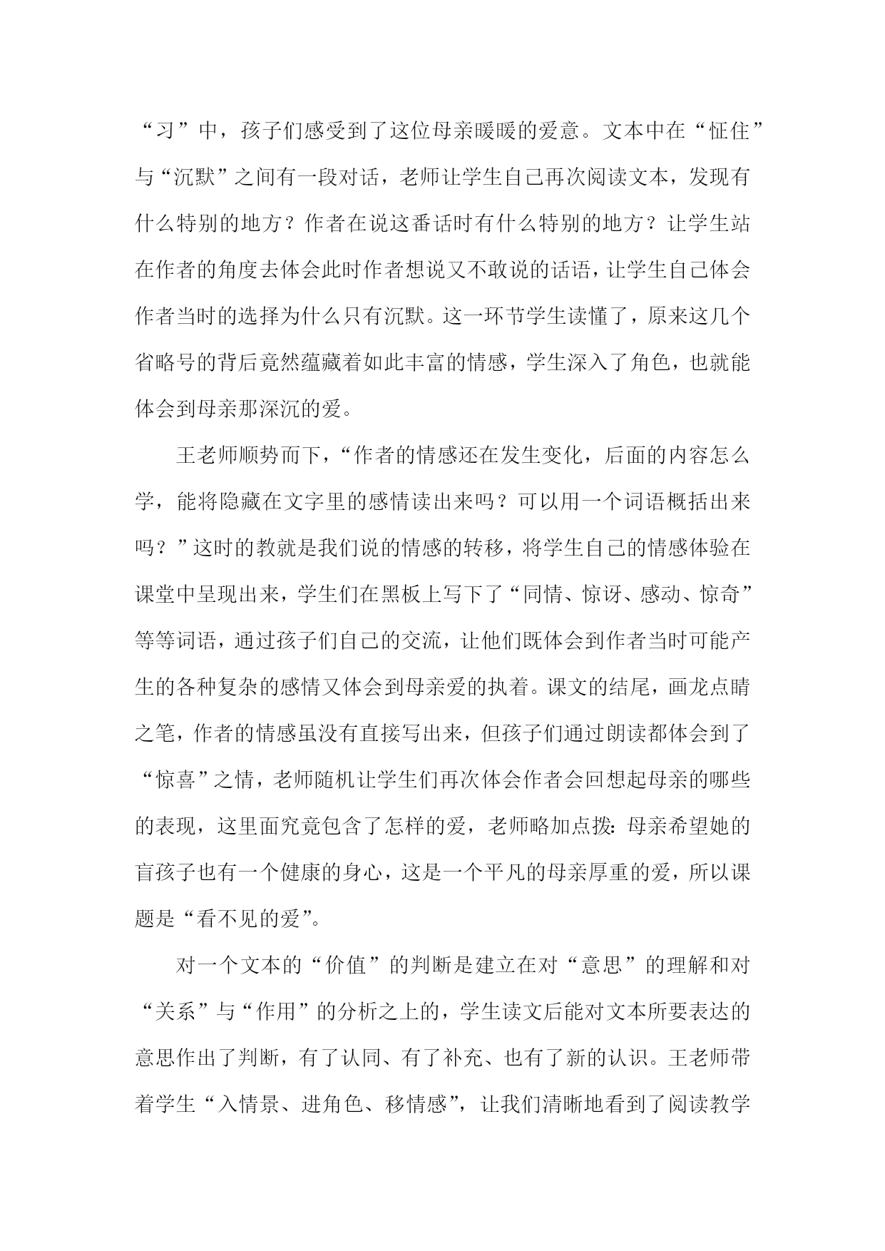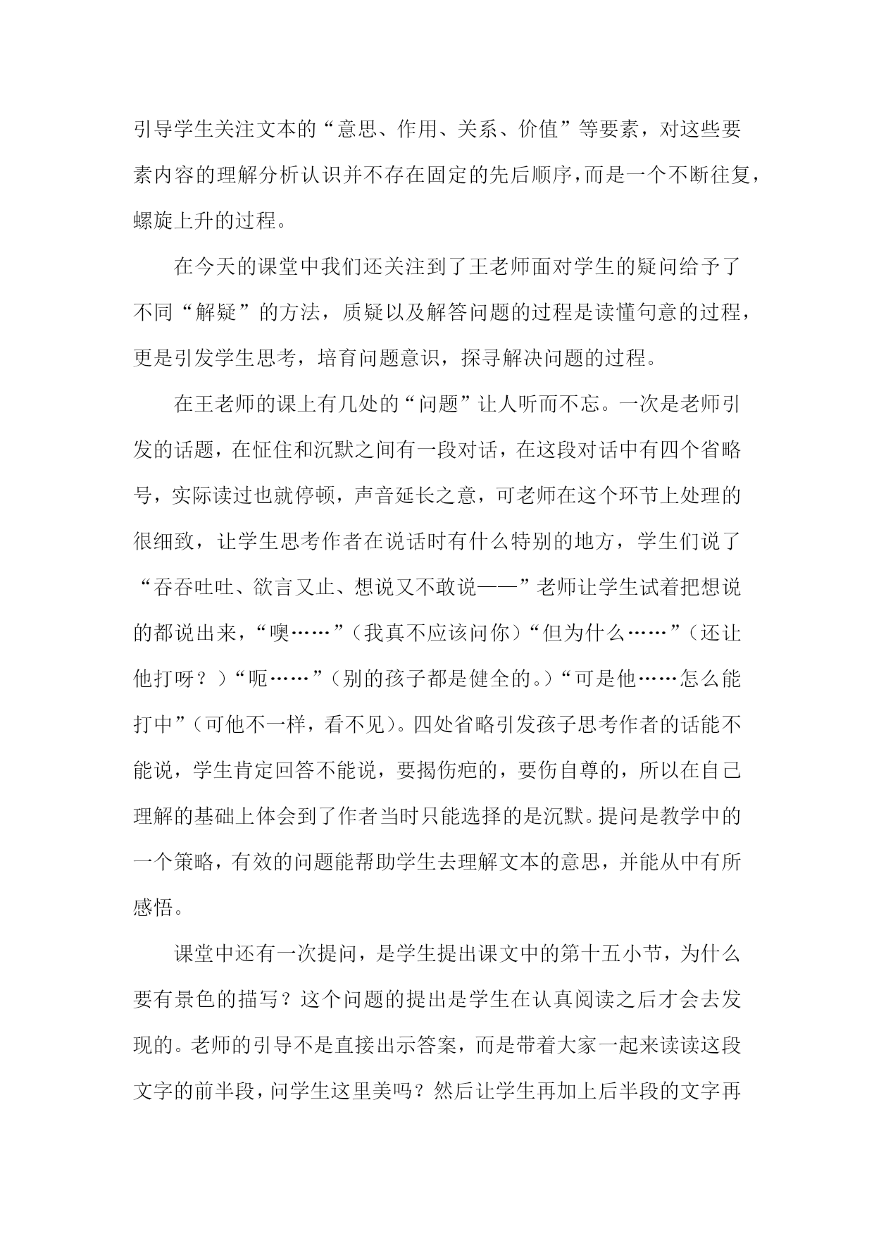 《看不见的爱》评课稿 顾歆 谈话主题:怎么教 接范老师的话题及刘老师刚才的分析,我们一起走进王老师的课堂。在整堂课中,我们清晰地感受到了王老师带着学生“入情景、进角色、移情感”。课中始终围绕着主人公“我”的所见、所闻、所感展开教学,将“我”的“情感”变化作为思维主线。 我们回顾一下开头,王老师的教学设计开门见山,直接找出文中的三个人物,“我”、“母亲”、“失明的孩子”,然后请同学们用两句话来说说文章的主要内容,在交流的过程中,引导学生讲清“我”看见男孩干什么,母亲怎么做,抓住两个关键动词“打”、“递”,在概括中特别注意了概括的完整性。这样的入文一来将文章讲了一件什么事情说清楚,带给学生一个整体的概念,二来很自然地把孩子们带入到整个情景之中。 紧接着王老师告诉学生,本文是用第一人称叙述自己的所见所闻,让学生自己阅读,从书上找到描写“我”的情感变化的词语,这也就是我们说的“进角色”。“怔住”、“沉默”这两个词语是文章中关键所在,既是人物的情感变化的走向,同时又是全文段落划分的标志。以情感变化为主线,王老师开始逐步切入,先围绕“怎么就怔住了”展开,重点紧扣作者看的视角,对母亲细节的描写加以品读,“轻轻地递到孩子手中、安详地微笑着”;顿了一下,望着那孩子,轻轻地说,“他看不见。”启发学生把我怔住的原因说清楚。在师生的“学”与“习”中,孩子们感受到了这位母亲暖暖的爱意。文本中在“怔住”与“沉默”之间有一段对话,老师让学生自己再次阅读文本,发现有什么特别的地方?作者在说这番话时有什么特别的地方?让学生站在作者的角度去体会此时作者想说又不敢说的话语,让学生自己体会作者当时的选择为什么只有沉默。这一环节学生读懂了,原来这几个省略号的背后竟然蕴藏着如此丰富的情感,学生深入了角色,也就能体会到母亲那深沉的爱。 王老师顺势而下,“作者的情感还在发生变化,后面的内容怎么学,能将隐藏在文字里的感情读出来吗?可以用一个词语概括出来吗?”这时的教就是我们说的情感的转移,将学生自己的情感体验在课堂中呈现出来,学生们在黑板上写下了“同情、惊讶、感动、惊奇”等等词语,通过孩子们自己的交流,让他们既体会到作者当时可能产生的各种复杂的感情又体会到母亲爱的执着。课文的结尾,画龙点睛之笔,作者的情感虽没有直接写出来,但孩子们通过朗读都体会到了“惊喜”之情,老师随机让学生们再次体会作者会回想起母亲的哪些的表现,这里面究竟包含了怎样的爱,老师略加点拨:母亲希望她的盲孩子也有一个健康的身心,这是一个平凡的母亲厚重的爱,所以课题是“看不见的爱”。 对一个文本的“价值”的判断是建立在对“意思”的理解和对“关系”与“作用”的分析之上的,学生读文后能对文本所要表达的意思作出了判断,有了认同、有了补充、也有了新的认识。王老师带着学生“入情景、进角色、移情感”,让我们清晰地看到了阅读教学引导学生关注文本的“意思、作用、关系、价值”等要素,对这些要素内容的理解分析认识并不存在固定的先后顺序,而是一个不断往复,螺旋上升的过程。 在今天的课堂中我们还关注到了王老师面对学生的疑问给予了不同“解疑”的方法,质疑以及解答问题的过程是读懂句意的过程,更是引发学生思考,培育问题意识,探寻解决问题的过程。 在王老师的课上有几处的“问题”让人听而不忘。一次是老师引发的话题,在怔住和沉默之间有一段对话,在这段对话中有四个省略号,实际读过也就停顿,声音延长之意,可老师在这个环节上处理的很细致,让学生思考作者在说话时有什么特别的地方,学生们说了“吞吞吐吐、欲言又止、想说又不敢说——”老师让学生试着把想说的都说出来,“噢……”(我真不应该问你)“但为什么……”(还让他打呀?)“呃……”(别的孩子都是健全的。)“可是他……怎么能打中”(可他不一样,看不见)。四处省略引发孩子思考作者的话能不能说,学生肯定回答不能说,要揭伤疤的,要伤自尊的,所以在自己理解的基础上体会到了作者当时只能选择的是沉默。提问是教学中的一个策略,有效的问题能帮助学生去理解文本的意思,并能从中有所感悟。 课堂中还有一次提问,是学生提出课文中的第十五小节,为什么要有景色的描写?这个问题的提出是学生在认真阅读之后才会去发现的。老师的引导不是直接出示答案,而是带着大家一起来读读这段文字的前半段,问学生这里美吗?然后让学生再加上后半段的文字再一起读,感觉还美吗?老师不要学生们的回答,让大家通过朗读来体现。前者夜风轻轻,蛐蛐儿吟唱,后者“噼啪”声、“砰砰”声。读到最后一句,朗读中都带着一份落寞,“对于那孩子来说,黑夜和白天并没有什么区别”一下子各种感情交融在一起。不是所有的问题都要有一个概念化的回答,通过朗读,从朗读中去领会,也是一种方法。 在一堂课中,学生经历了“学”和“习”的过程,阅读能力的提高也在于读文的过程是否有思考,是否有疑惑,除了质疑的能力之外,